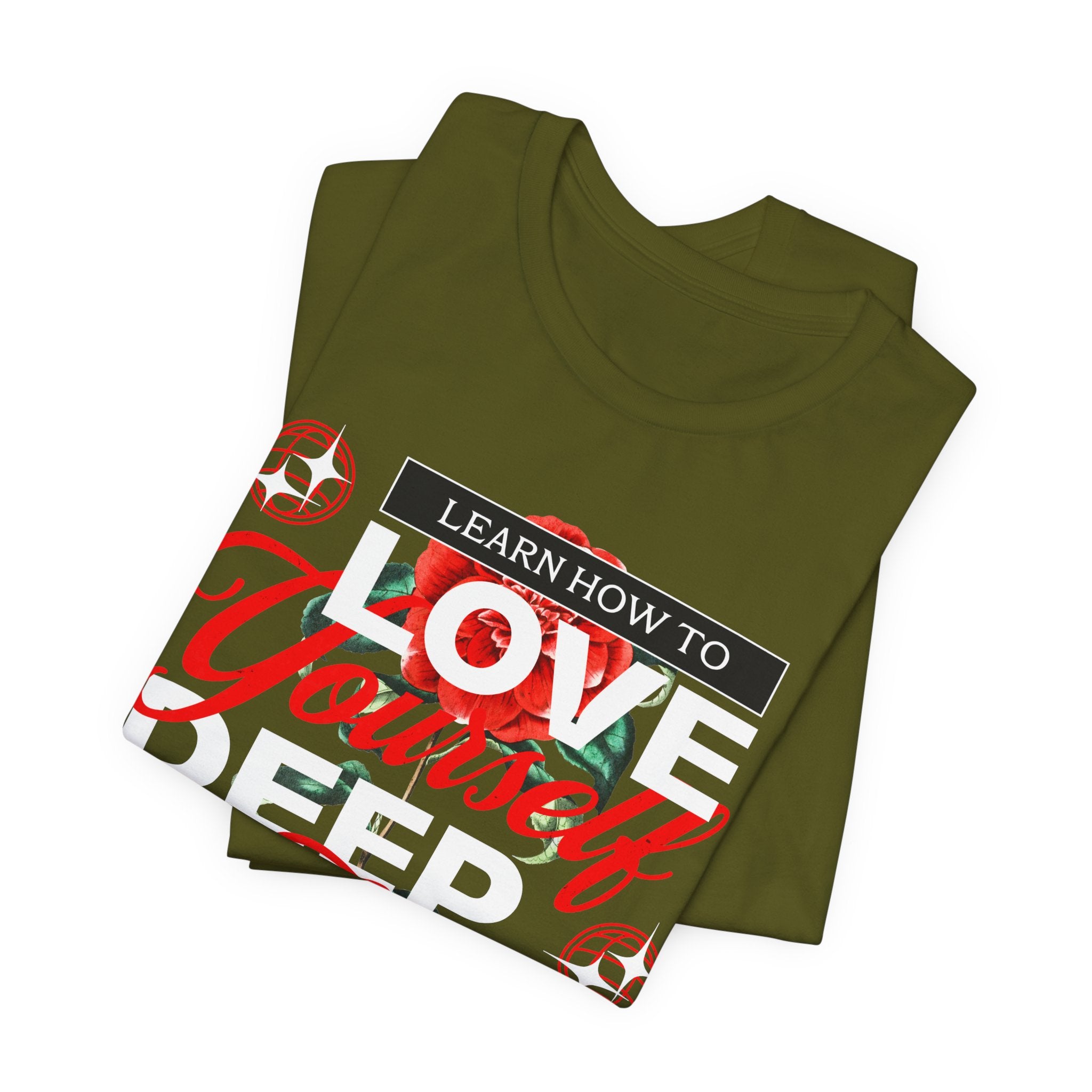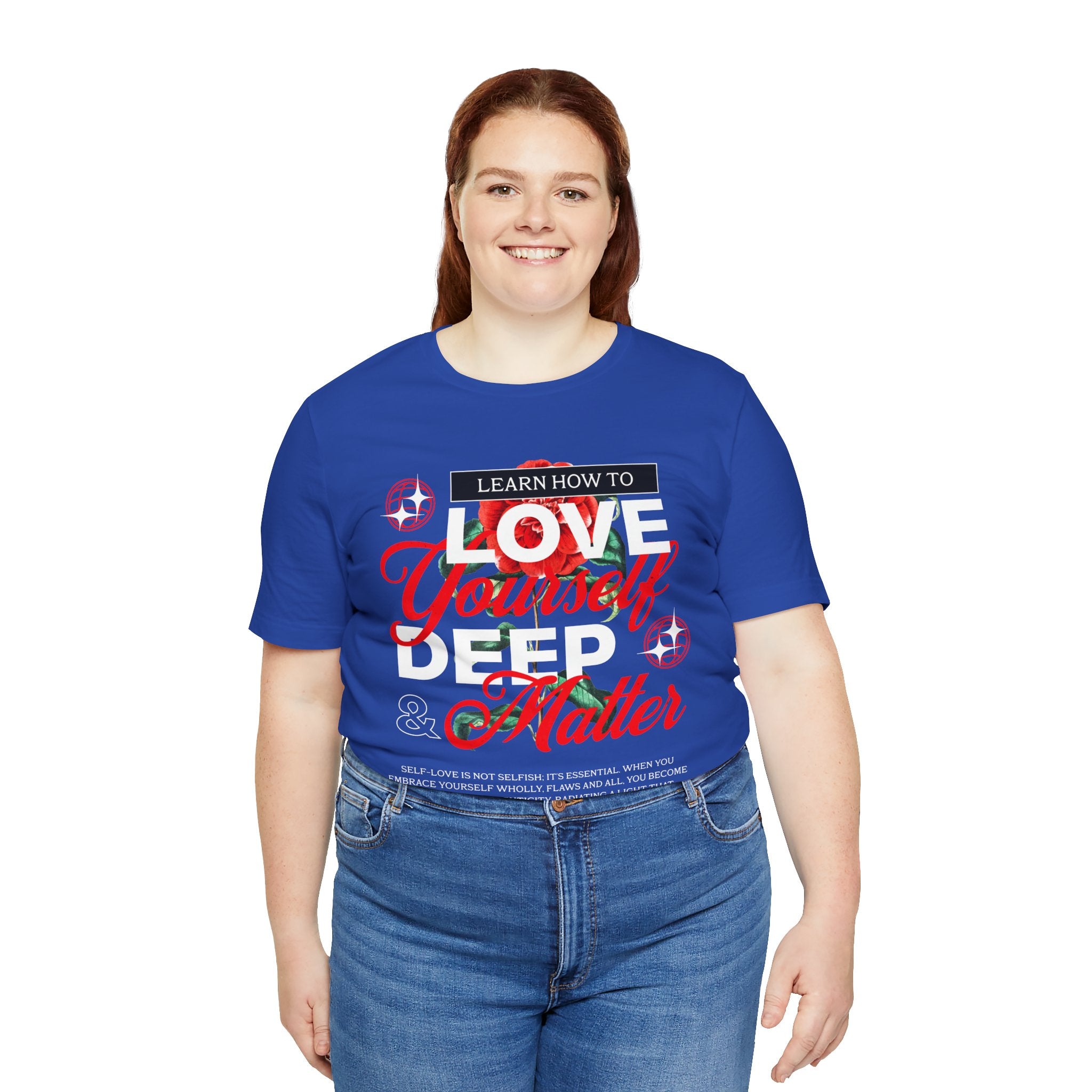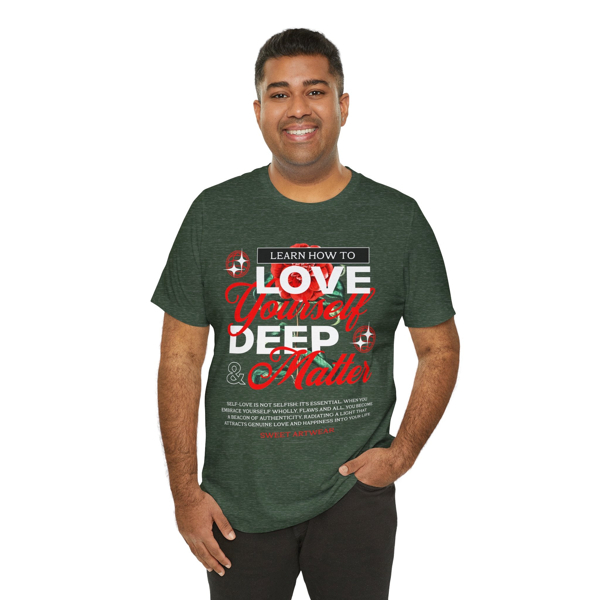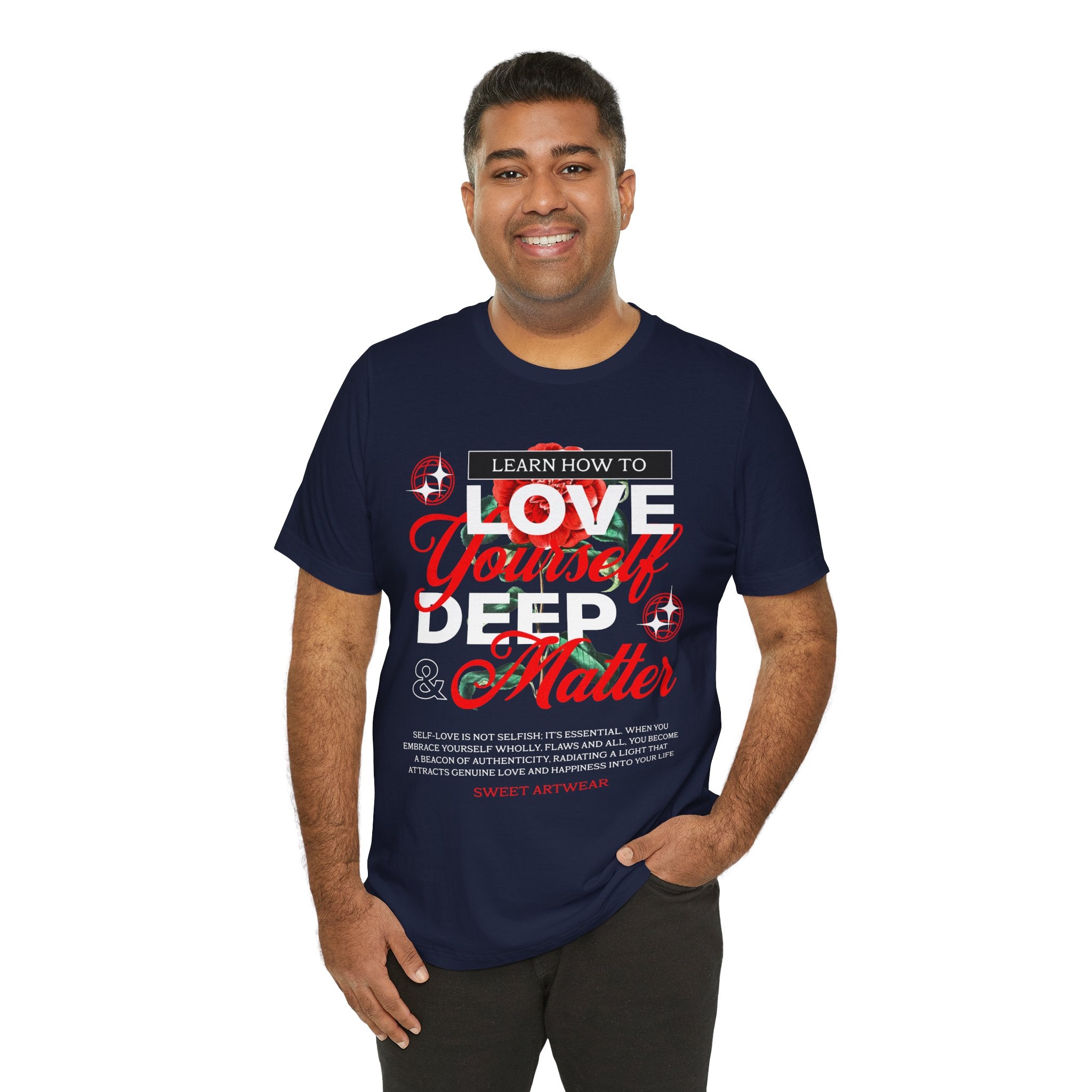 The Love Yourself Deep Unisex Jersey Short Sleeve Tee is a powerful reminder that self-love is strength, not selfishness. Featuring bold typography, a vibrant red rose graphic, and empowering words, this tee blends streetwear edge with motivational energy.