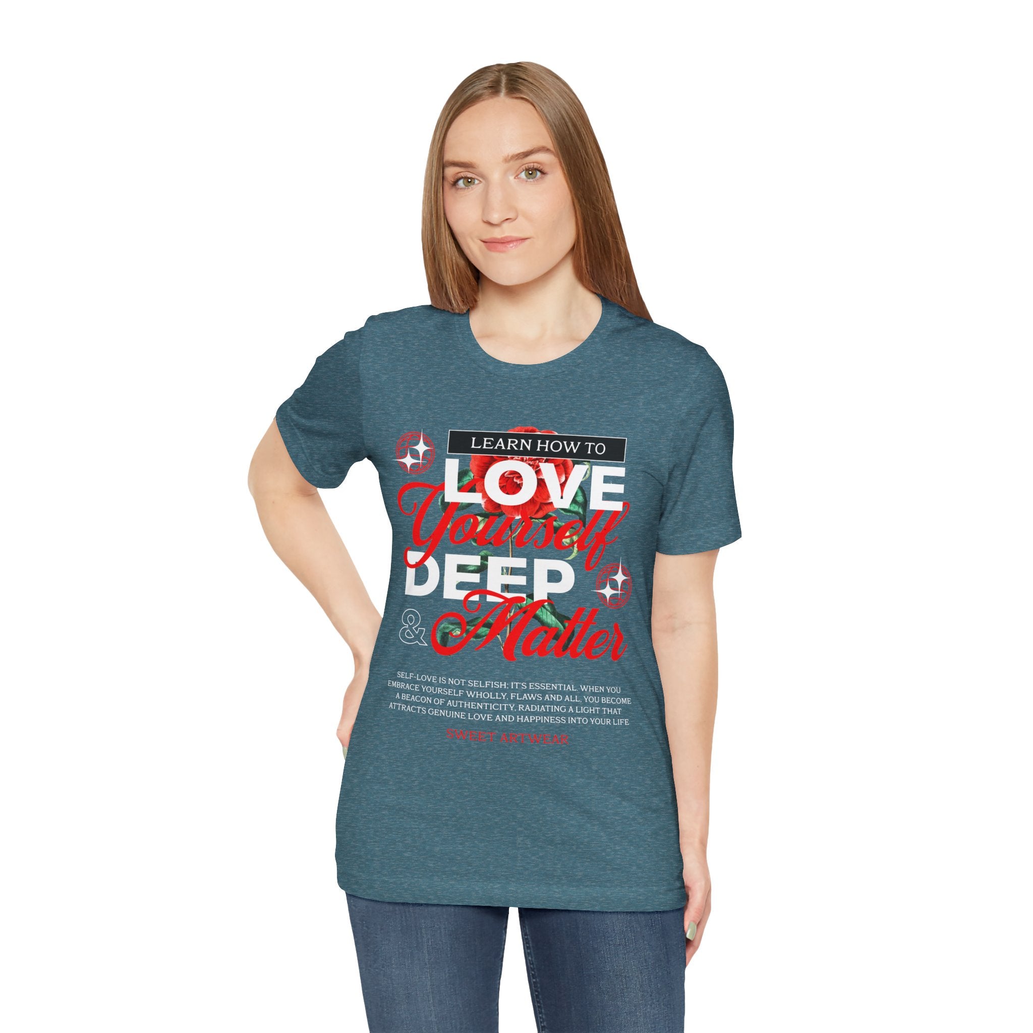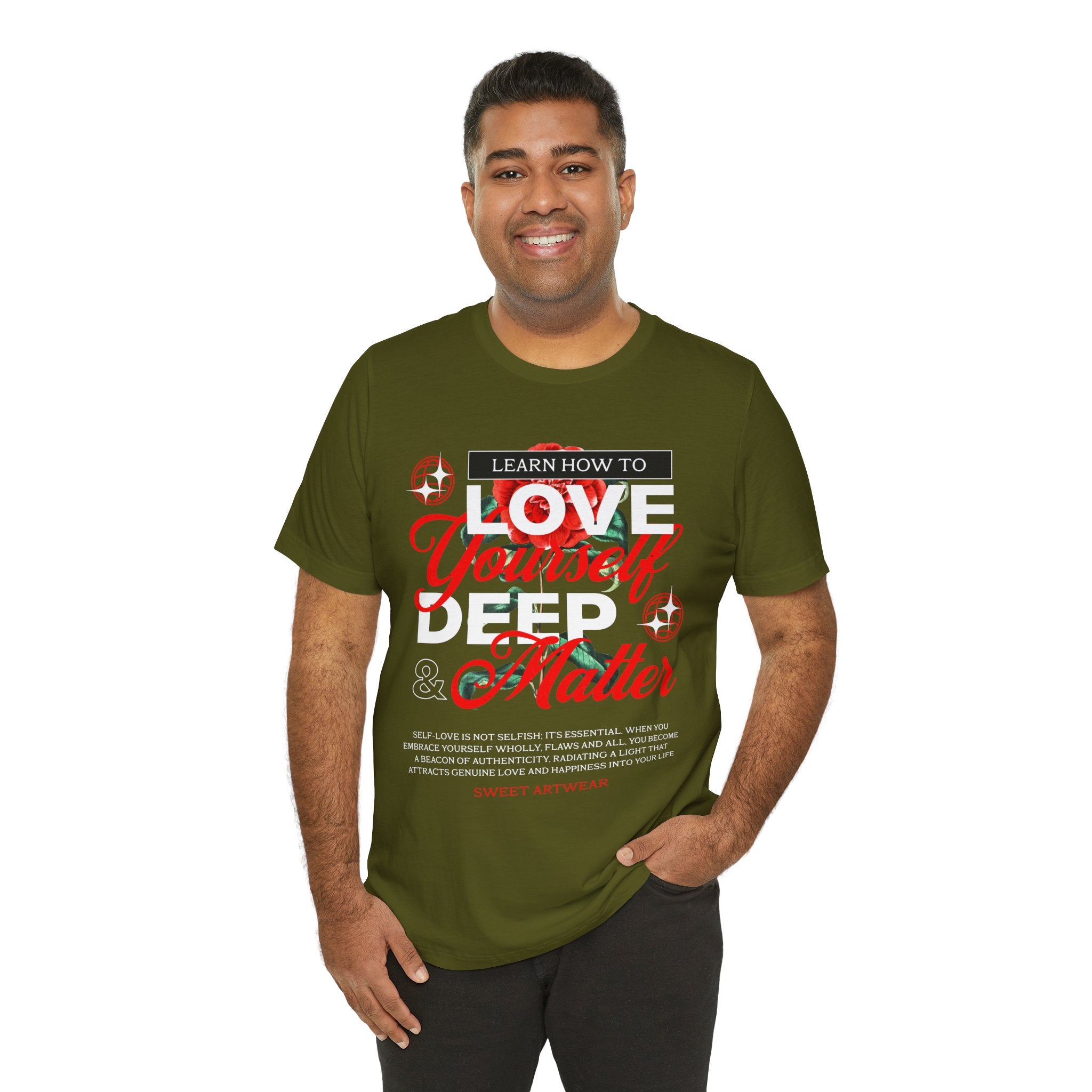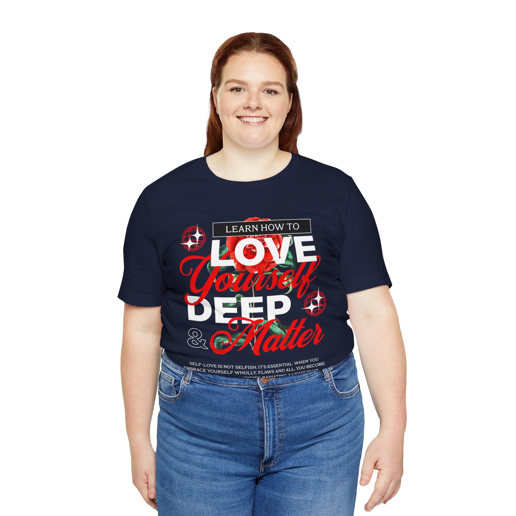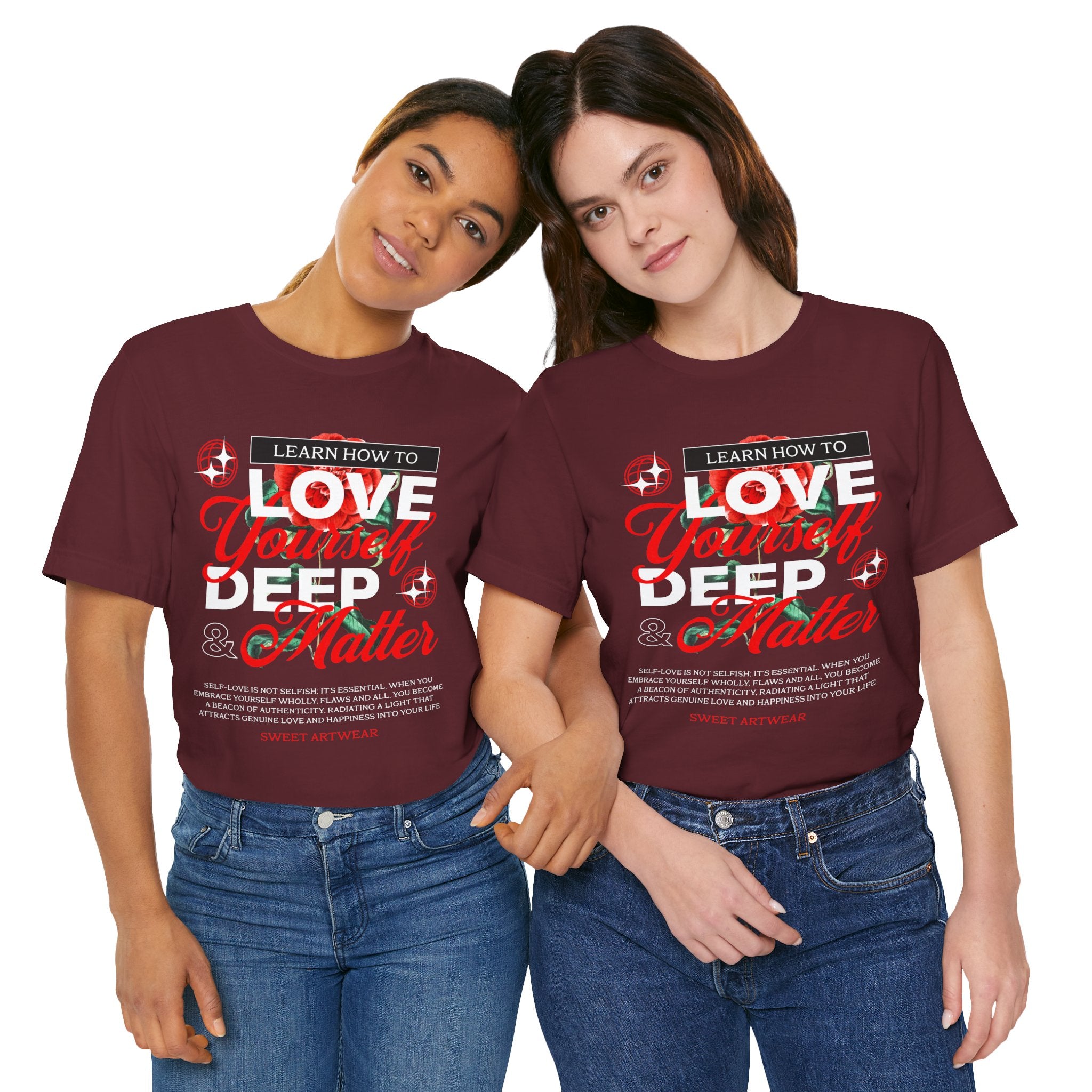 The Love Yourself Deep Unisex Jersey Short Sleeve Tee is a powerful reminder that self-love is strength, not selfishness. Featuring bold typography, a vibrant red rose graphic, and empowering words, this tee blends streetwear edge with motivational energy.