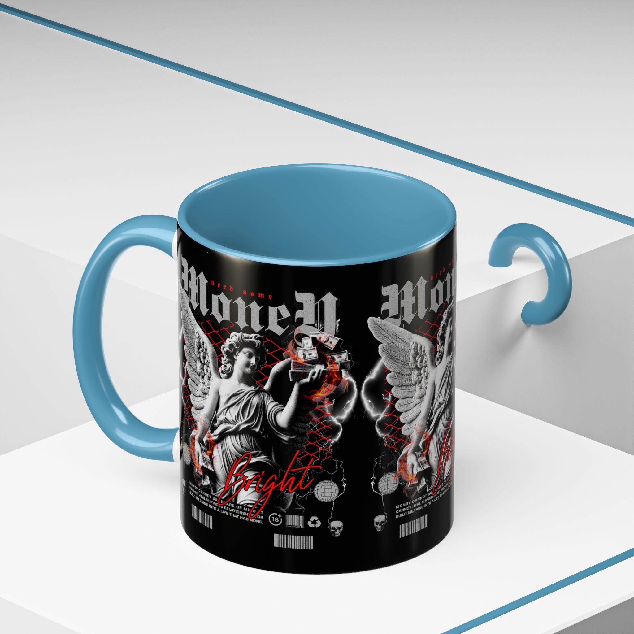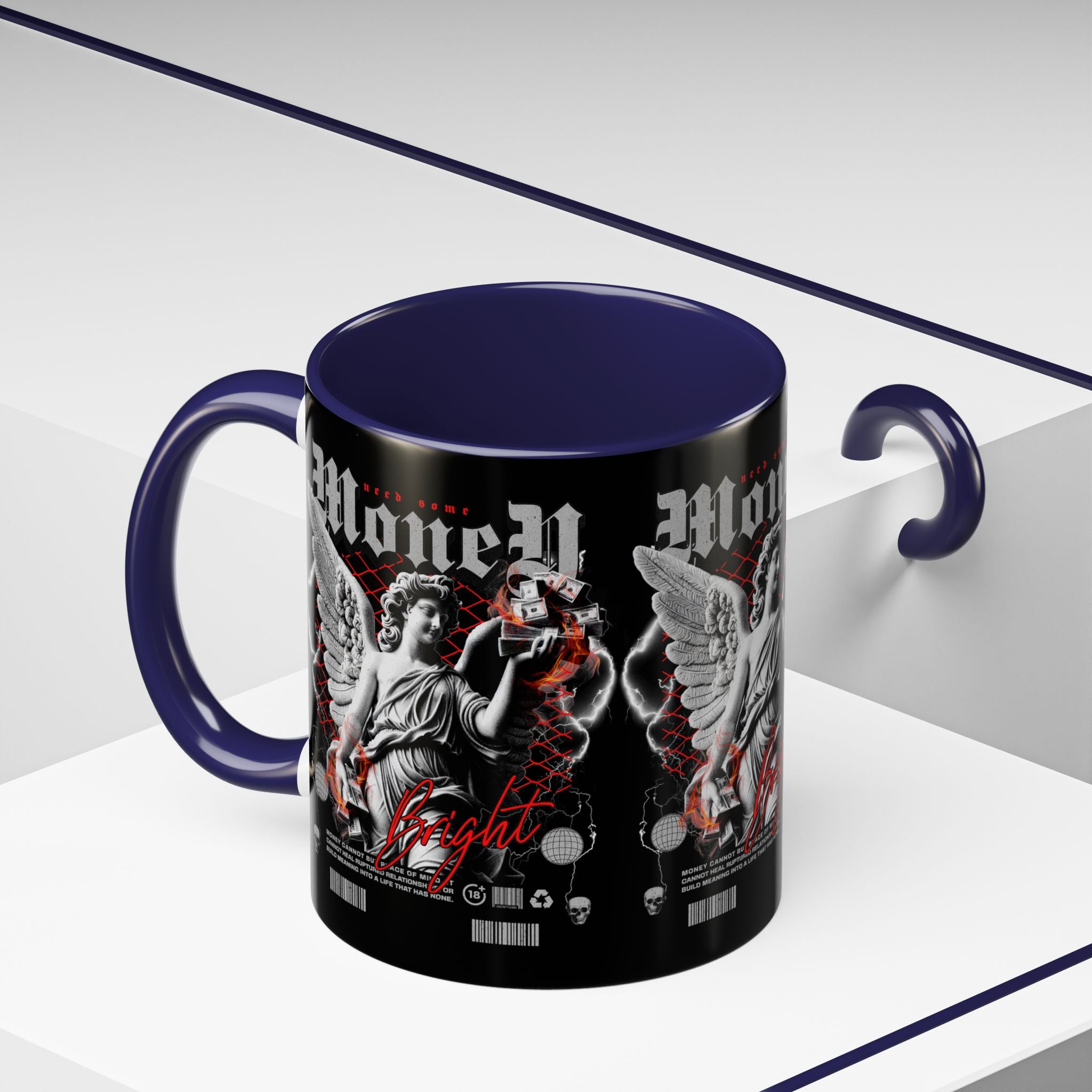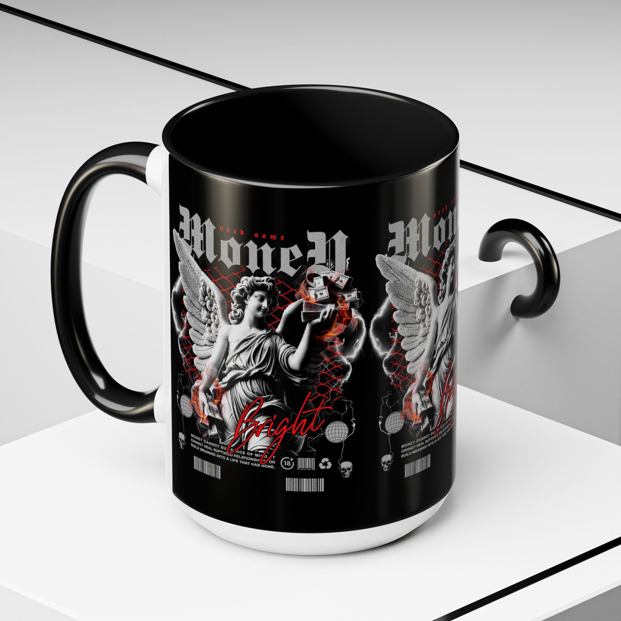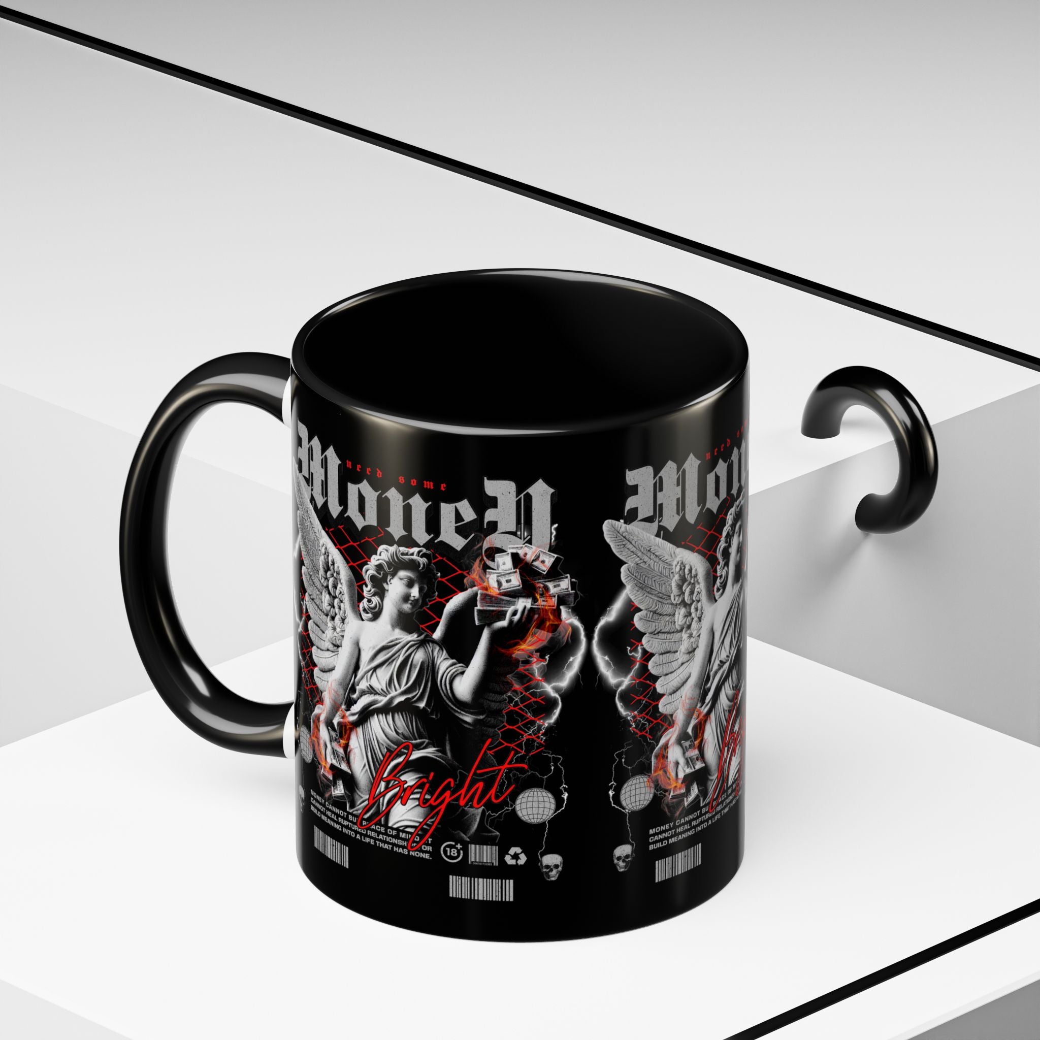 Make every sip a statement of ambition and bold energy with the Money Bright Accent Coffee Mug. Featuring a striking gothic-style angel statue holding stacks of cash, surrounded by fiery red neon grid art, this mug blends classic sculpture with raw modern hustle energy.