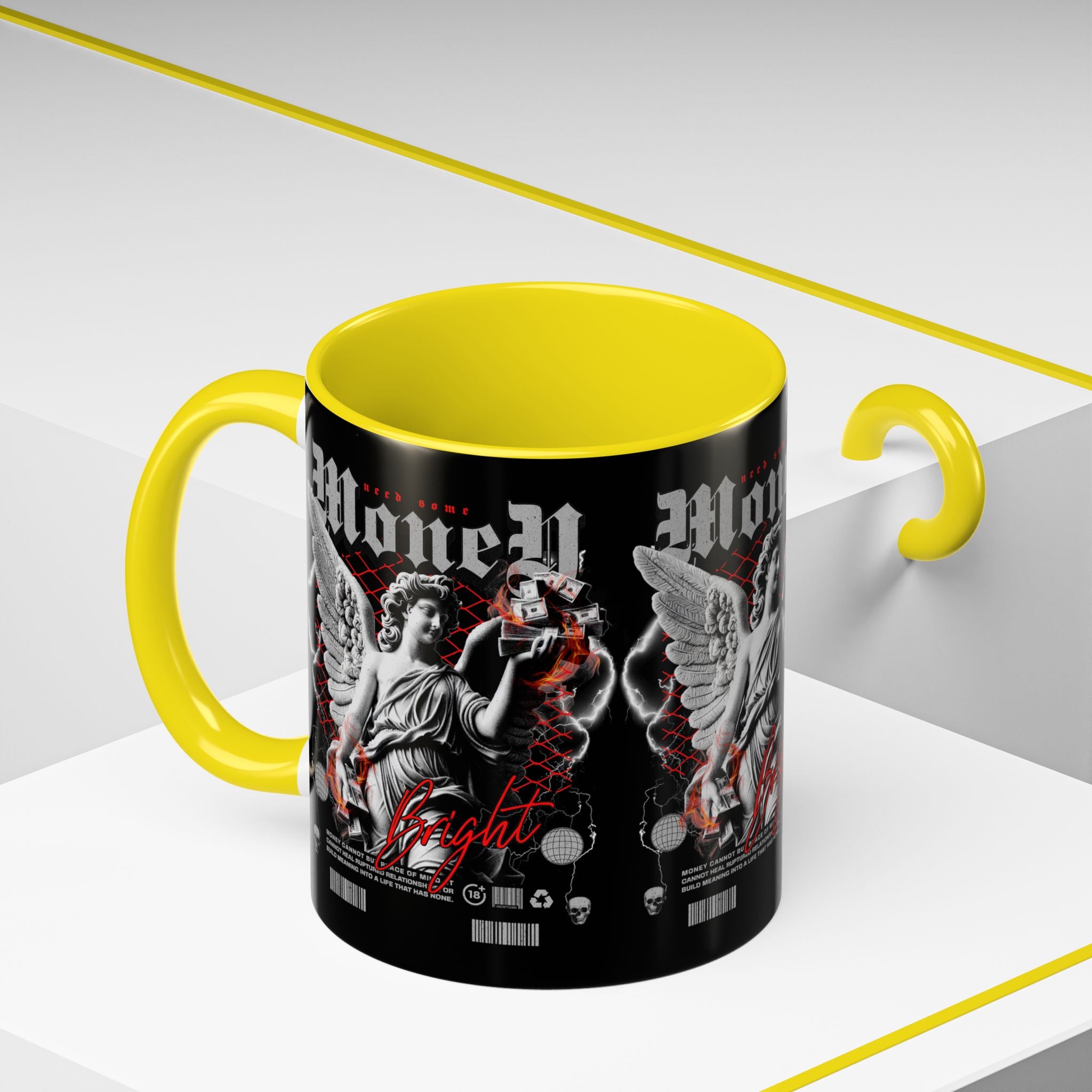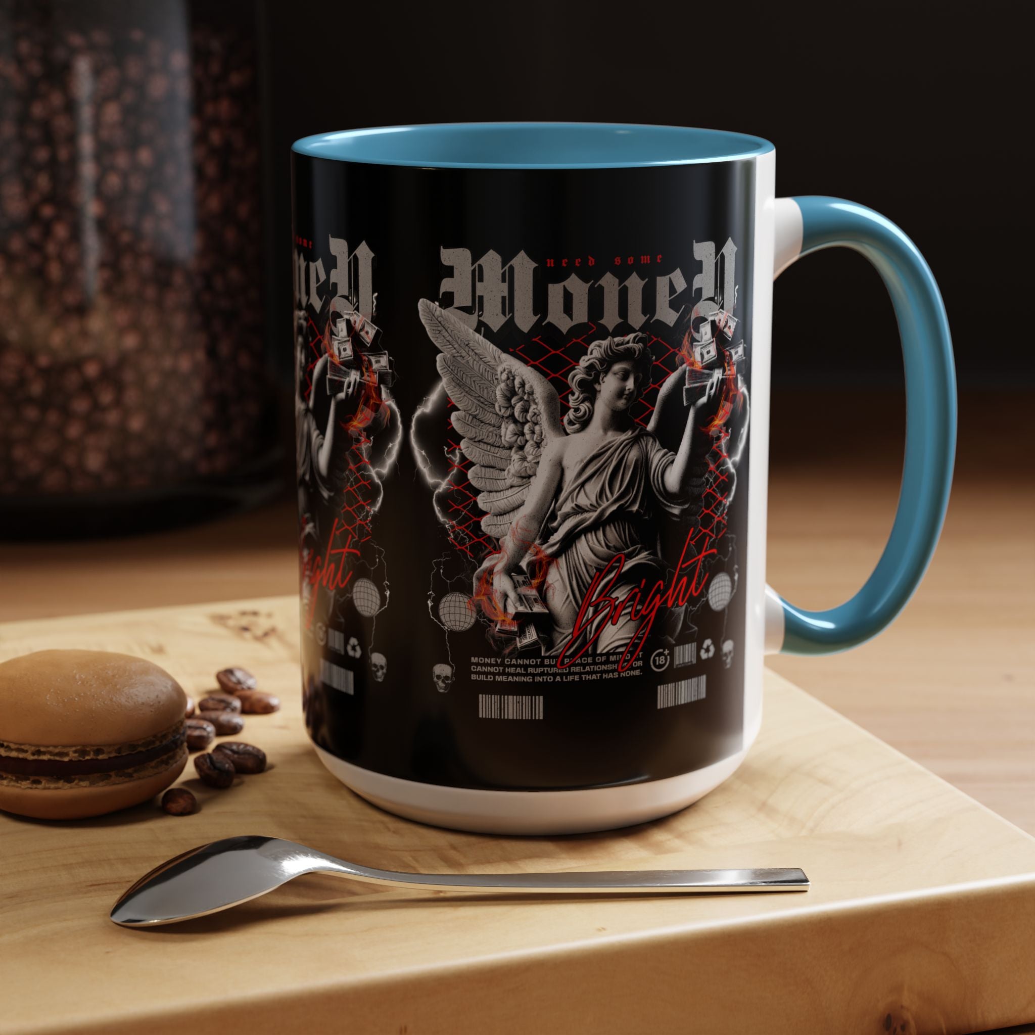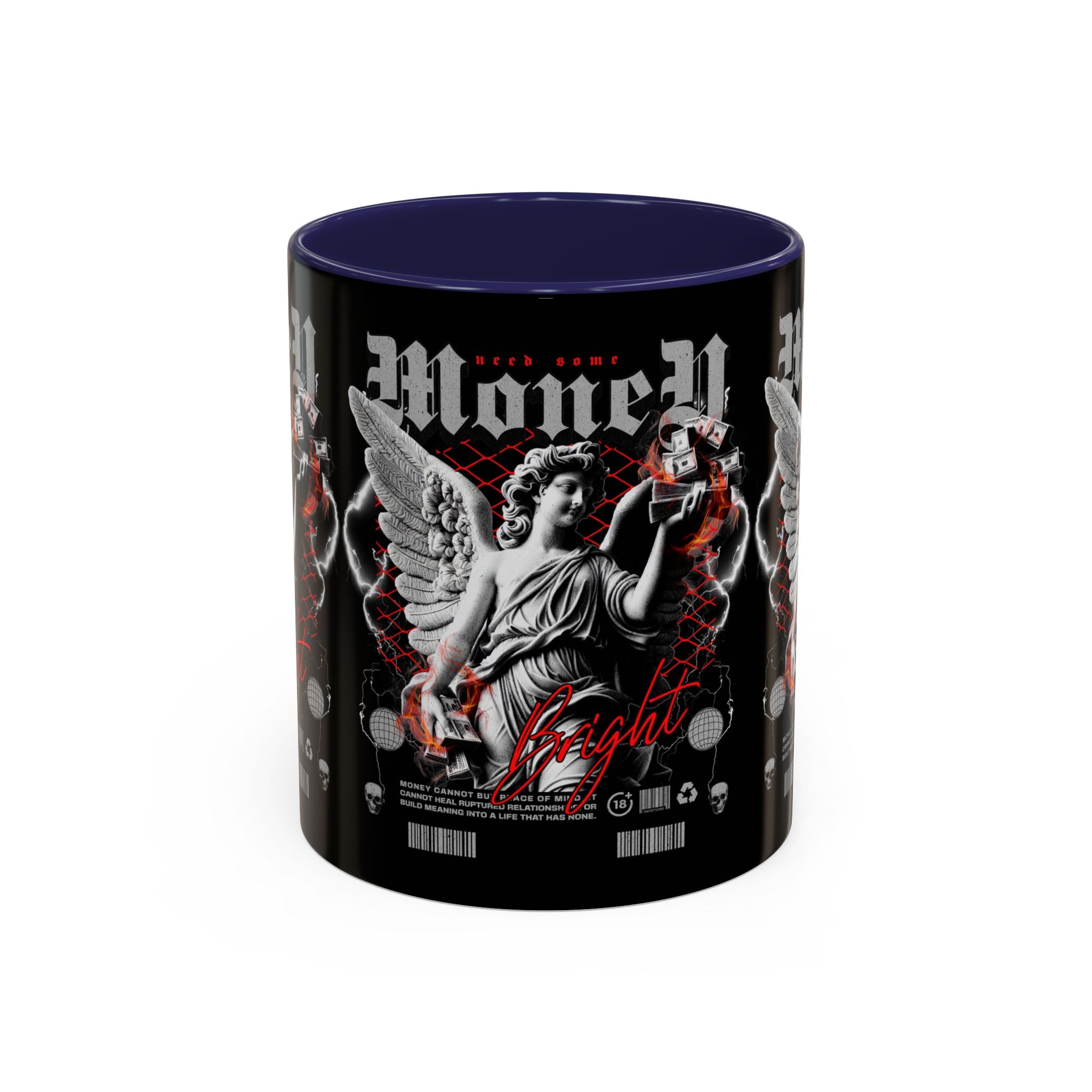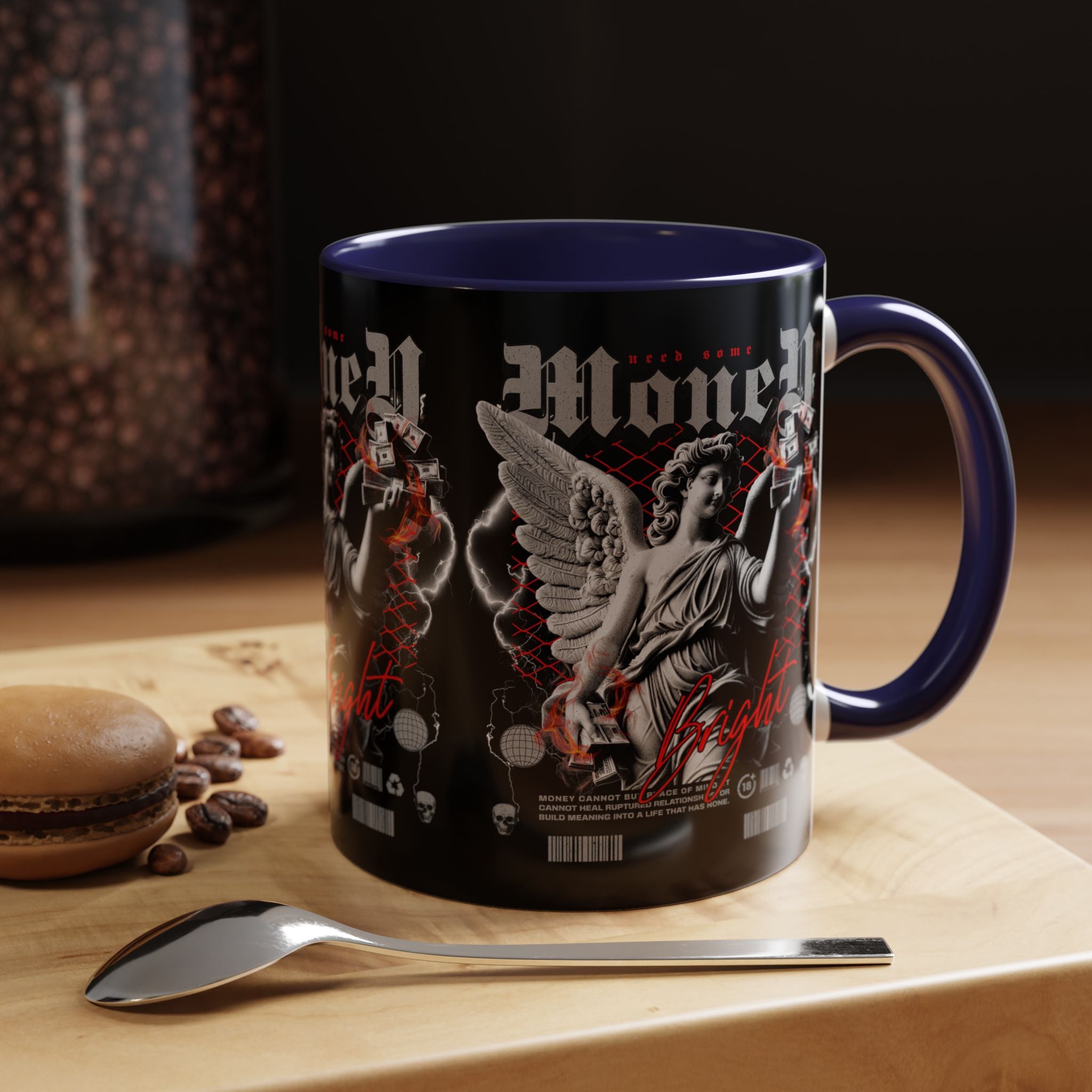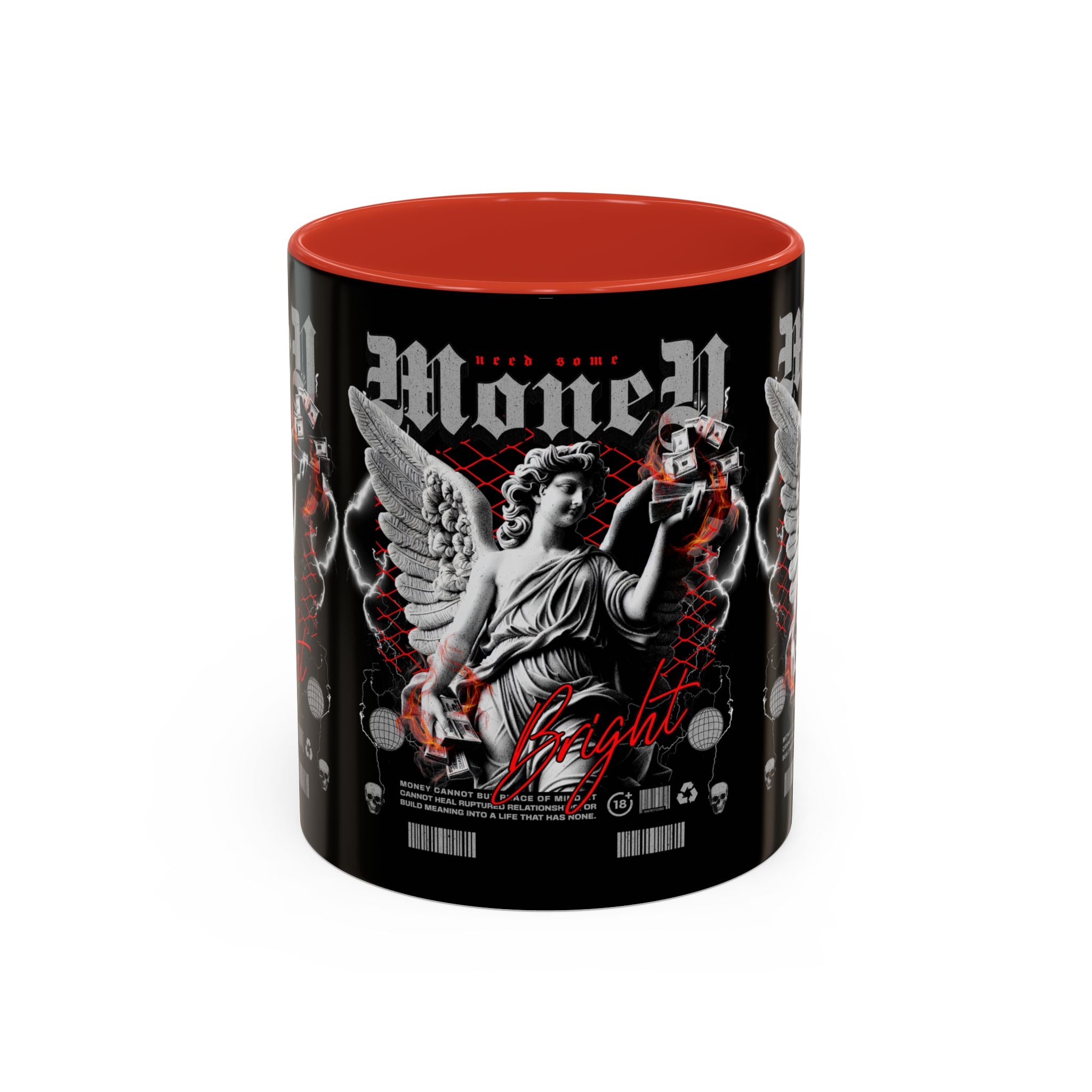 Make every sip a statement of ambition and bold energy with the Money Bright Accent Coffee Mug. Featuring a striking gothic-style angel statue holding stacks of cash, surrounded by fiery red neon grid art, this mug blends classic sculpture with raw modern hustle energy.
