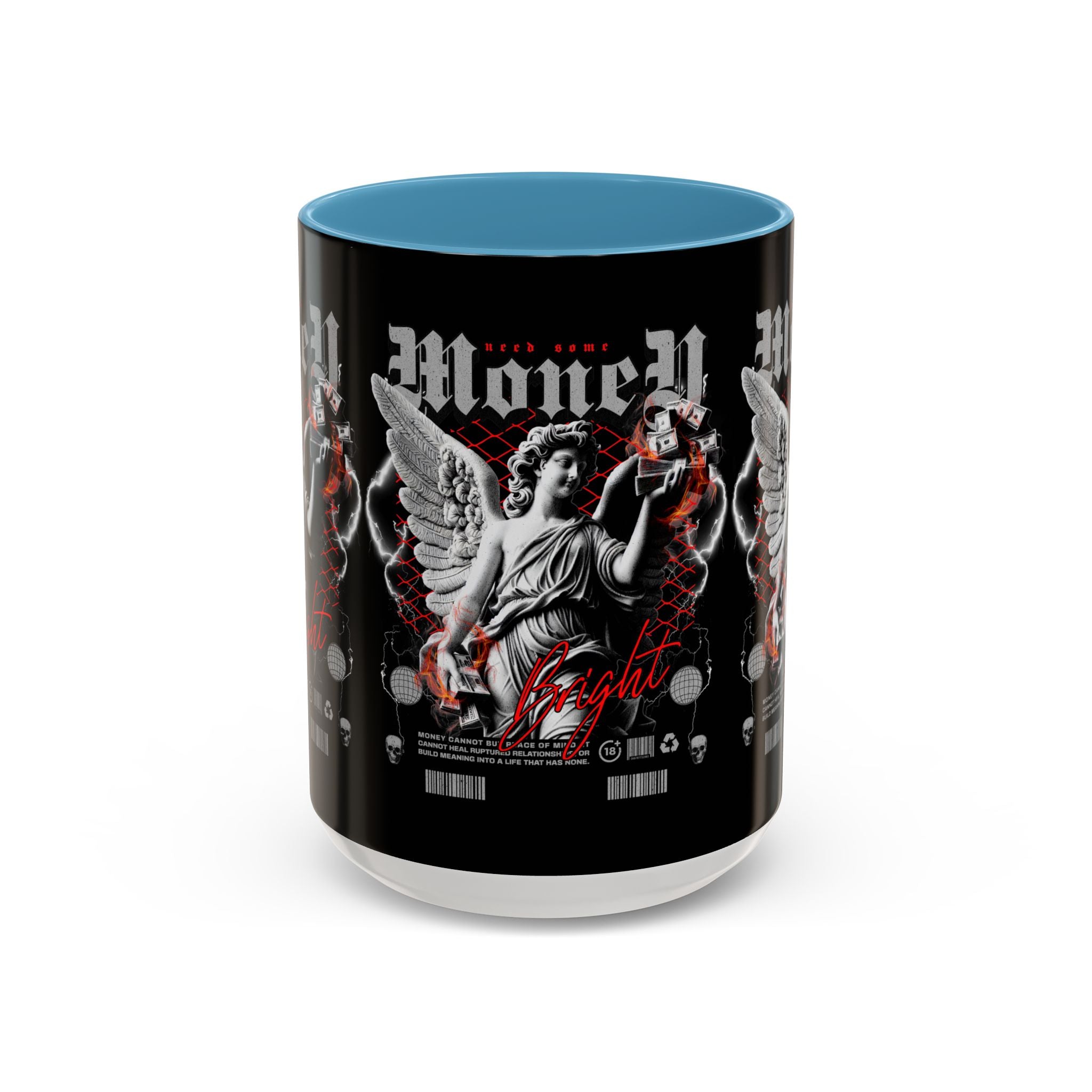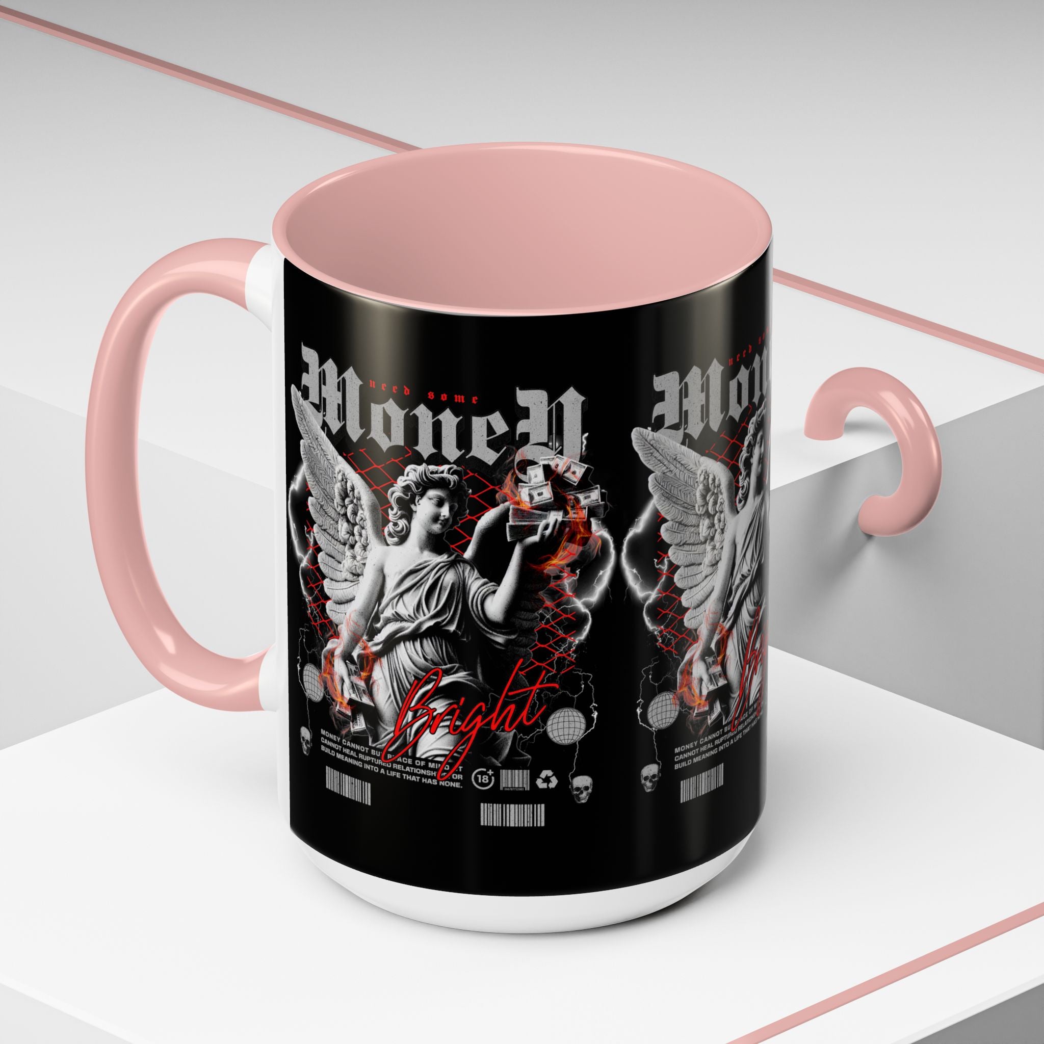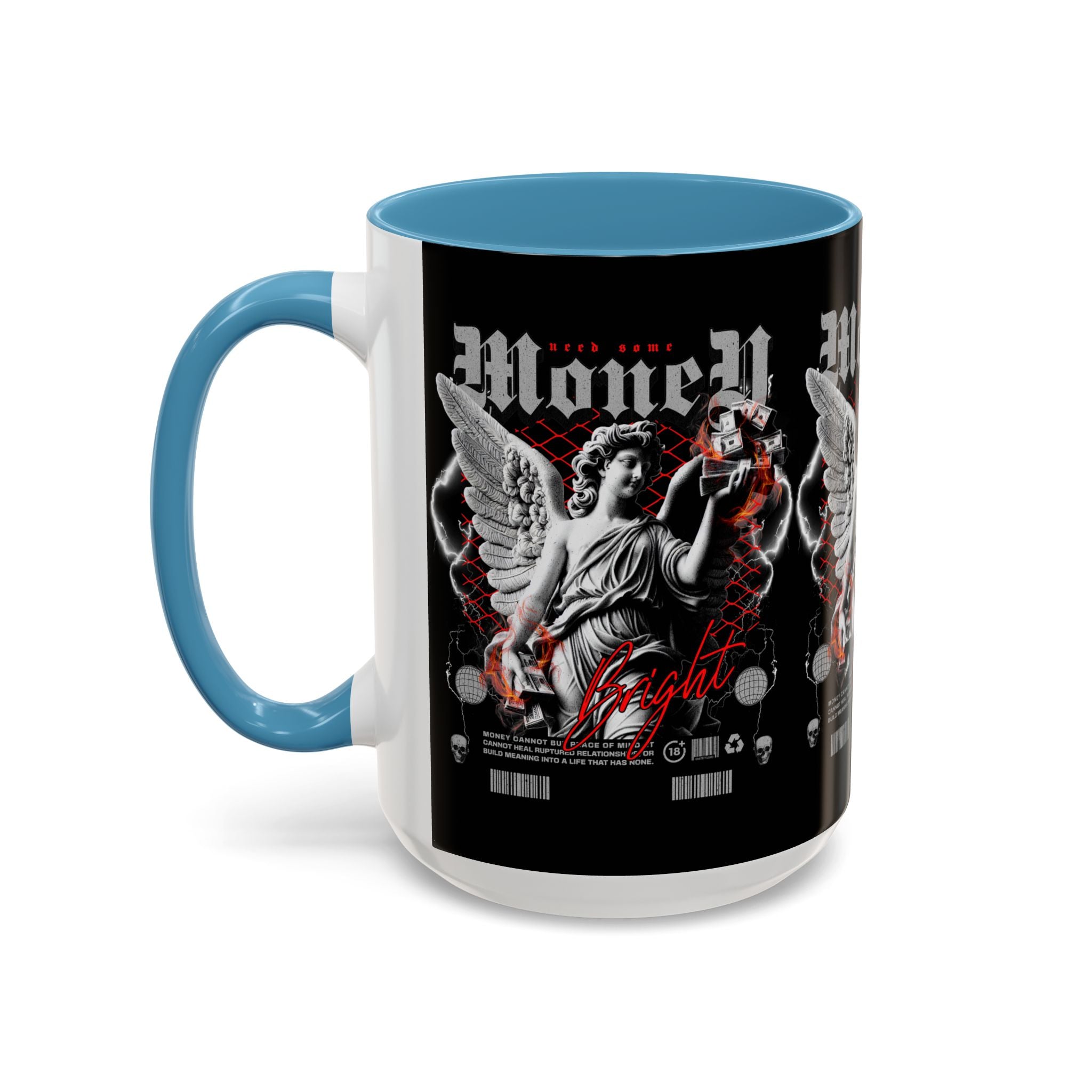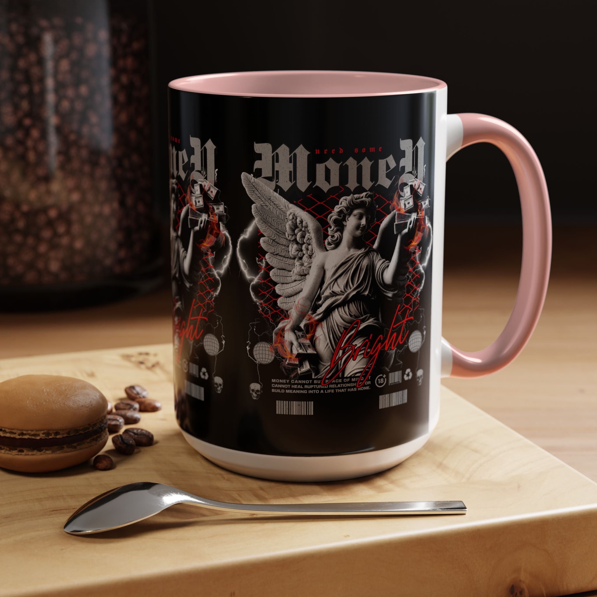 Make every sip a statement of ambition and bold energy with the Money Bright Accent Coffee Mug. Featuring a striking gothic-style angel statue holding stacks of cash, surrounded by fiery red neon grid art, this mug blends classic sculpture with raw modern hustle energy.