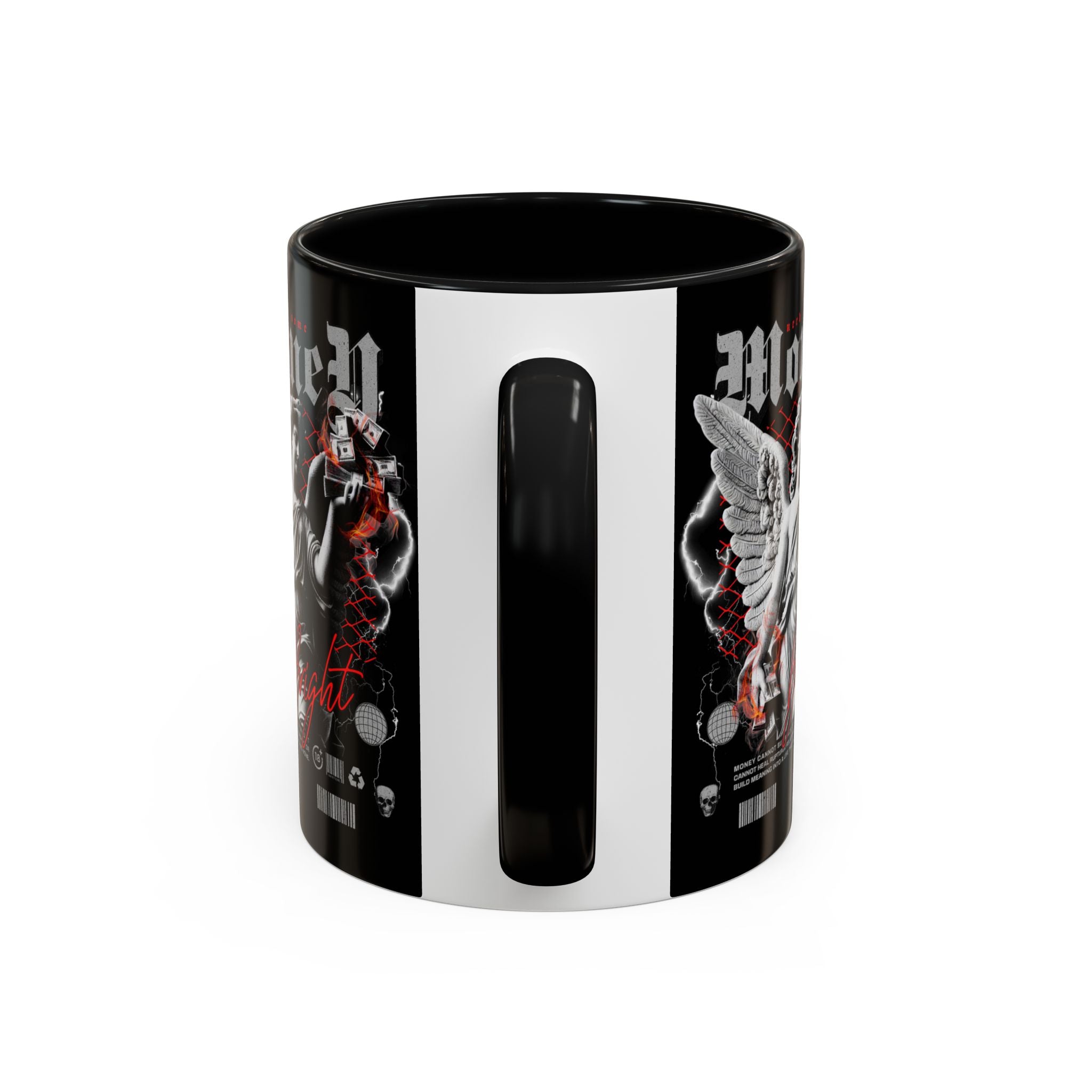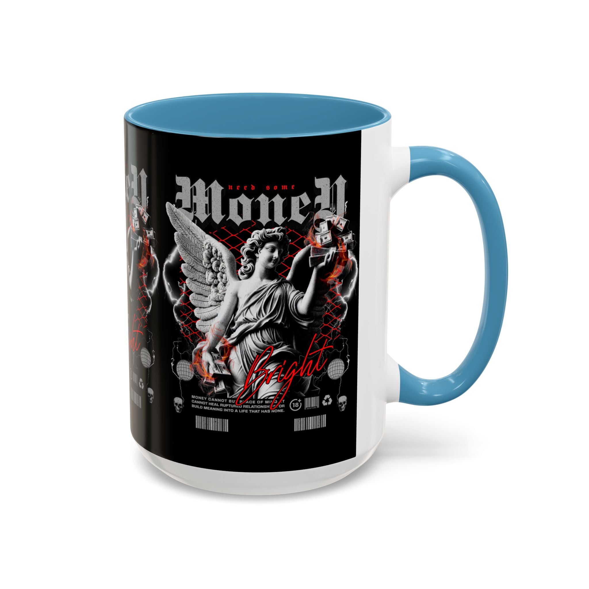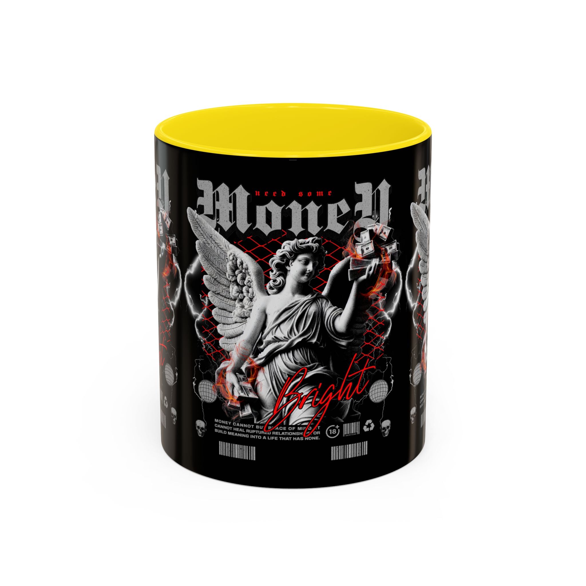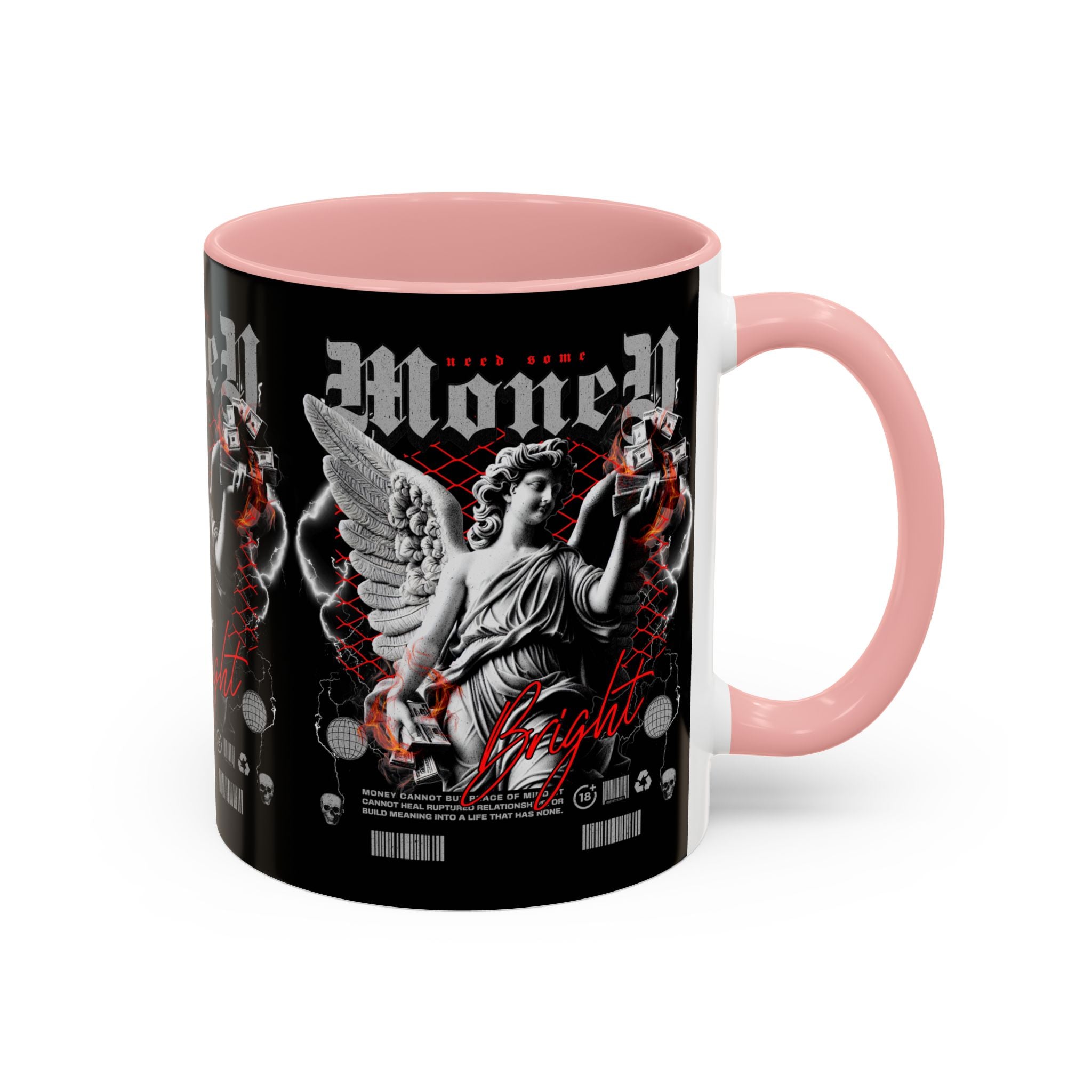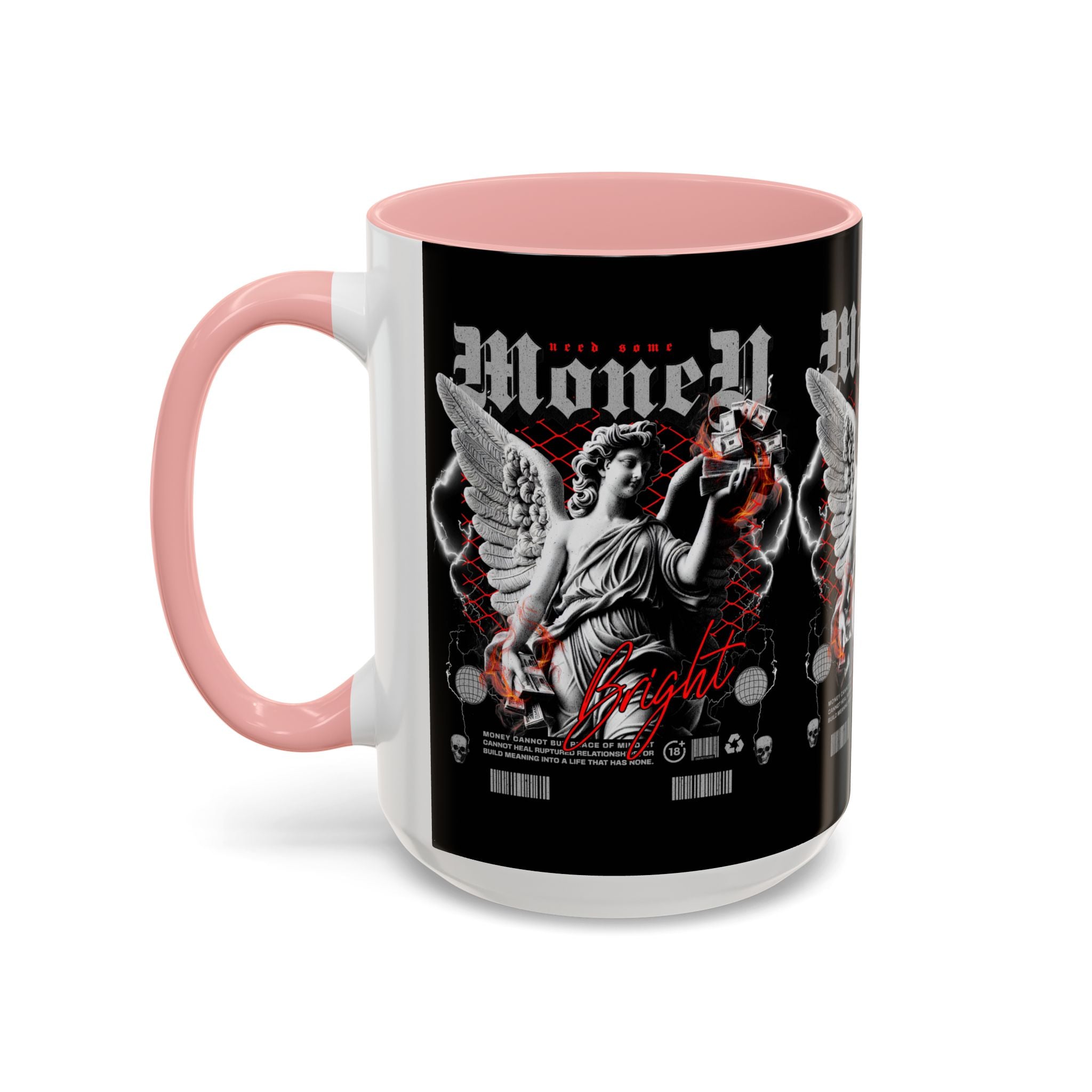 Make every sip a statement of ambition and bold energy with the Money Bright Accent Coffee Mug. Featuring a striking gothic-style angel statue holding stacks of cash, surrounded by fiery red neon grid art, this mug blends classic sculpture with raw modern hustle energy.
