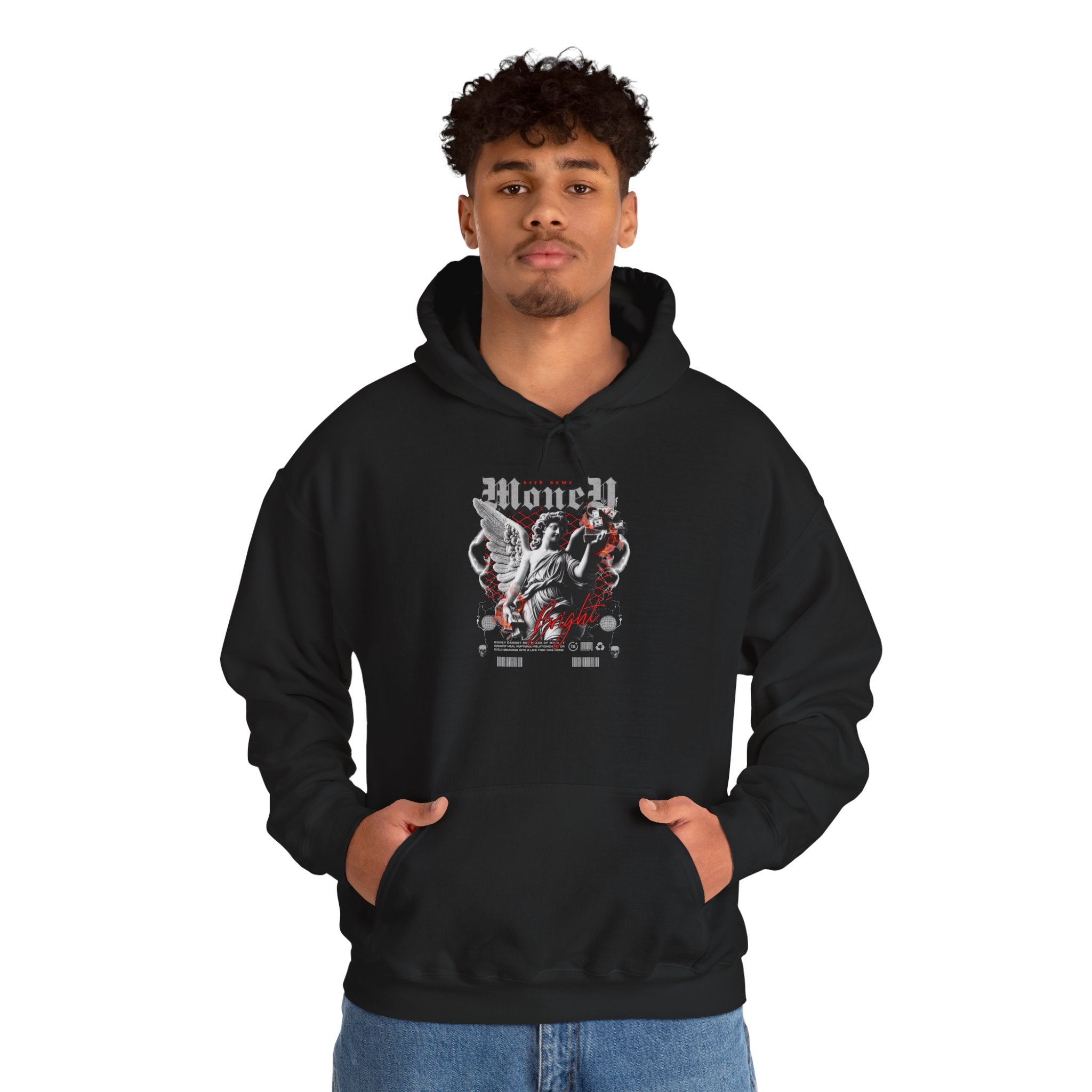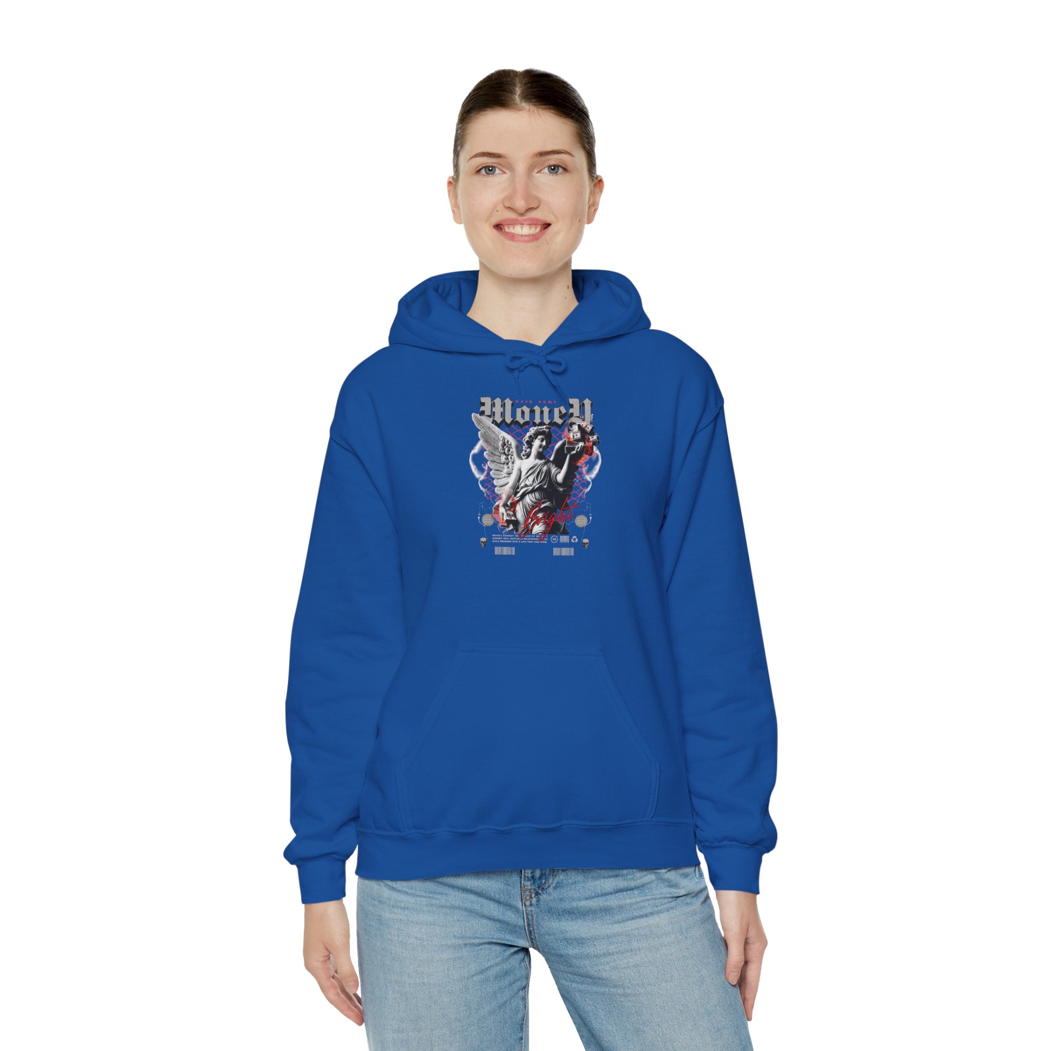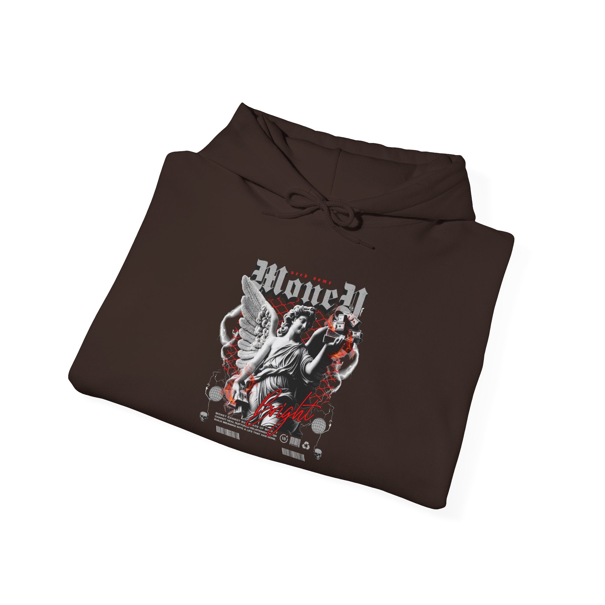 Step into ambition with the Money Bright Unisex Heavy Blend Hooded Sweatshirt, featuring a bold angel statue holding stacks of money against a neon red grid backdrop. This design blends classical art with gothic streetwear rebellion, creating a hoodie that symbolizes power, ambition, and individuality.
