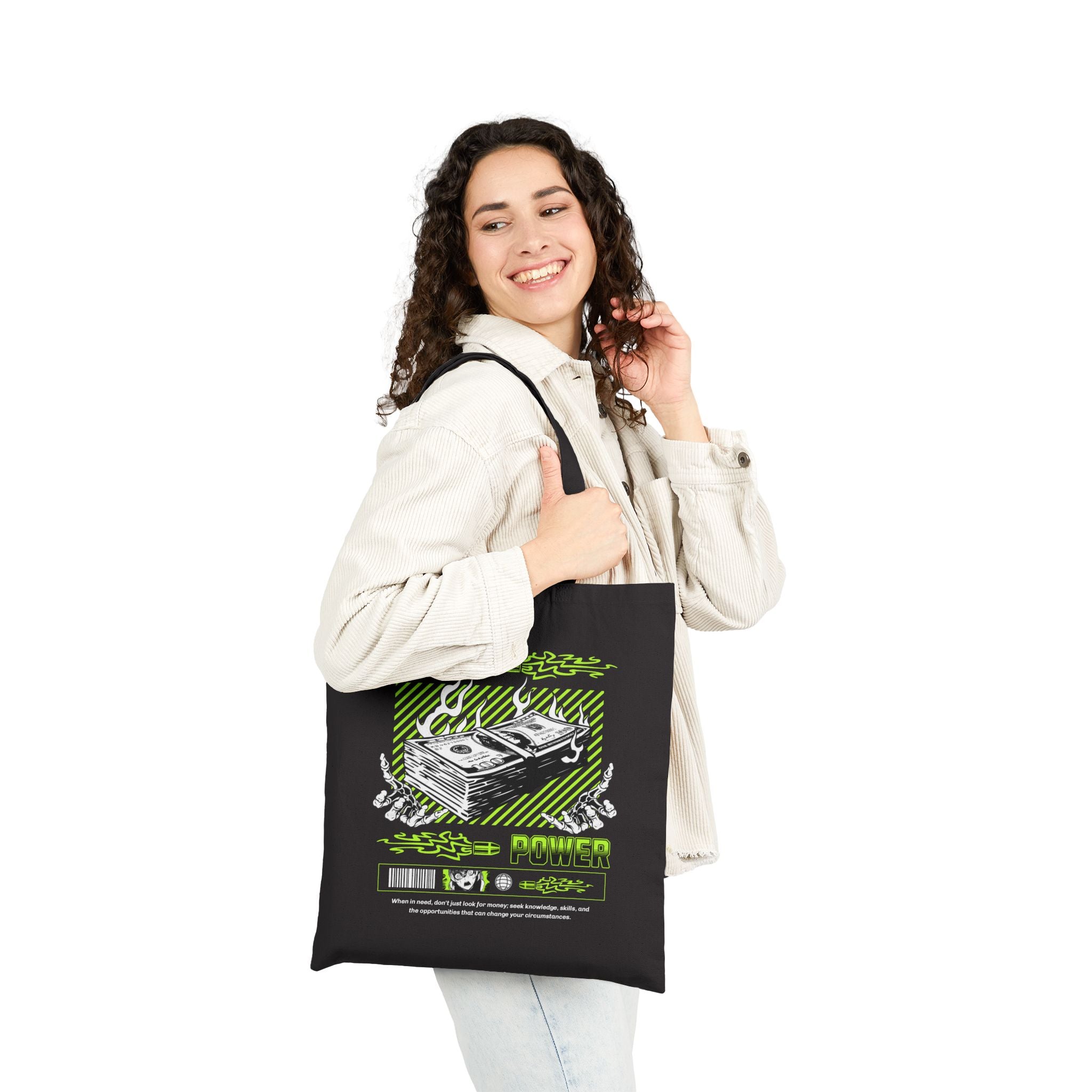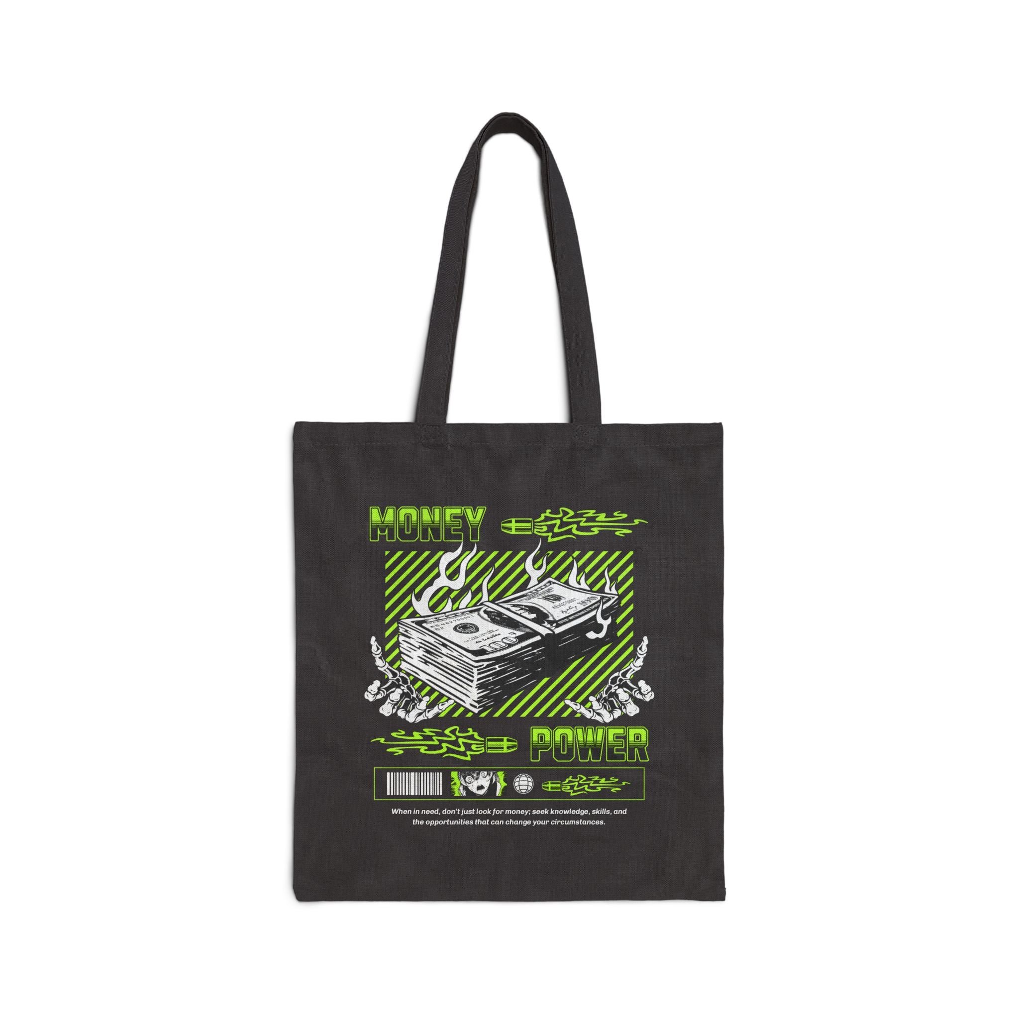 Turn your everyday essentials into a statement of ambition with the Money Power Cotton Canvas Tote Bag. Featuring a striking neon green dollar stack graphic surrounded by flames, this tote embodies the grind culture, hustle energy, and streetwear vibe that motivates you to chase power and success.