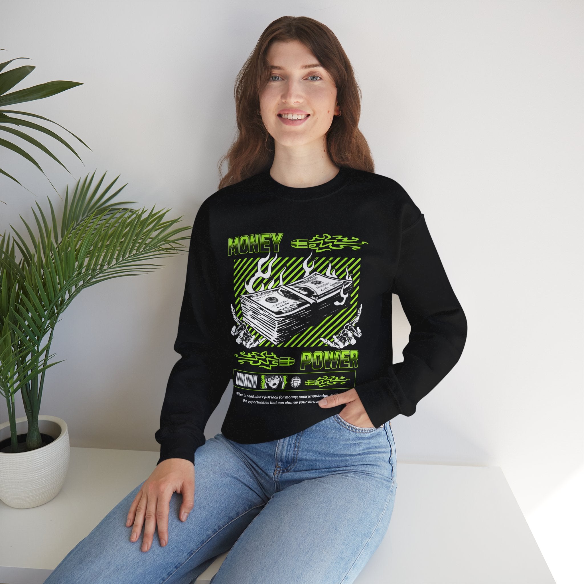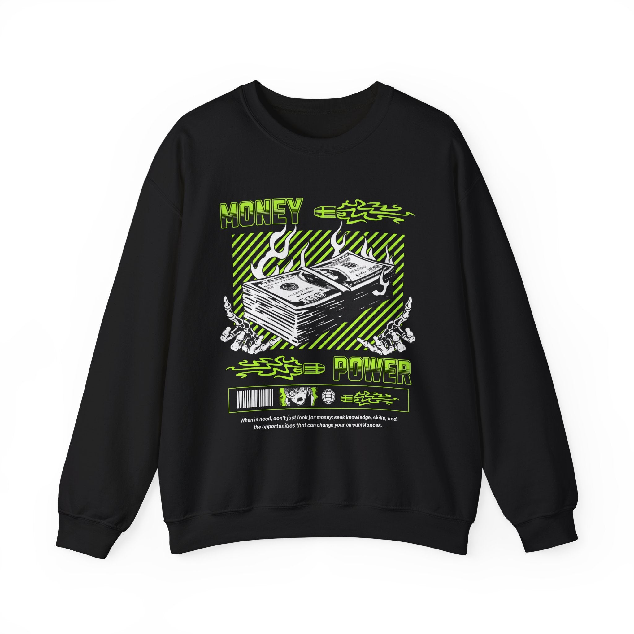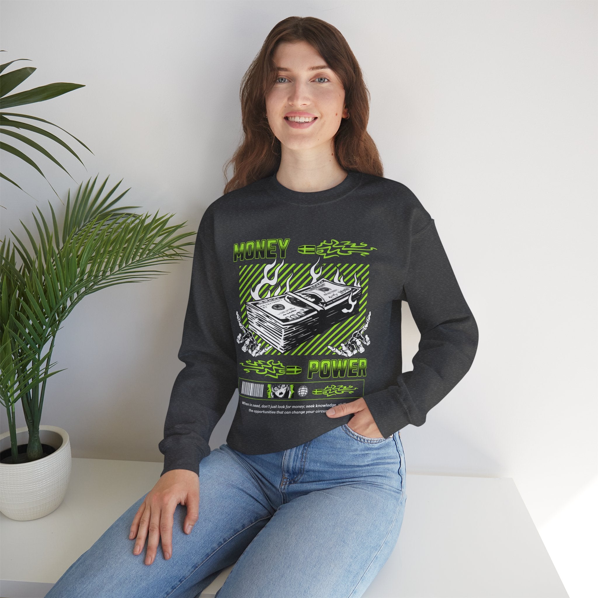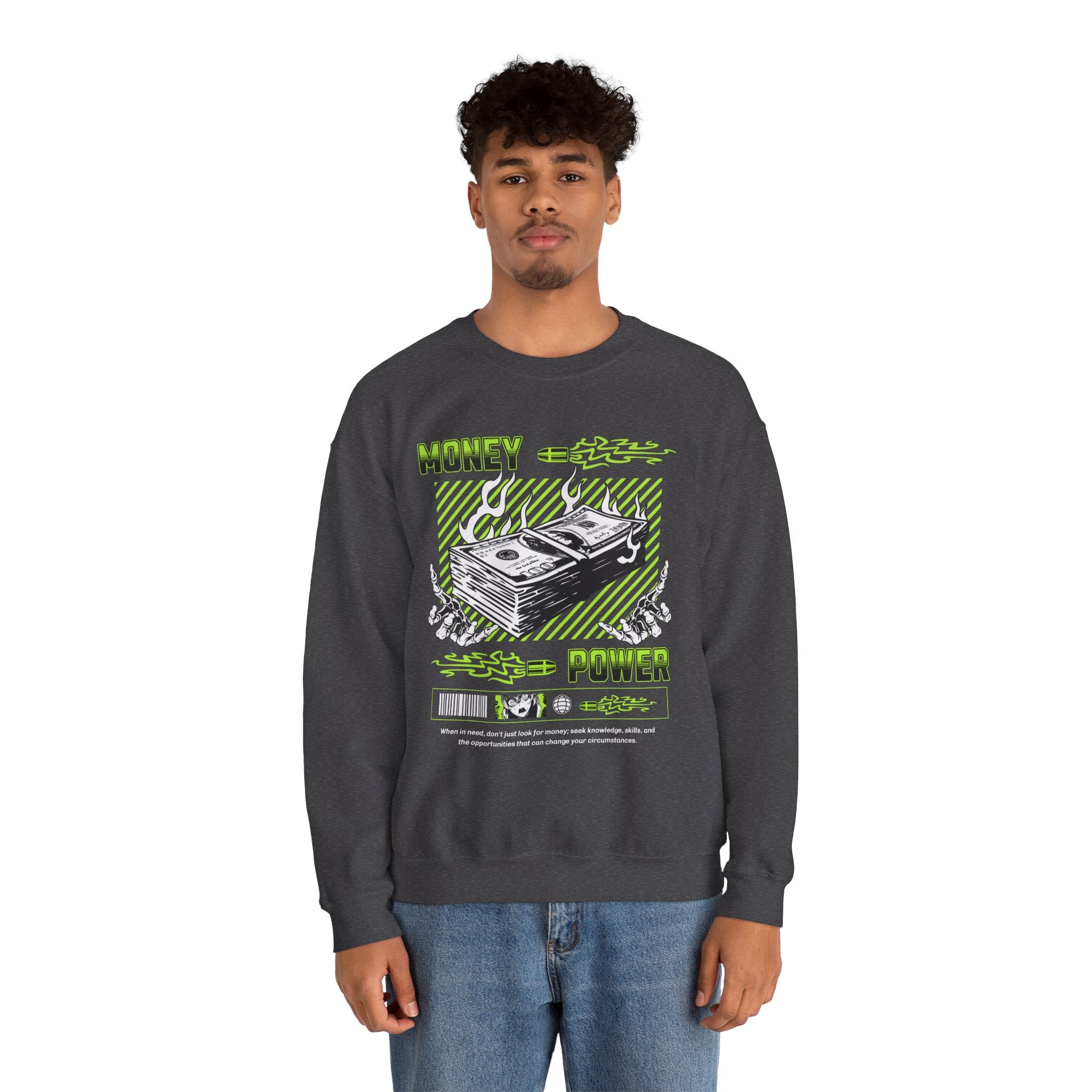 Stay motivated with the Money Power Unisex Heavy Blend Crewneck Sweatshirt, featuring a burning dollar stack surrounded by neon green energy and bold typography. This striking graphic blends hustle culture with urban streetwear aesthetics, making it a must-have for ambitious creators, entrepreneurs, and dream chasers.