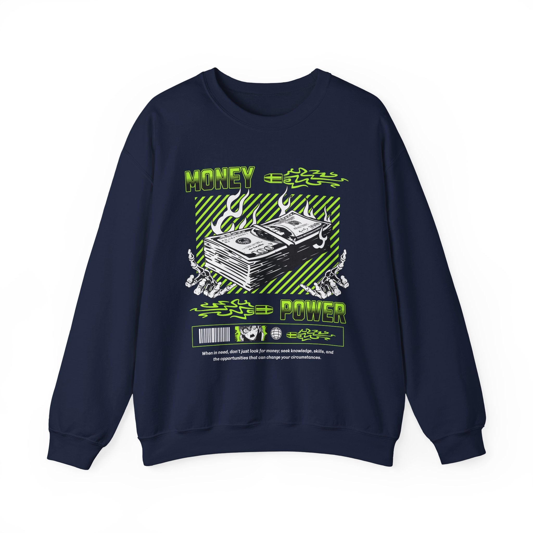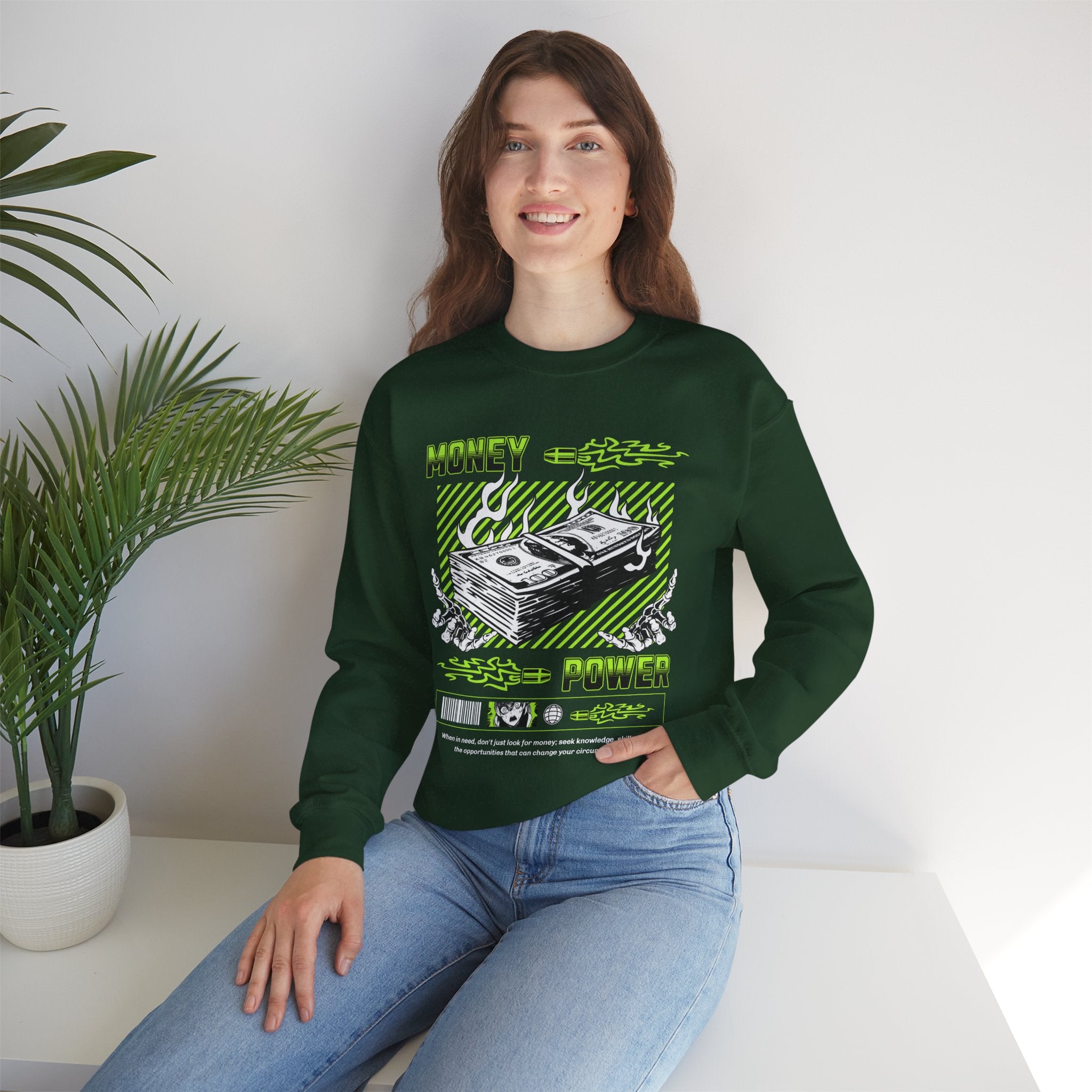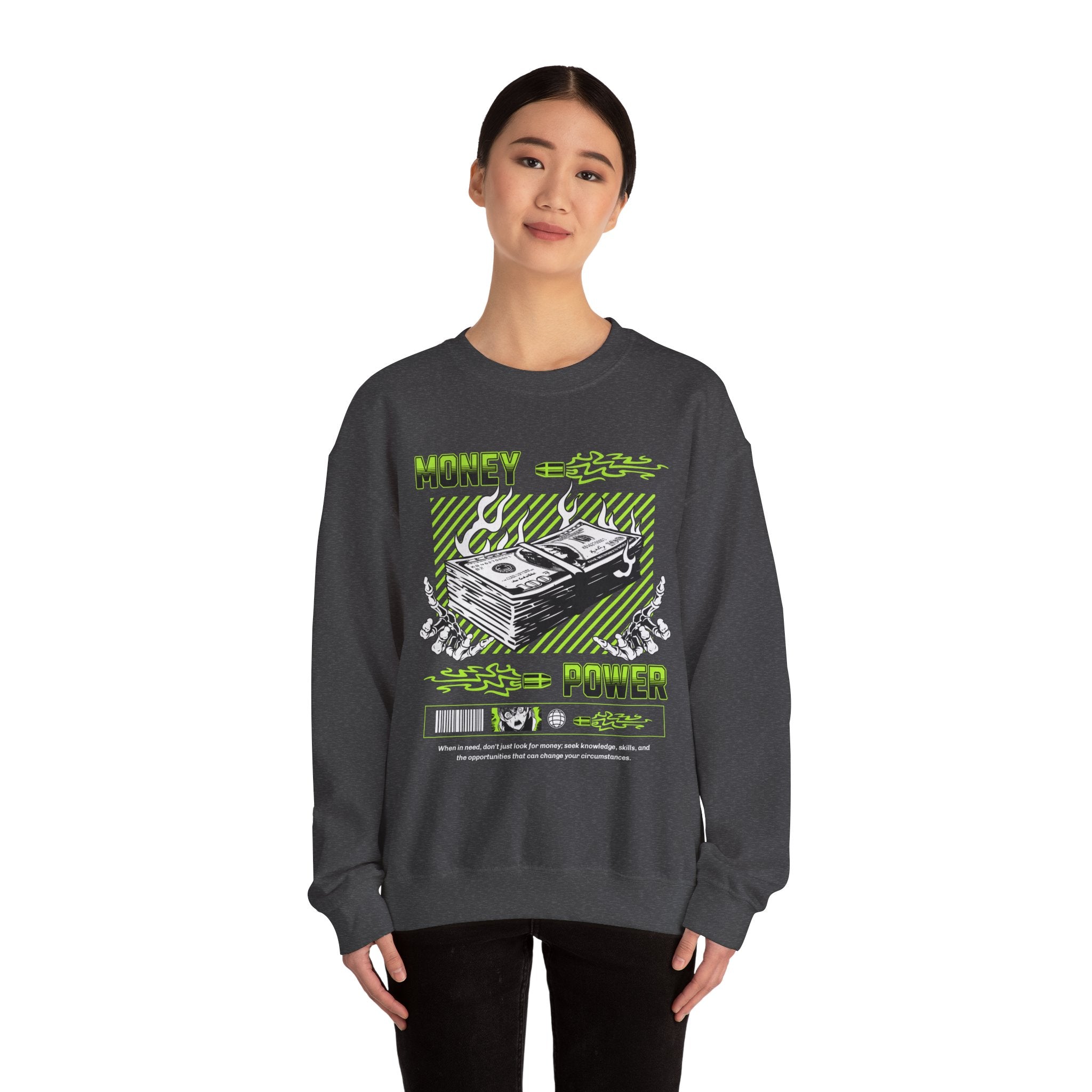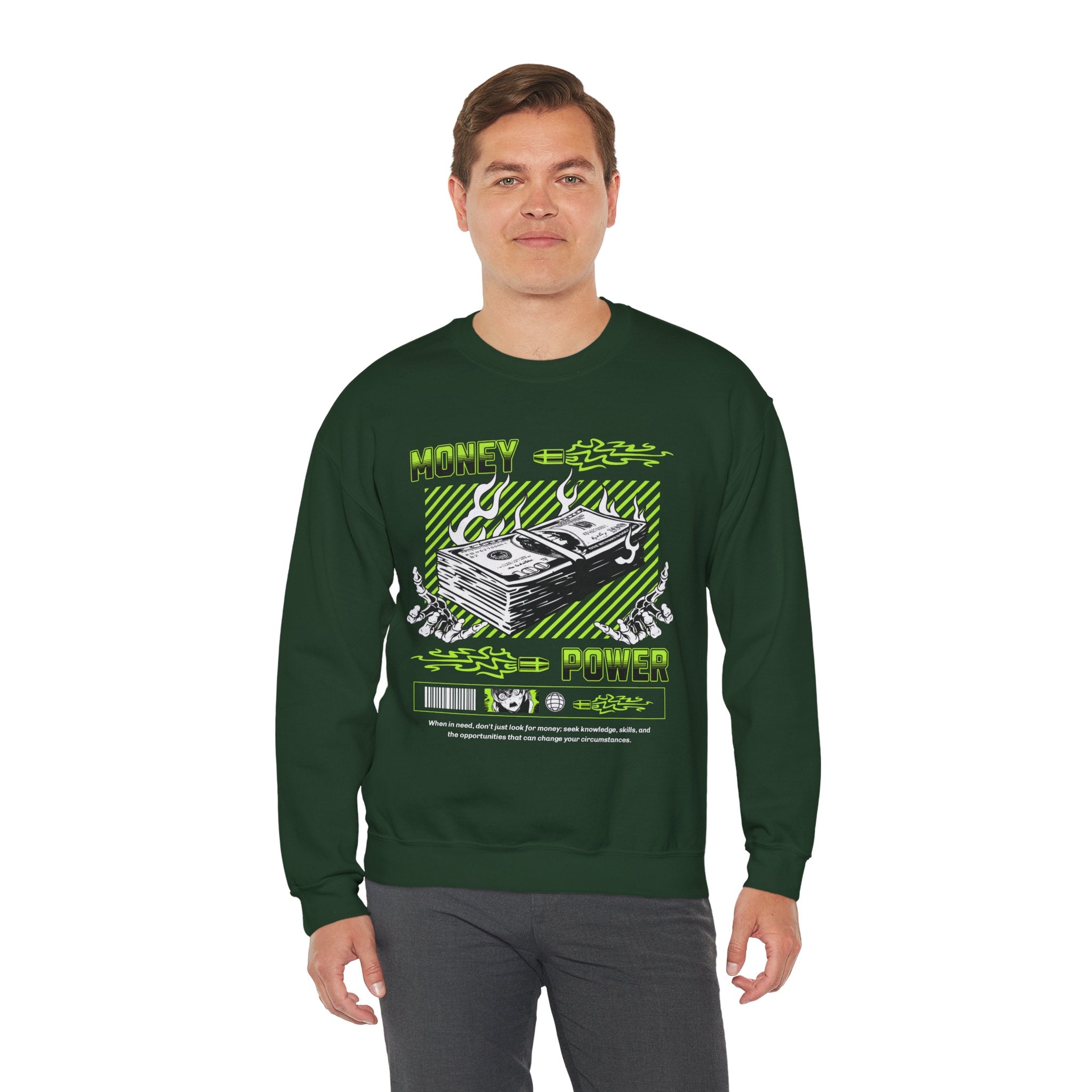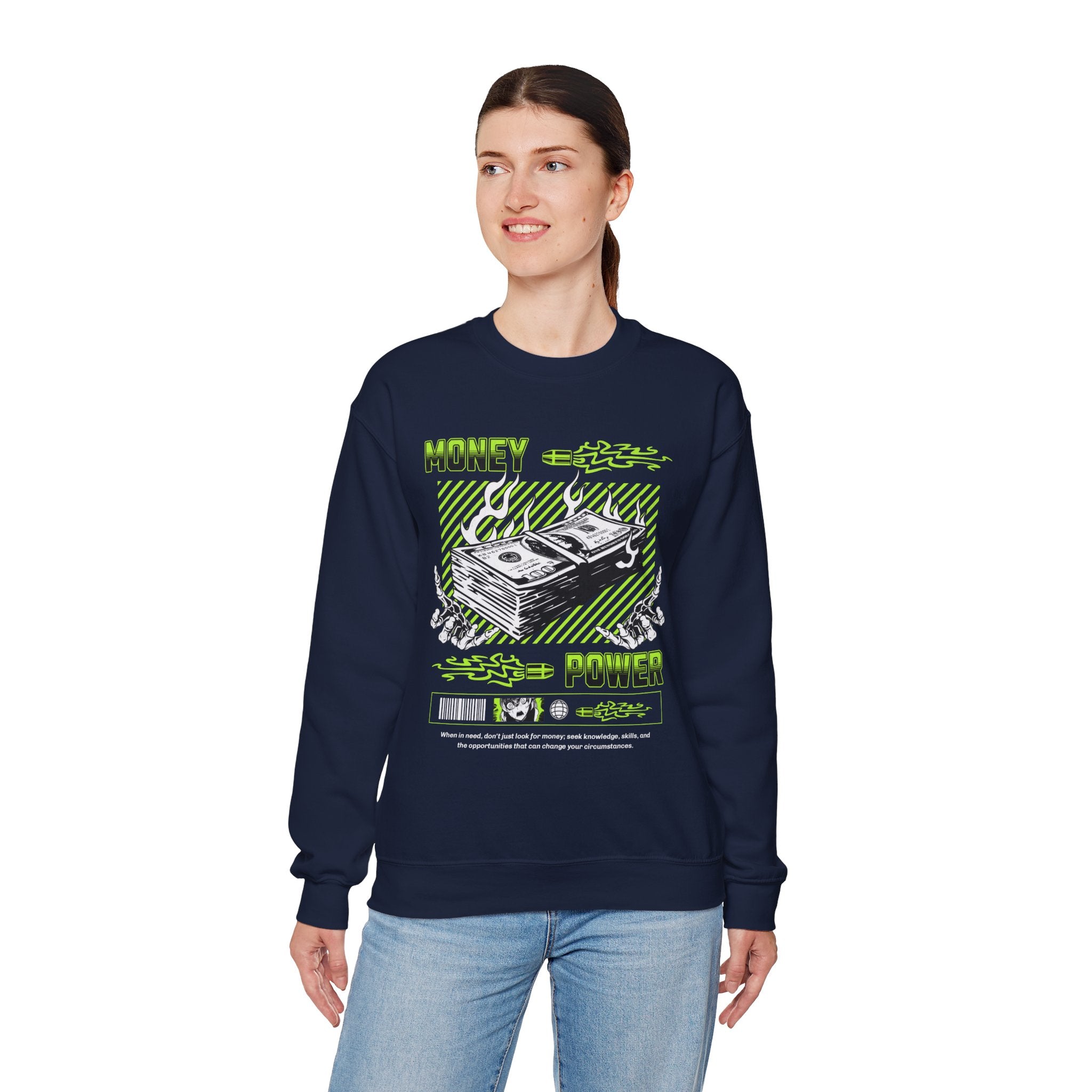 Stay motivated with the Money Power Unisex Heavy Blend Crewneck Sweatshirt, featuring a burning dollar stack surrounded by neon green energy and bold typography. This striking graphic blends hustle culture with urban streetwear aesthetics, making it a must-have for ambitious creators, entrepreneurs, and dream chasers.