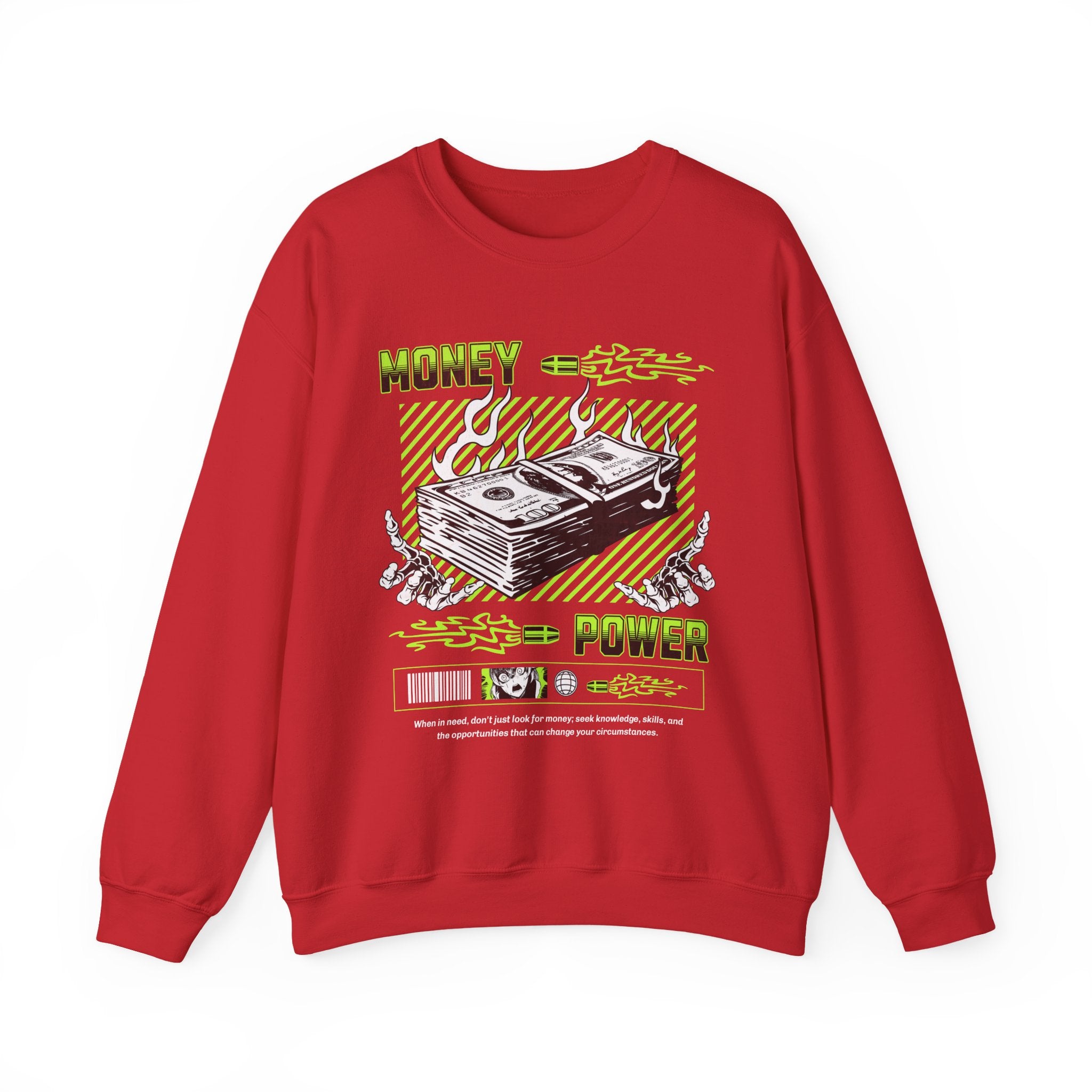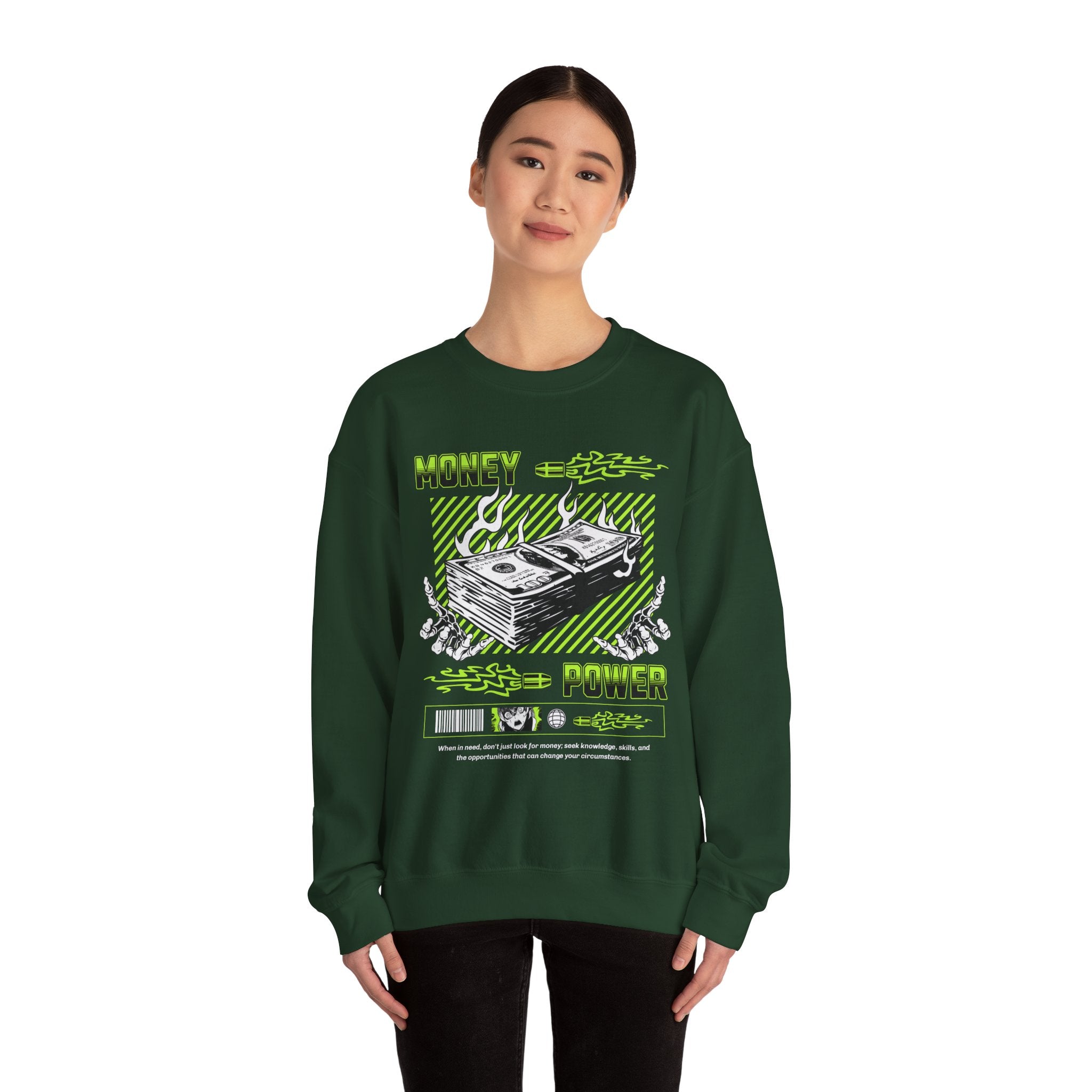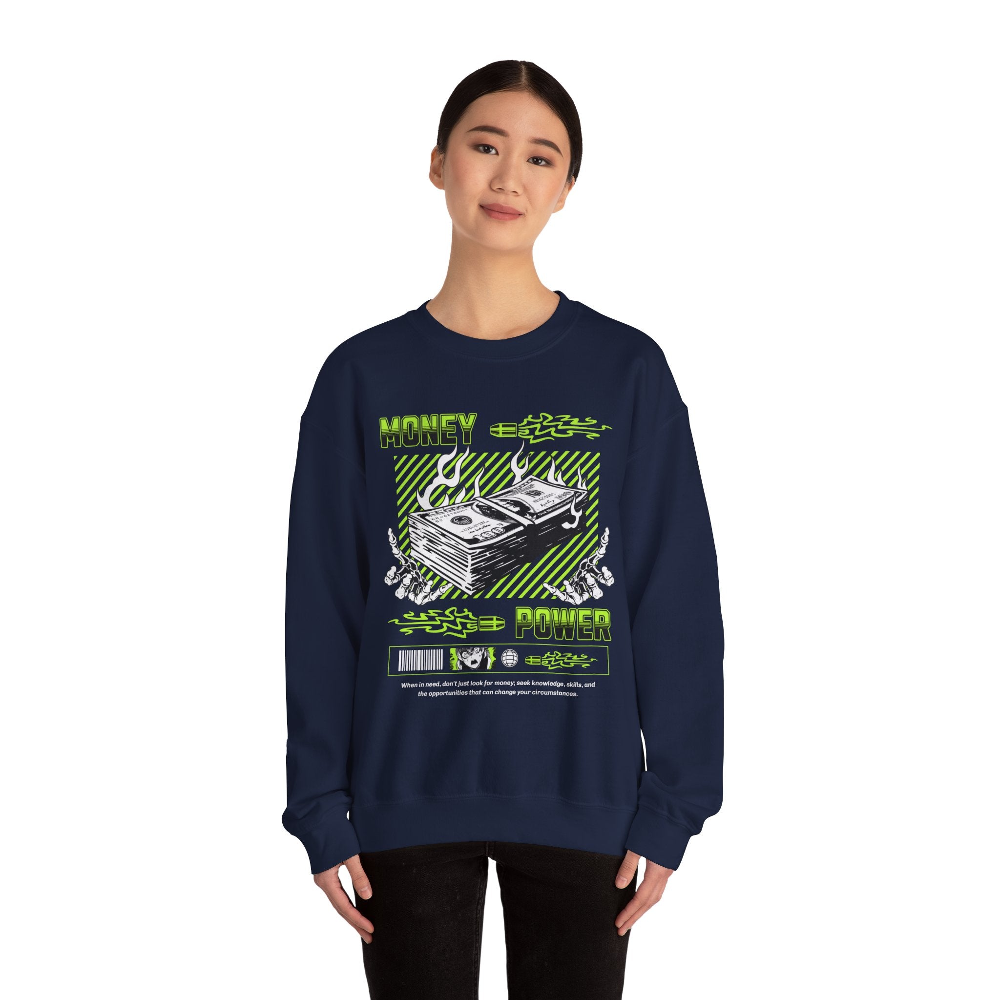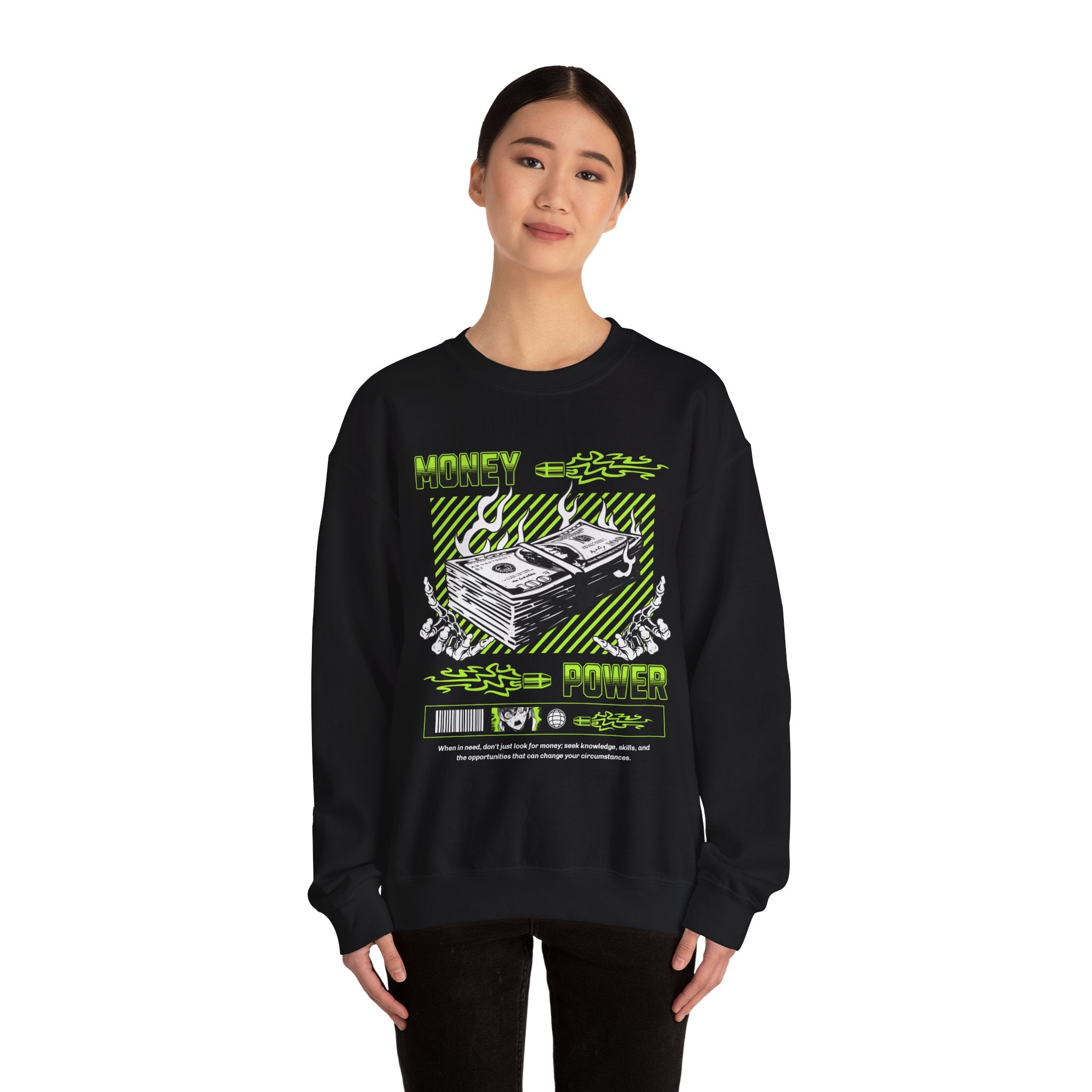 Stay motivated with the Money Power Unisex Heavy Blend Crewneck Sweatshirt, featuring a burning dollar stack surrounded by neon green energy and bold typography. This striking graphic blends hustle culture with urban streetwear aesthetics, making it a must-have for ambitious creators, entrepreneurs, and dream chasers.