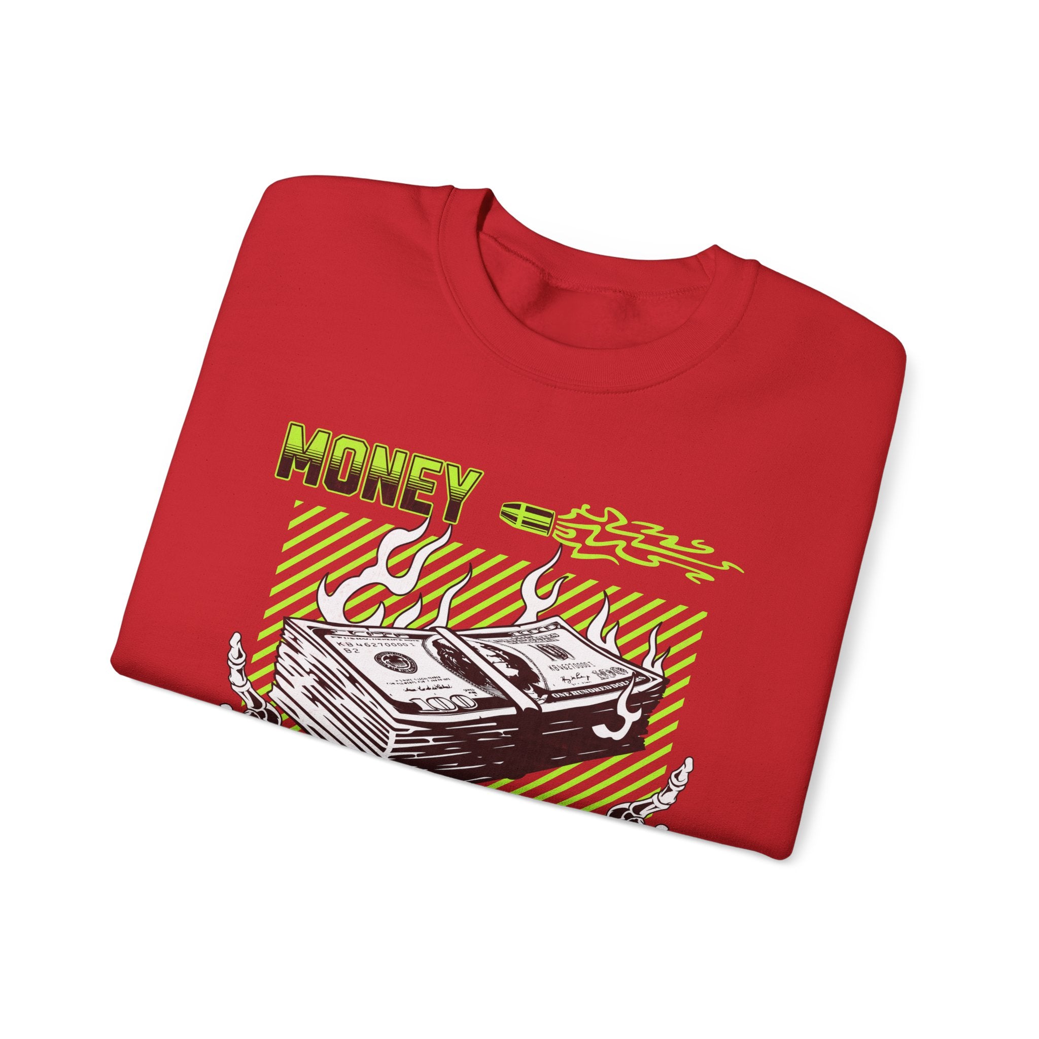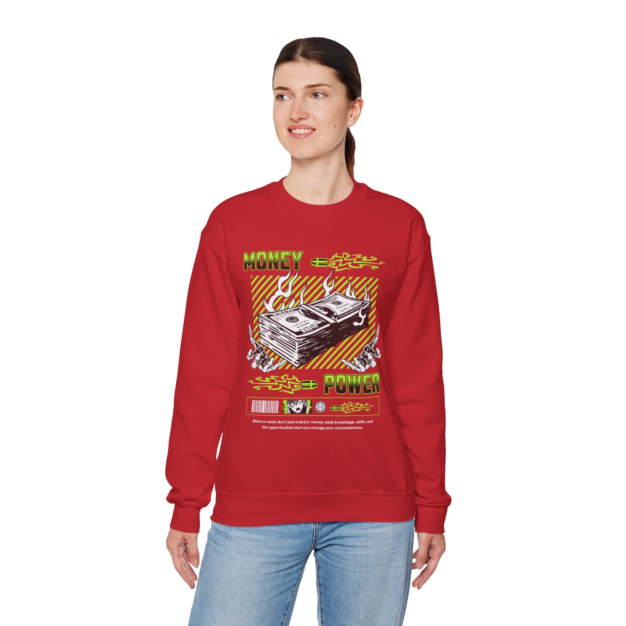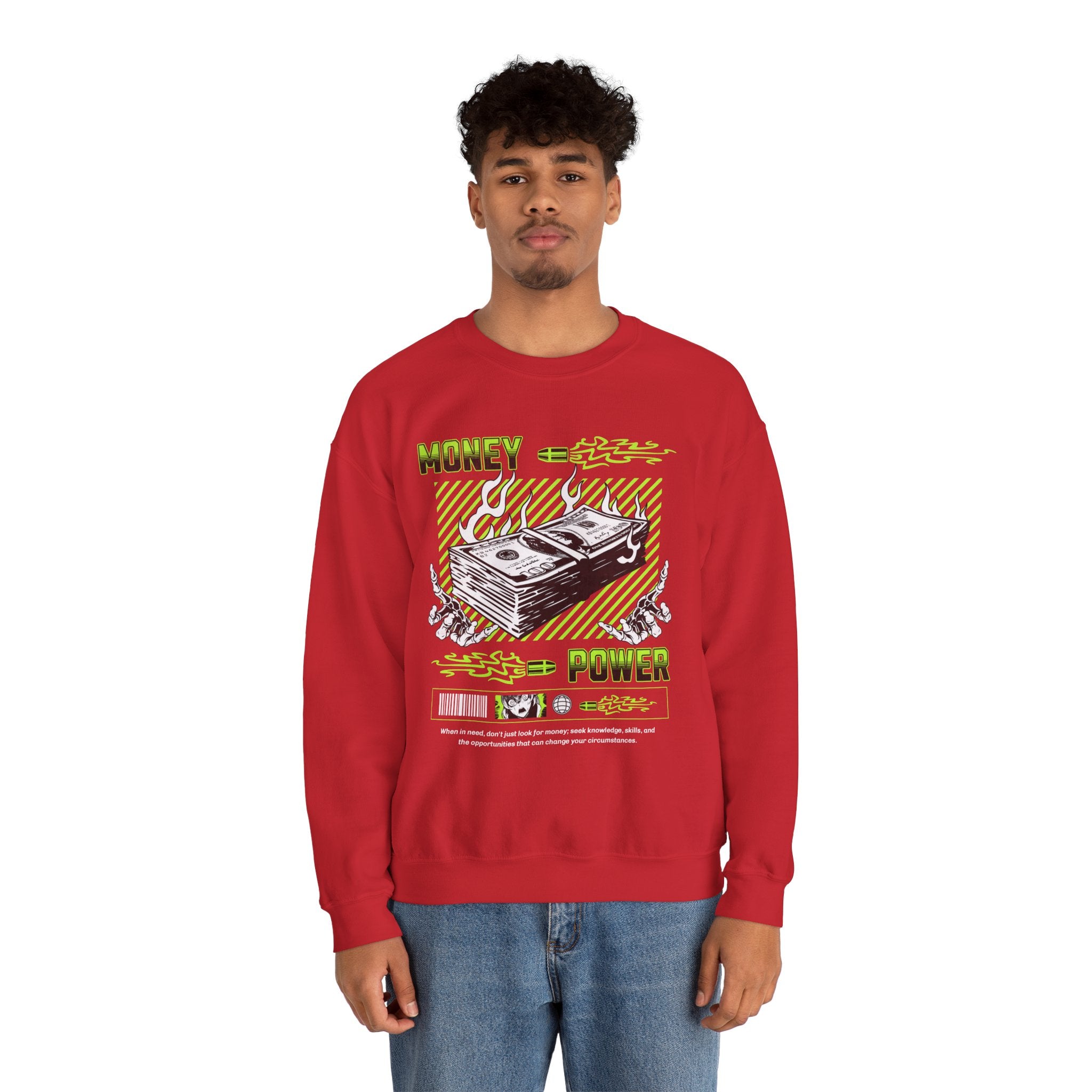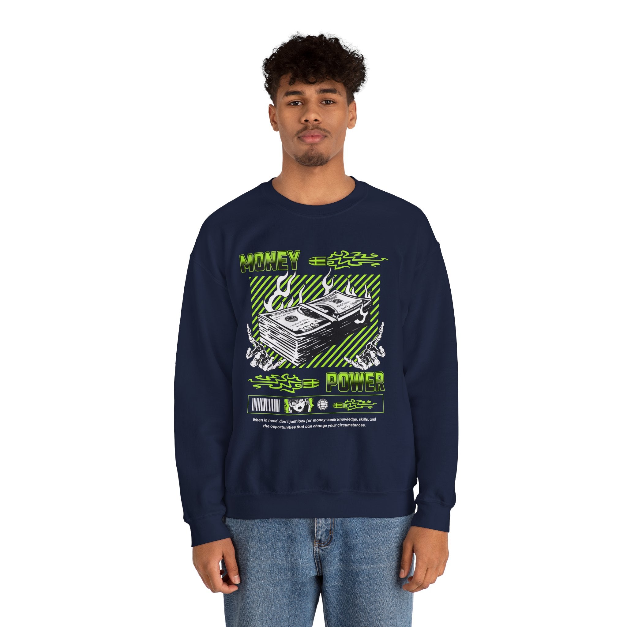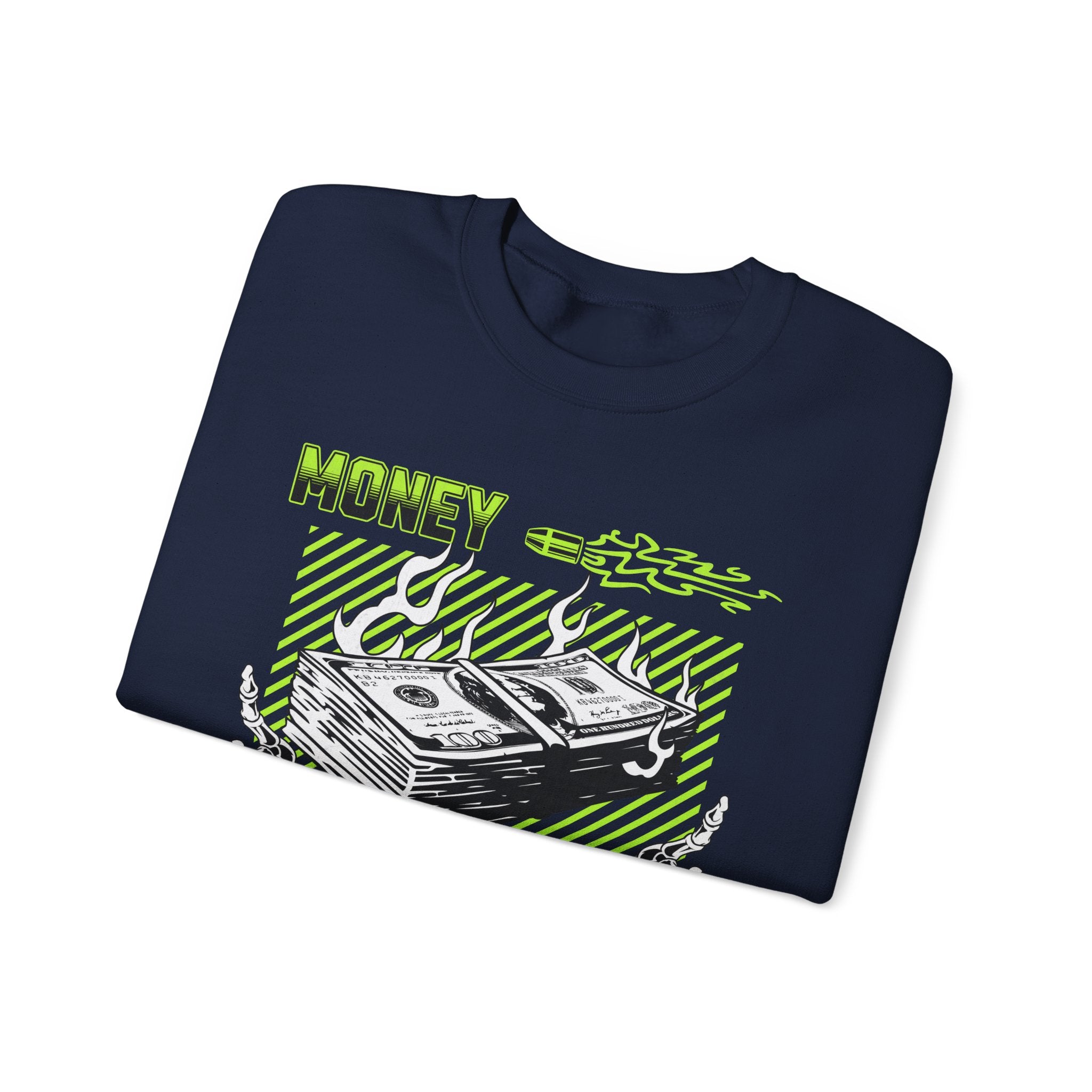 Stay motivated with the Money Power Unisex Heavy Blend Crewneck Sweatshirt, featuring a burning dollar stack surrounded by neon green energy and bold typography. This striking graphic blends hustle culture with urban streetwear aesthetics, making it a must-have for ambitious creators, entrepreneurs, and dream chasers.