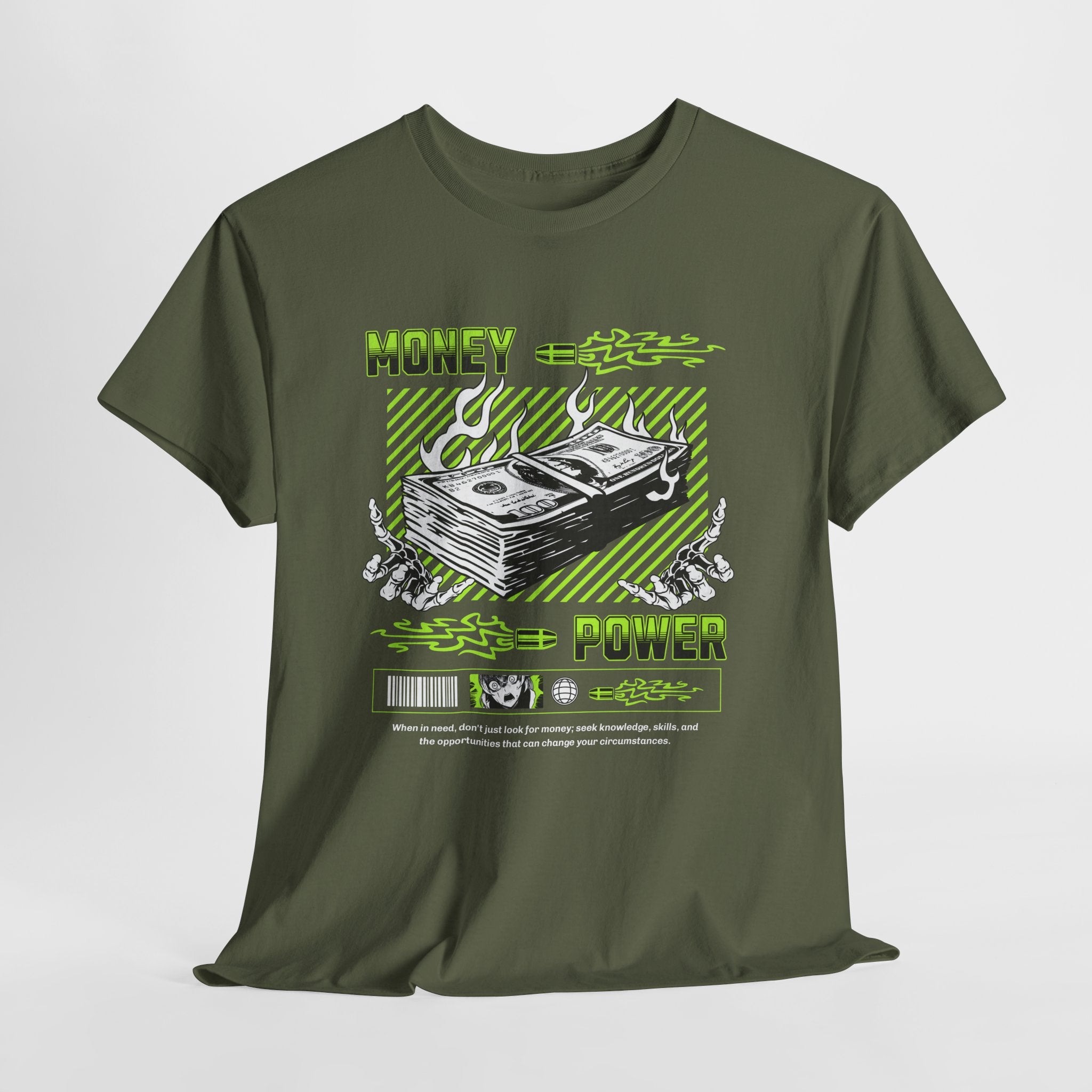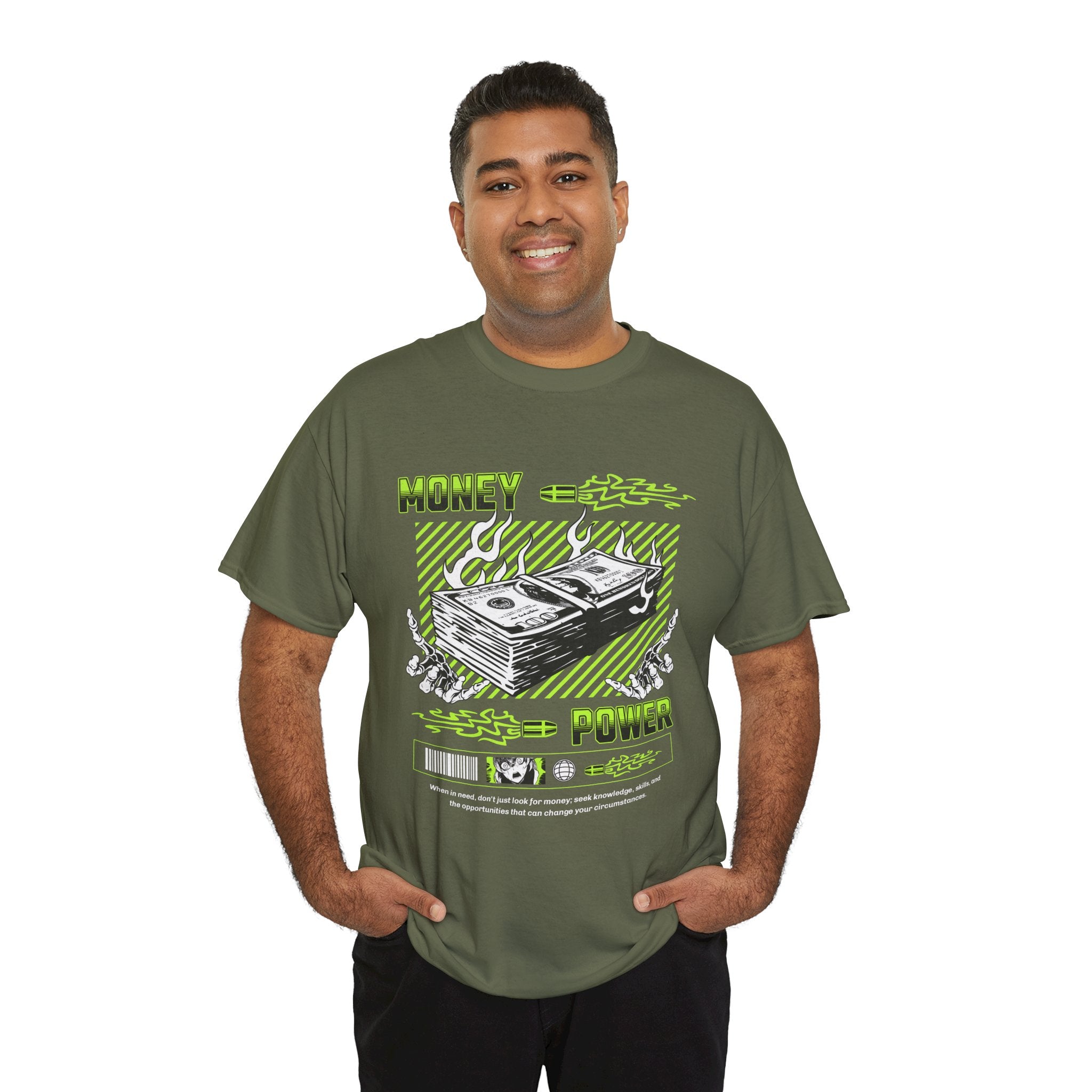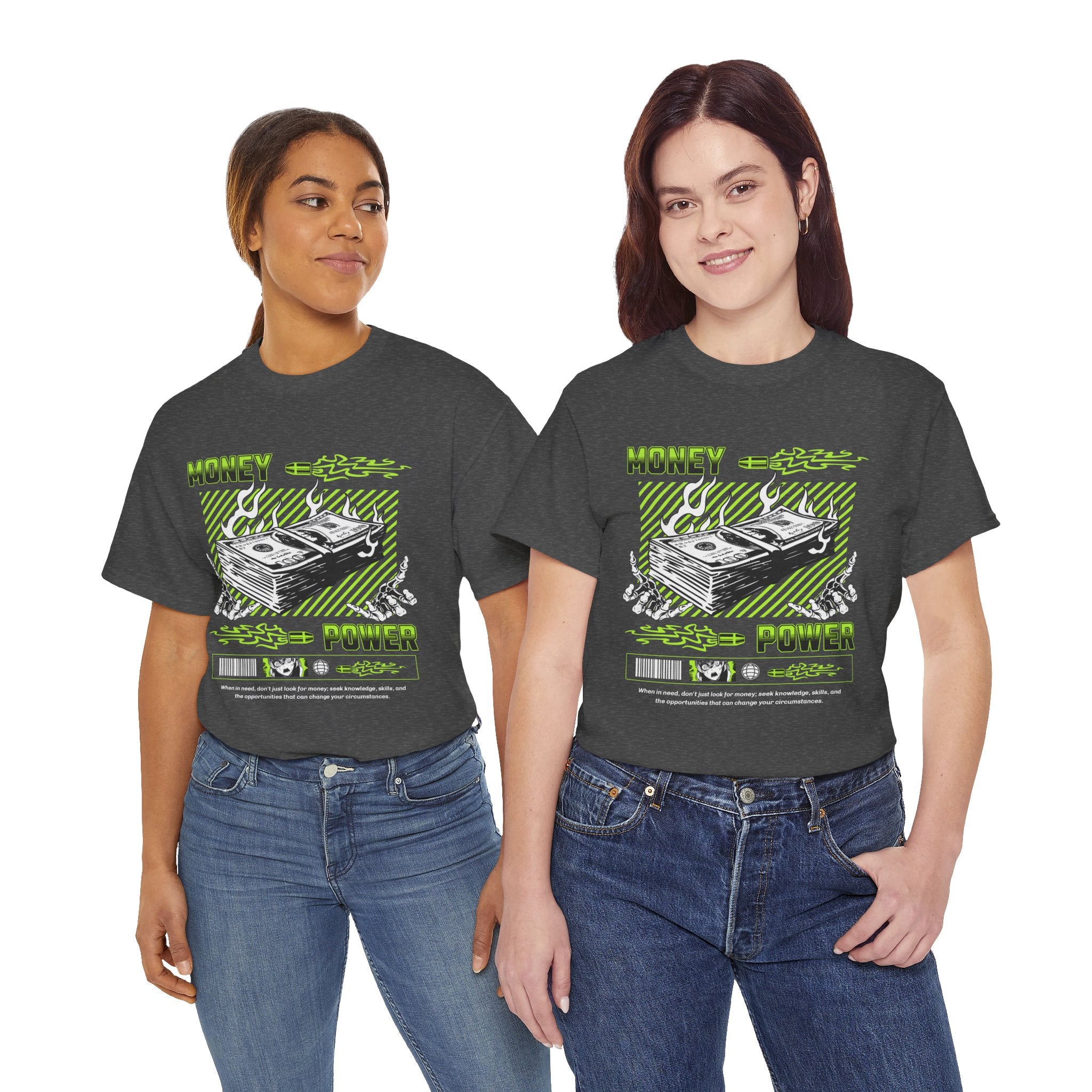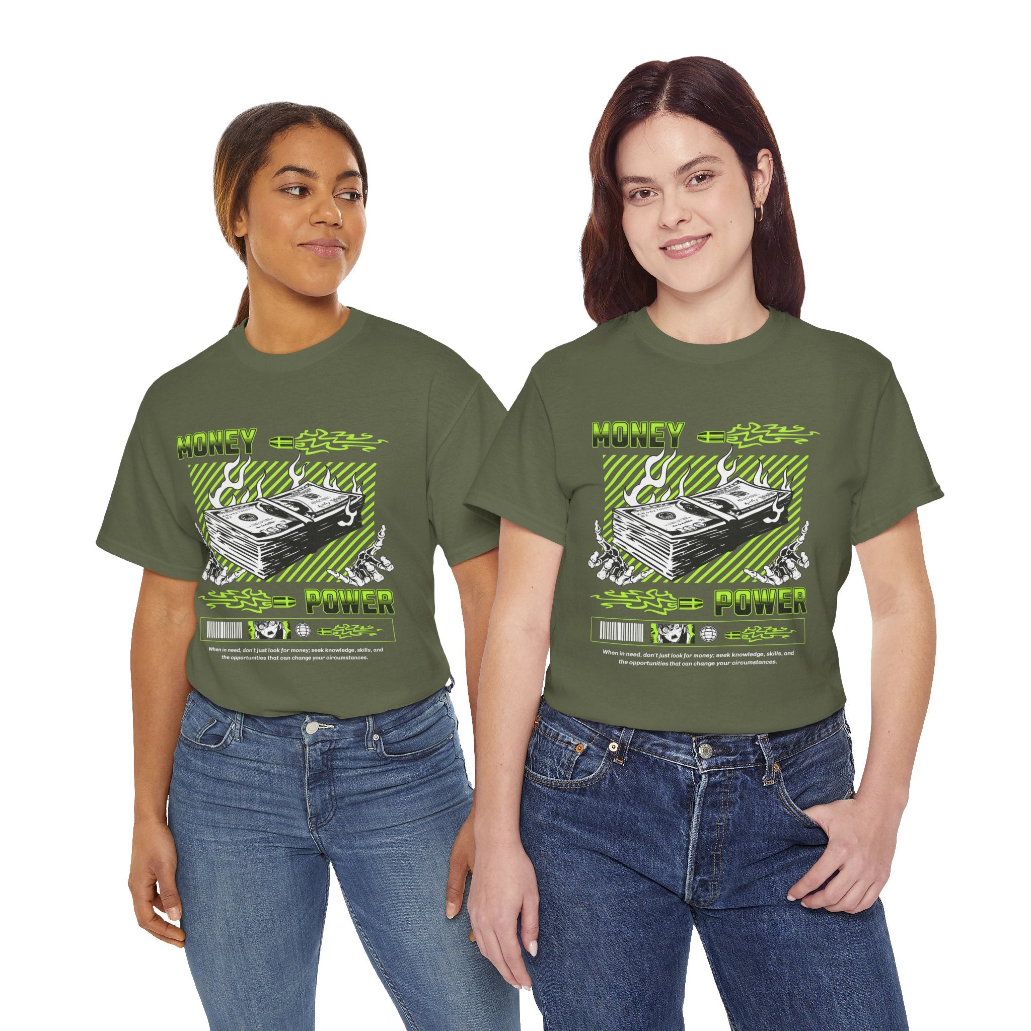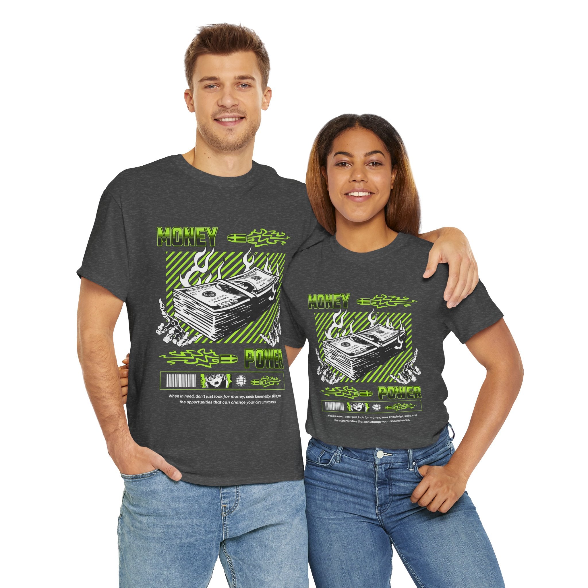 The Money Power Unisex Heavy Cotton Tee captures the raw energy of hustle culture with its stack of dollar bills set against neon green flames and bold typography. A striking graphic that screams power, ambition, and confidence, this tee is made for those who grind hard and dream big.