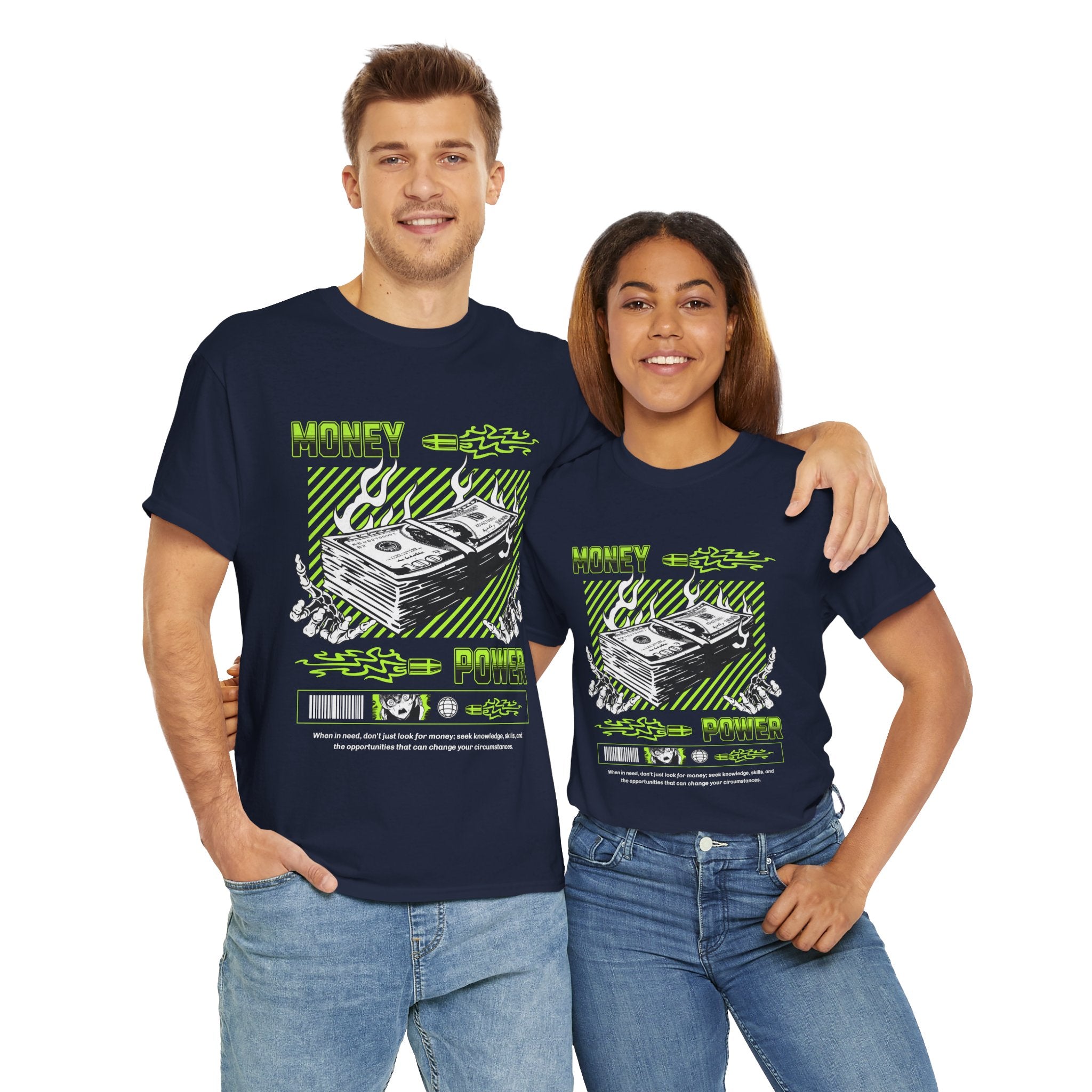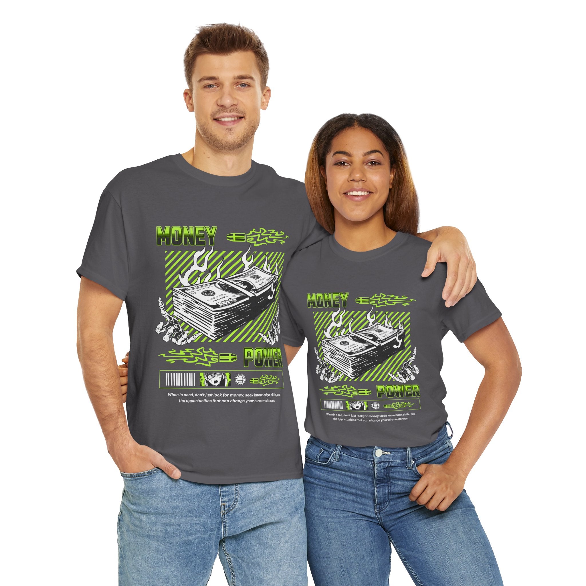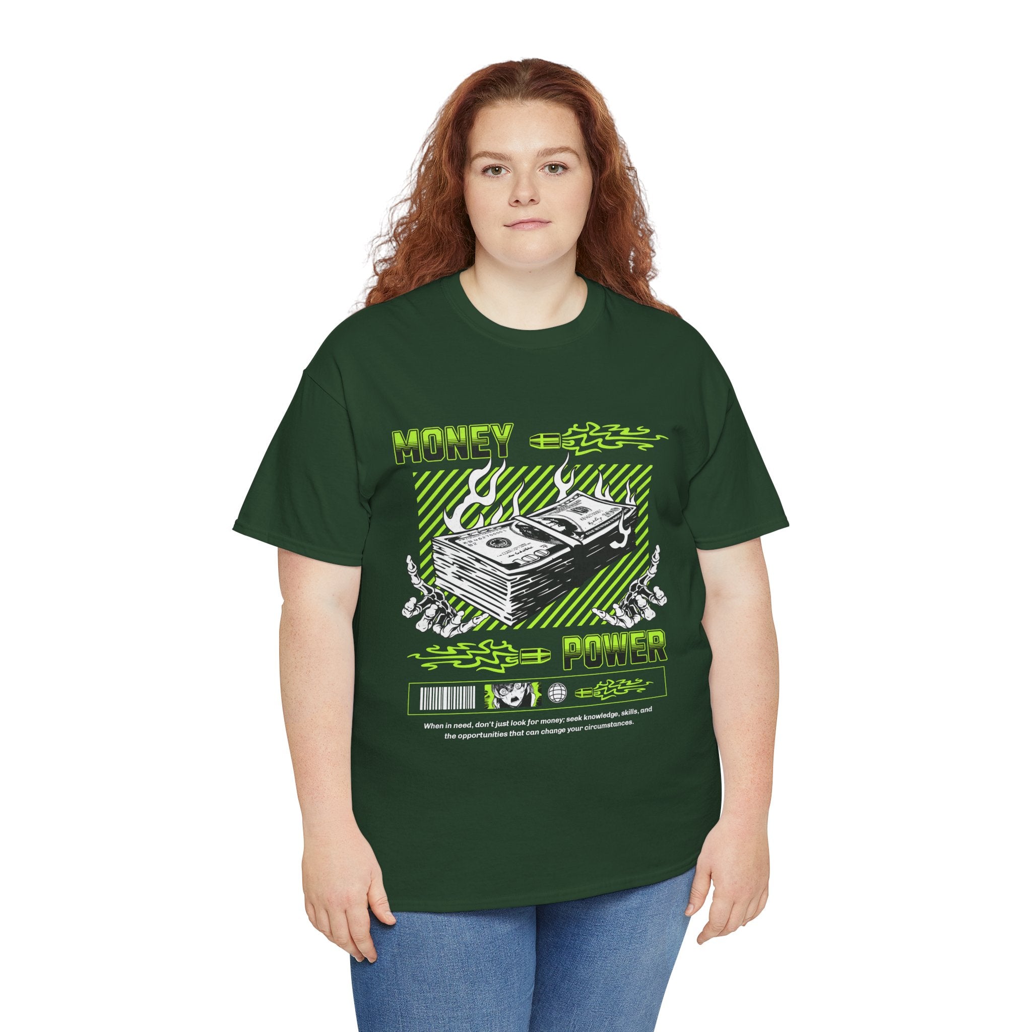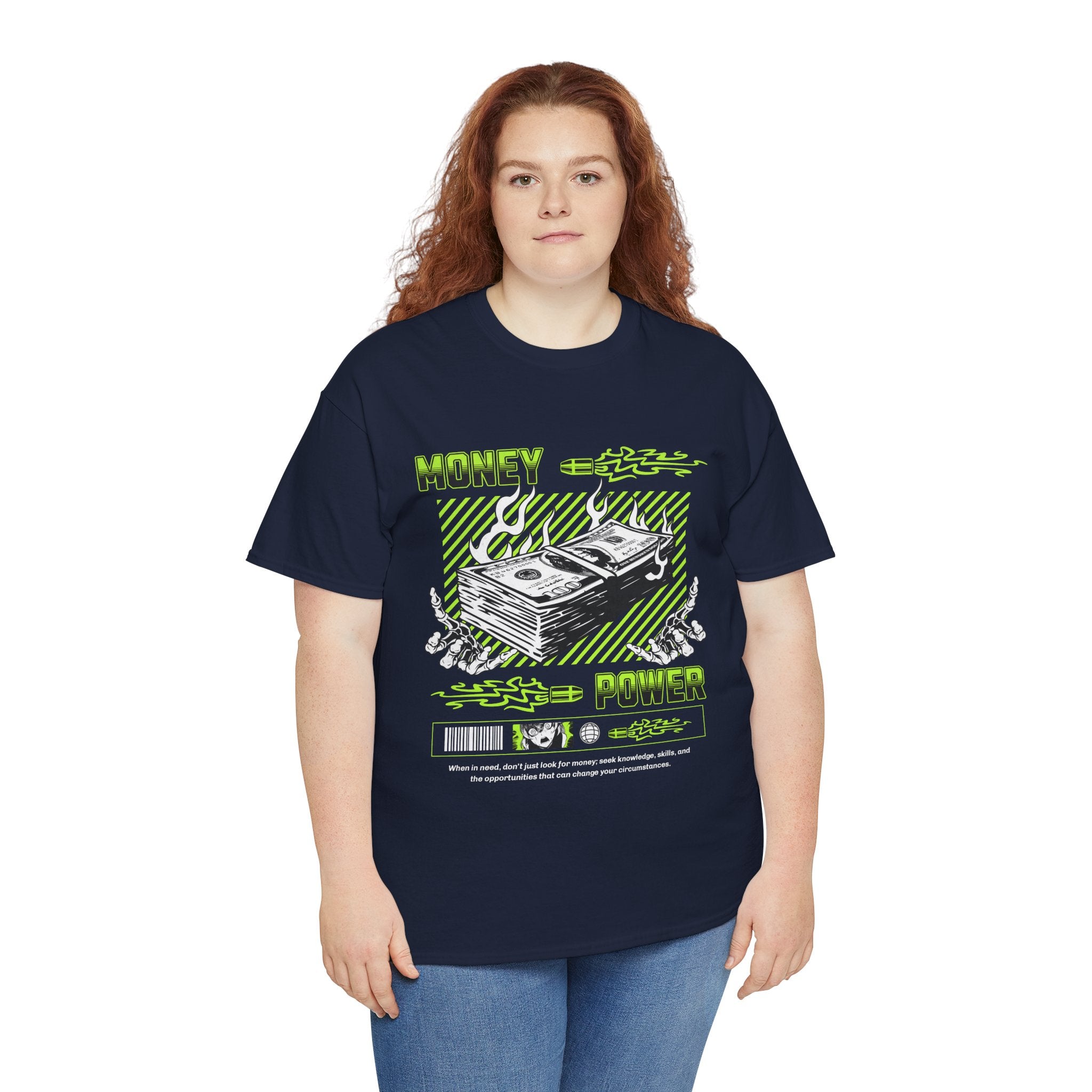 The Money Power Unisex Heavy Cotton Tee captures the raw energy of hustle culture with its stack of dollar bills set against neon green flames and bold typography. A striking graphic that screams power, ambition, and confidence, this tee is made for those who grind hard and dream big.