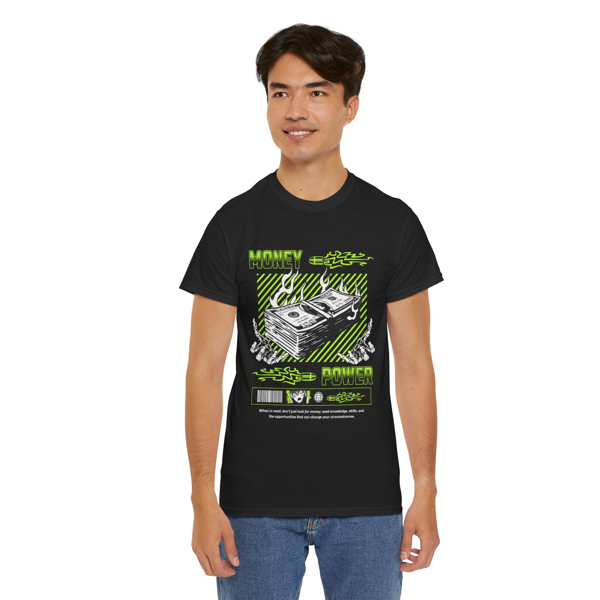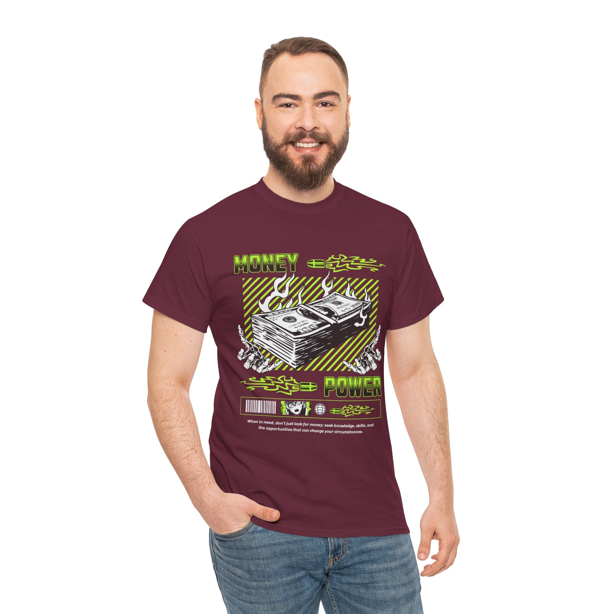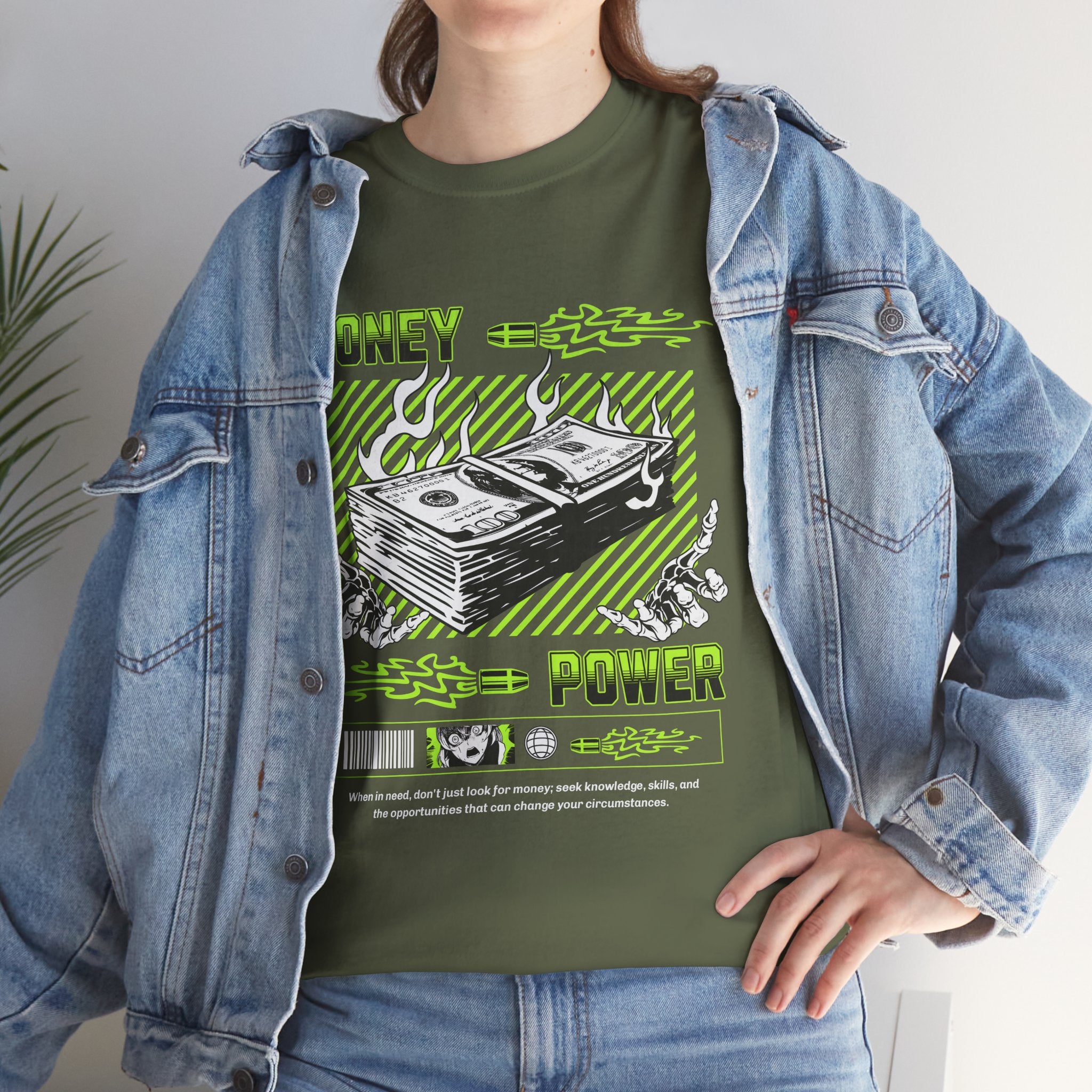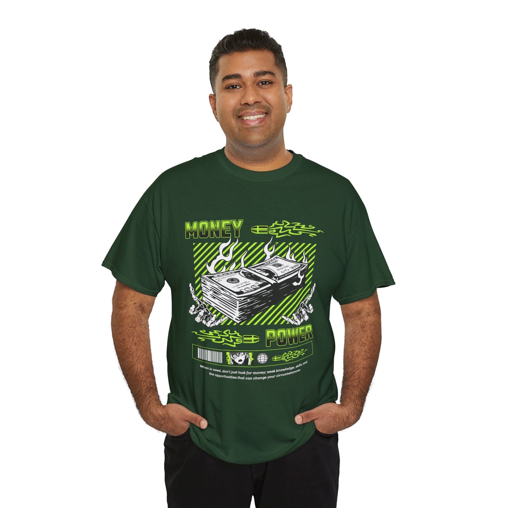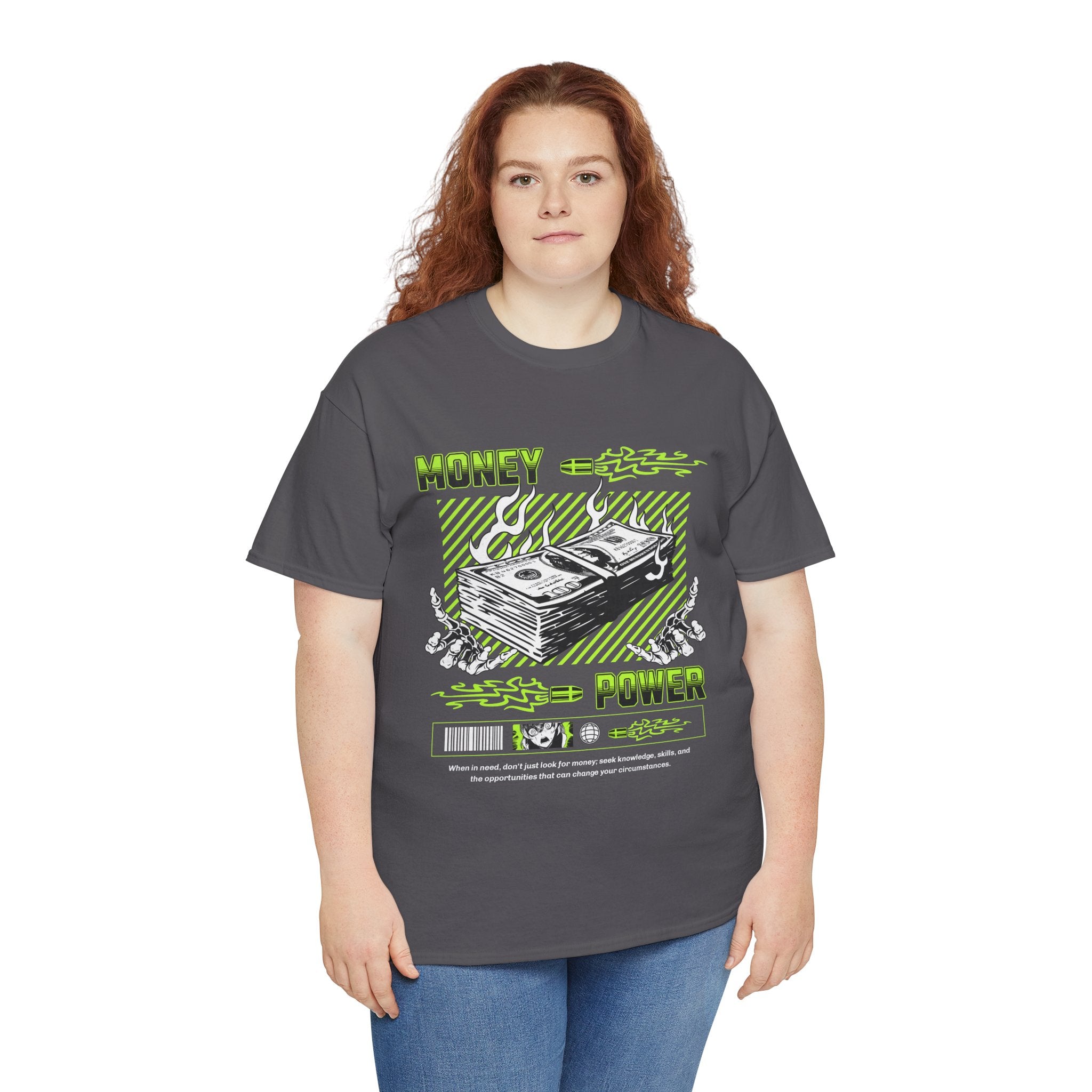 The Money Power Unisex Heavy Cotton Tee captures the raw energy of hustle culture with its stack of dollar bills set against neon green flames and bold typography. A striking graphic that screams power, ambition, and confidence, this tee is made for those who grind hard and dream big.