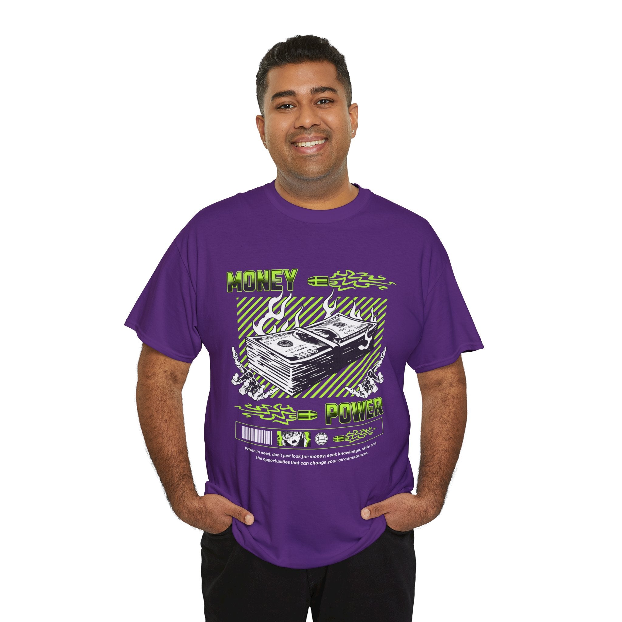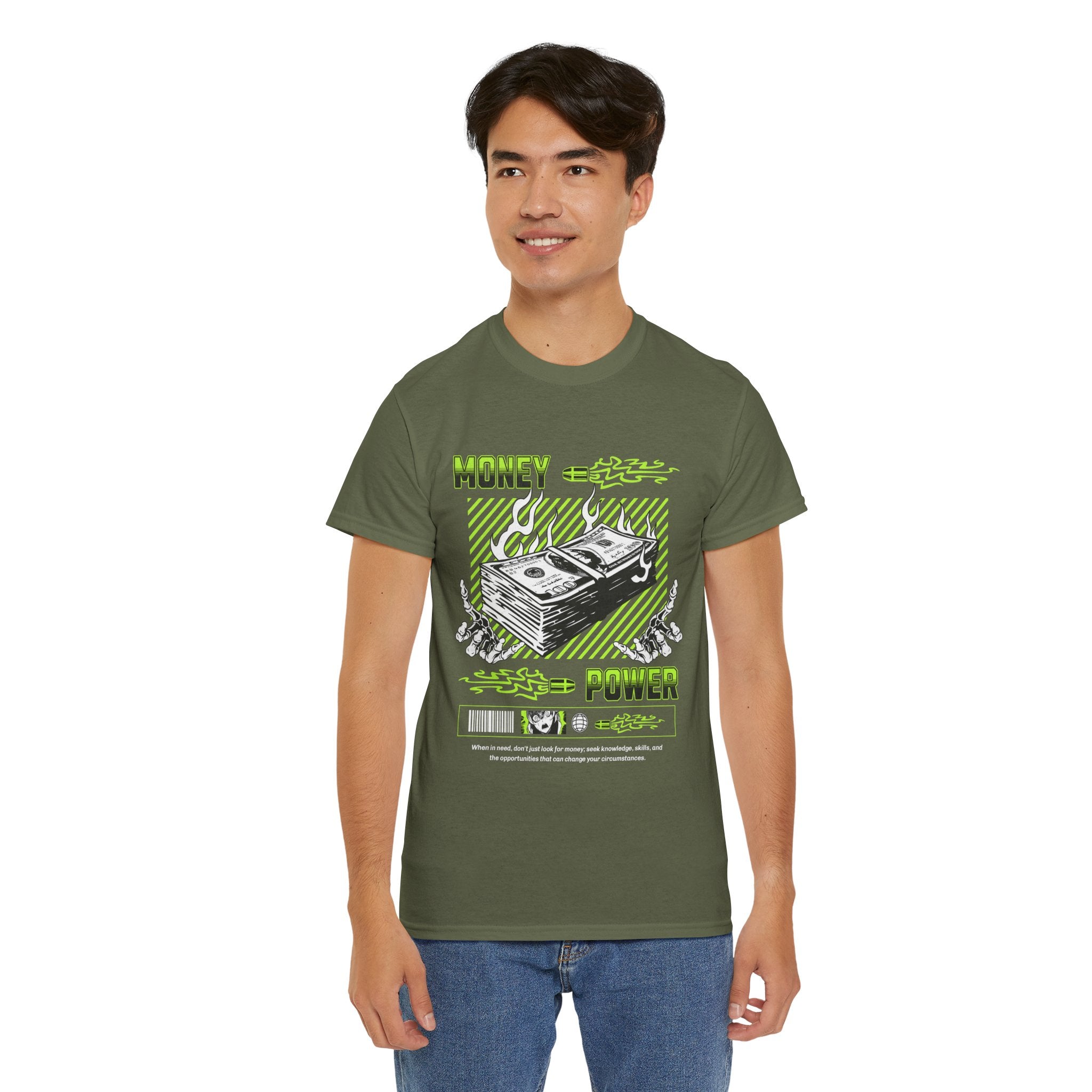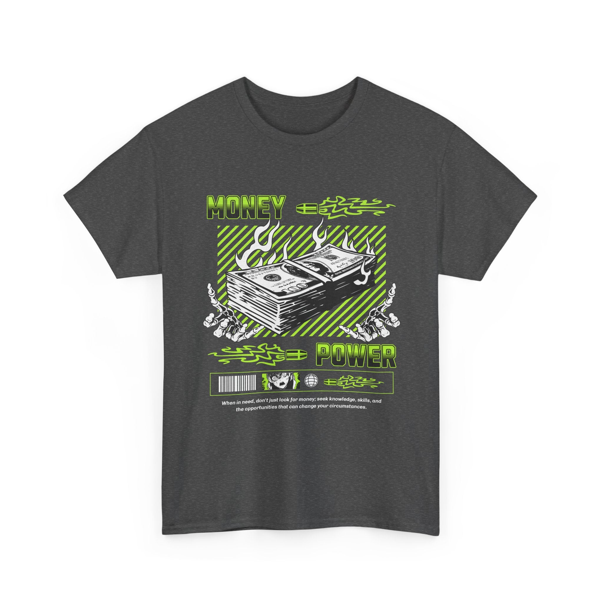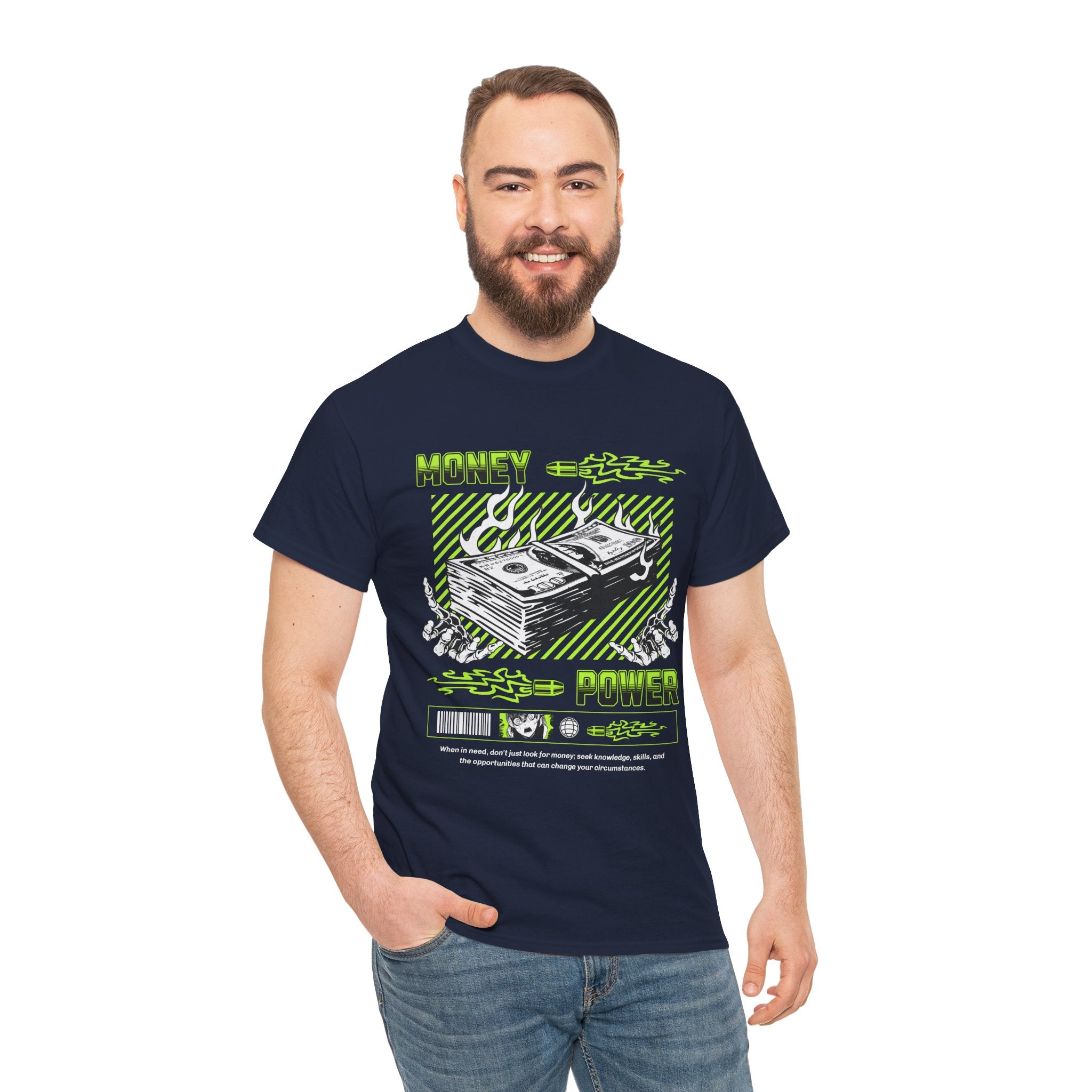 The Money Power Unisex Heavy Cotton Tee captures the raw energy of hustle culture with its stack of dollar bills set against neon green flames and bold typography. A striking graphic that screams power, ambition, and confidence, this tee is made for those who grind hard and dream big.