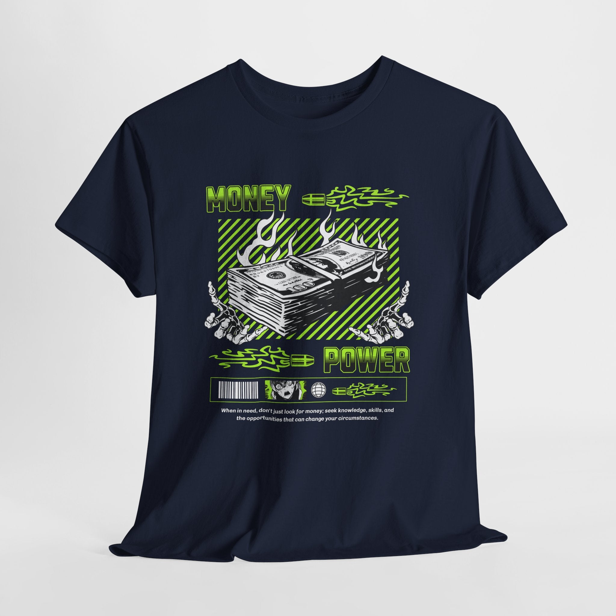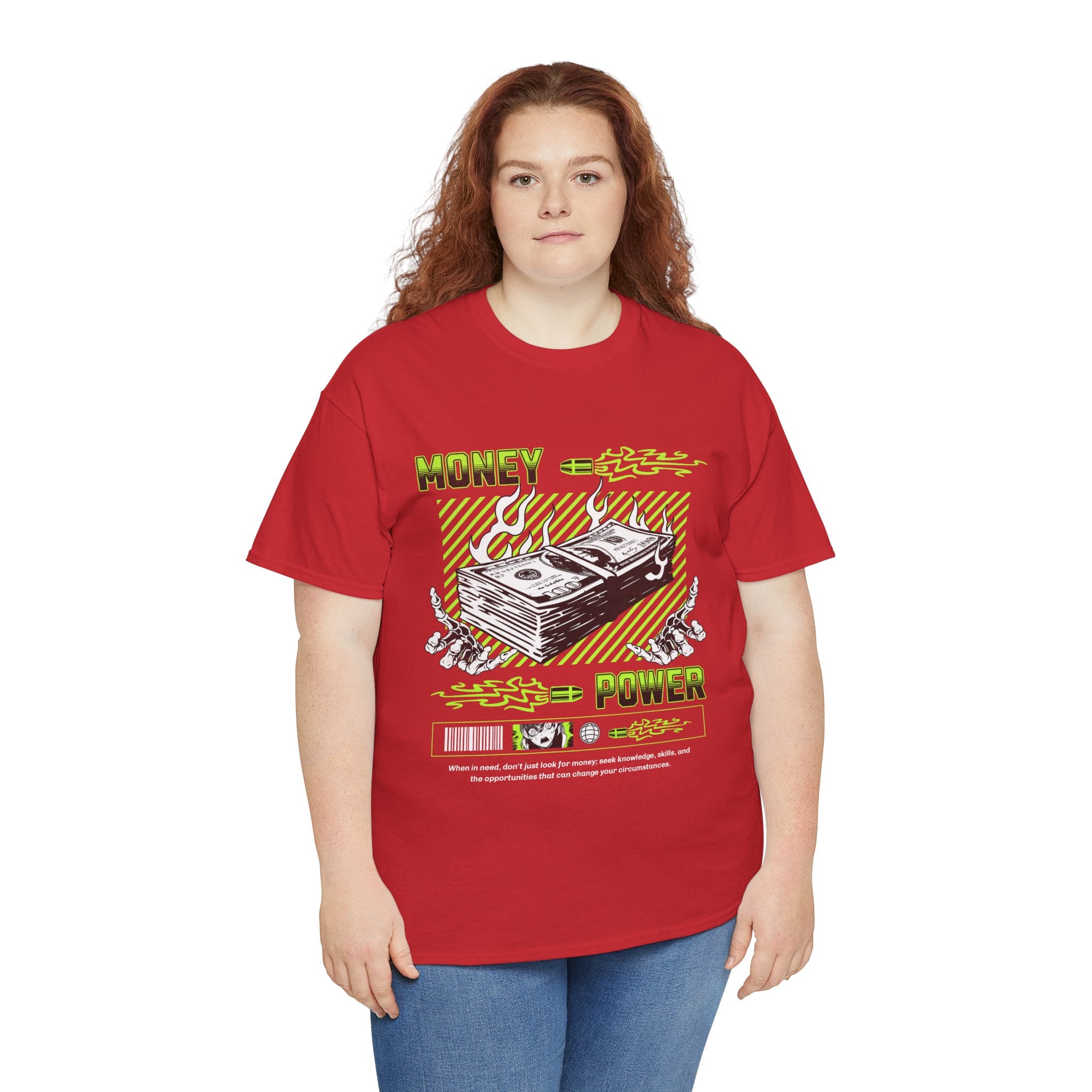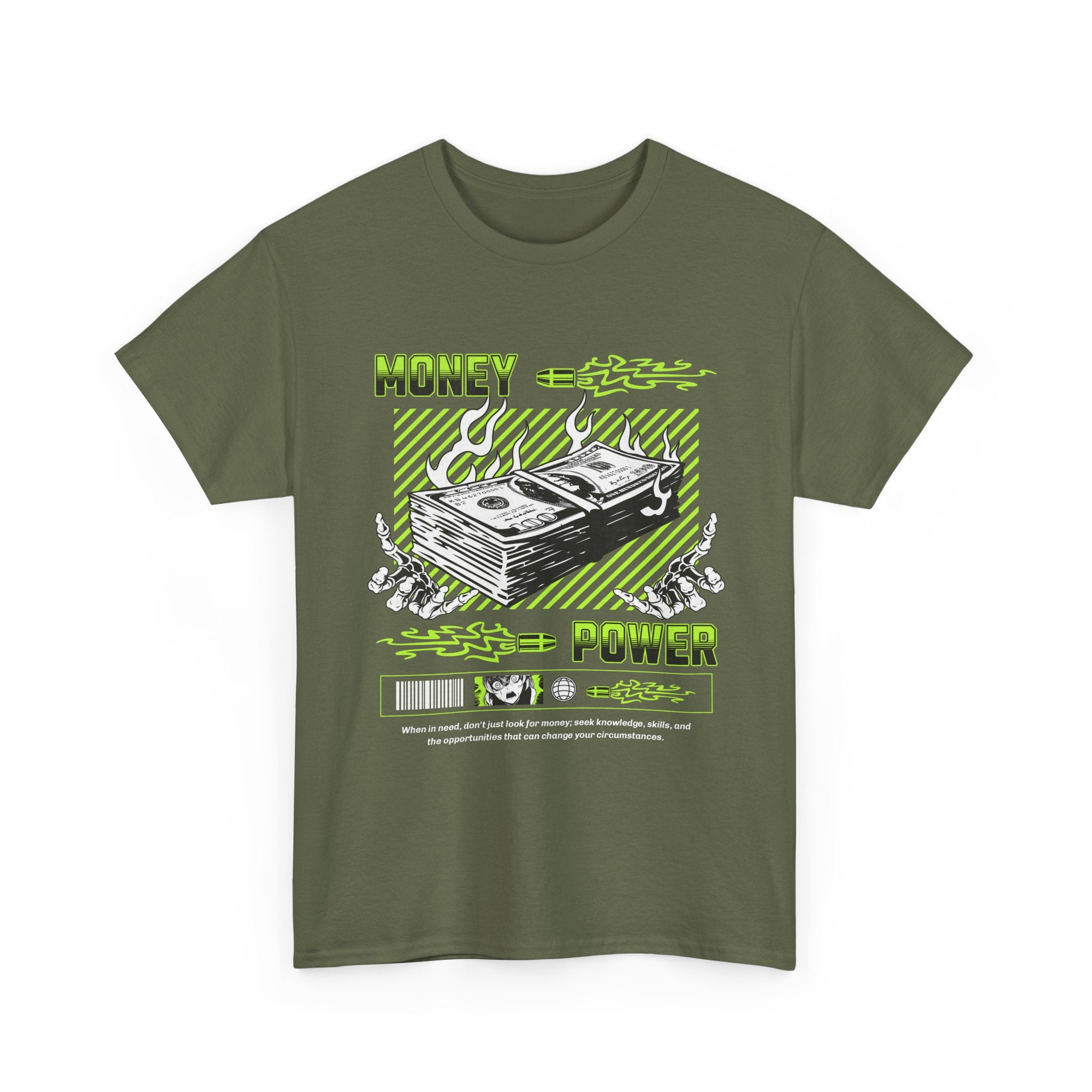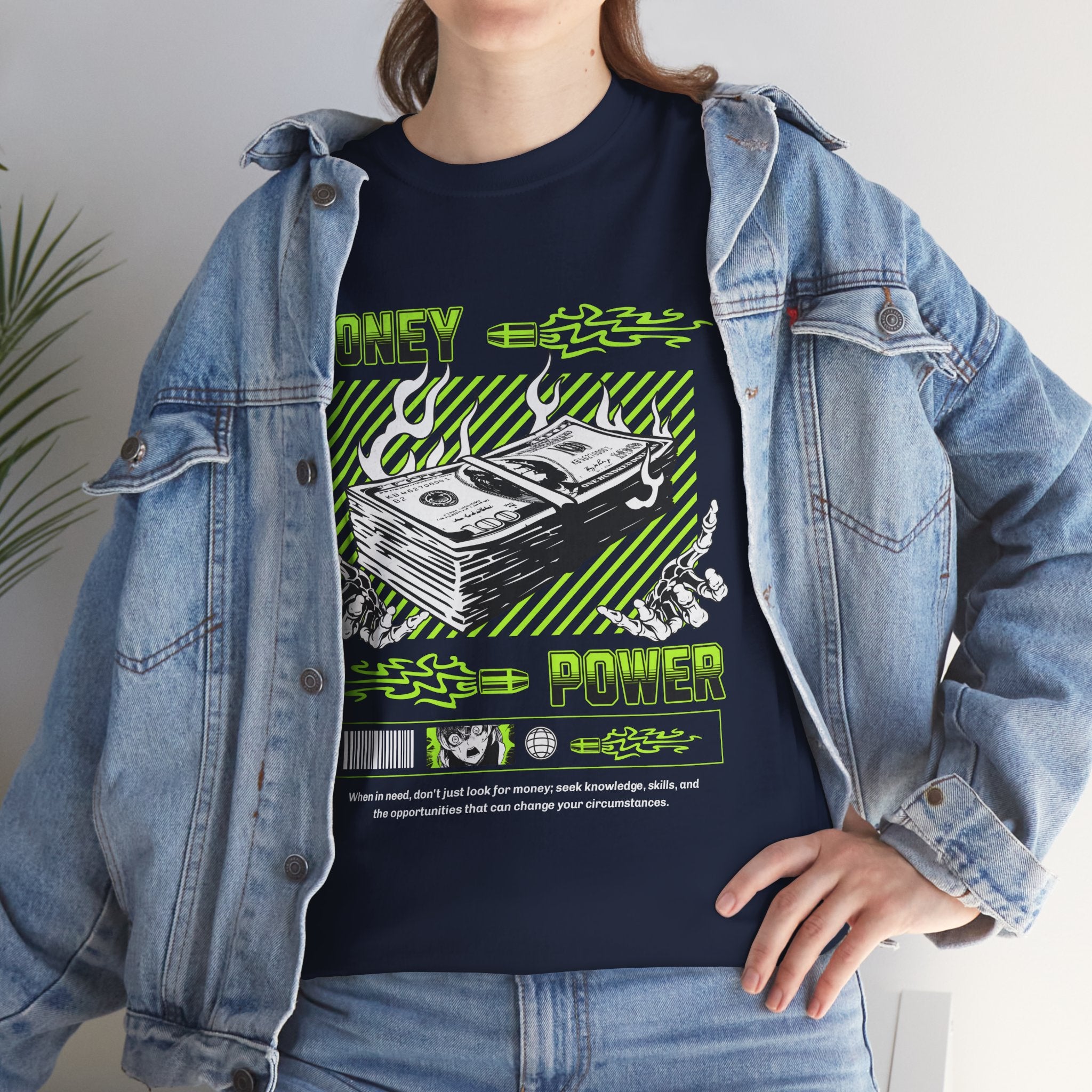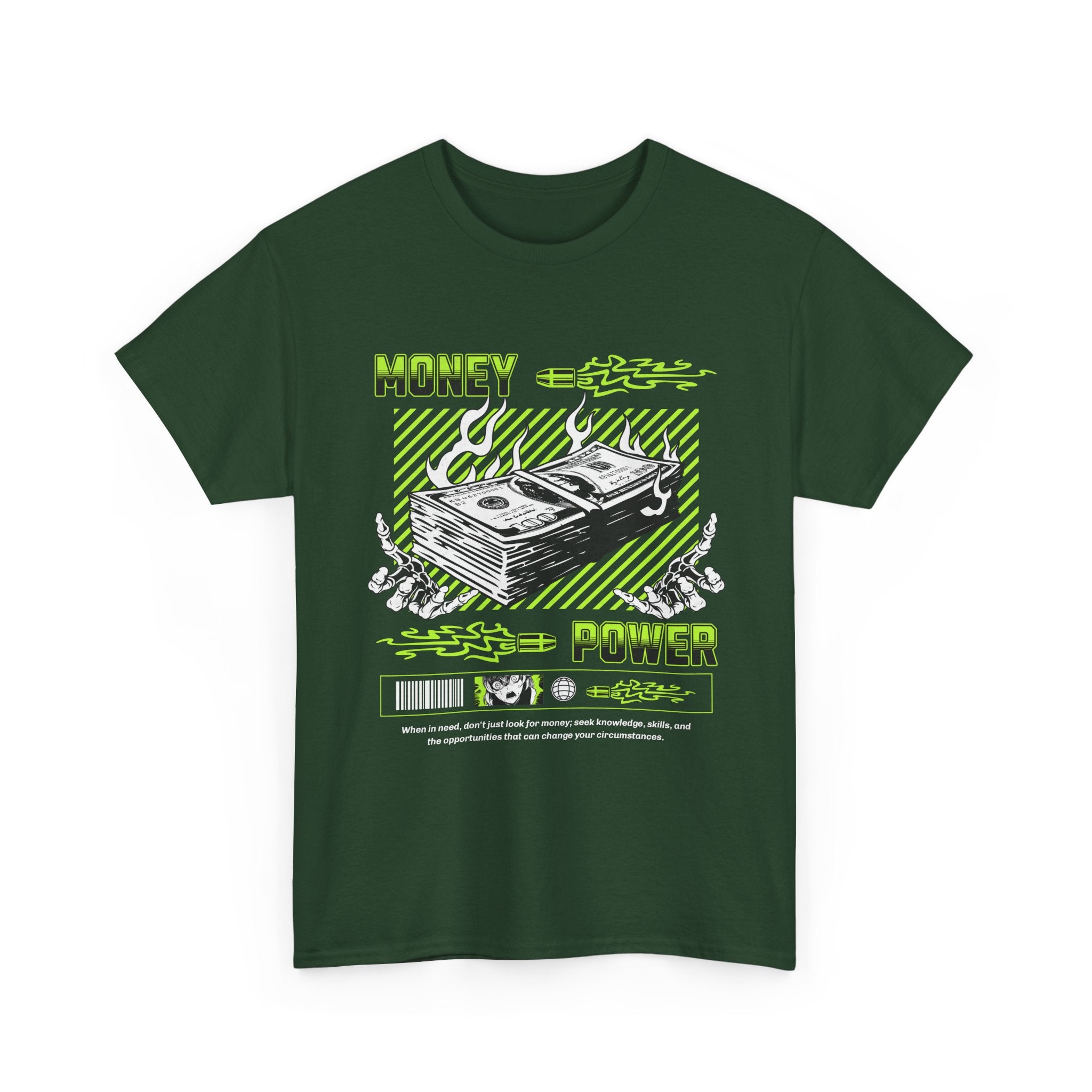 The Money Power Unisex Heavy Cotton Tee captures the raw energy of hustle culture with its stack of dollar bills set against neon green flames and bold typography. A striking graphic that screams power, ambition, and confidence, this tee is made for those who grind hard and dream big.