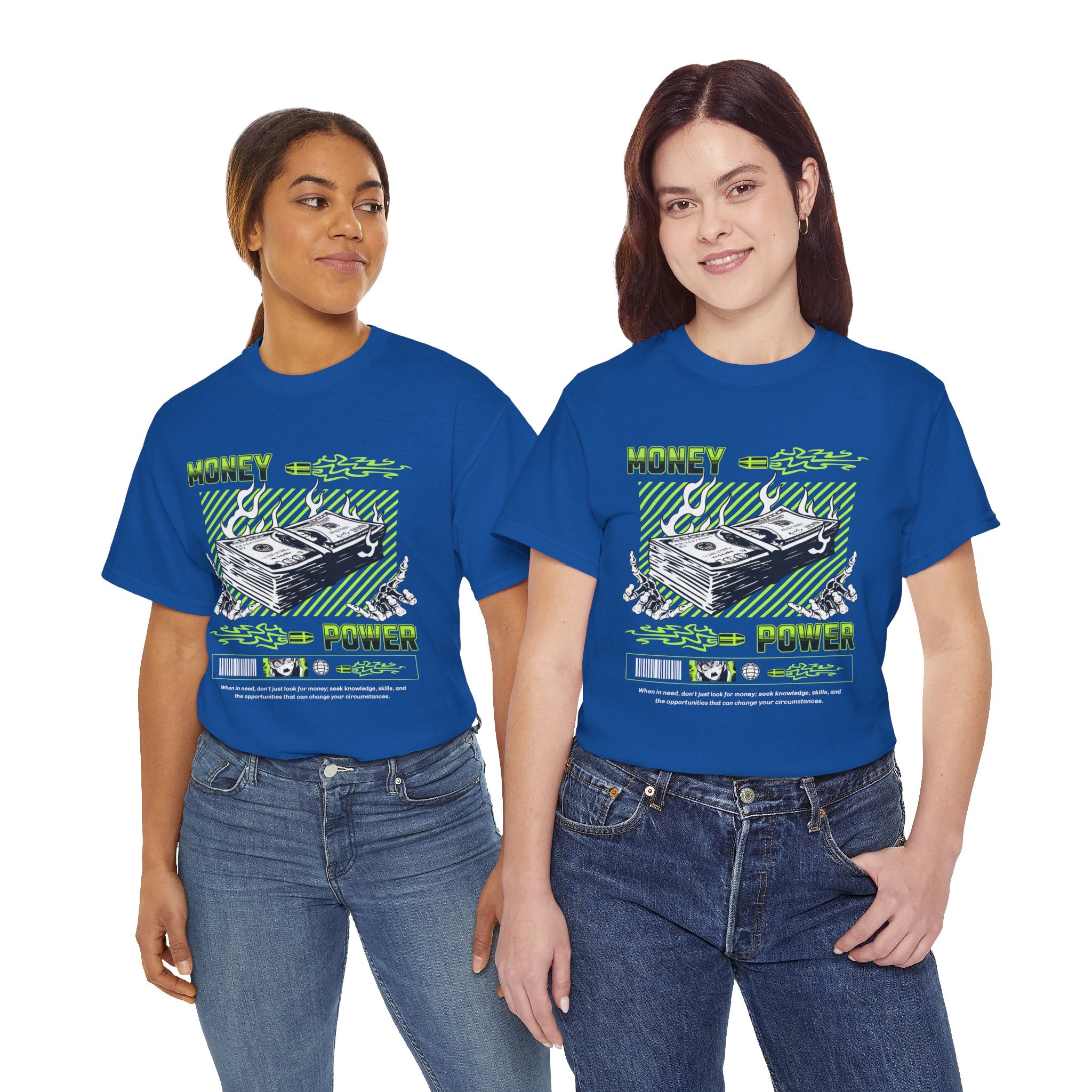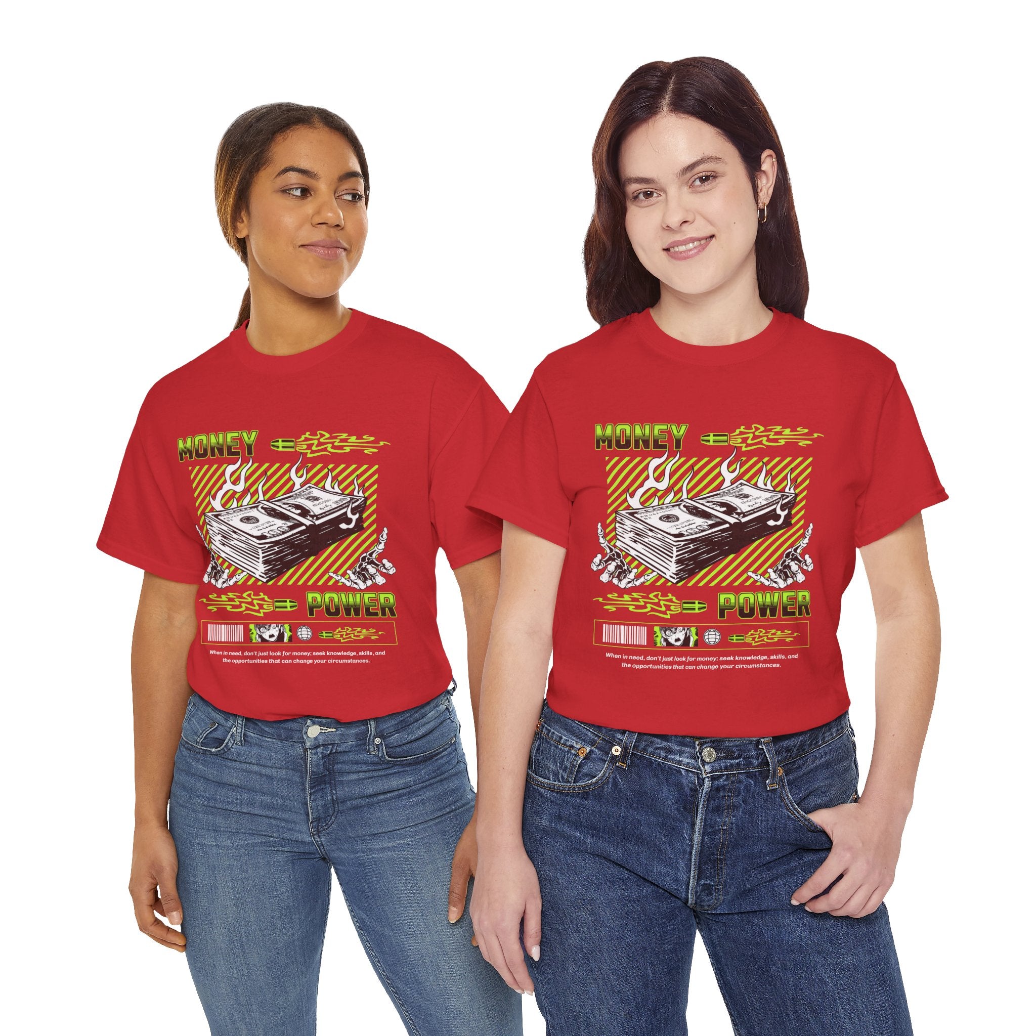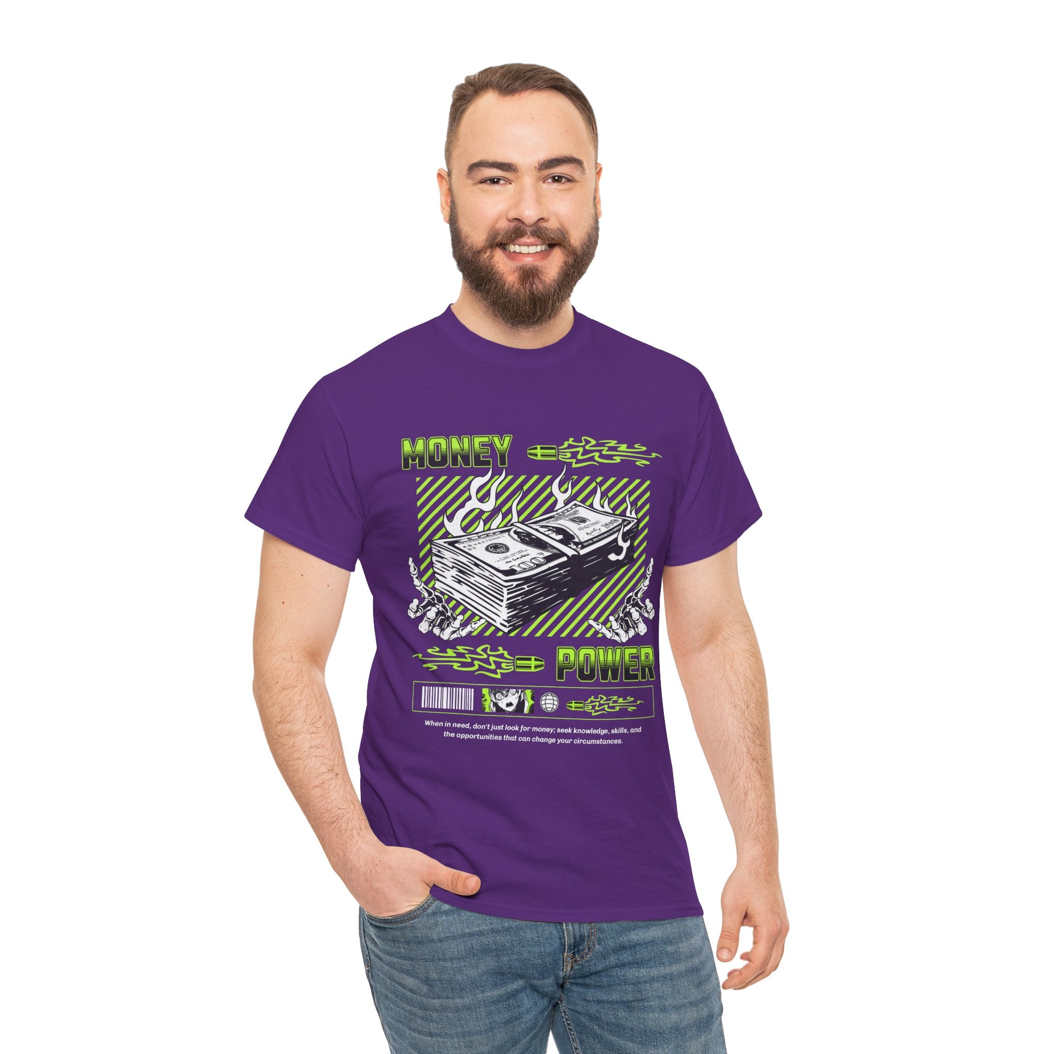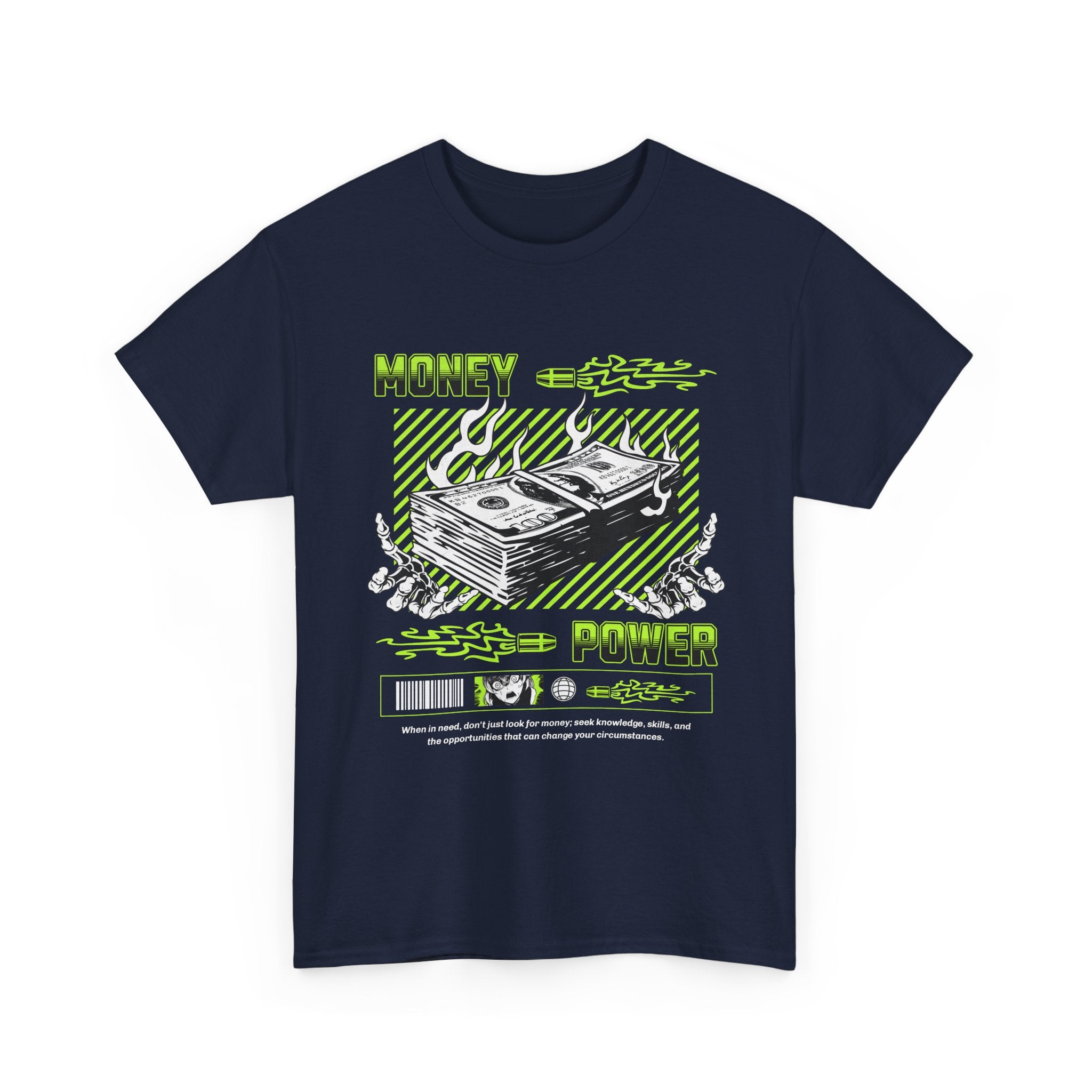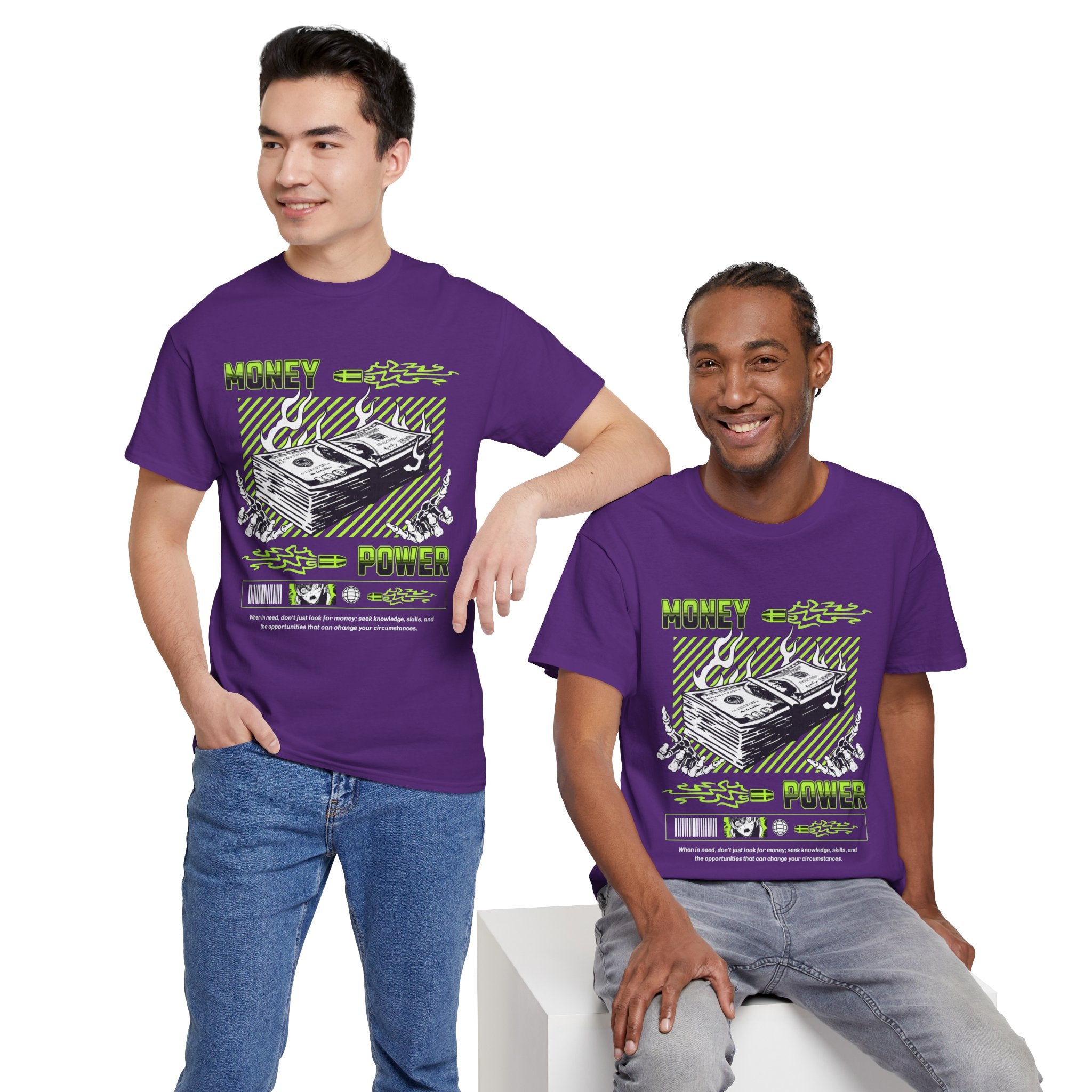 The Money Power Unisex Heavy Cotton Tee captures the raw energy of hustle culture with its stack of dollar bills set against neon green flames and bold typography. A striking graphic that screams power, ambition, and confidence, this tee is made for those who grind hard and dream big.