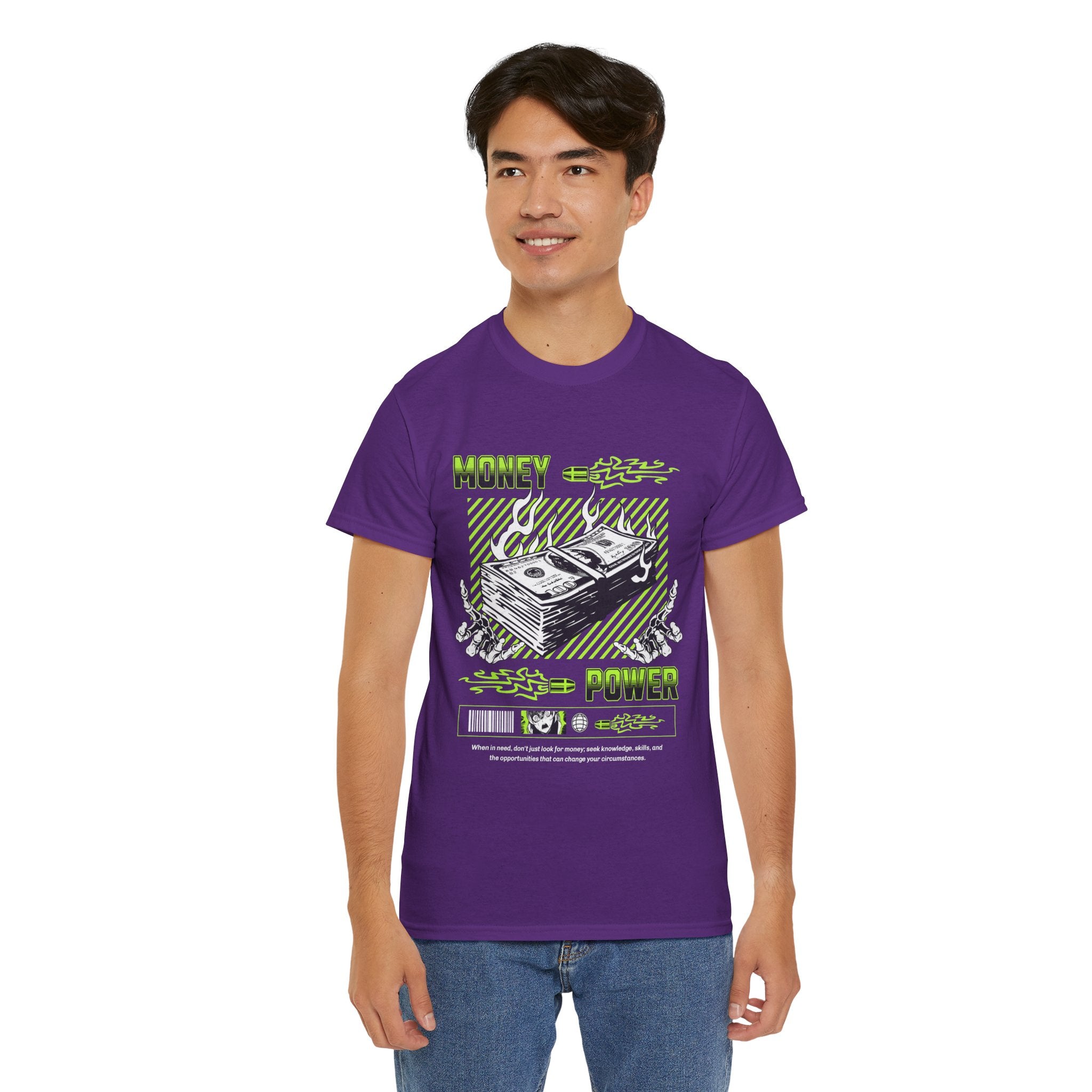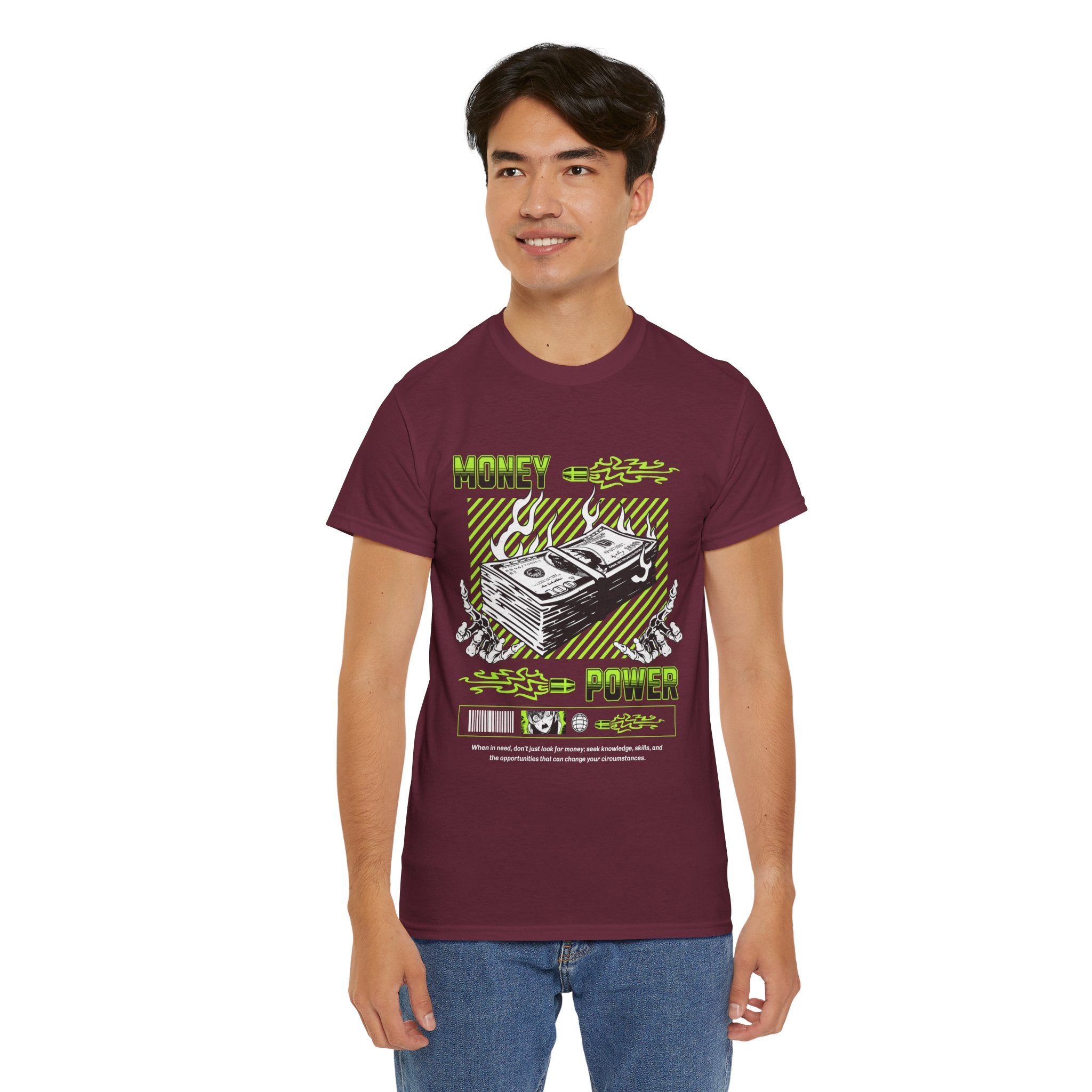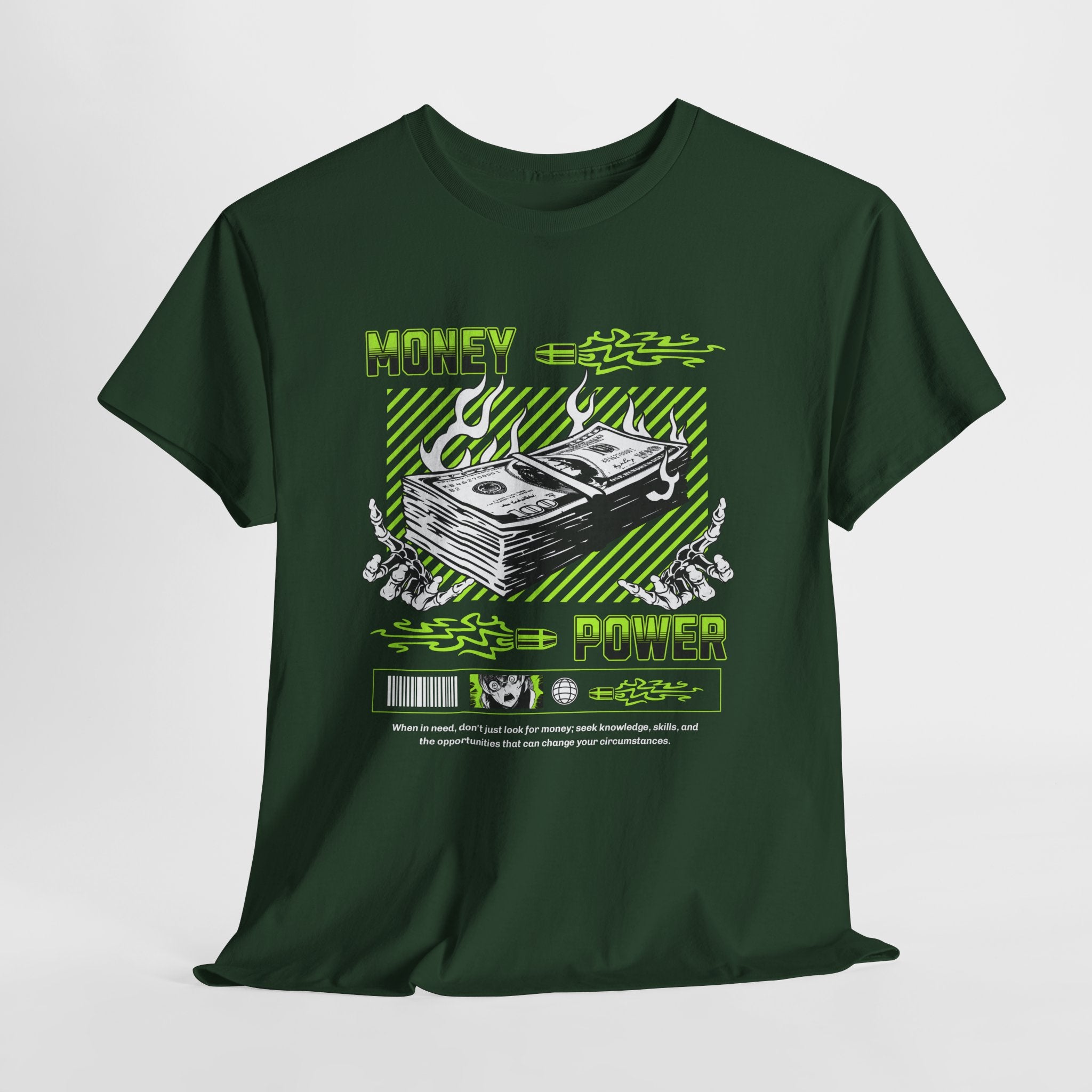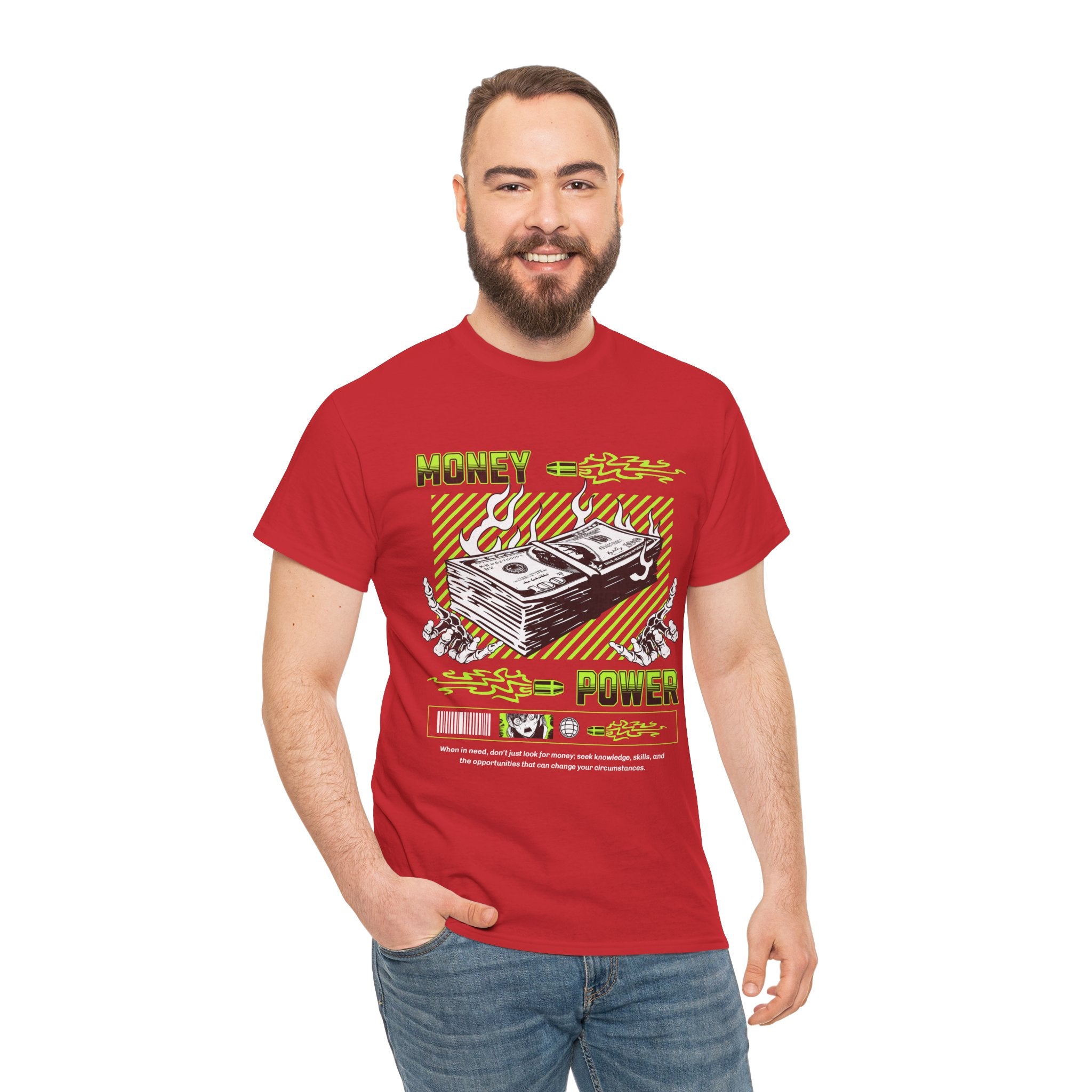 The Money Power Unisex Heavy Cotton Tee captures the raw energy of hustle culture with its stack of dollar bills set against neon green flames and bold typography. A striking graphic that screams power, ambition, and confidence, this tee is made for those who grind hard and dream big.