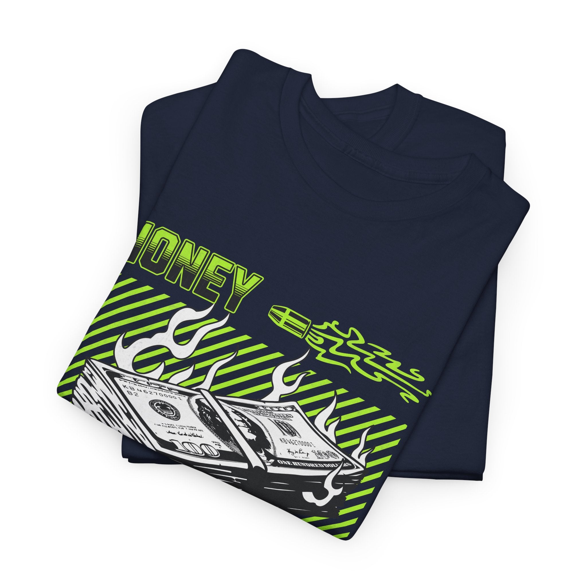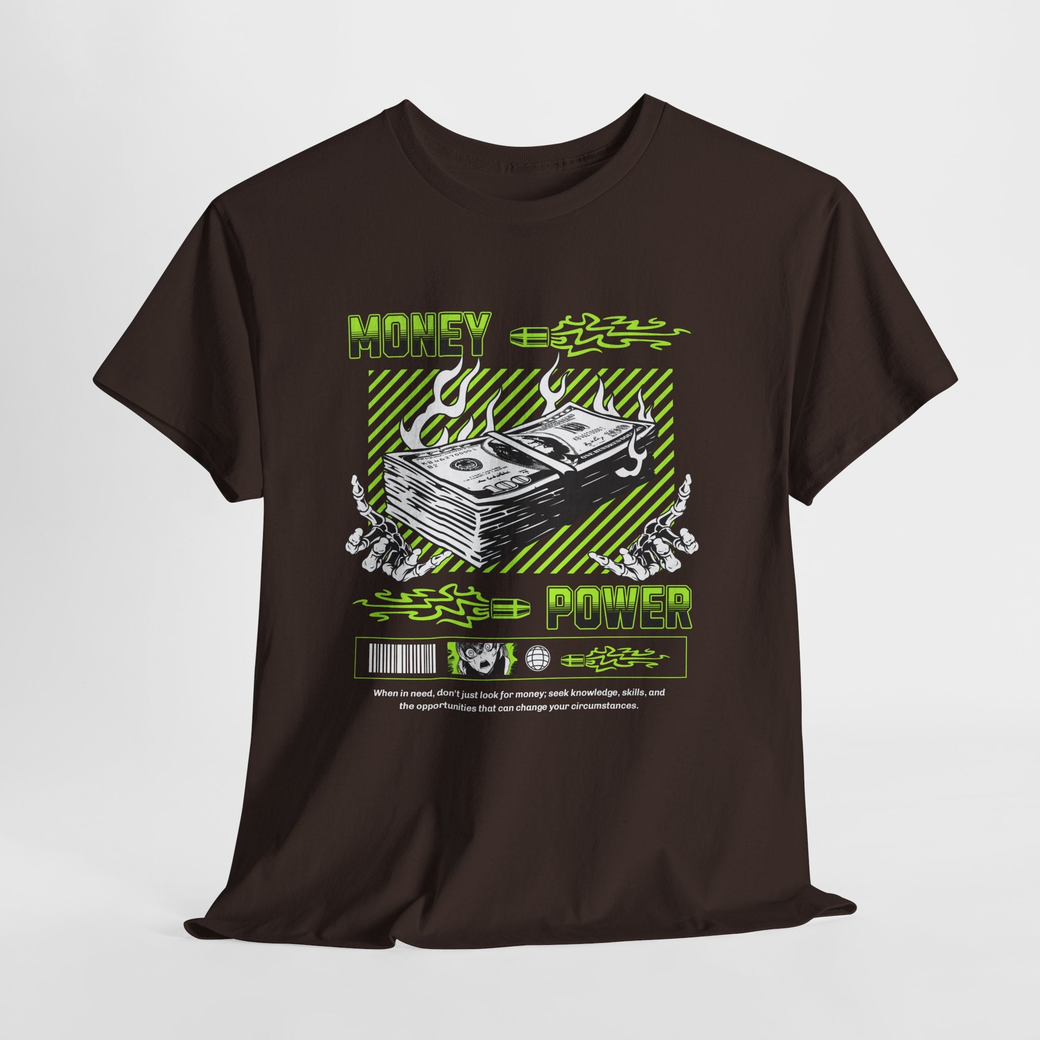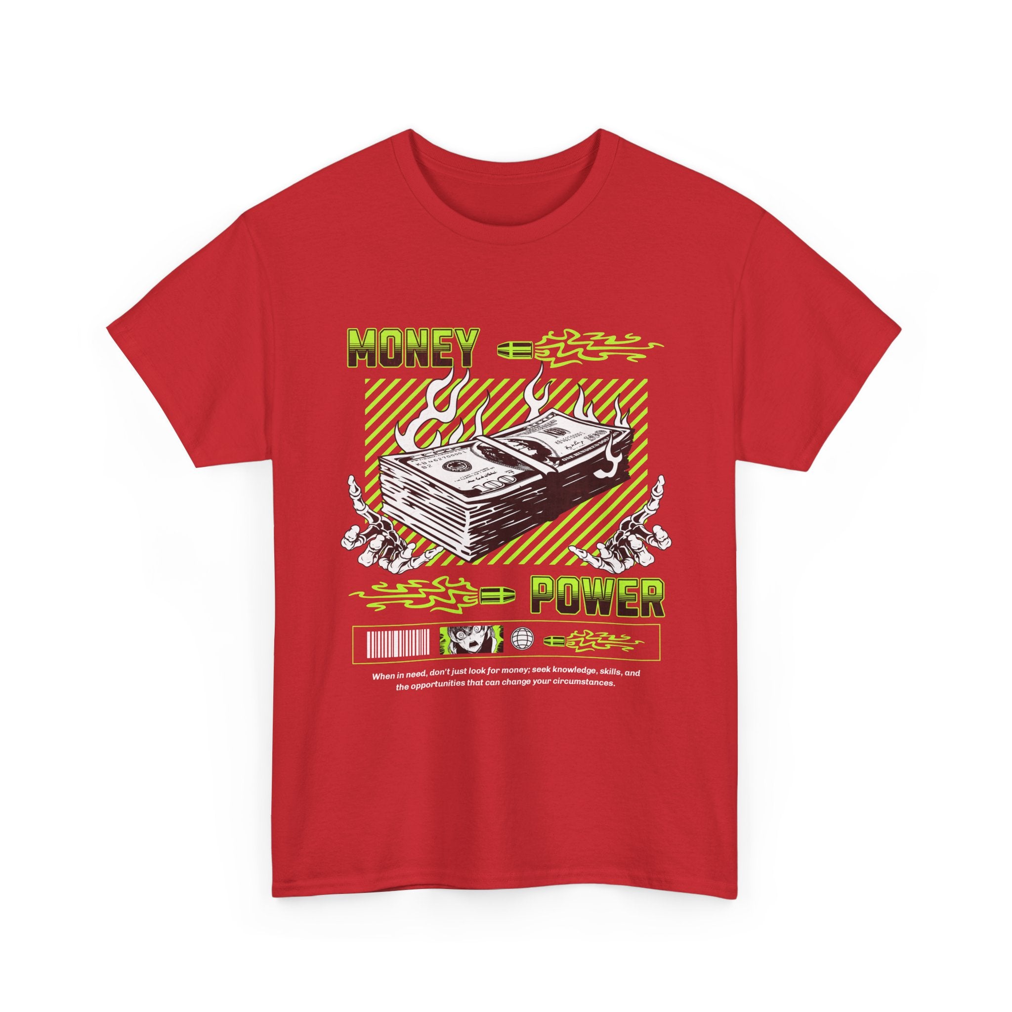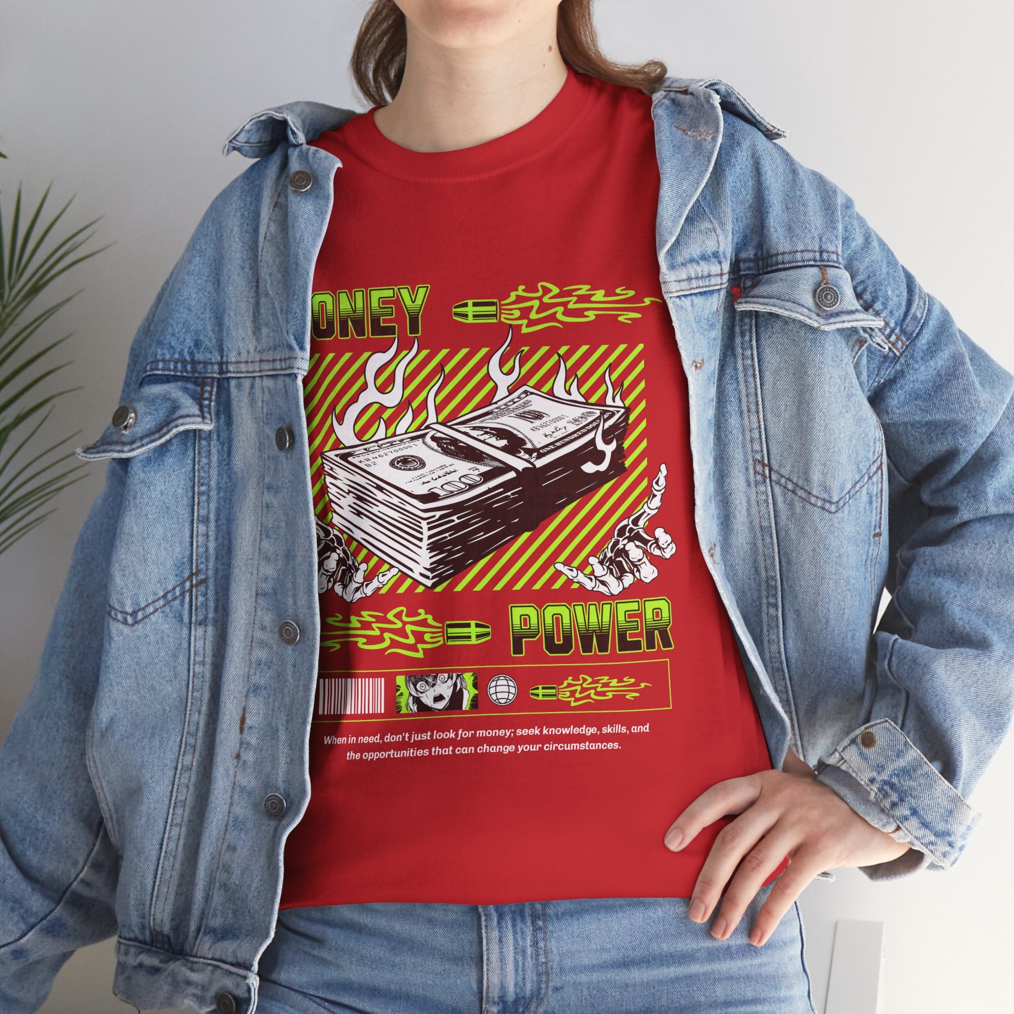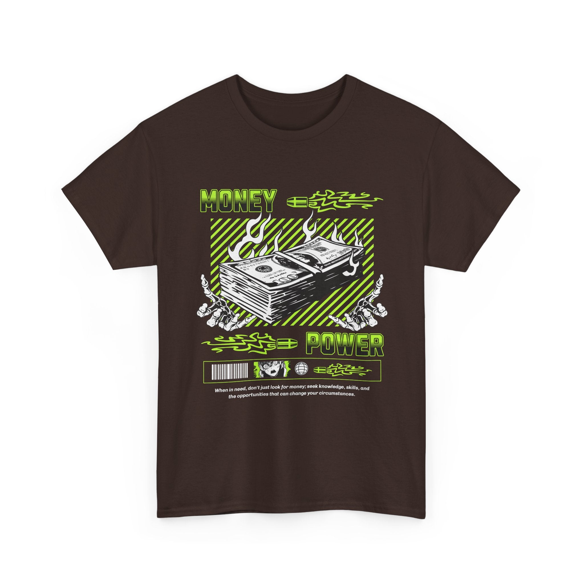 The Money Power Unisex Heavy Cotton Tee captures the raw energy of hustle culture with its stack of dollar bills set against neon green flames and bold typography. A striking graphic that screams power, ambition, and confidence, this tee is made for those who grind hard and dream big.
