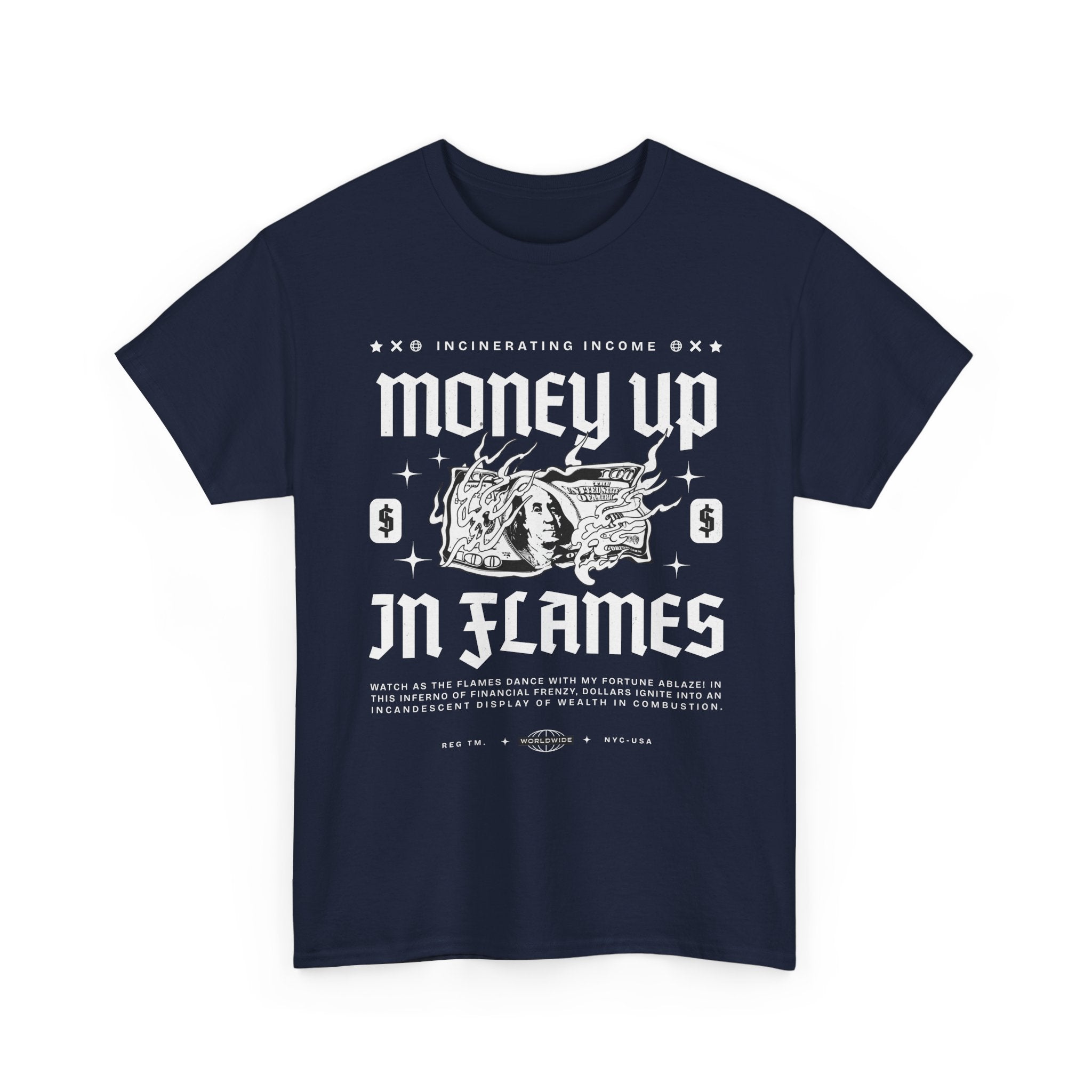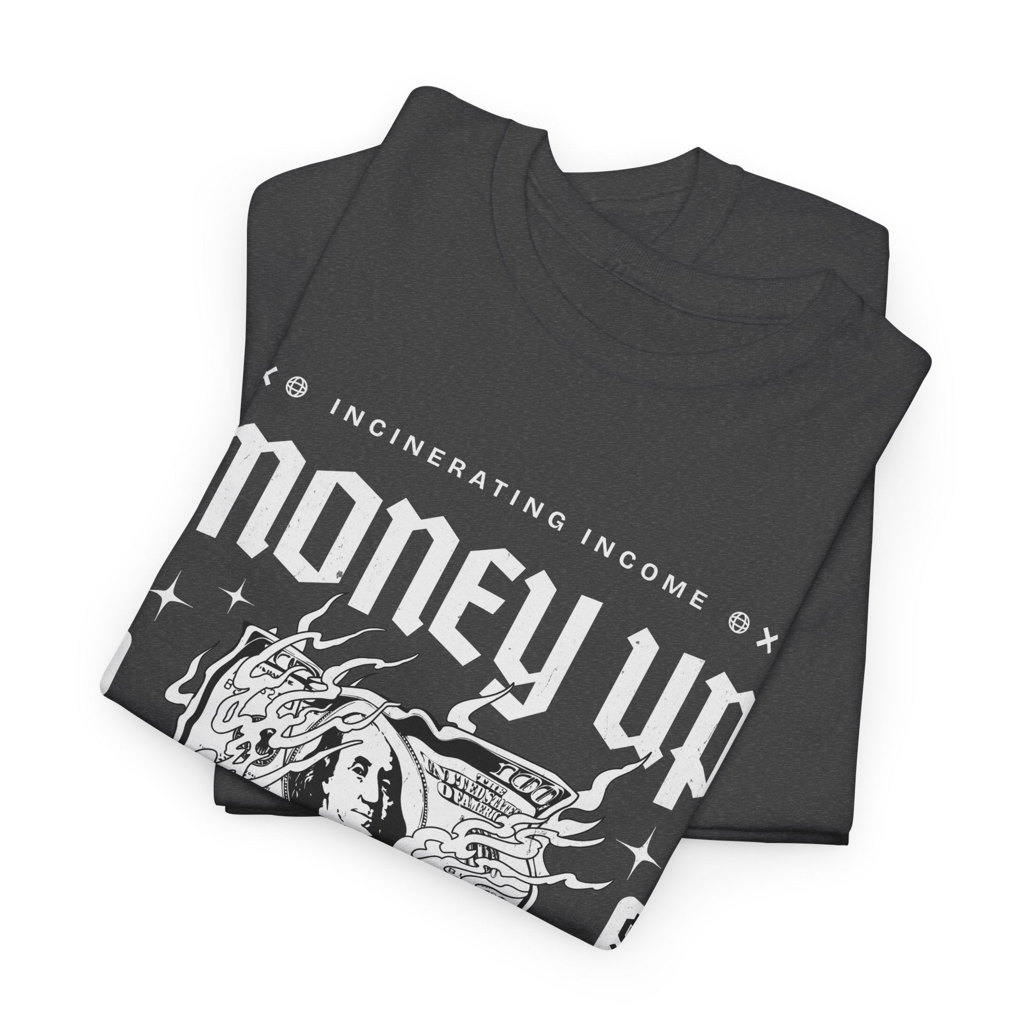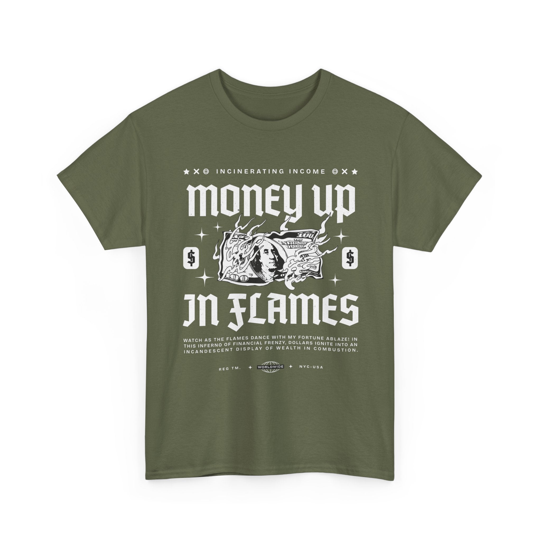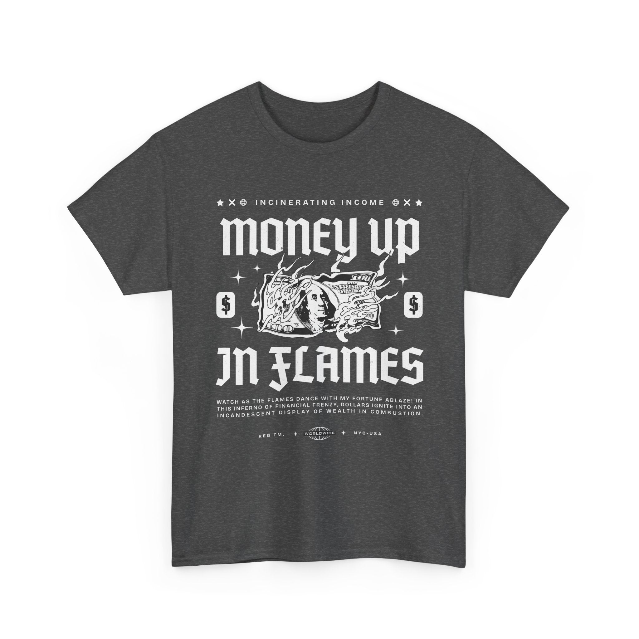 The Money Up In Flames Unisex Heavy Cotton Tee is more than just a shirt β itβs a bold commentary on ambition, wealth, and the fire of risk-taking. Featuring a striking burning dollar bill graphic with gothic-inspired typography, this design embodies the raw intensity of the hustler and alpha mindset.