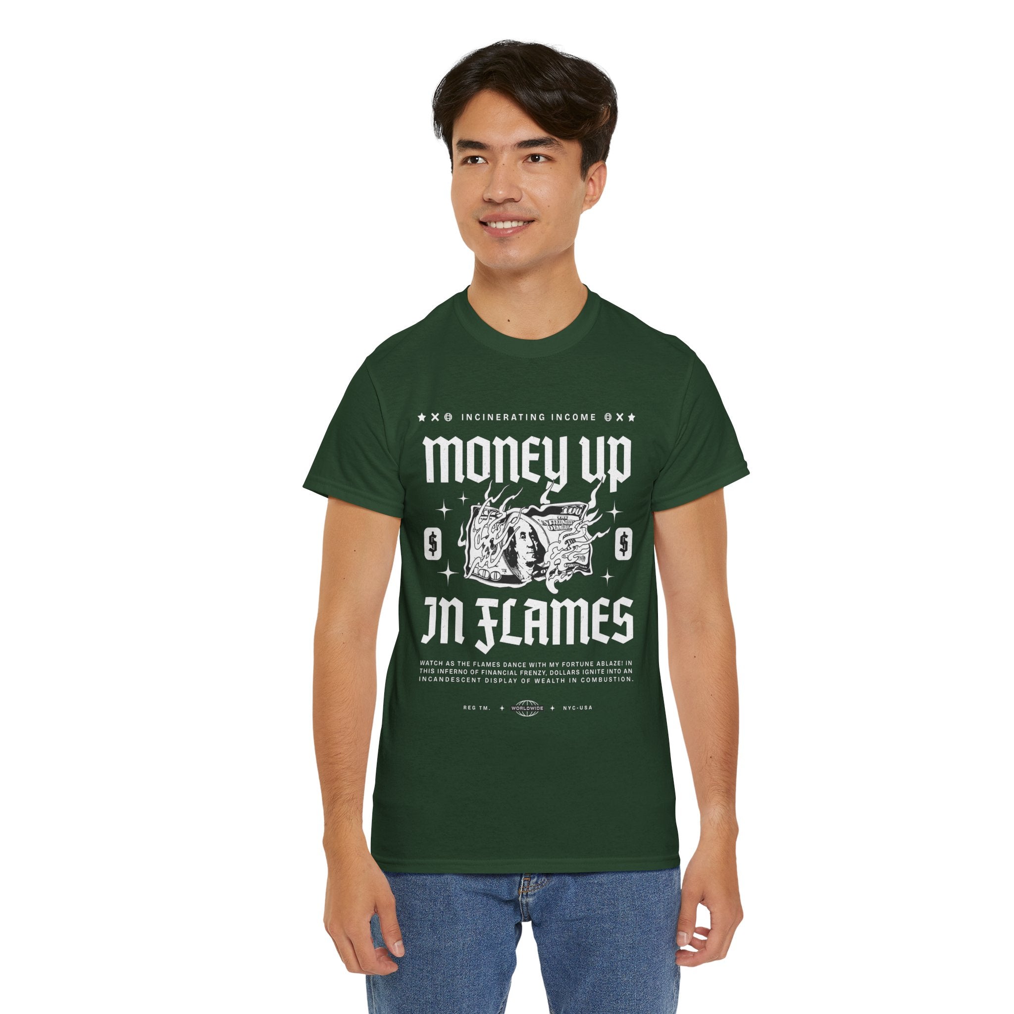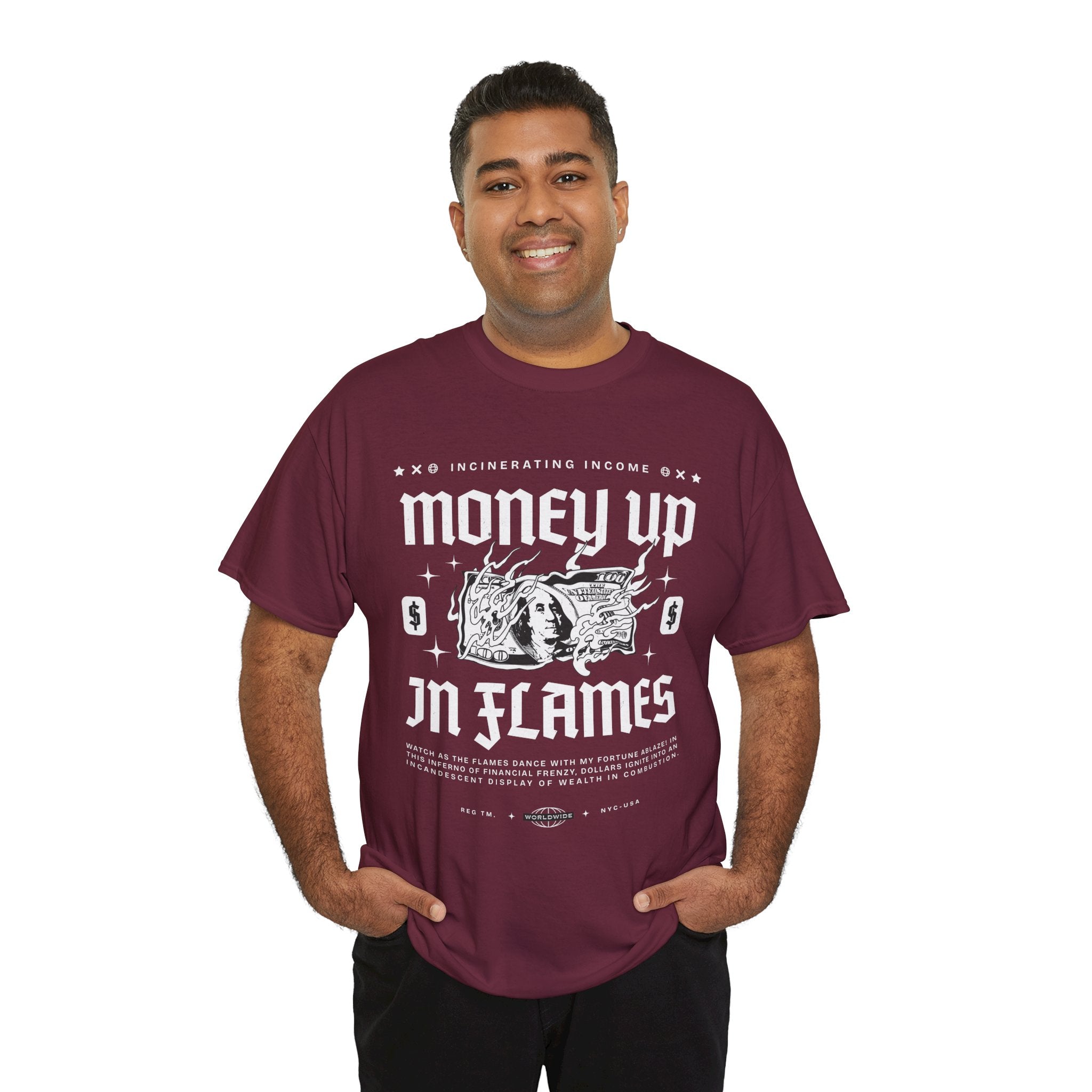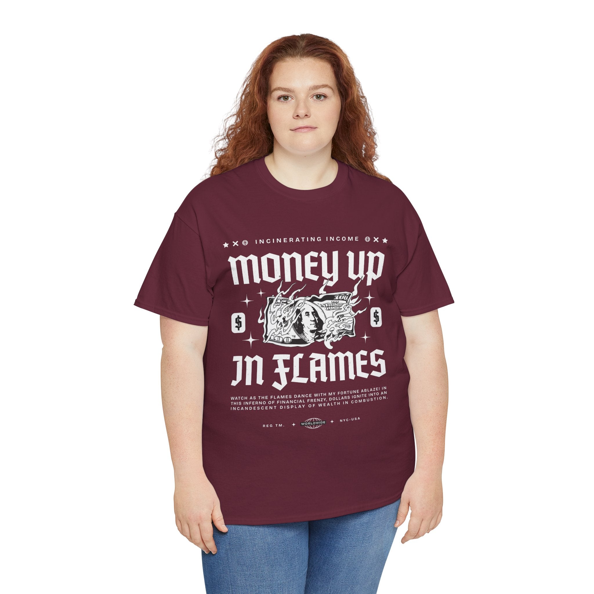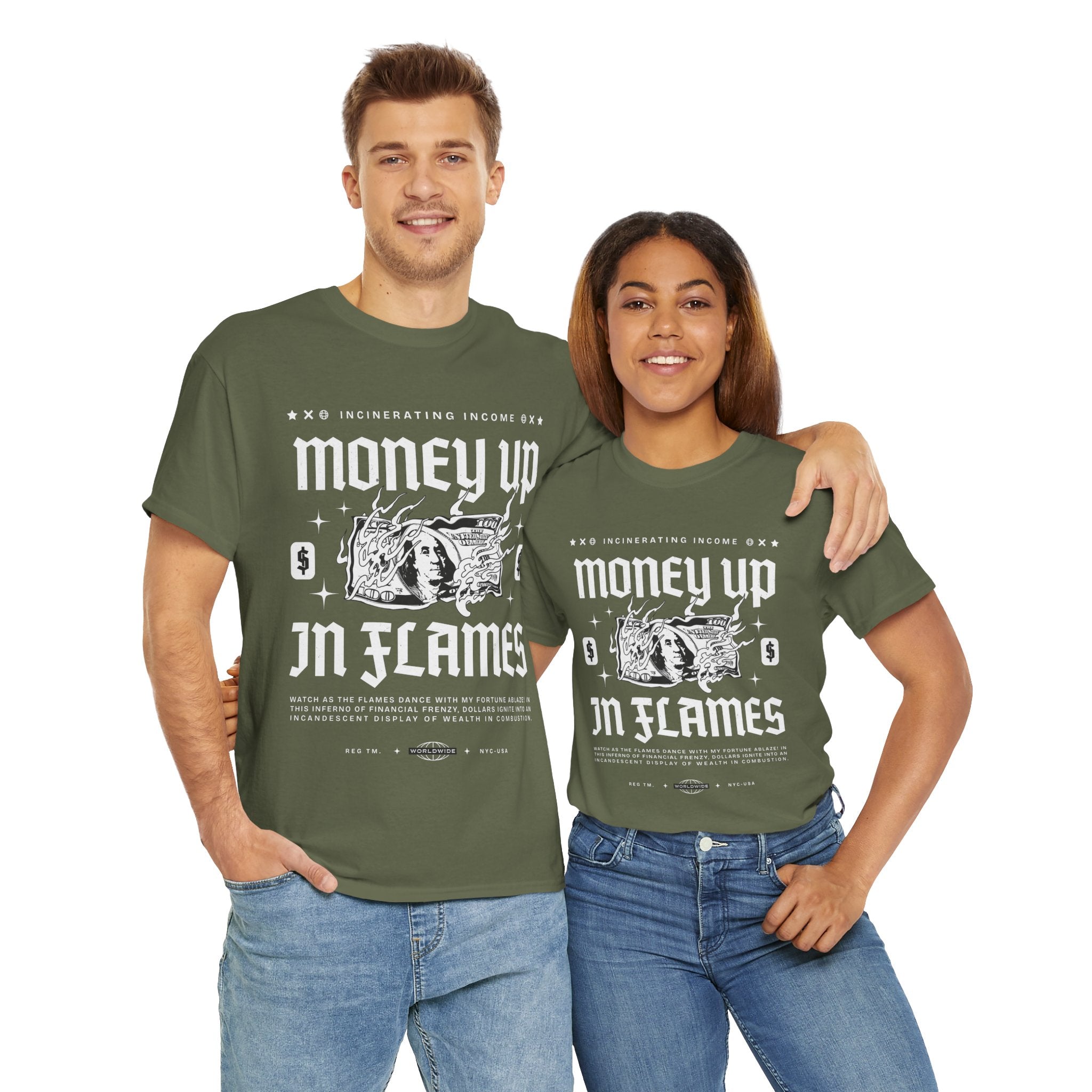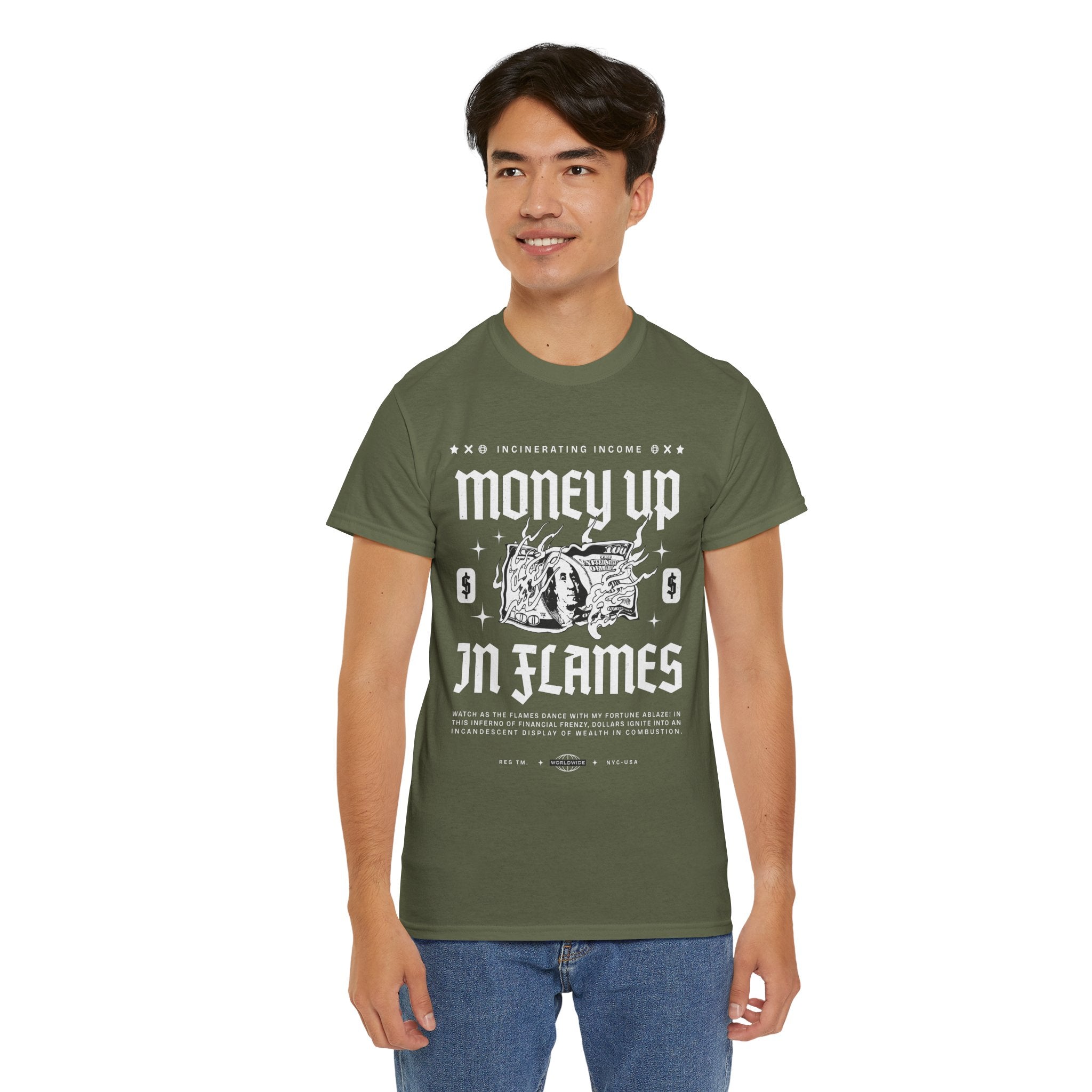 The Money Up In Flames Unisex Heavy Cotton Tee is more than just a shirt β itβs a bold commentary on ambition, wealth, and the fire of risk-taking. Featuring a striking burning dollar bill graphic with gothic-inspired typography, this design embodies the raw intensity of the hustler and alpha mindset.