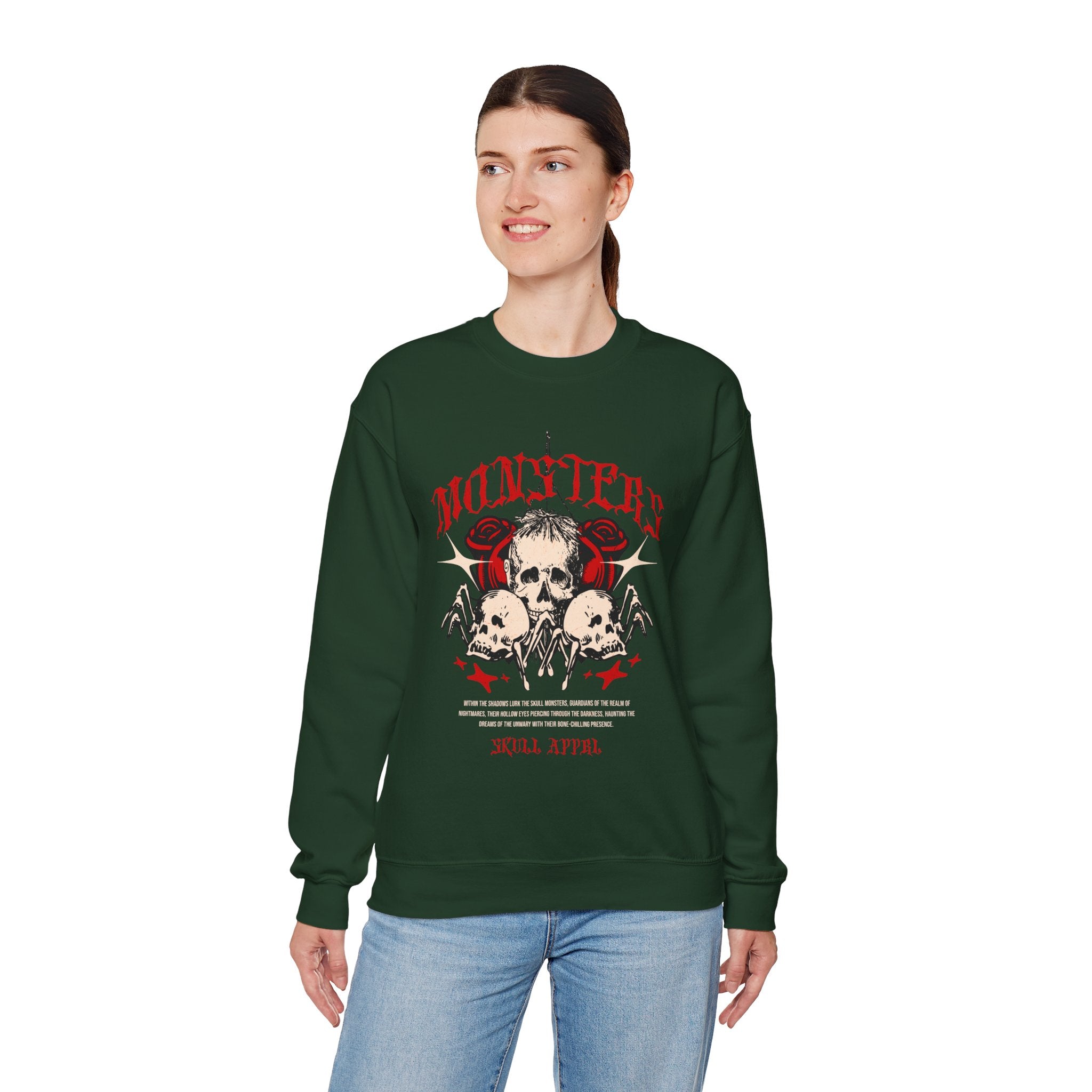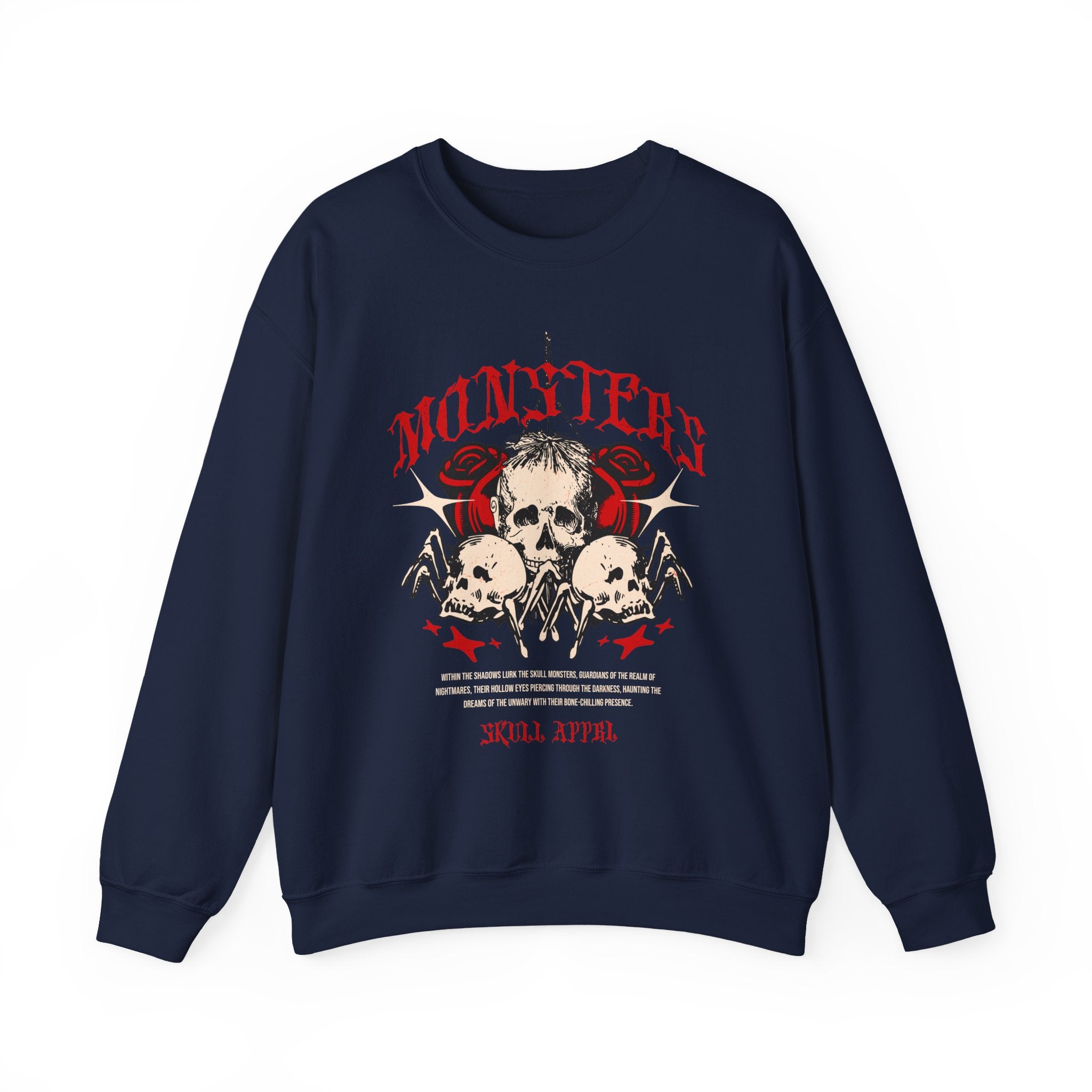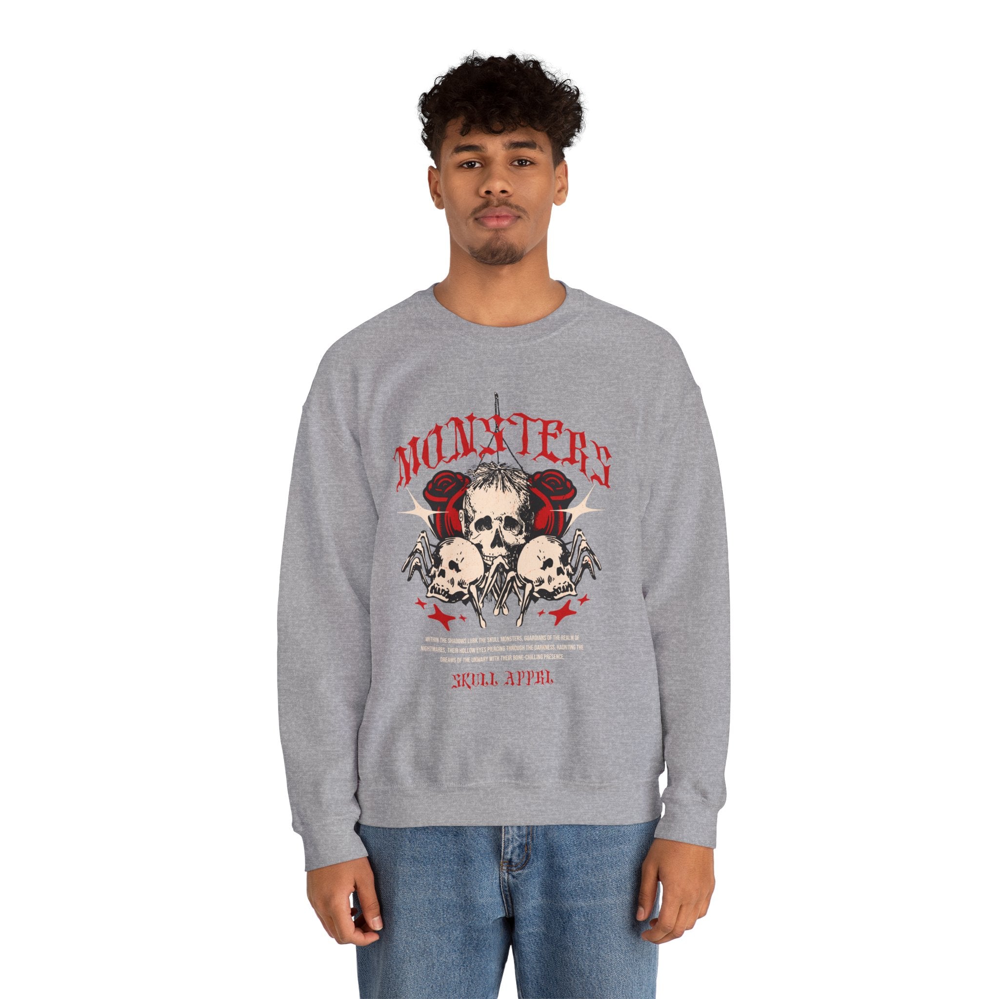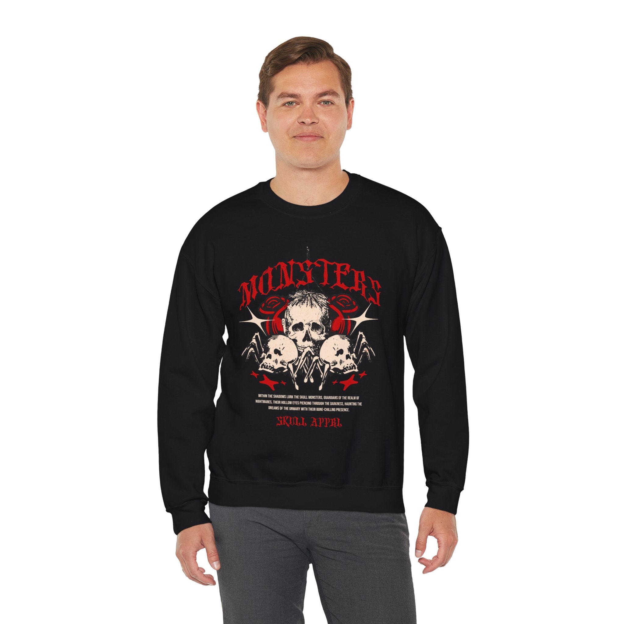 The Monsters Unisex Heavy Blend™ Crewneck Sweatshirt is a dark and daring expression of gothic horror streetwear. With skulls guarded by monstrous claws, shadowy accents, and fiery gothic typography, this design captures the spirit of the guardians of nightmares. Perfect for fans of skull art, gothic style, and Halloween fashion, it’s a bold pullover that commands attention.