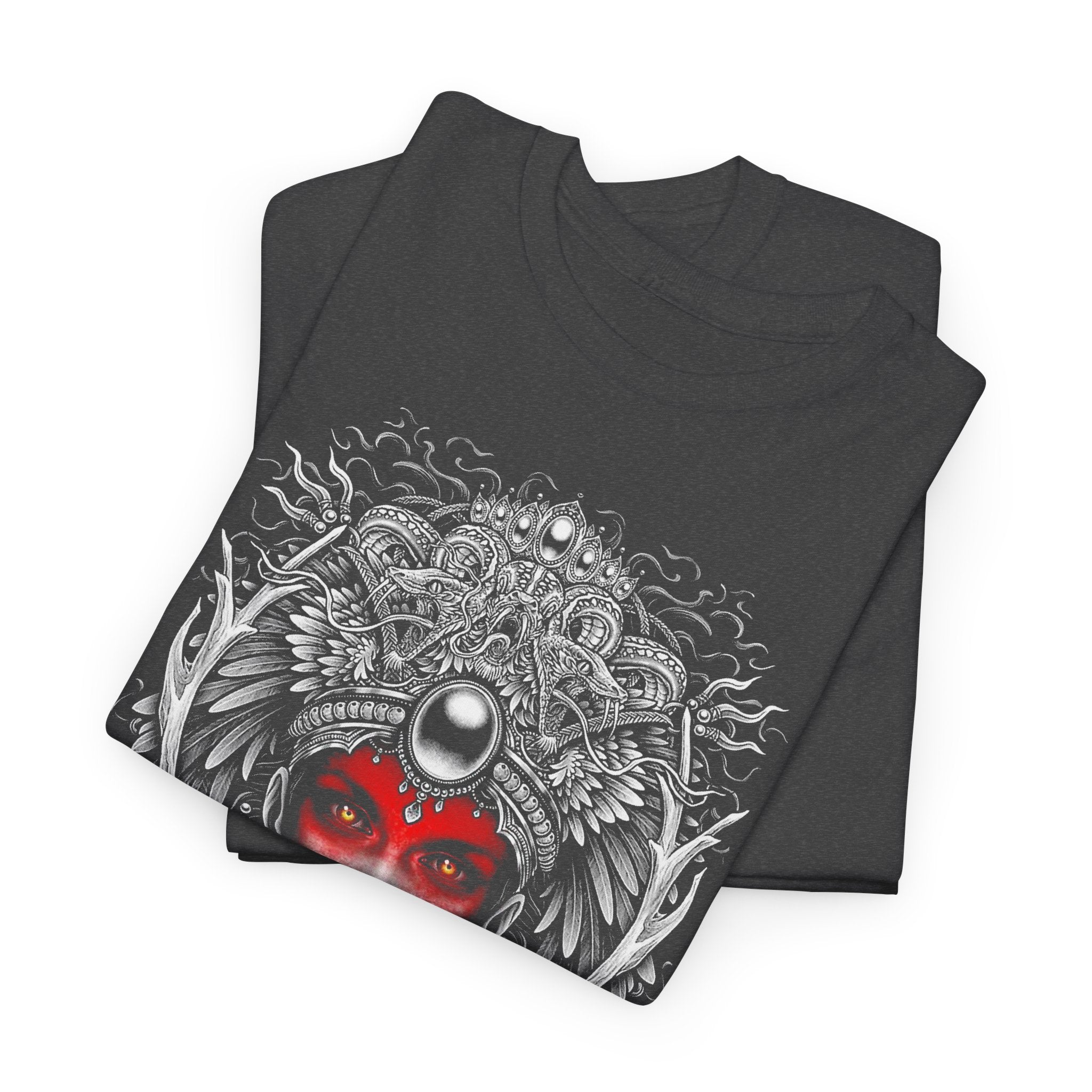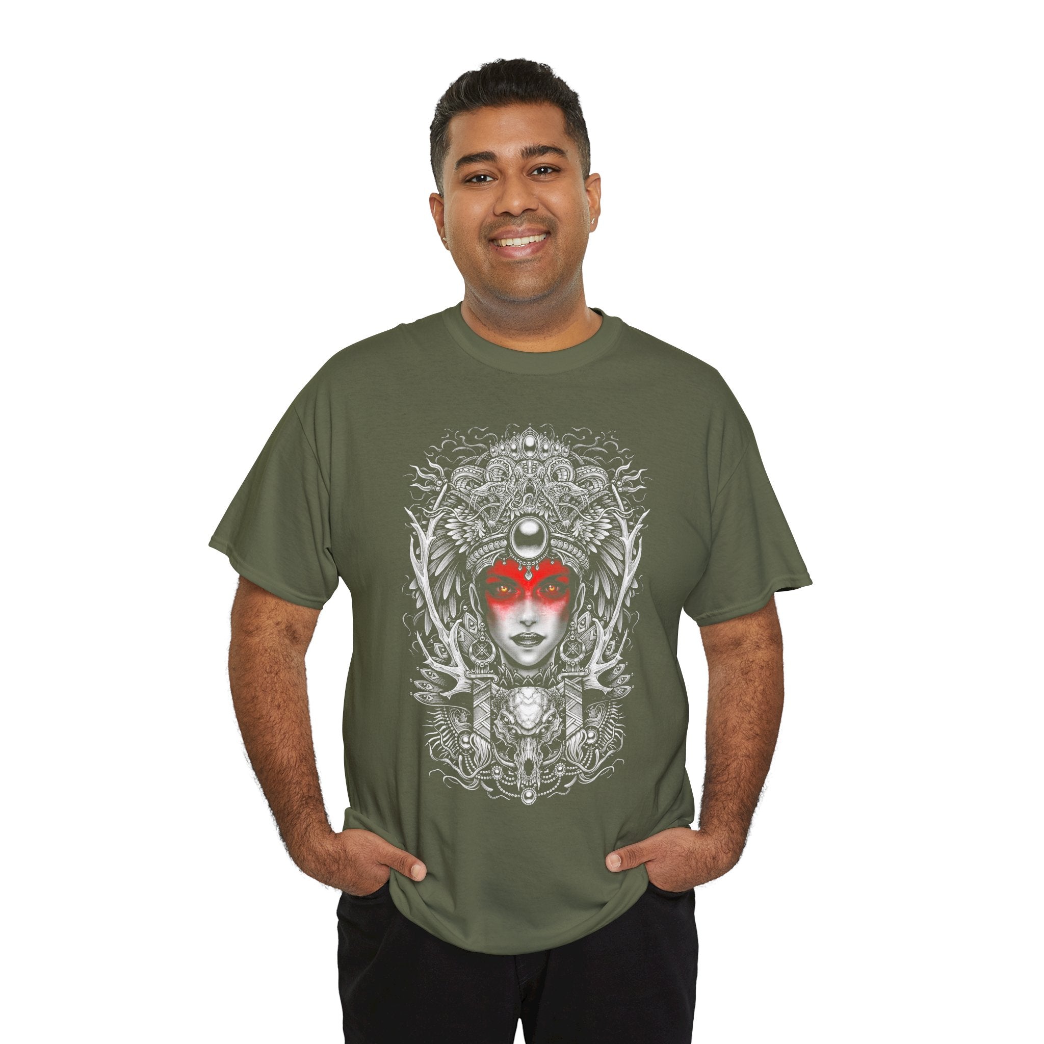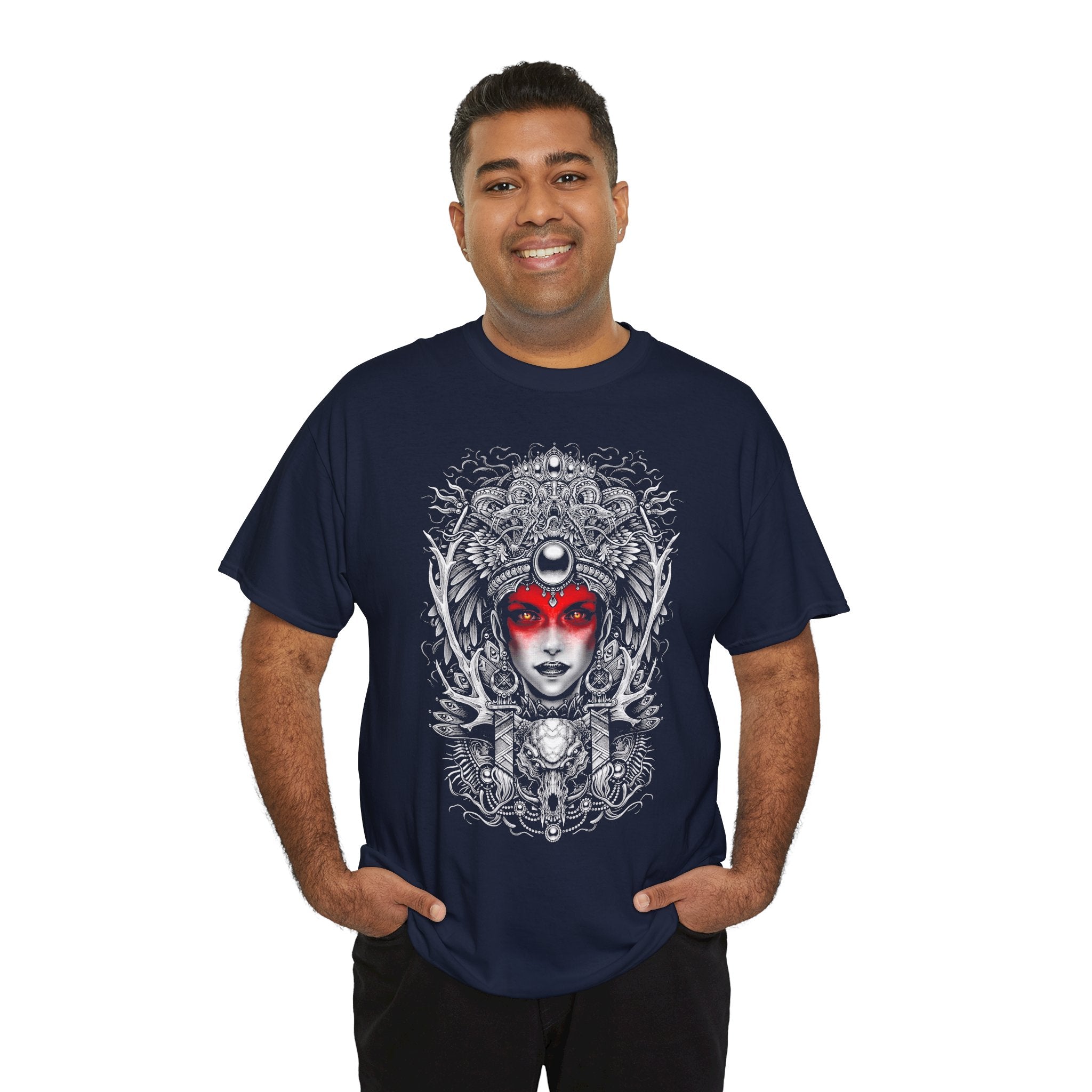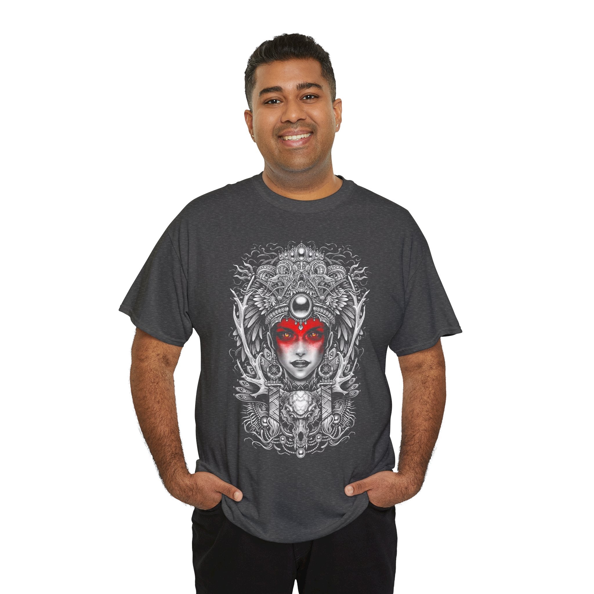 This Mystic Warrior Goddess Unisex Heavy Cotton Tee blends sacred symbolism and modern edge into one striking design. The detailed black-and-white linework crowned by a crimson aura captures the essence of power, resilience, and inner balance — a tribute to those who carry both fire and calm within.