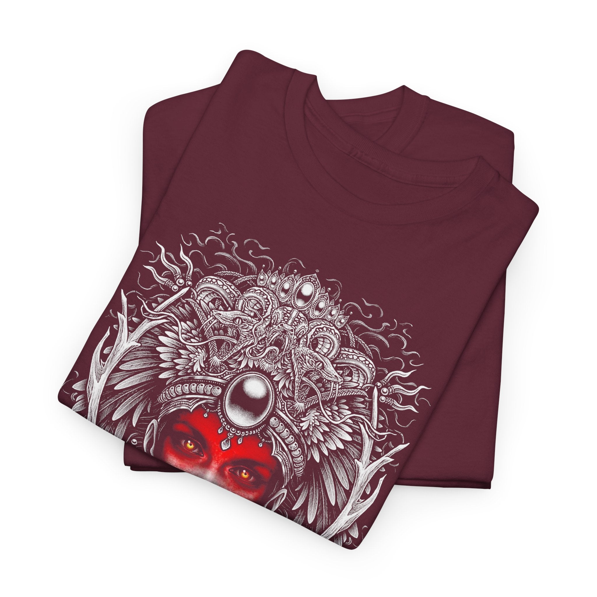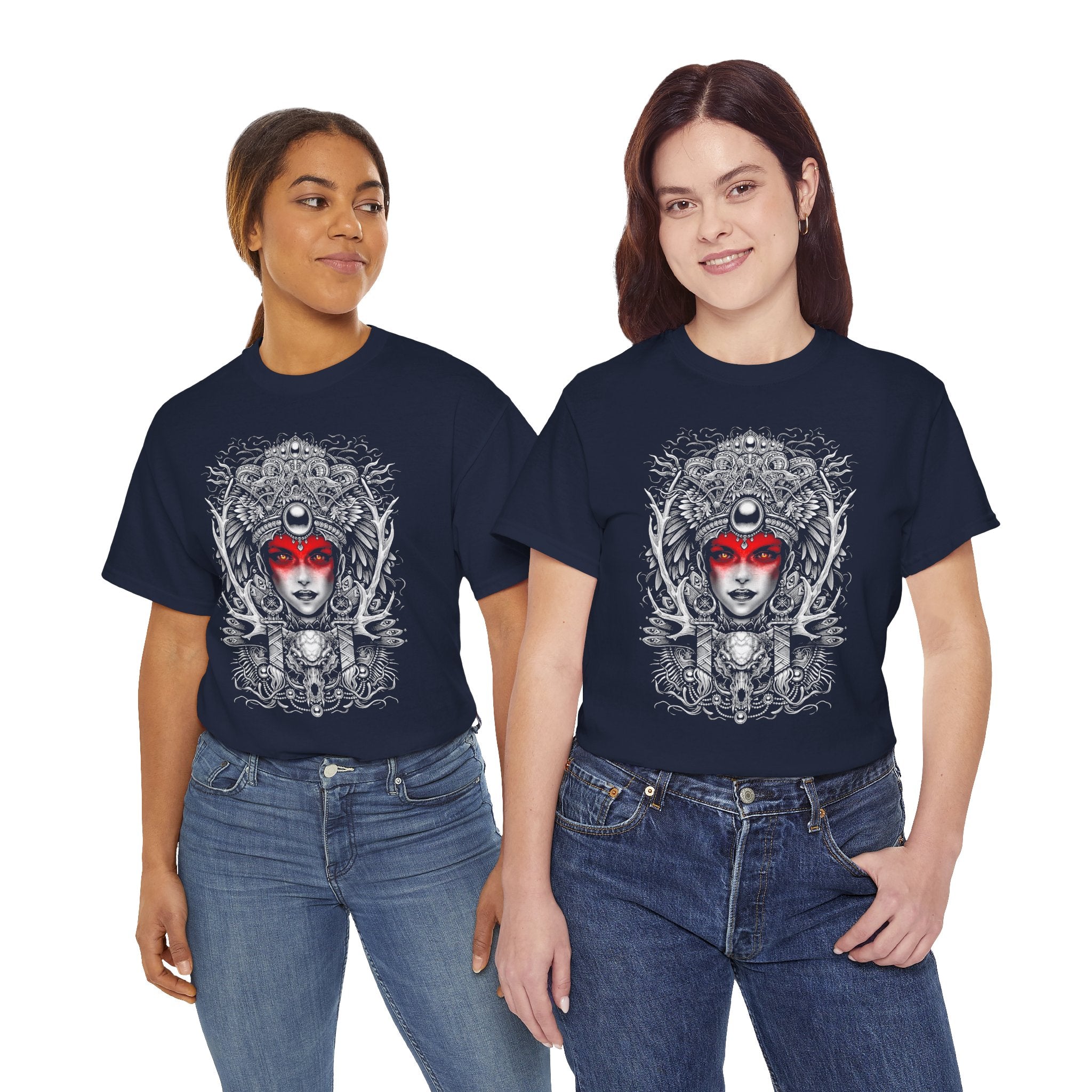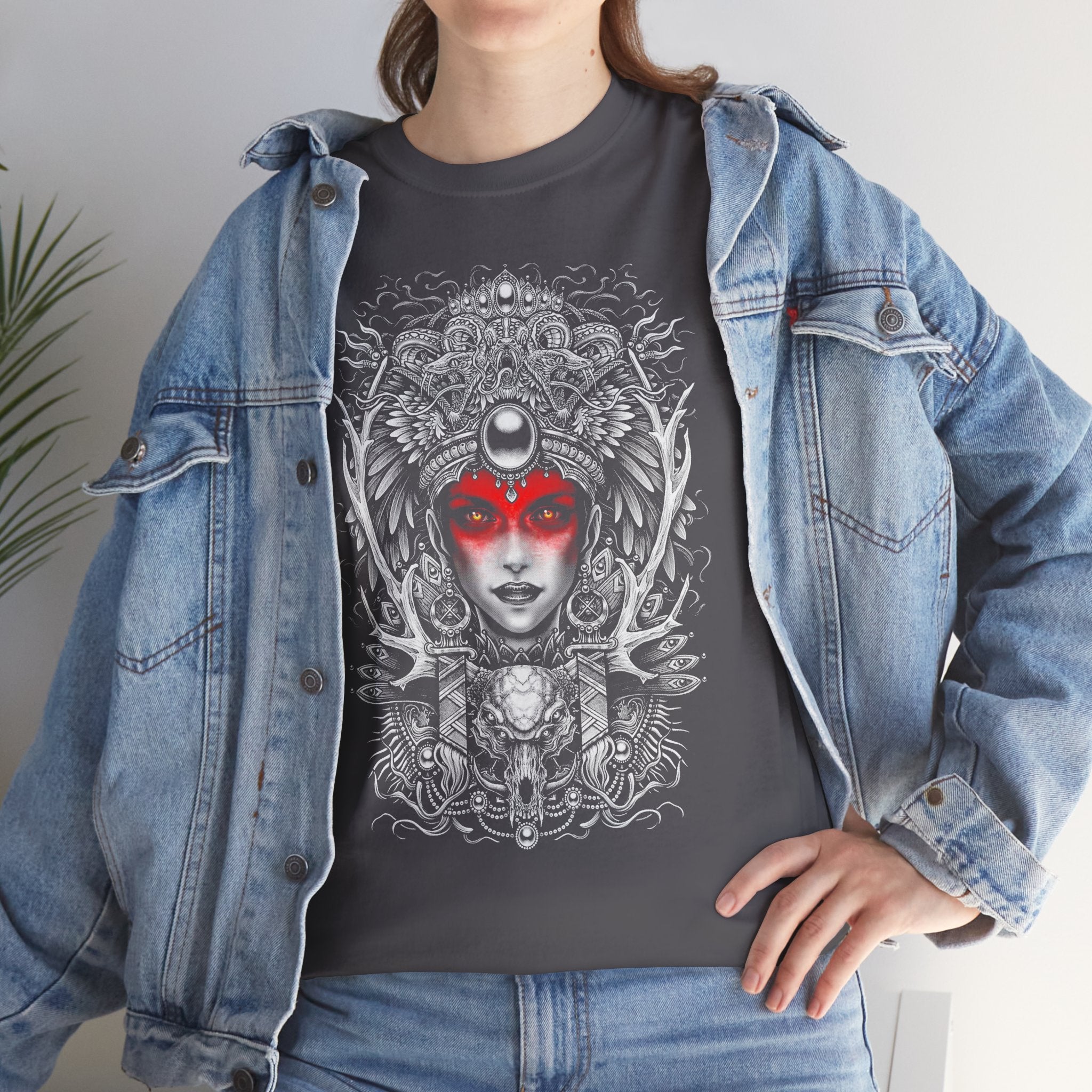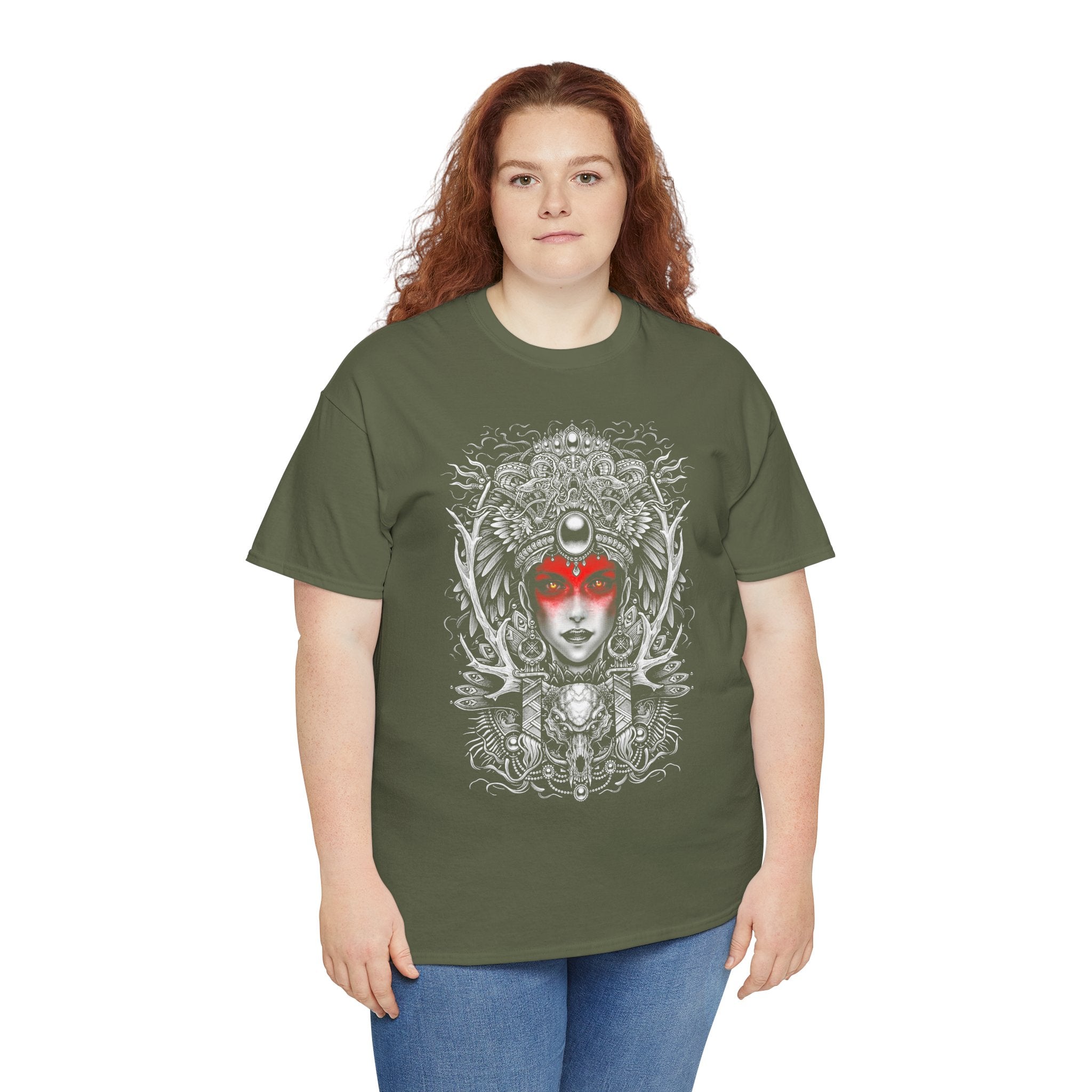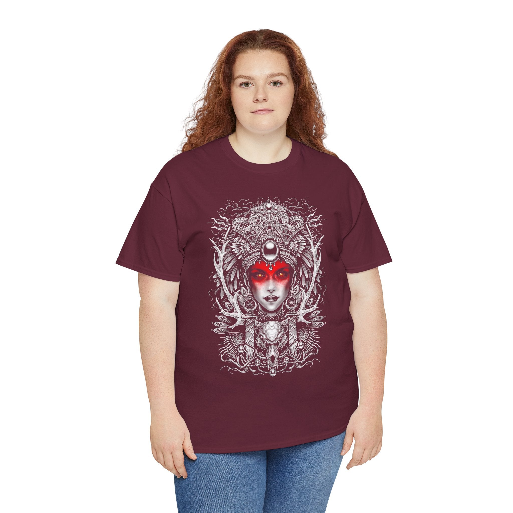 This Mystic Warrior Goddess Unisex Heavy Cotton Tee blends sacred symbolism and modern edge into one striking design. The detailed black-and-white linework crowned by a crimson aura captures the essence of power, resilience, and inner balance — a tribute to those who carry both fire and calm within.