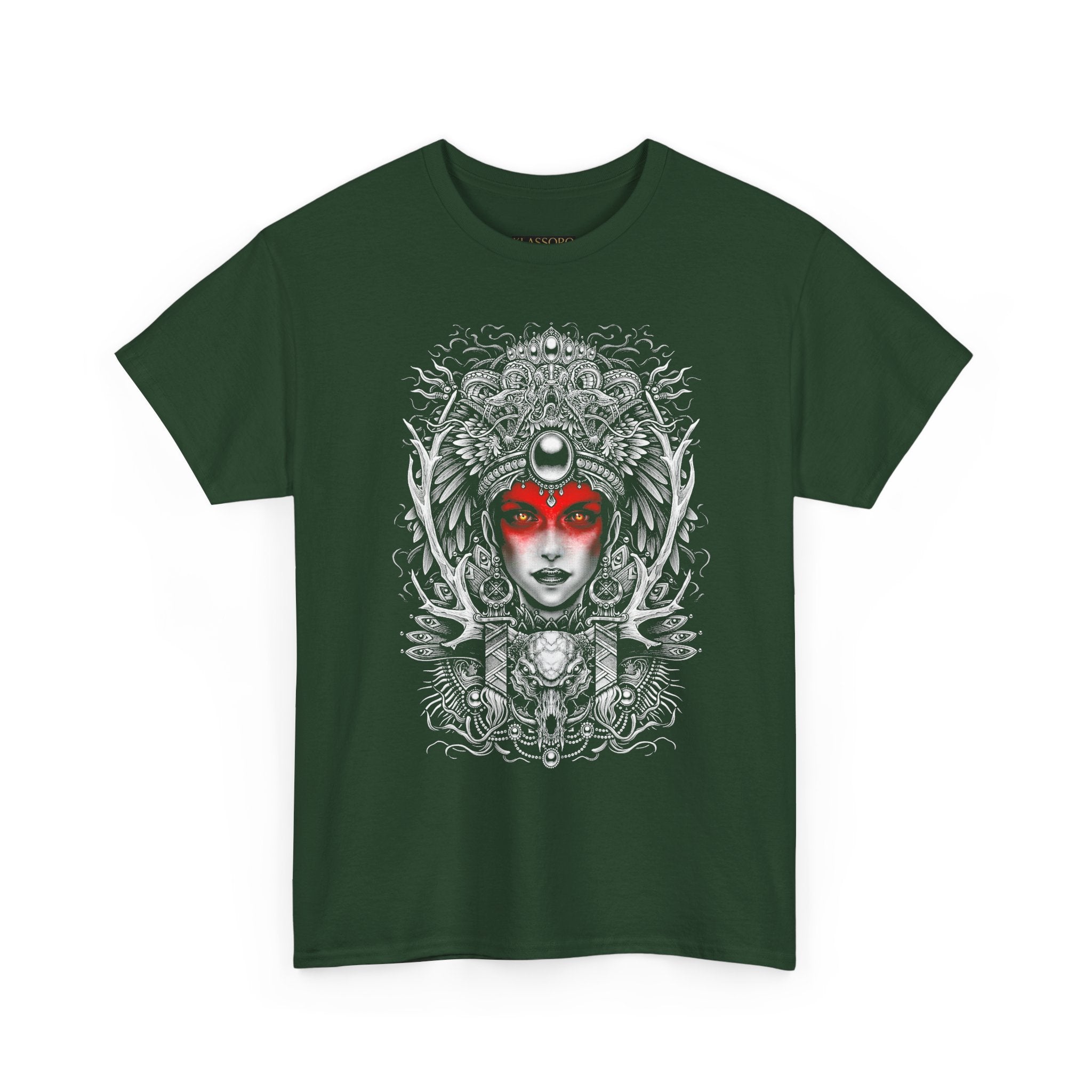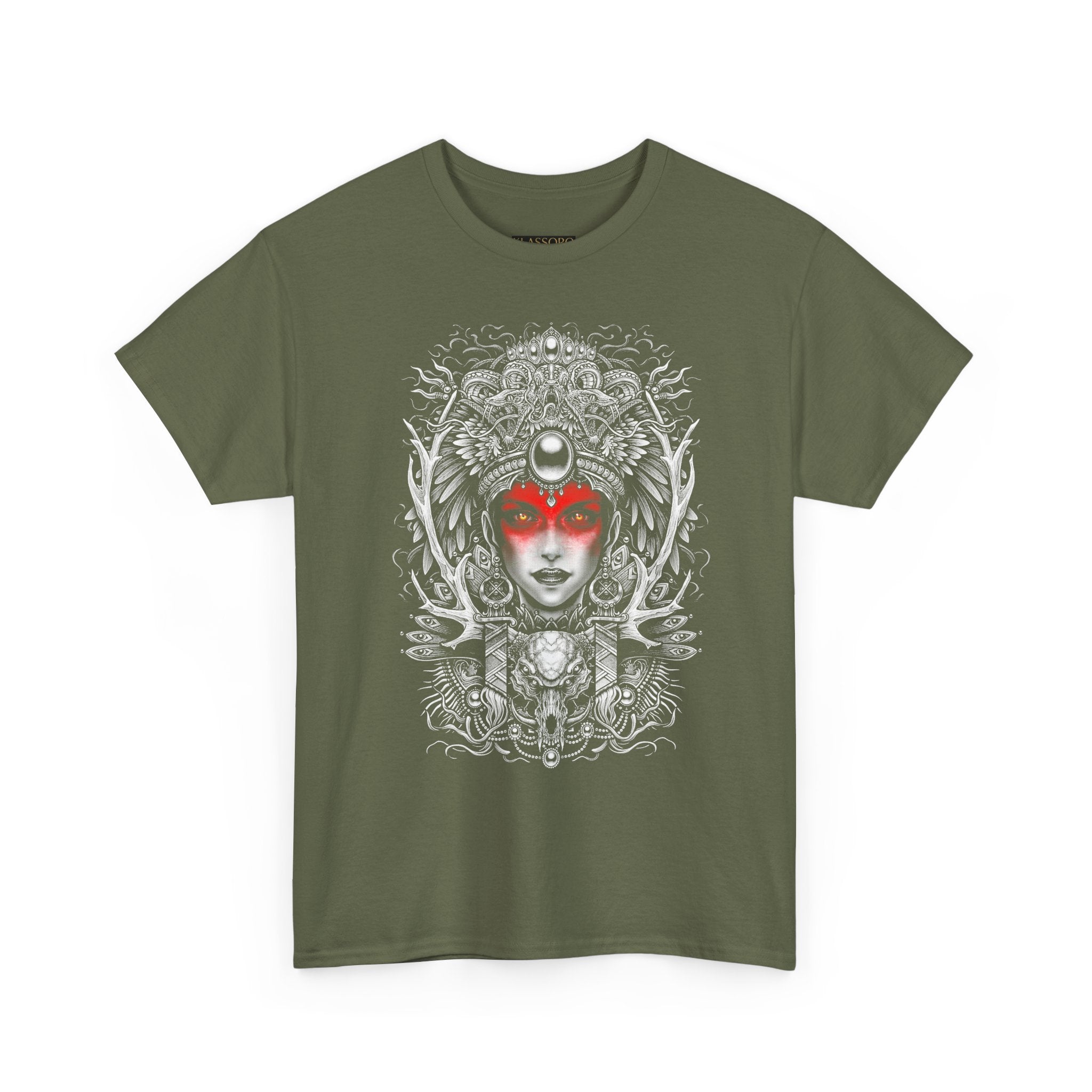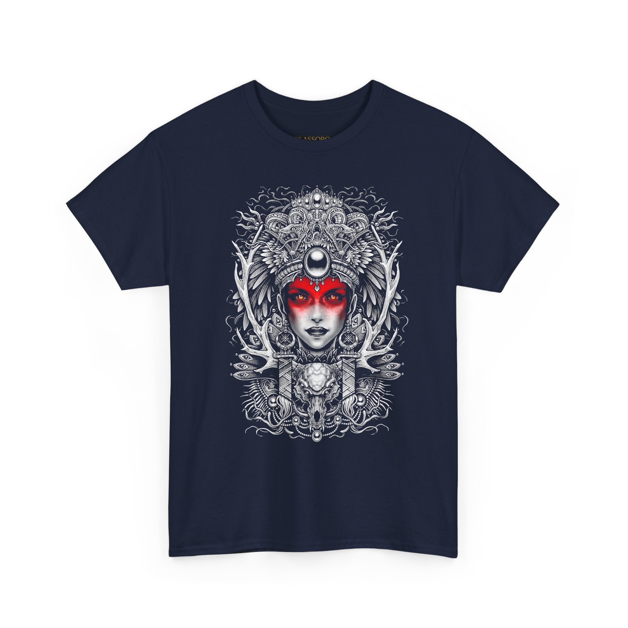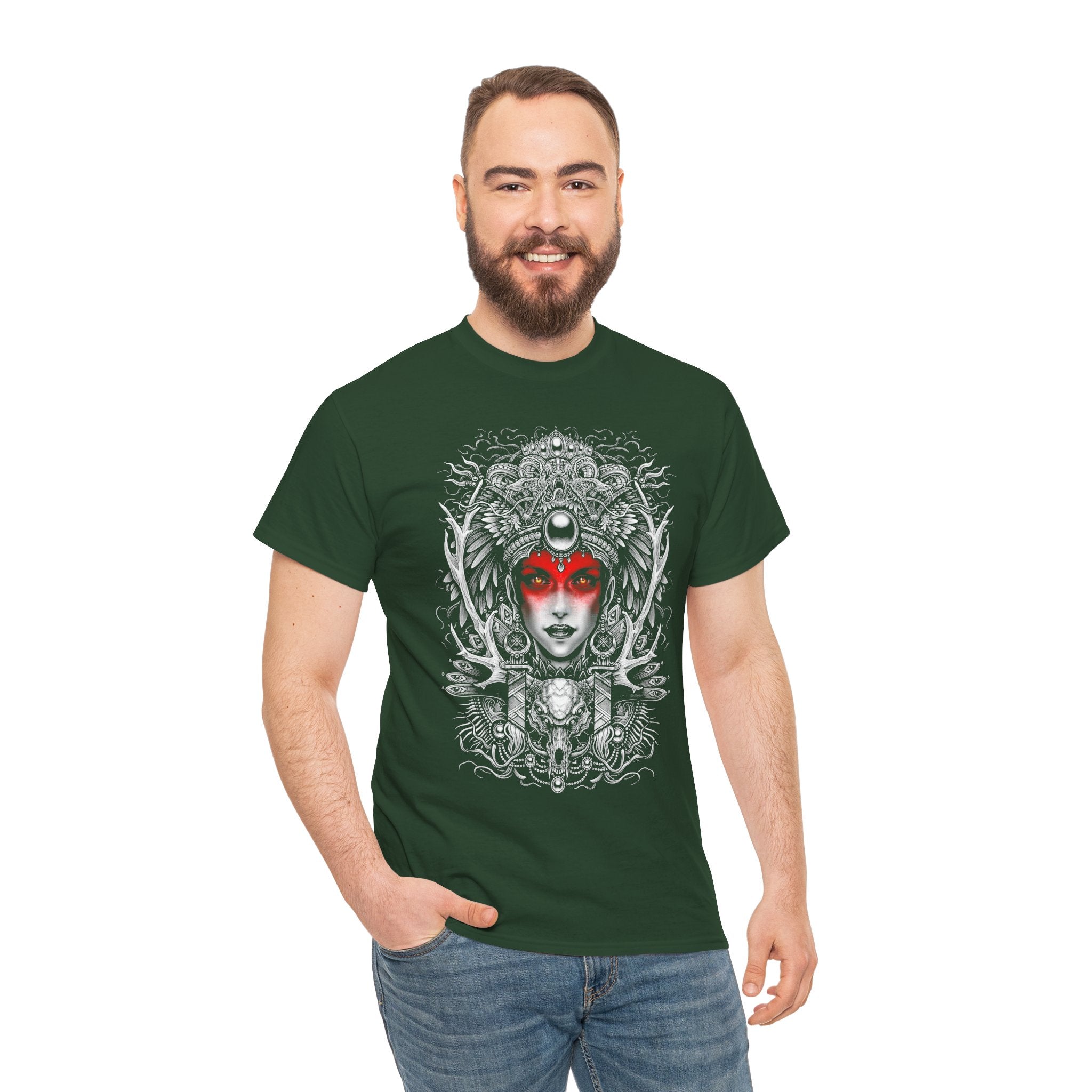 This Mystic Warrior Goddess Unisex Heavy Cotton Tee blends sacred symbolism and modern edge into one striking design. The detailed black-and-white linework crowned by a crimson aura captures the essence of power, resilience, and inner balance — a tribute to those who carry both fire and calm within.