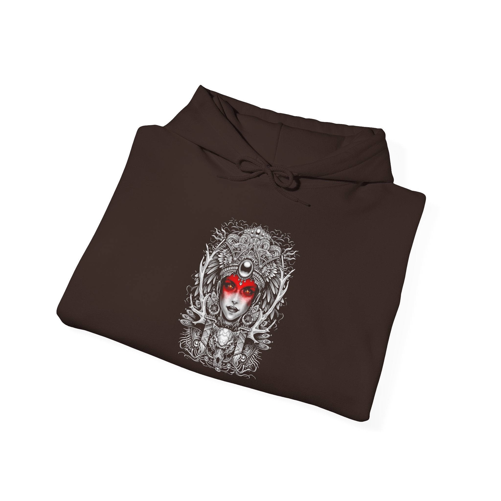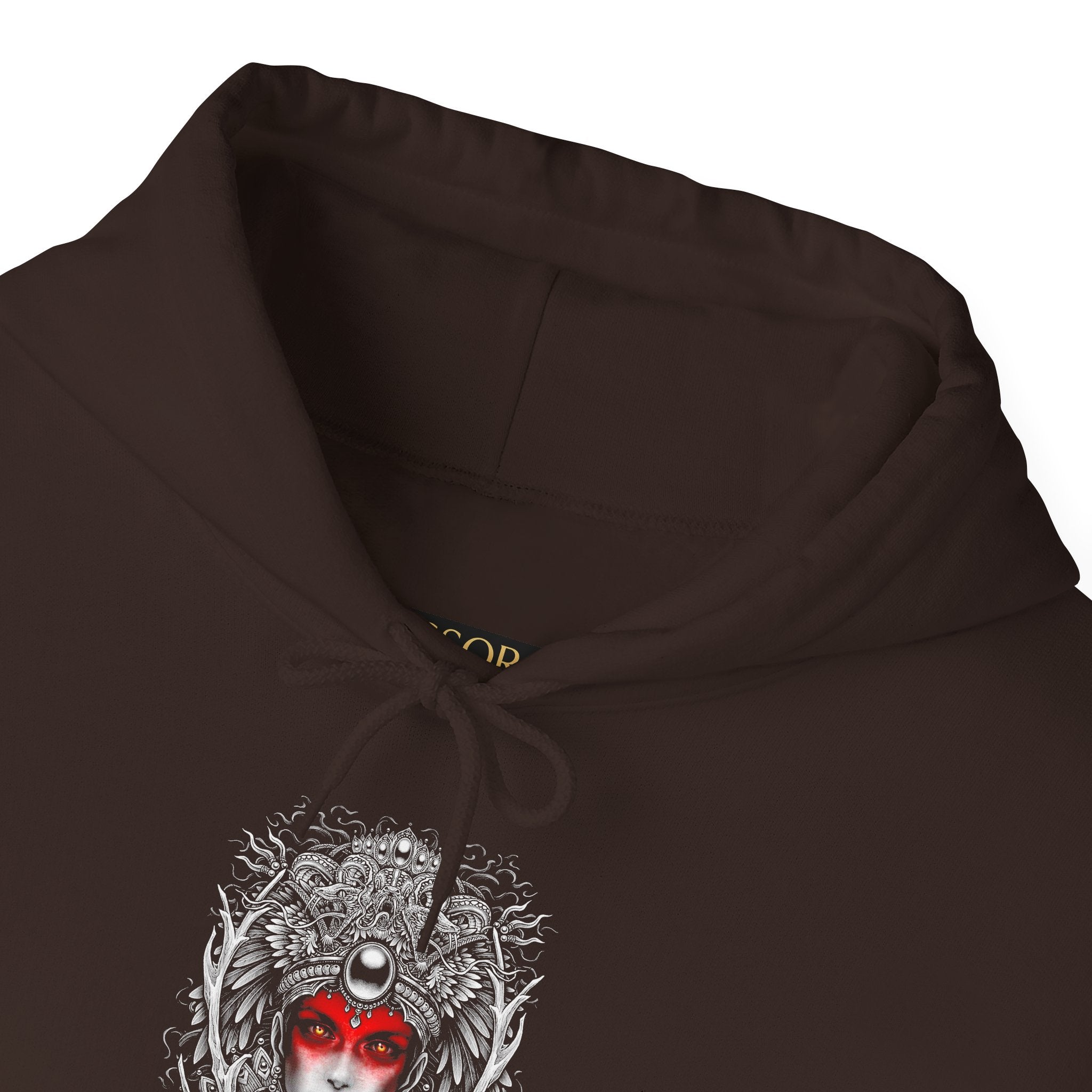 The deep black base amplifies every detail of the white linework, crowned by fierce red accents that symbolize courage and transformation. Crafted for those who live with purpose, this hoodie merges sacred art with modern streetwear comfort, creating a wearable masterpiece that stands for empowerment and originality.