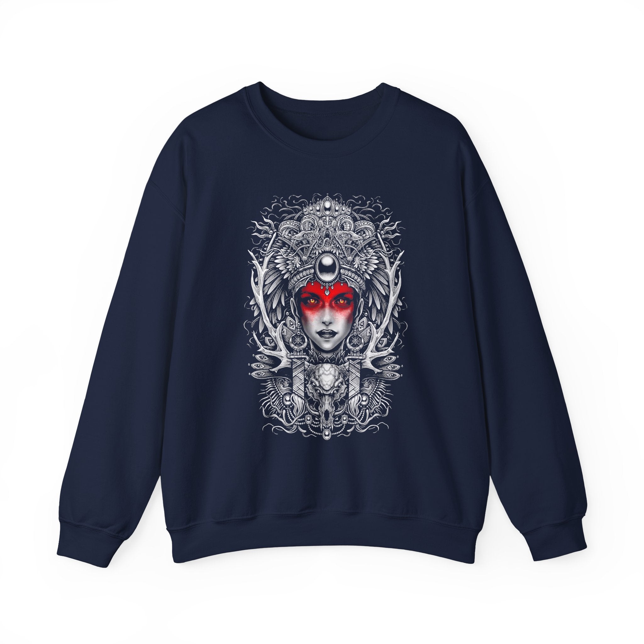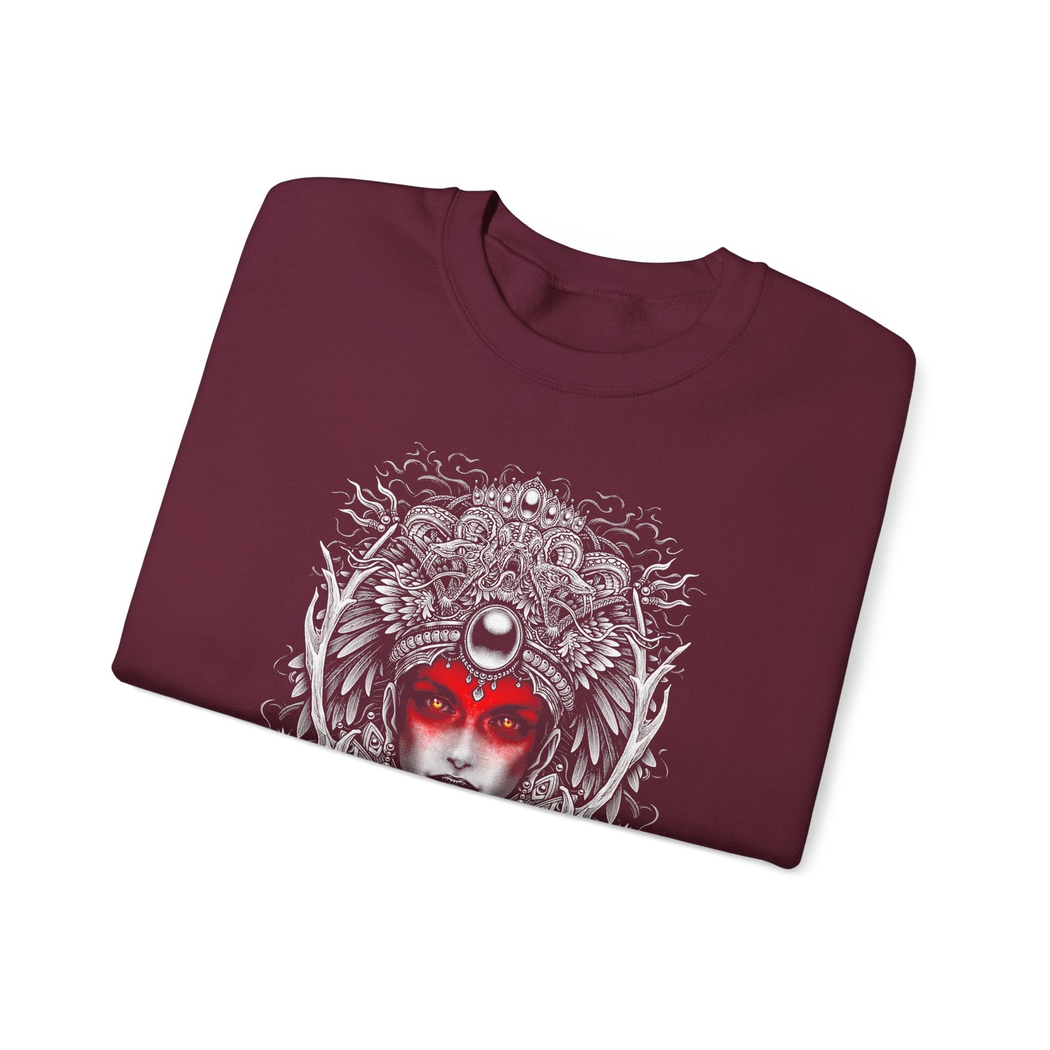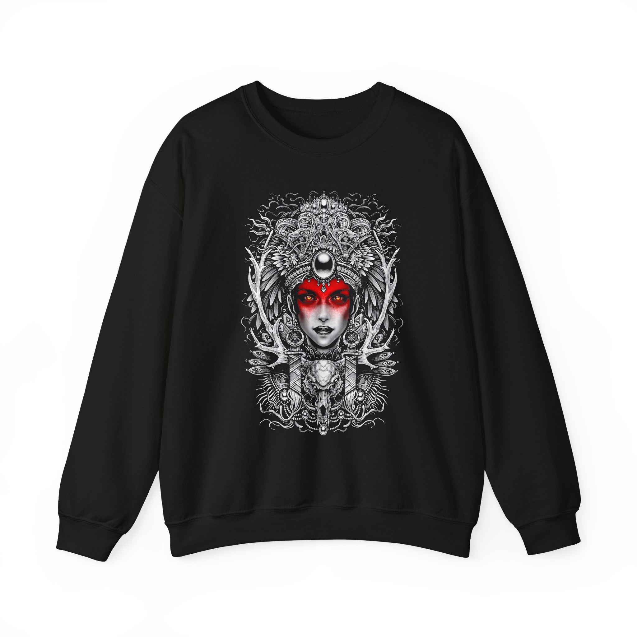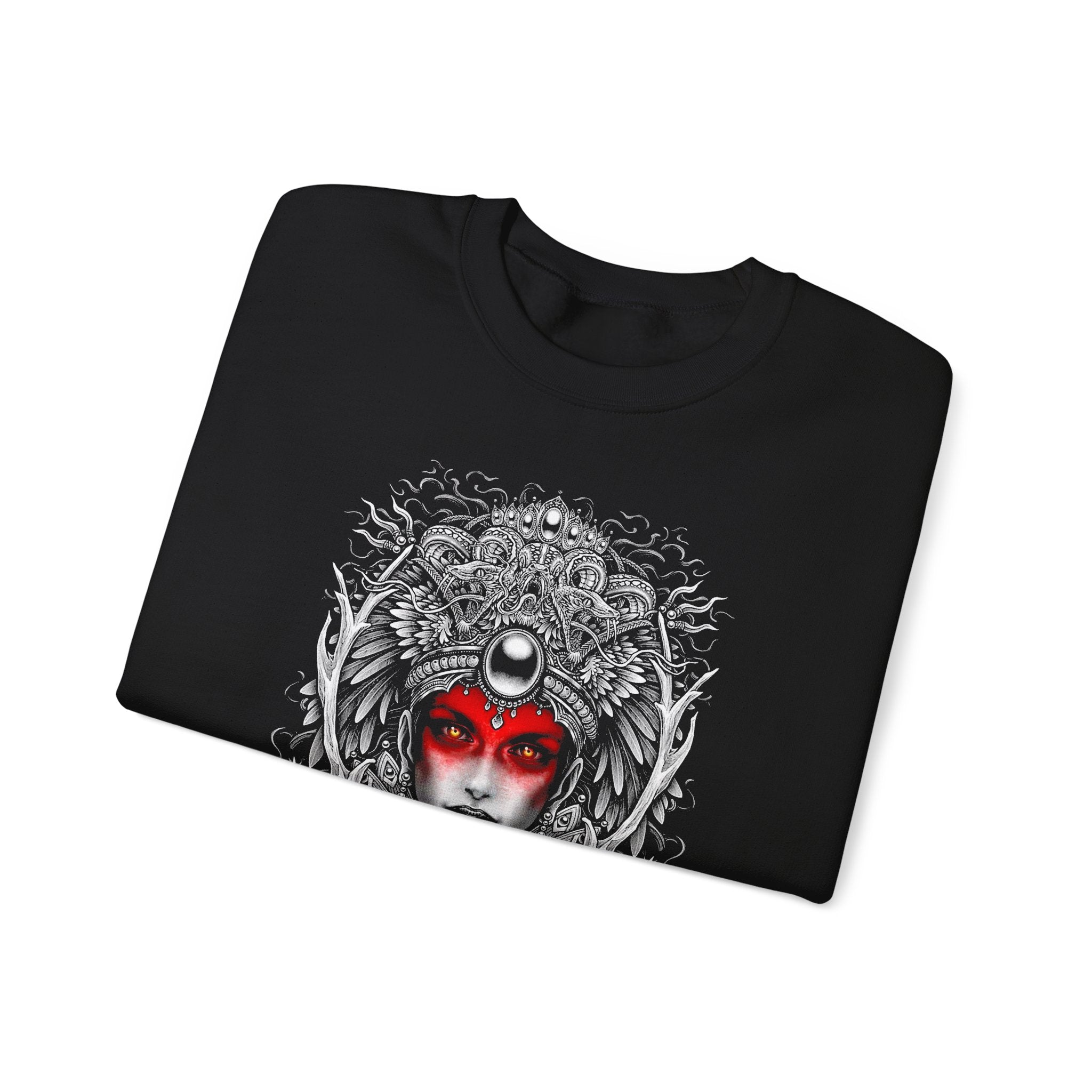 The Mystic Warrior Goddess Unisex Sweatshirt brings together timeless art and fearless self-expression. Every detail — from the serpent crown and moon halo to the fierce red-gazed eyes — tells the story of inner awakening and unstoppable feminine energy.
