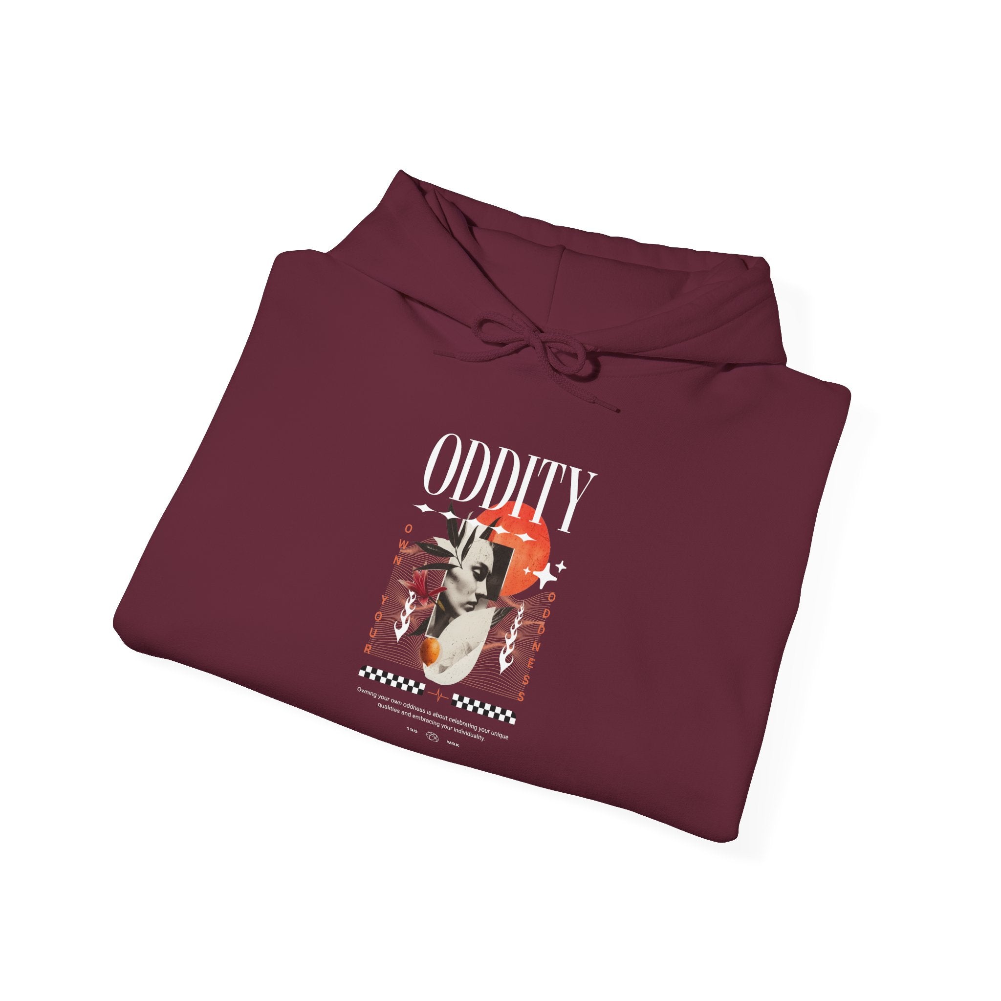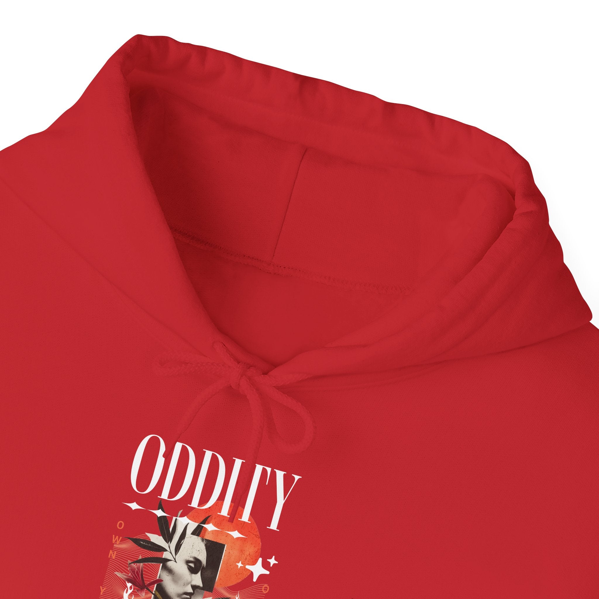 The Oddity Unisex Heavy Blend™ Hooded Sweatshirt is built for those who wear their individuality with pride. Featuring a surreal portrait collage with cosmic red tones, abstract shapes, and bold typography, this hoodie is a statement of owning your oddness and embracing originality.