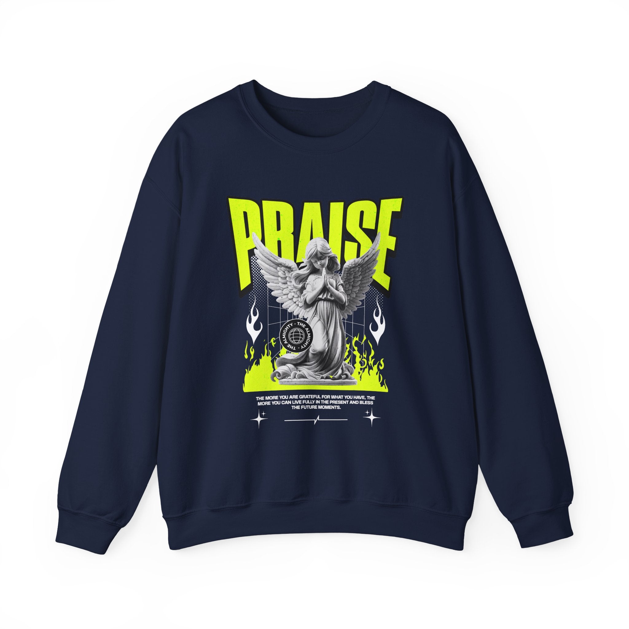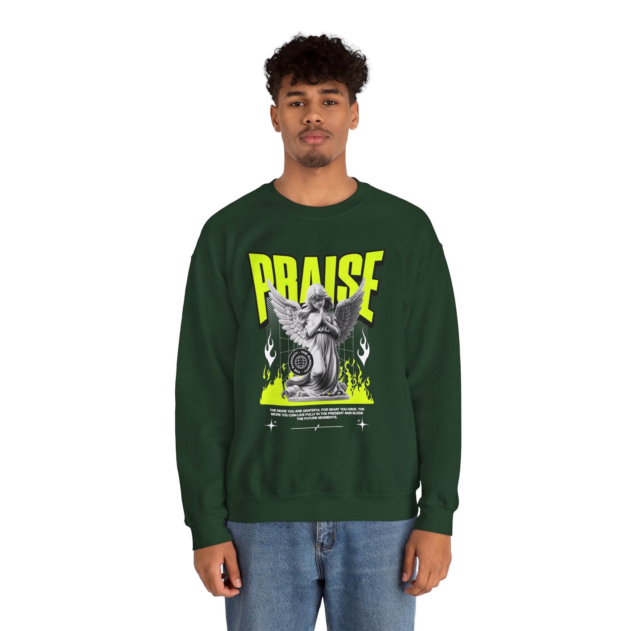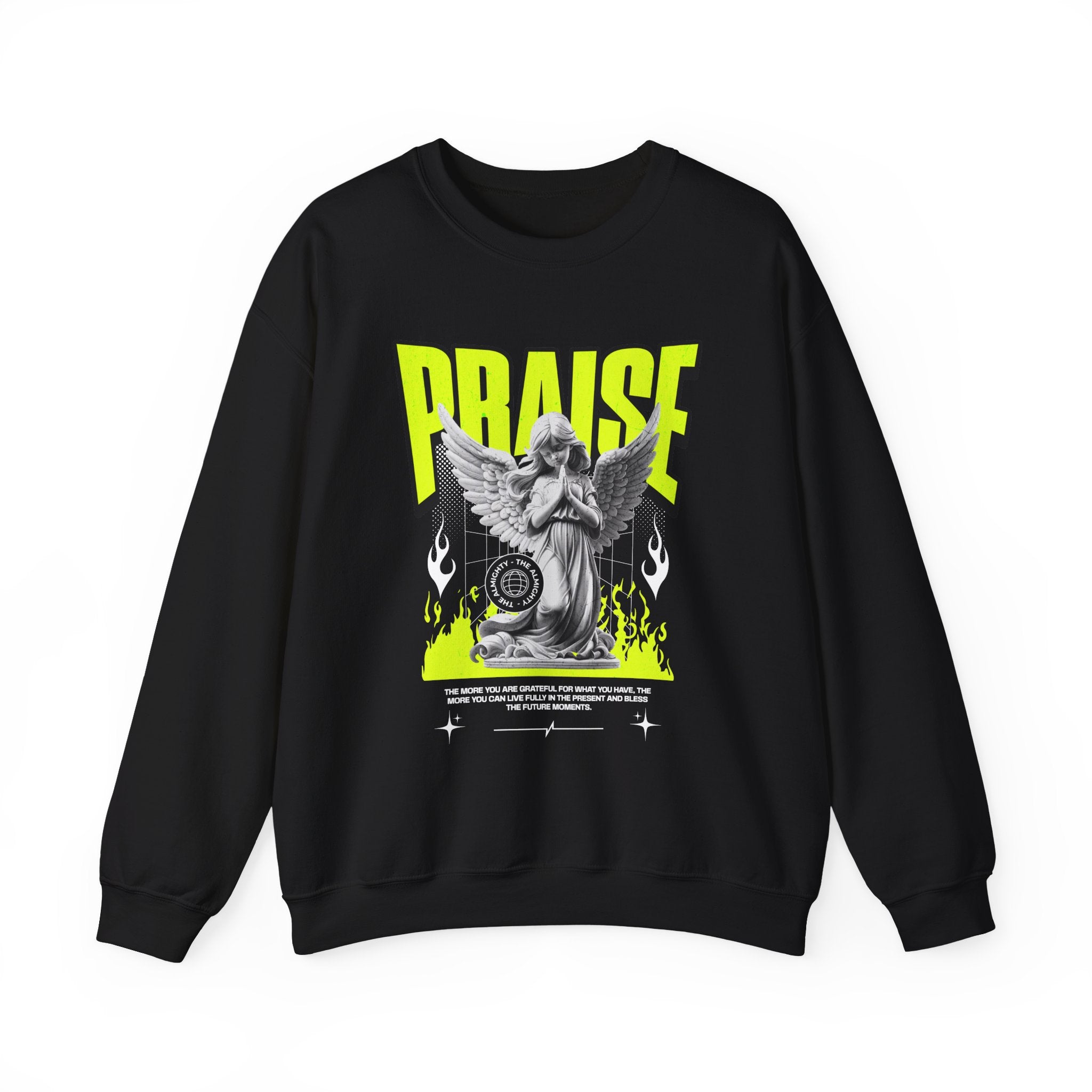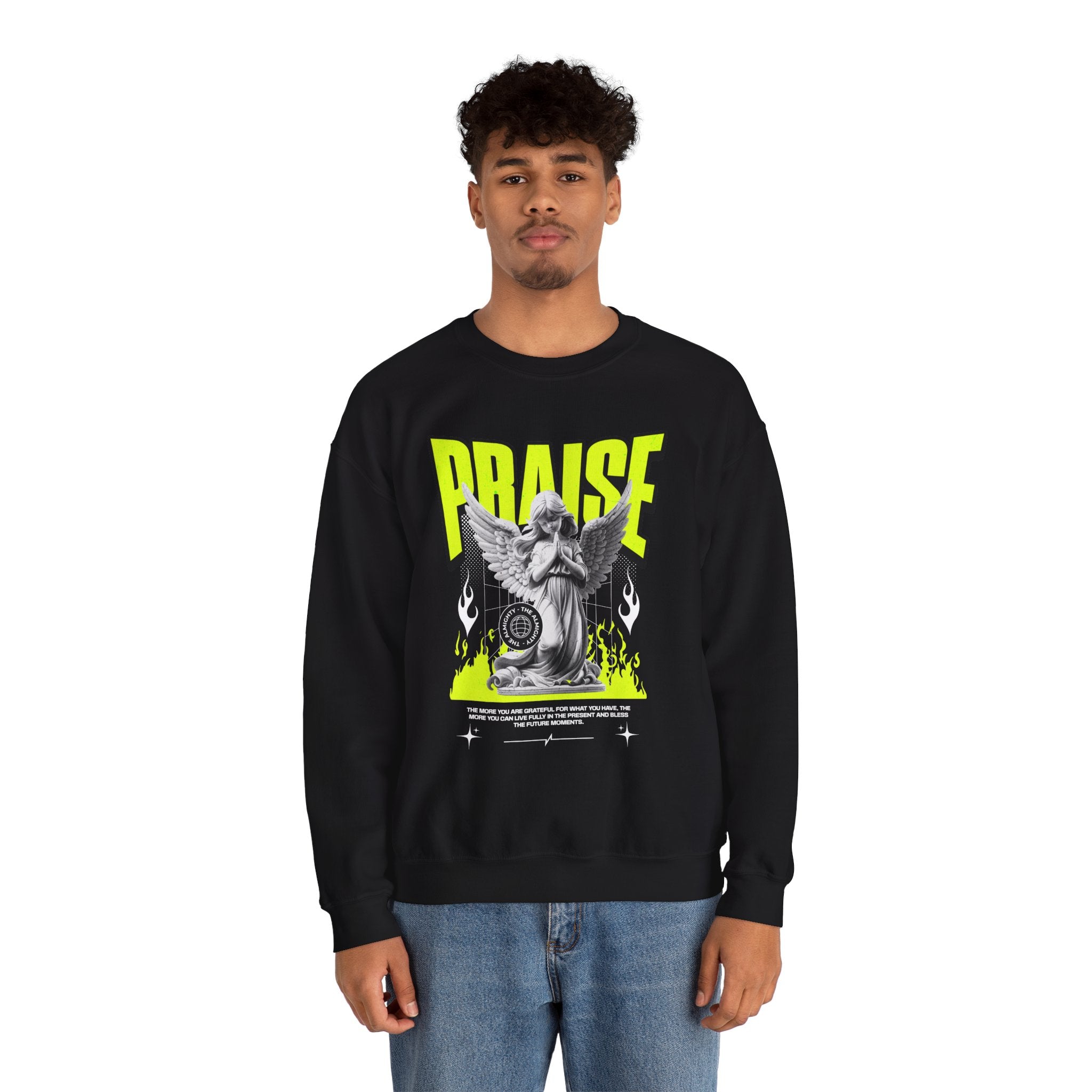 Step into bold faith-inspired fashion with the Praise Angel Crewneck Sweatshirt. Designed with a striking angel statue graphic set against neon flames and bold typography, this pullover embodies gratitude, strength, and fearless spirit.