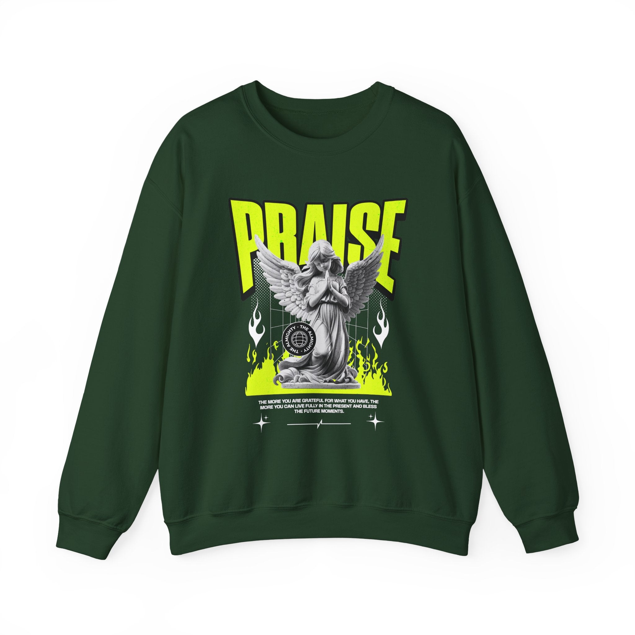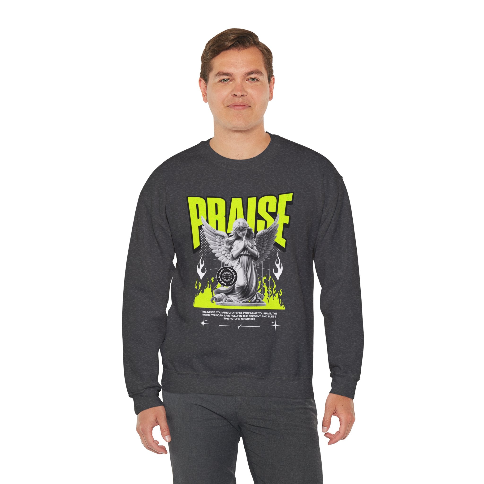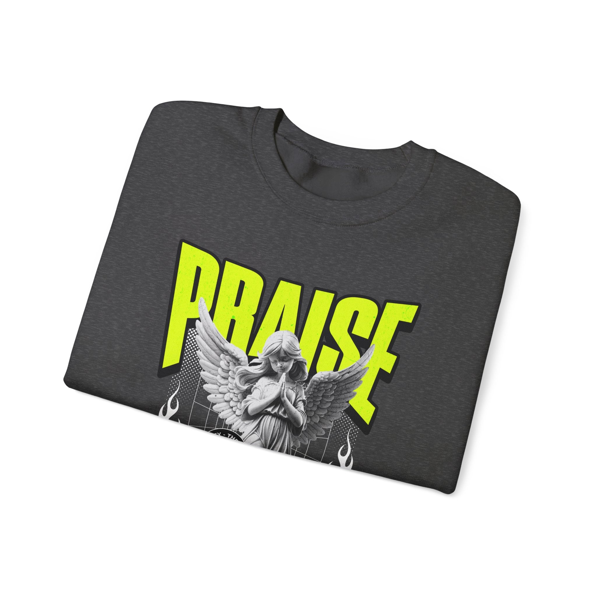 Step into bold faith-inspired fashion with the Praise Angel Crewneck Sweatshirt. Designed with a striking angel statue graphic set against neon flames and bold typography, this pullover embodies gratitude, strength, and fearless spirit.