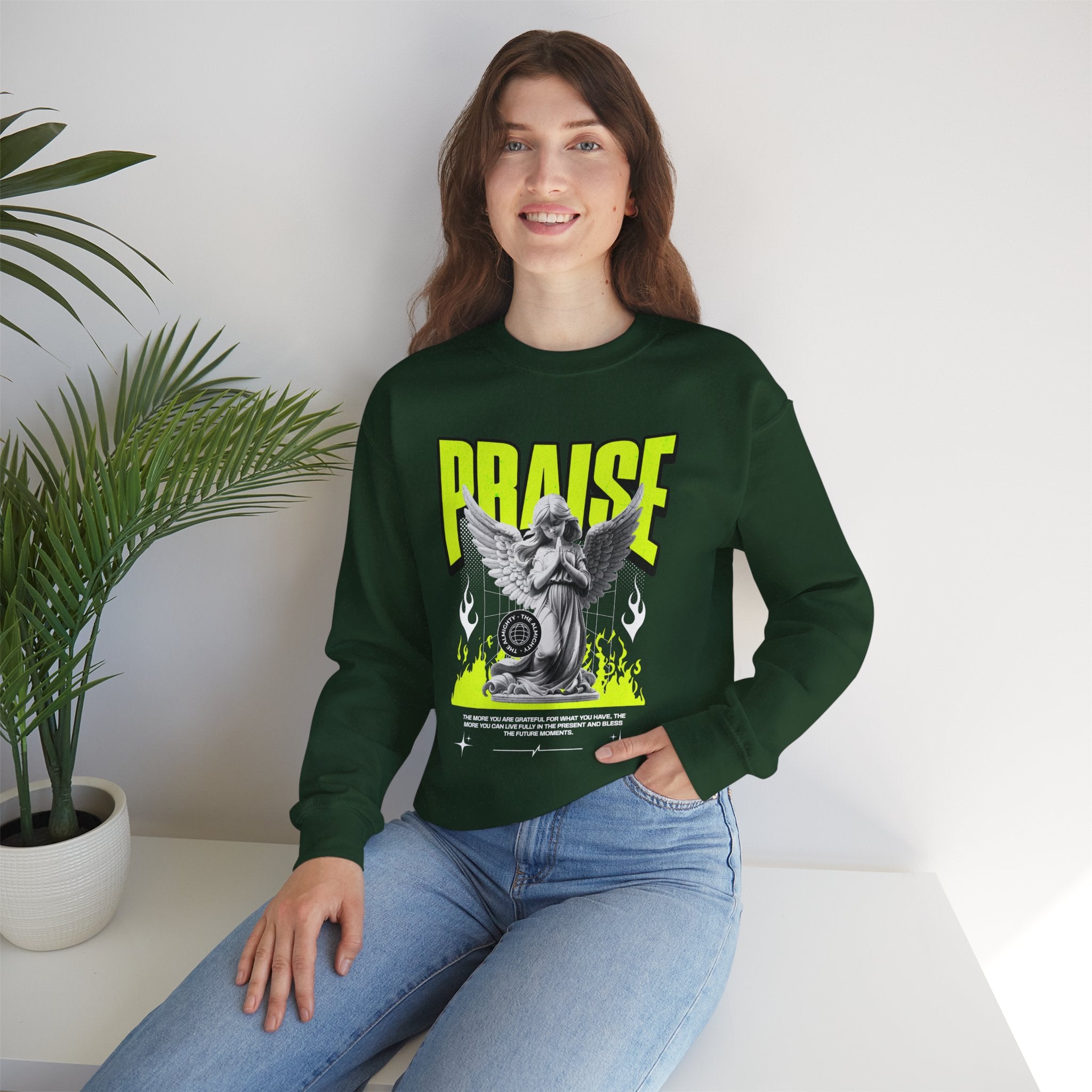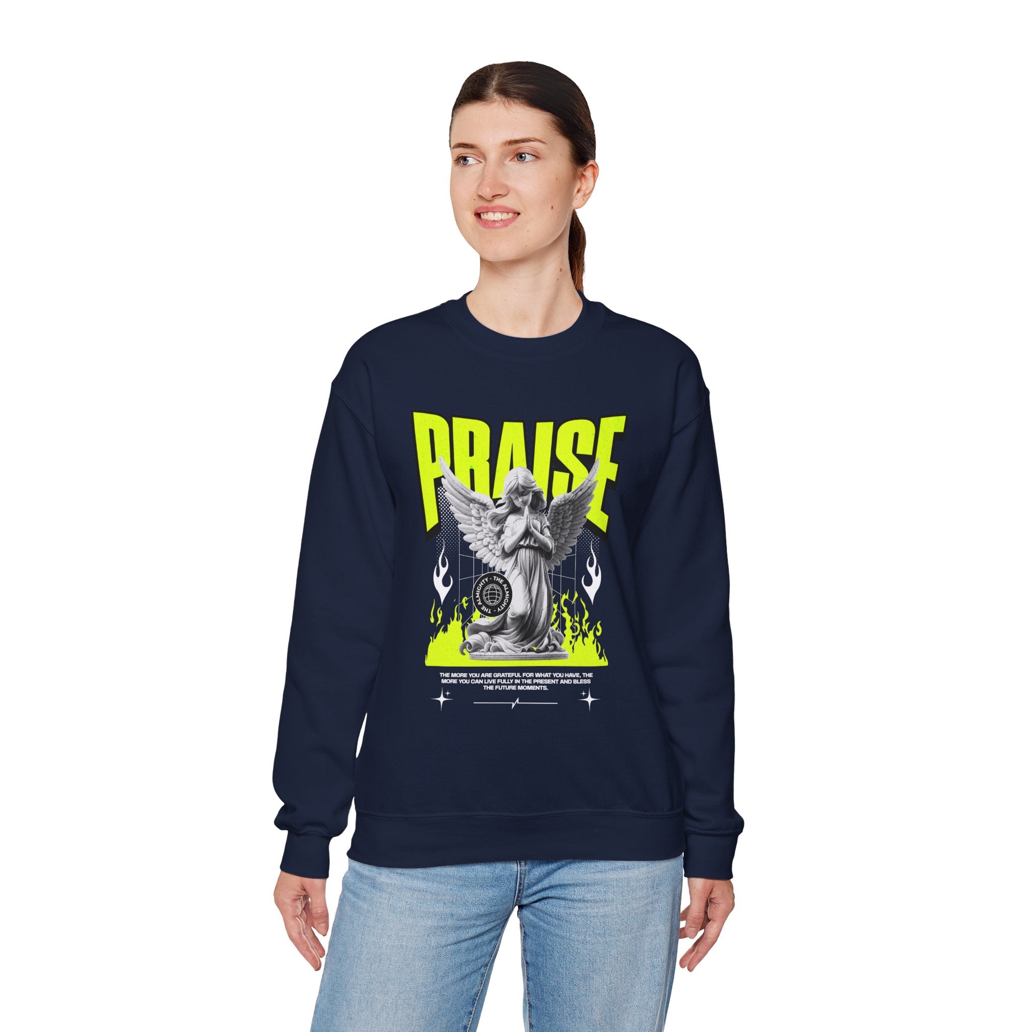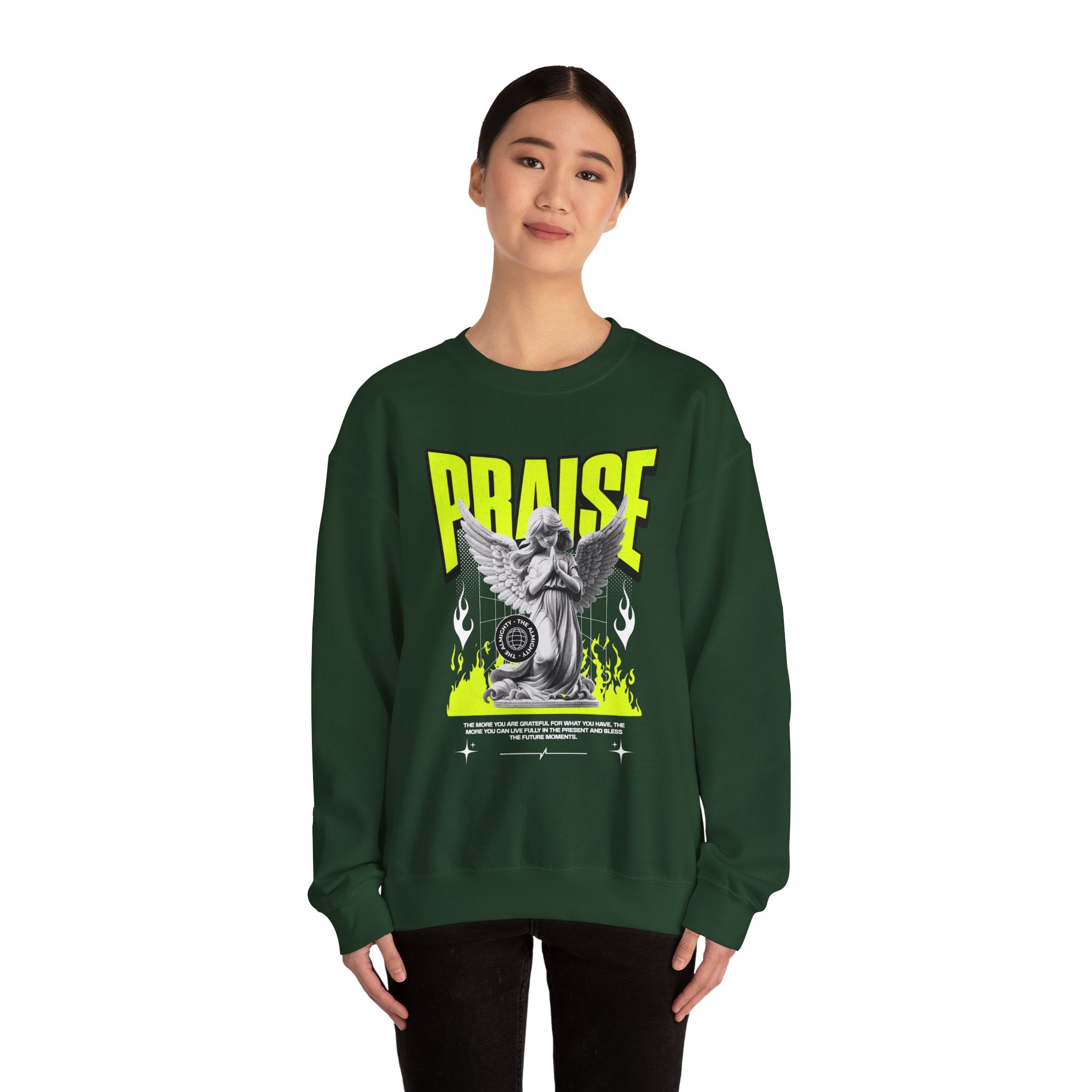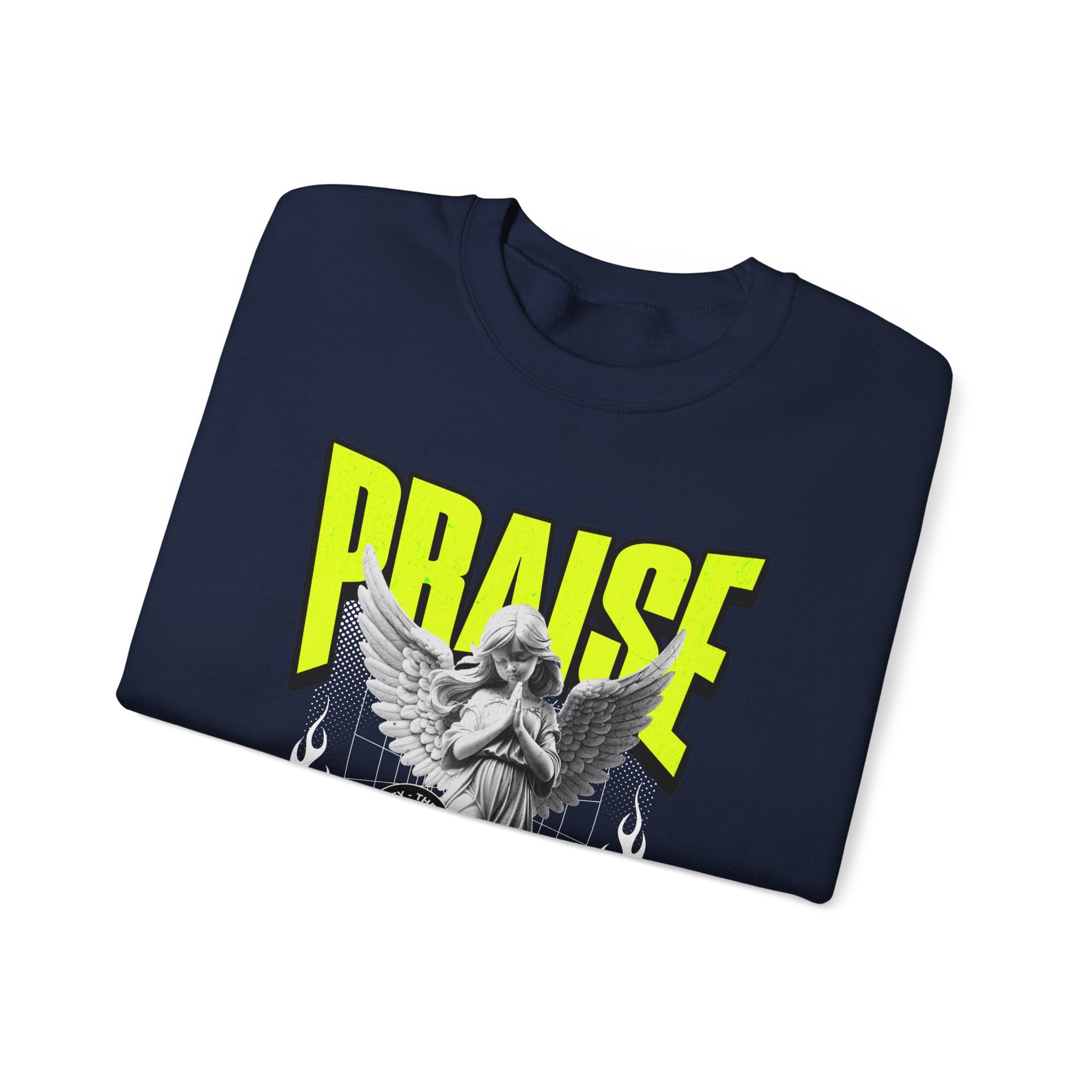 Step into bold faith-inspired fashion with the Praise Angel Crewneck Sweatshirt. Designed with a striking angel statue graphic set against neon flames and bold typography, this pullover embodies gratitude, strength, and fearless spirit.