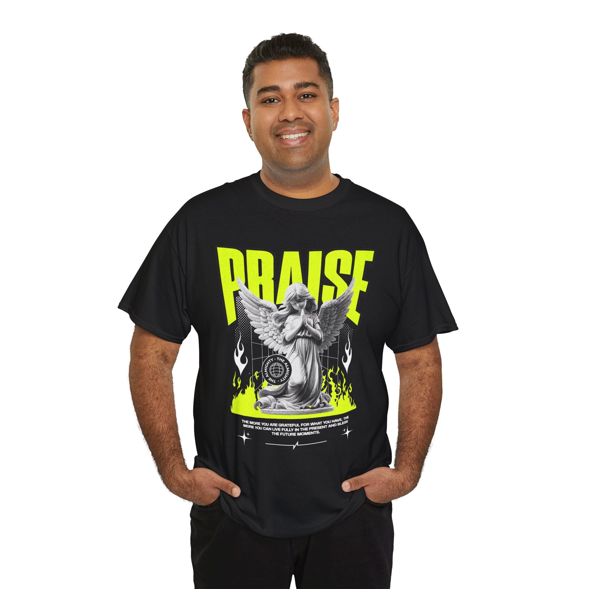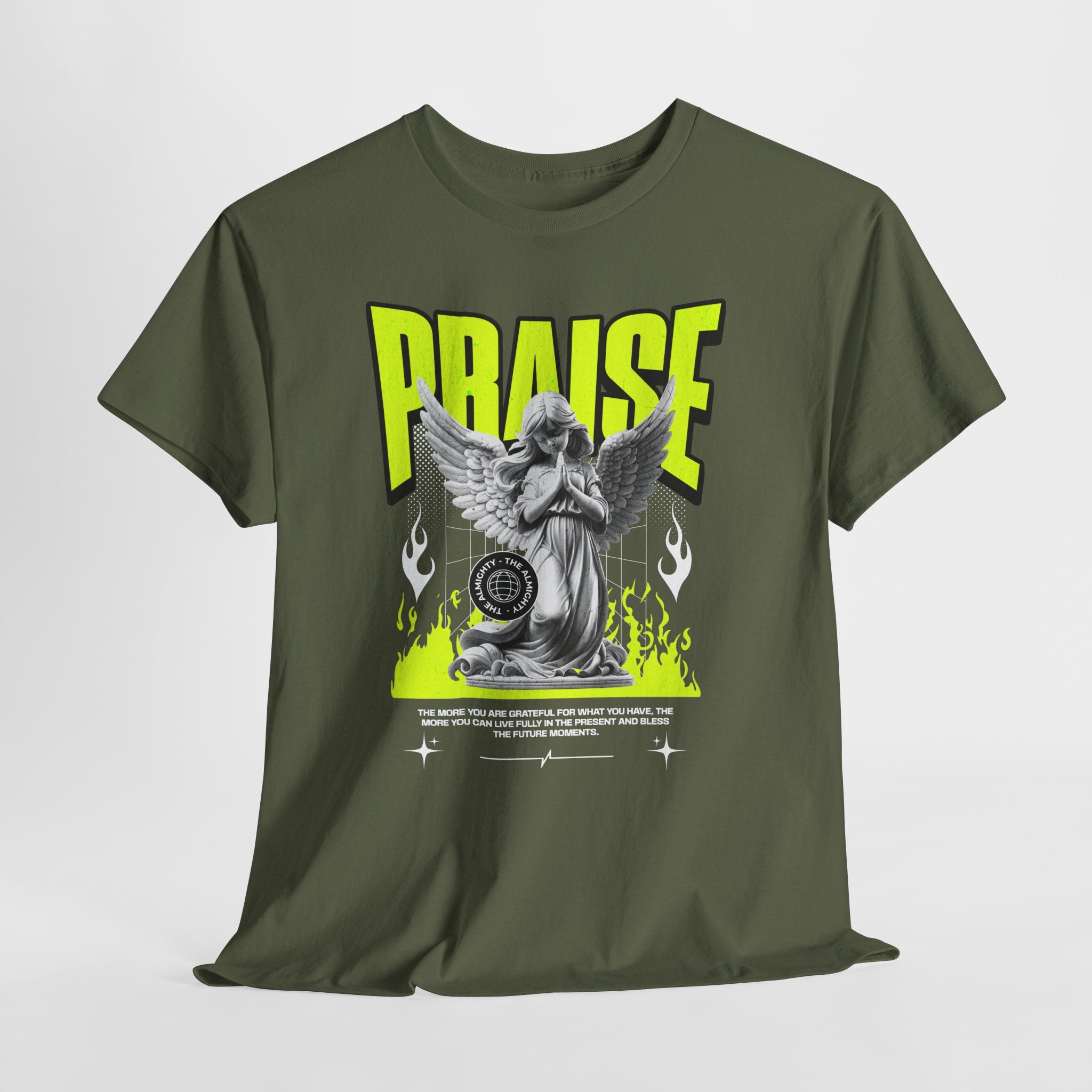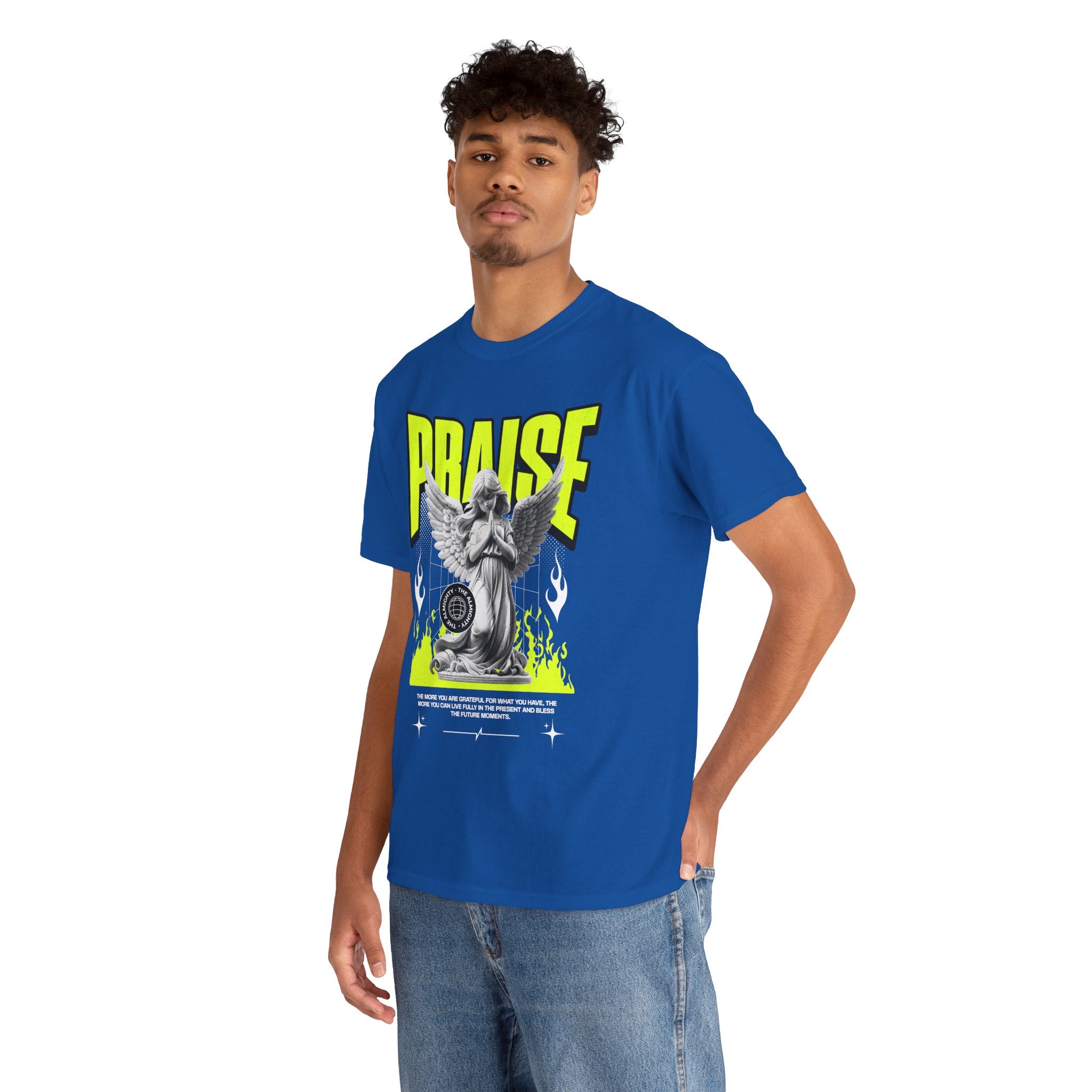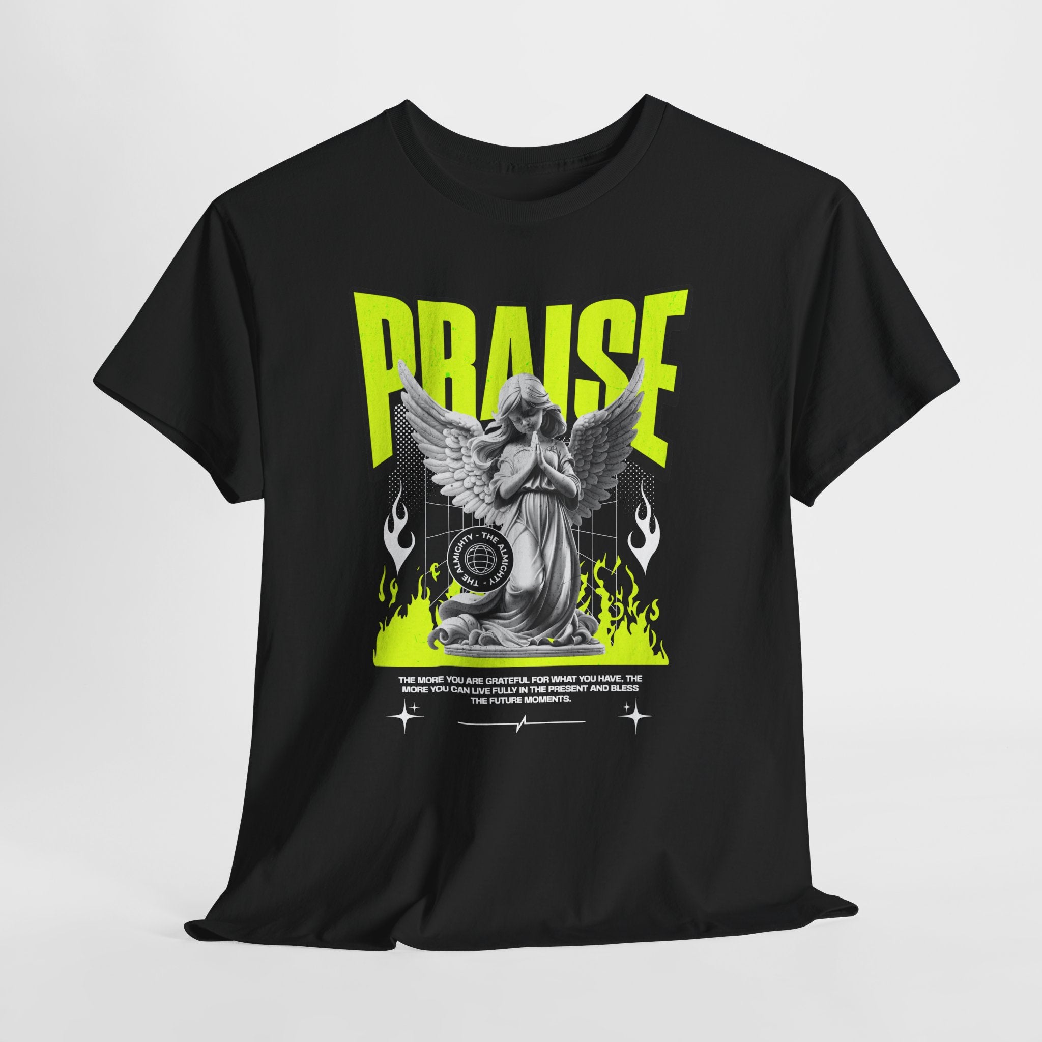 Channel the power of gratitude and bold streetwear style with the Praise Heavy Cotton Tee. Featuring a striking angel statue graphic surrounded by neon flames and modern gothic typography, this tee is more than just clothing – it’s a statement of inner strength, faith, and street-ready confidence.