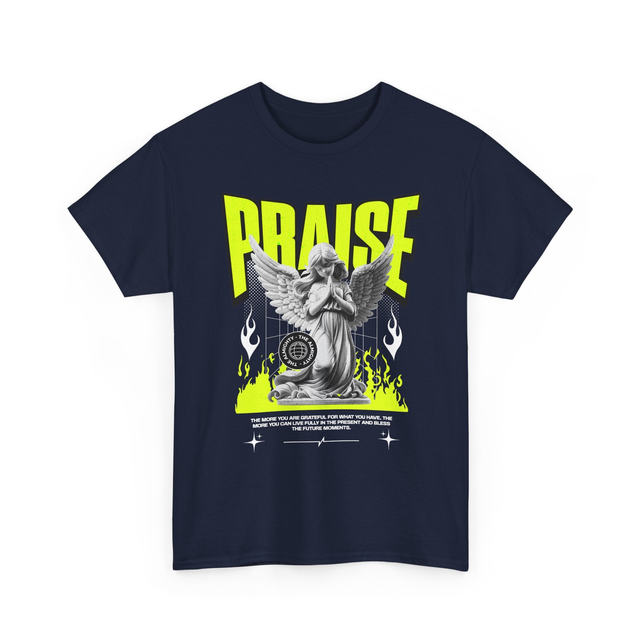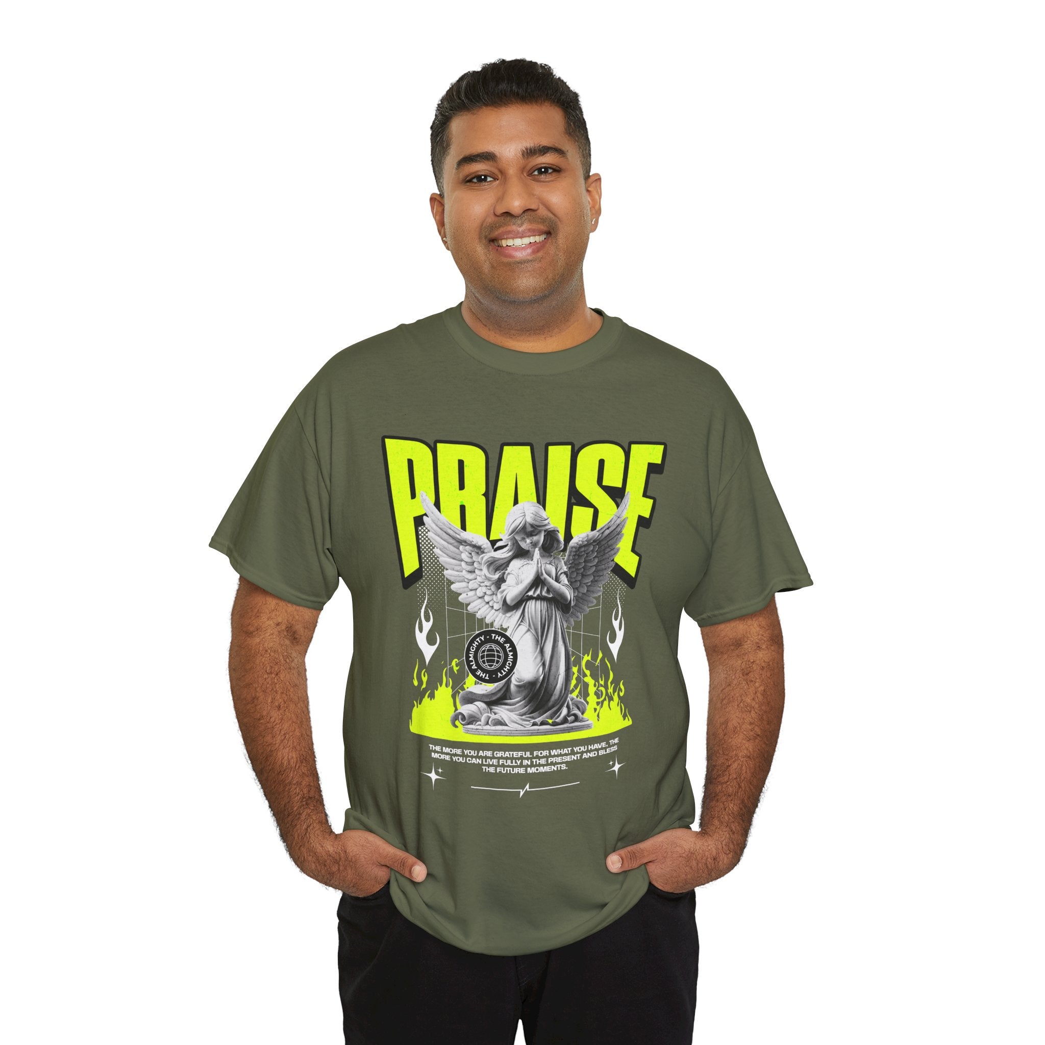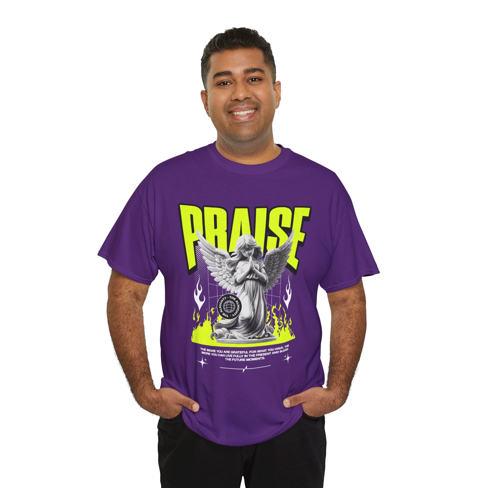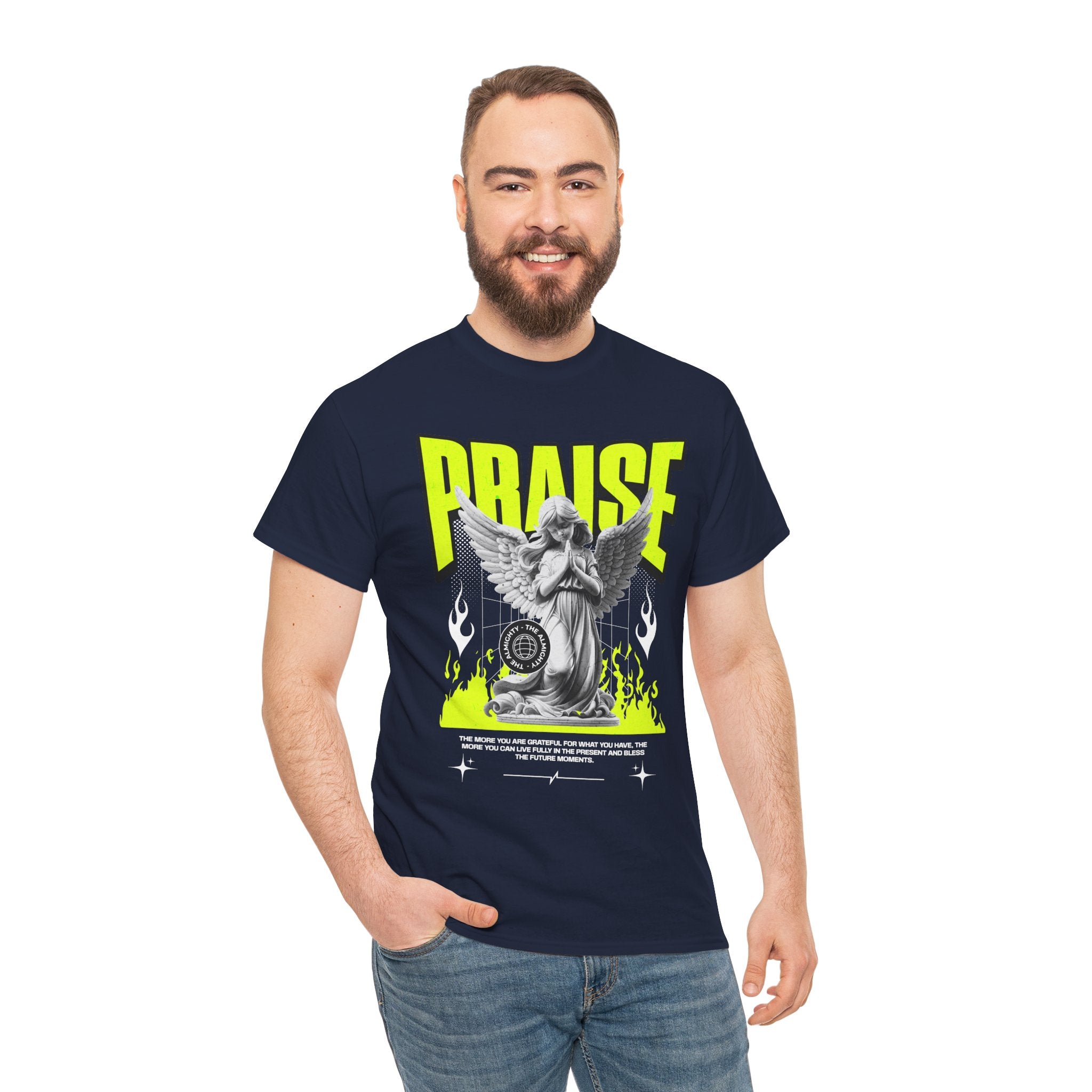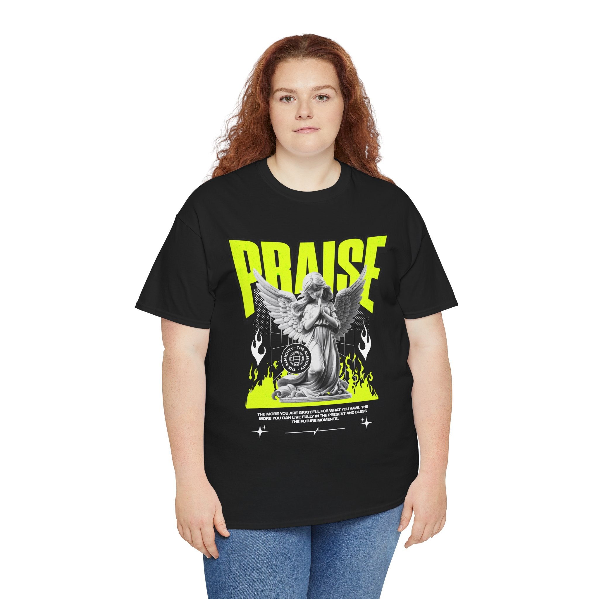 Channel the power of gratitude and bold streetwear style with the Praise Heavy Cotton Tee. Featuring a striking angel statue graphic surrounded by neon flames and modern gothic typography, this tee is more than just clothing – it’s a statement of inner strength, faith, and street-ready confidence.