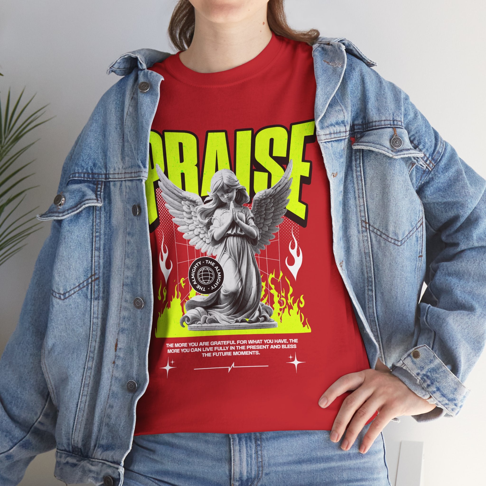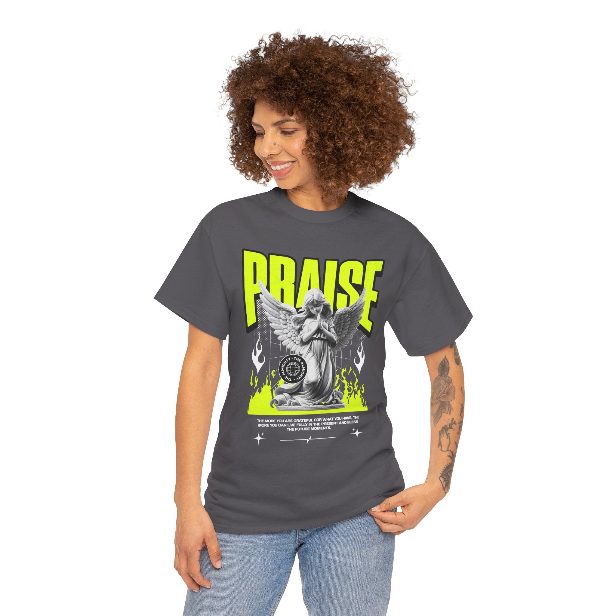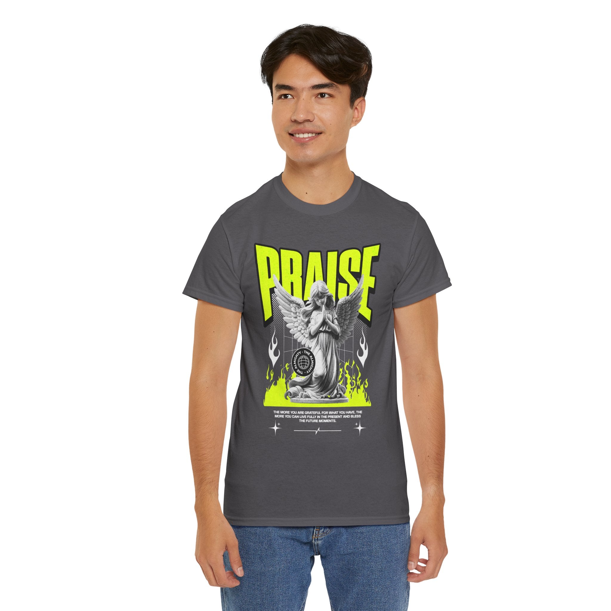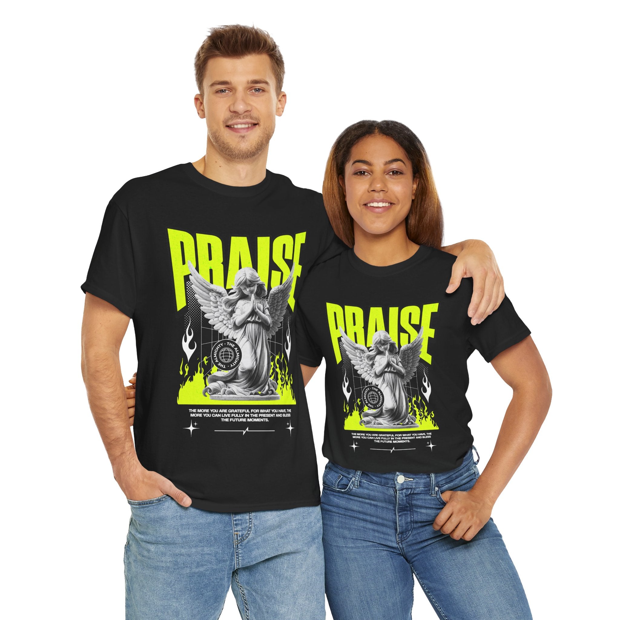 Channel the power of gratitude and bold streetwear style with the Praise Heavy Cotton Tee. Featuring a striking angel statue graphic surrounded by neon flames and modern gothic typography, this tee is more than just clothing – it’s a statement of inner strength, faith, and street-ready confidence.