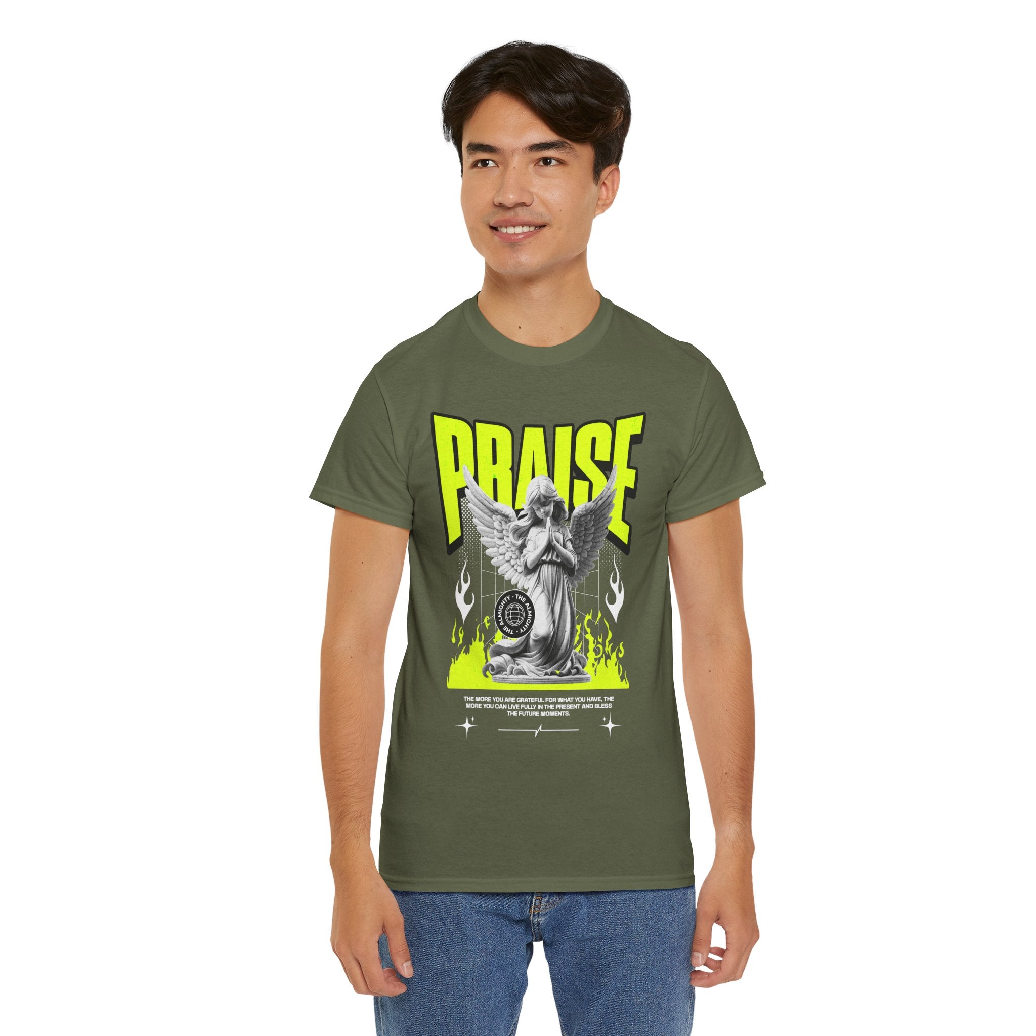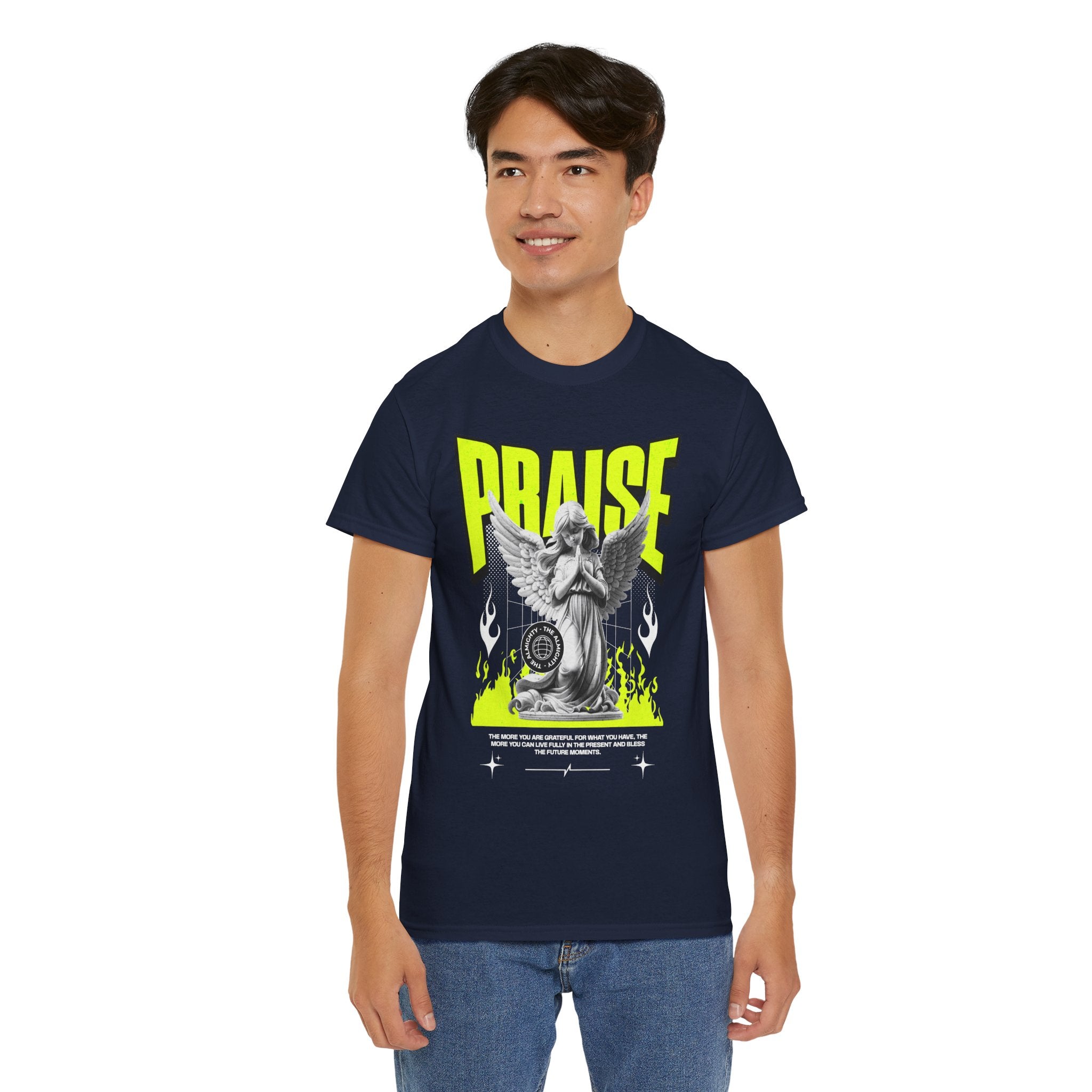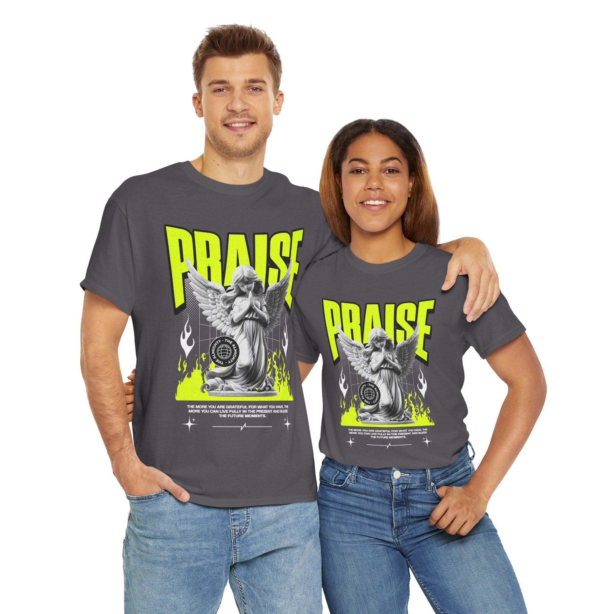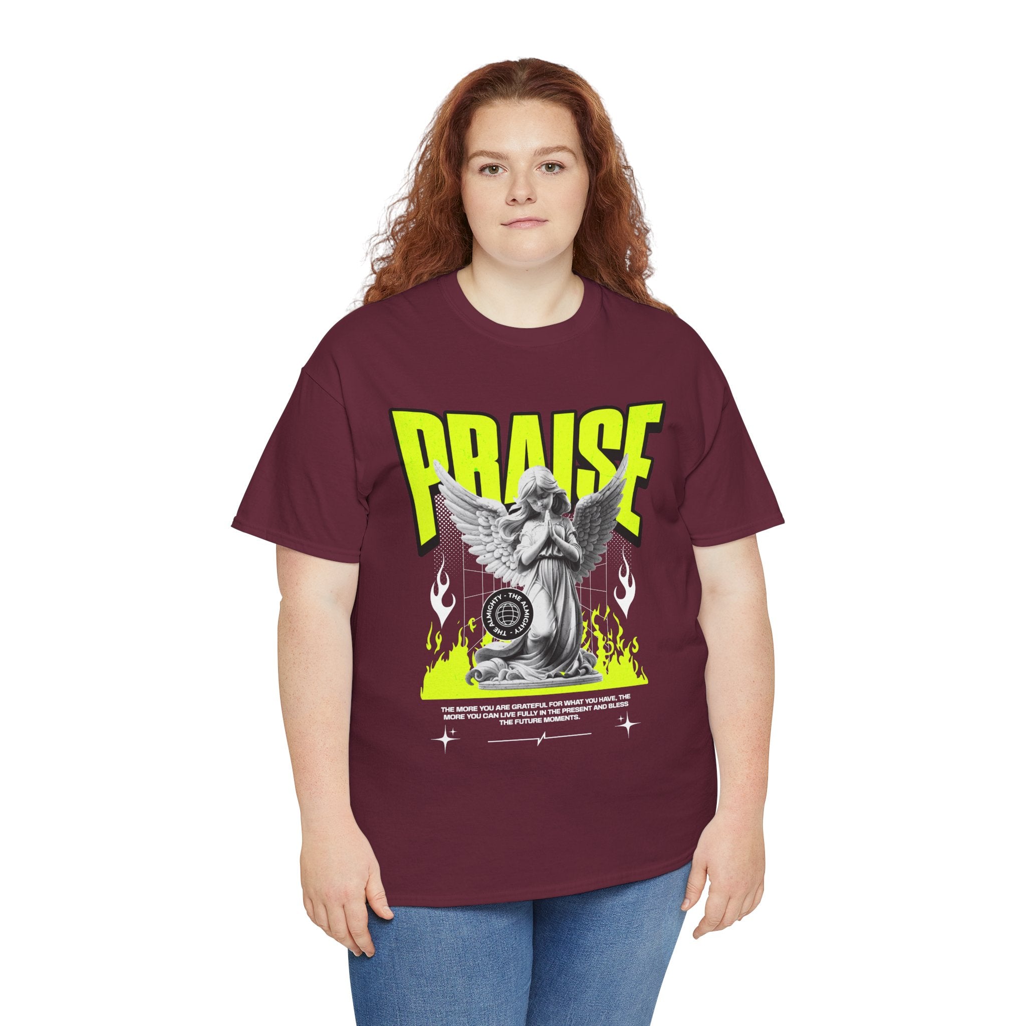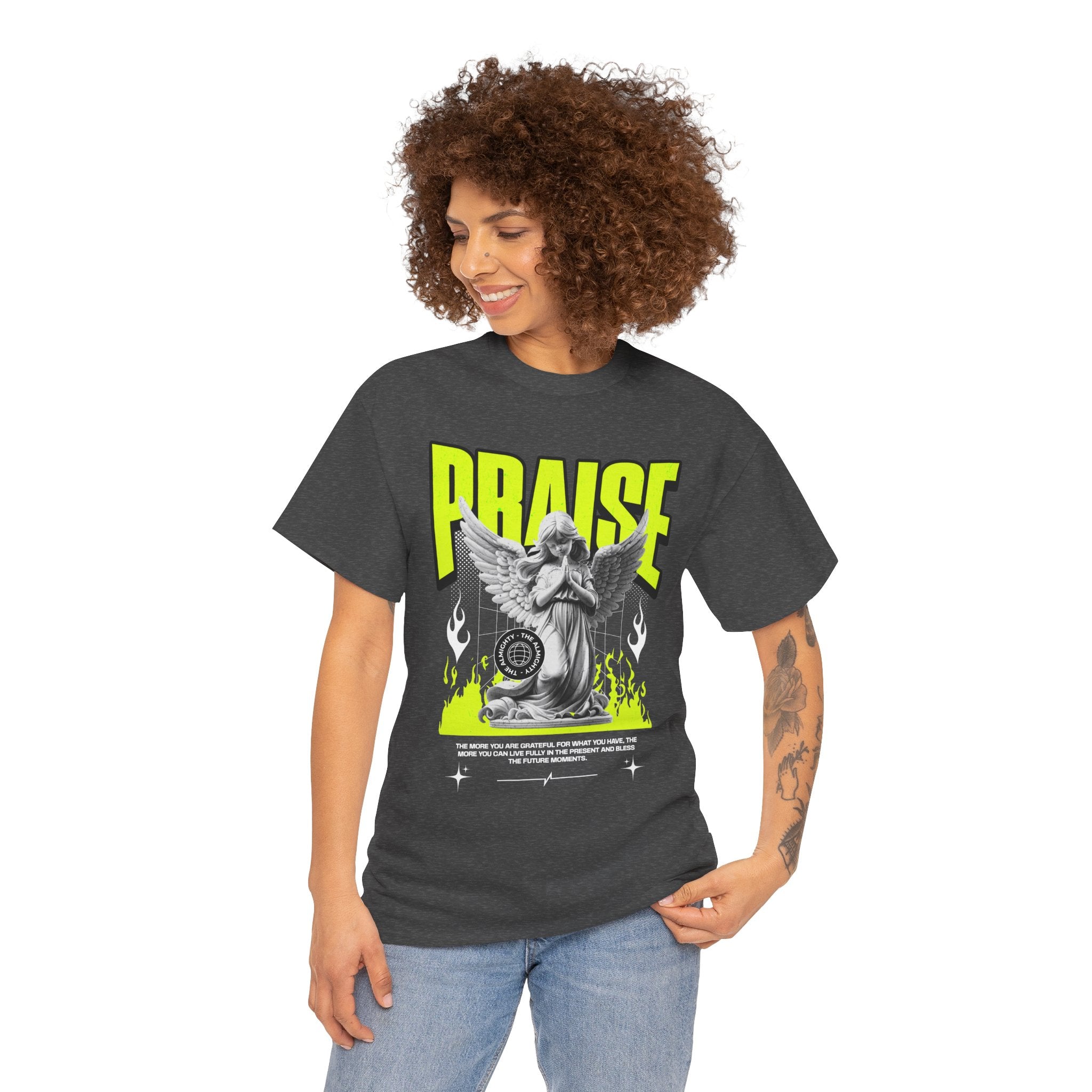 Channel the power of gratitude and bold streetwear style with the Praise Heavy Cotton Tee. Featuring a striking angel statue graphic surrounded by neon flames and modern gothic typography, this tee is more than just clothing – it’s a statement of inner strength, faith, and street-ready confidence.