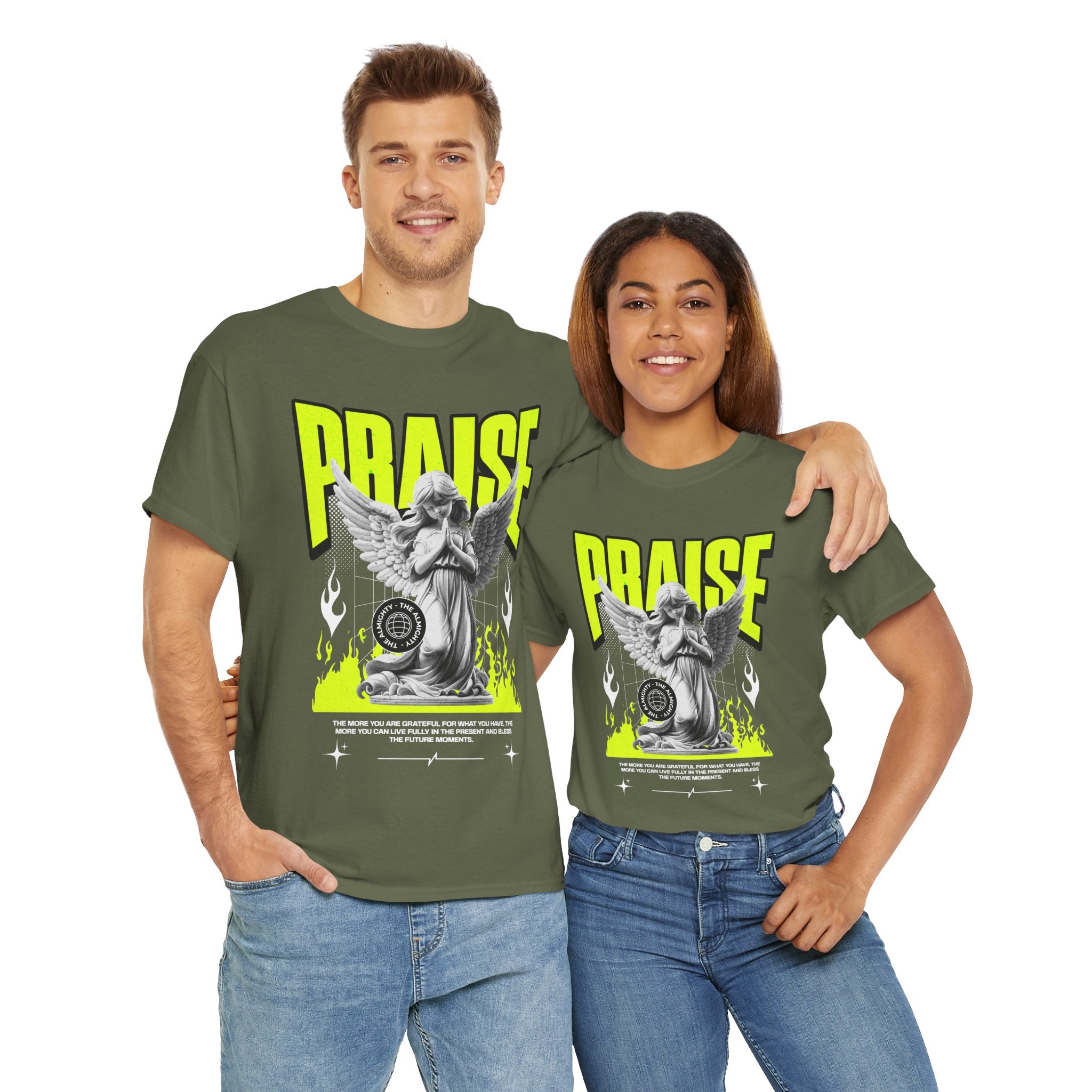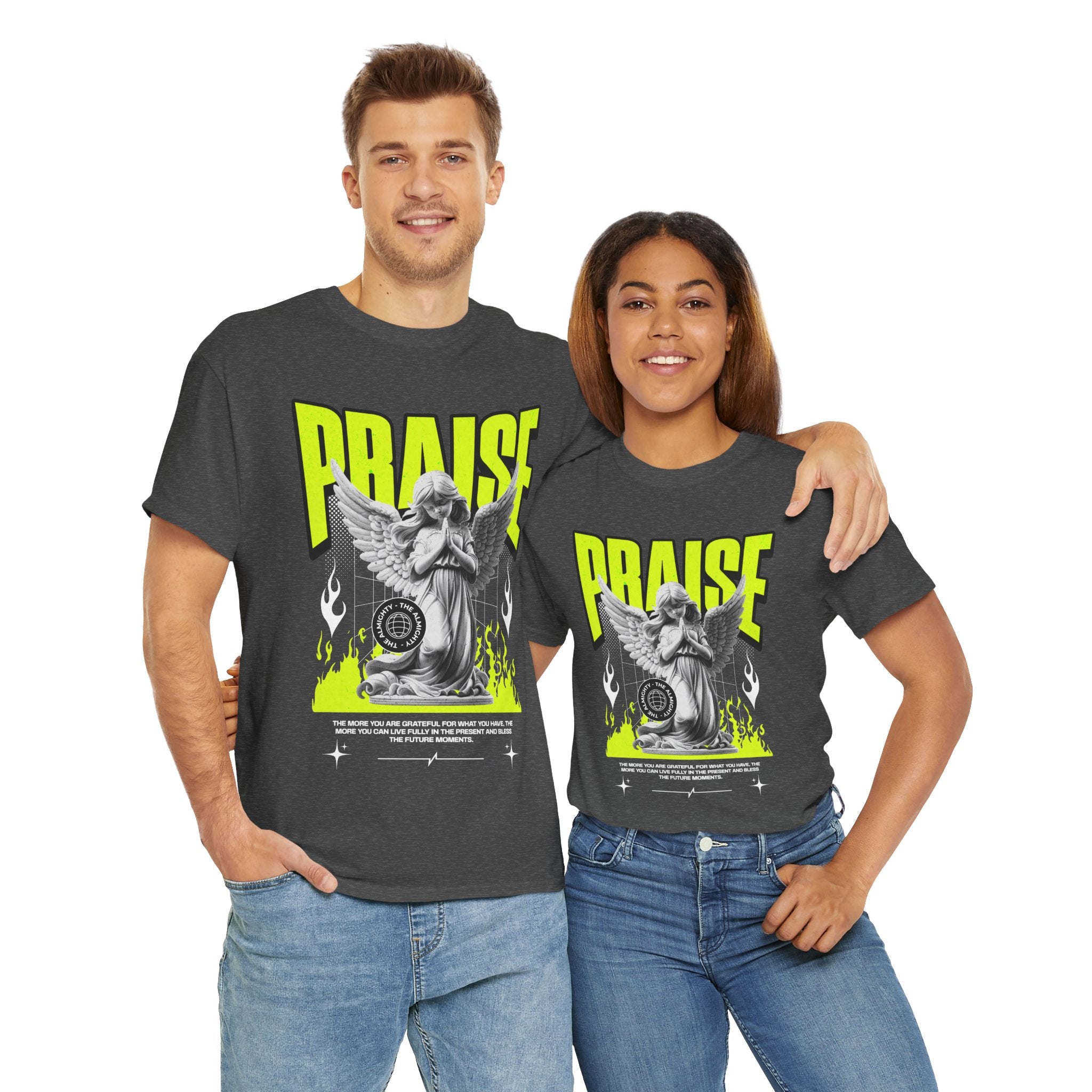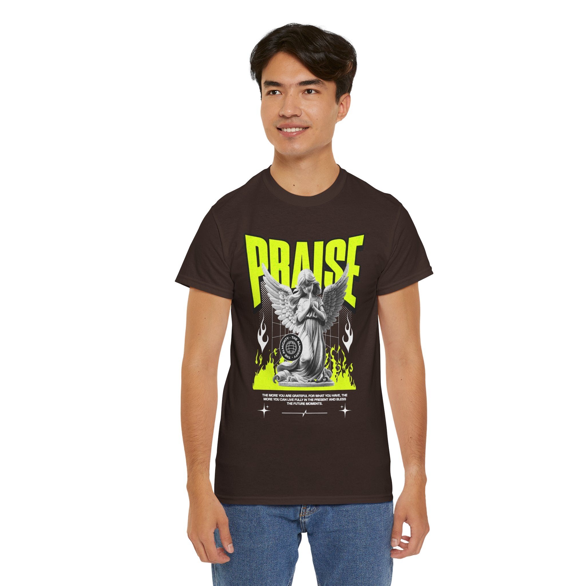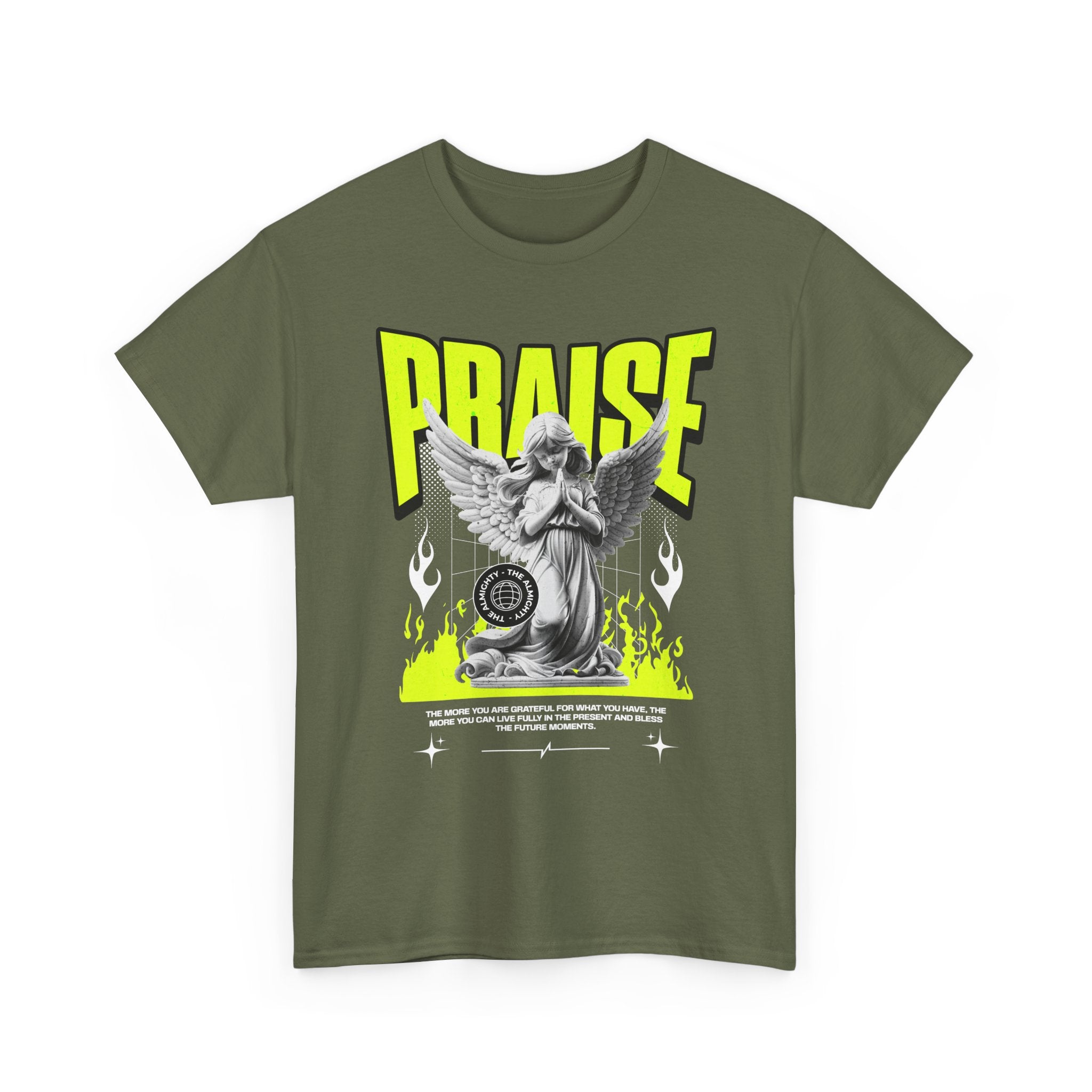 Channel the power of gratitude and bold streetwear style with the Praise Heavy Cotton Tee. Featuring a striking angel statue graphic surrounded by neon flames and modern gothic typography, this tee is more than just clothing – it’s a statement of inner strength, faith, and street-ready confidence.