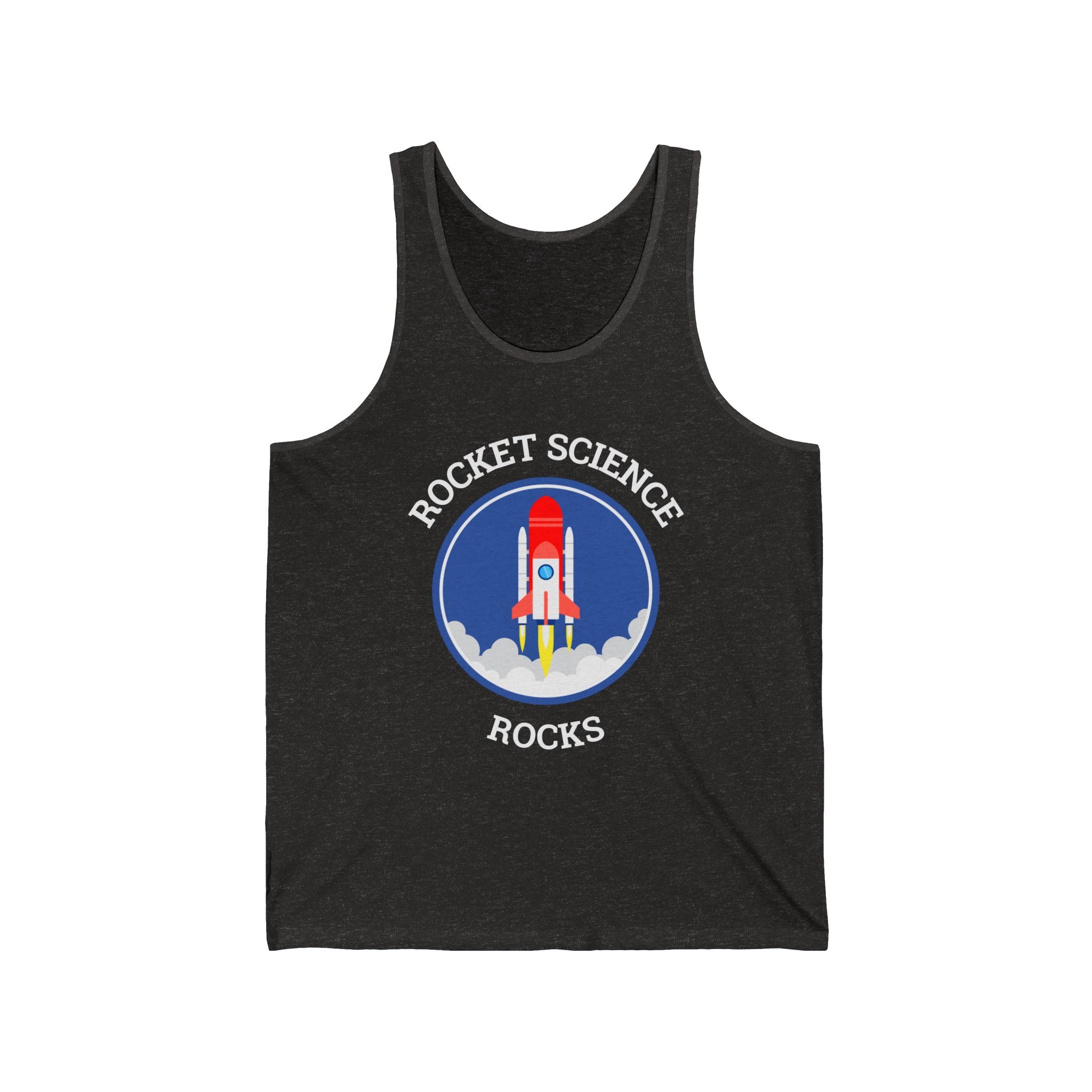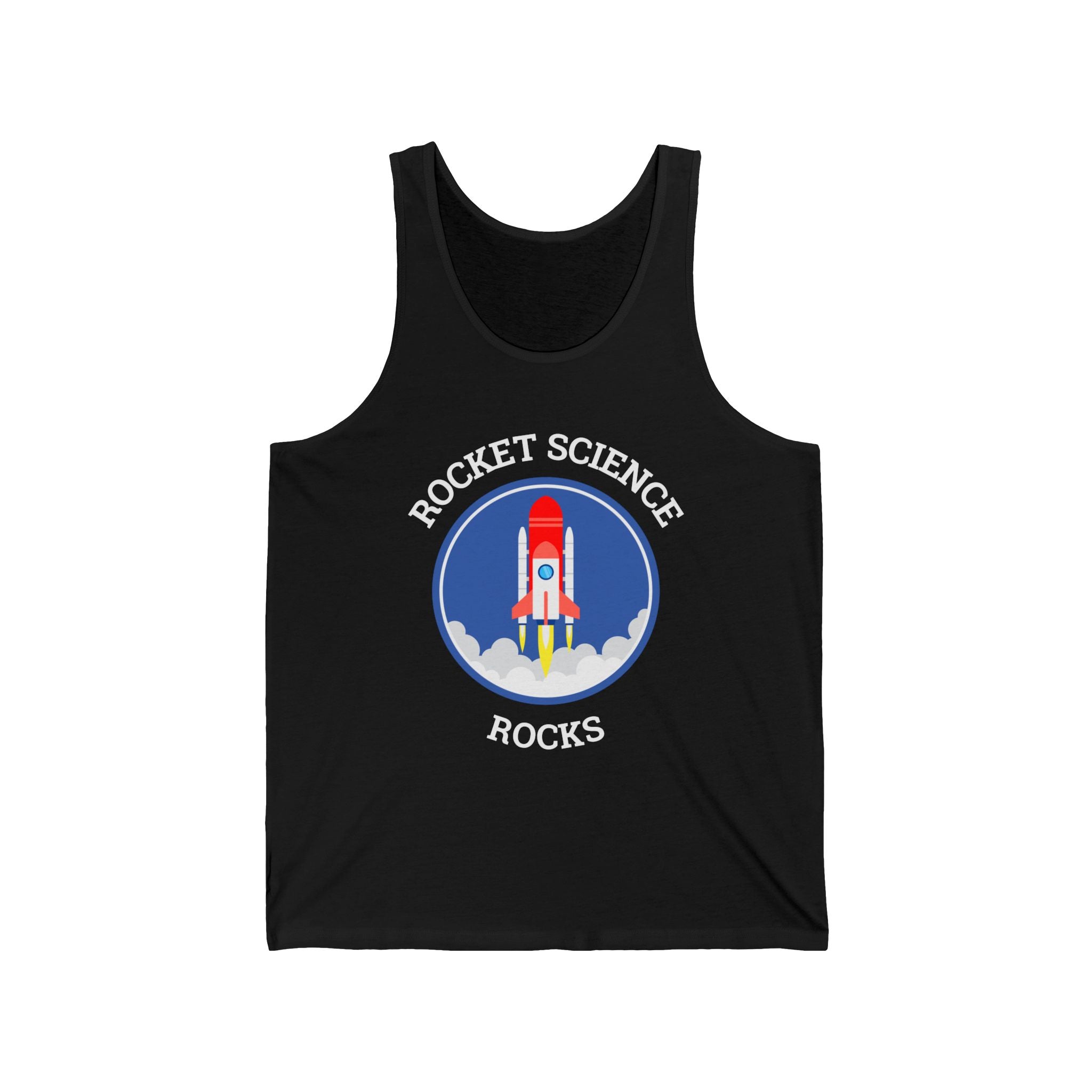 Unisex jersey tank with Rocket Science Rocks rocket design