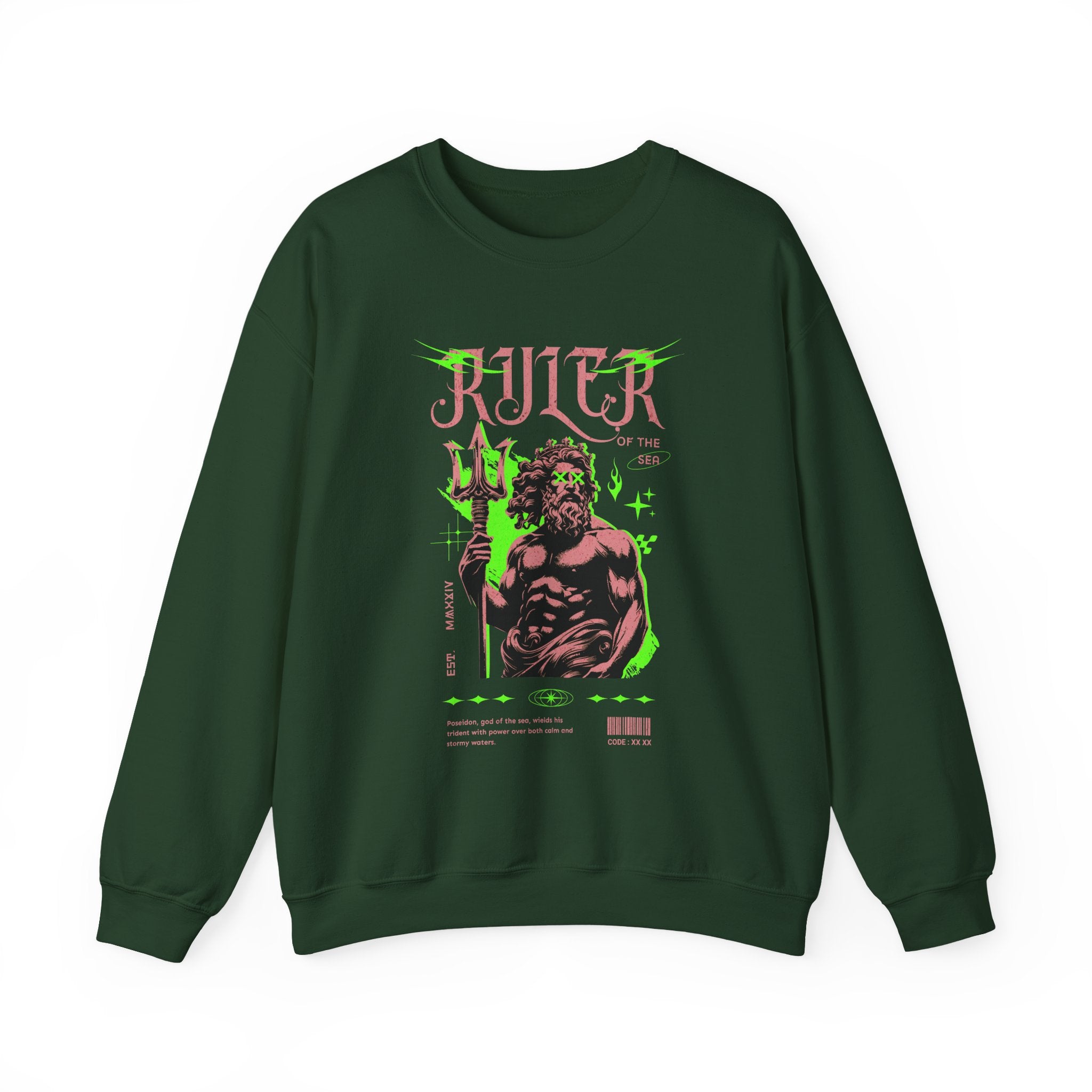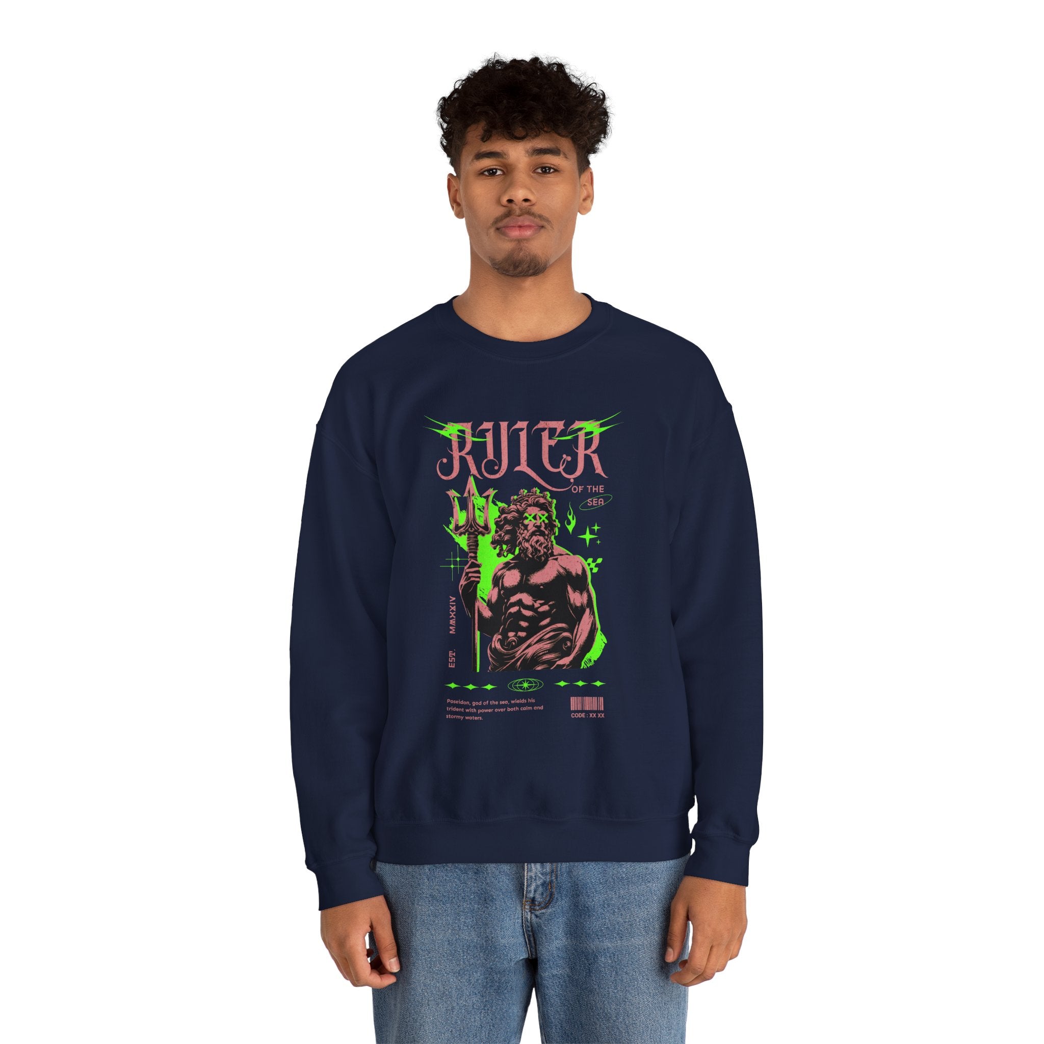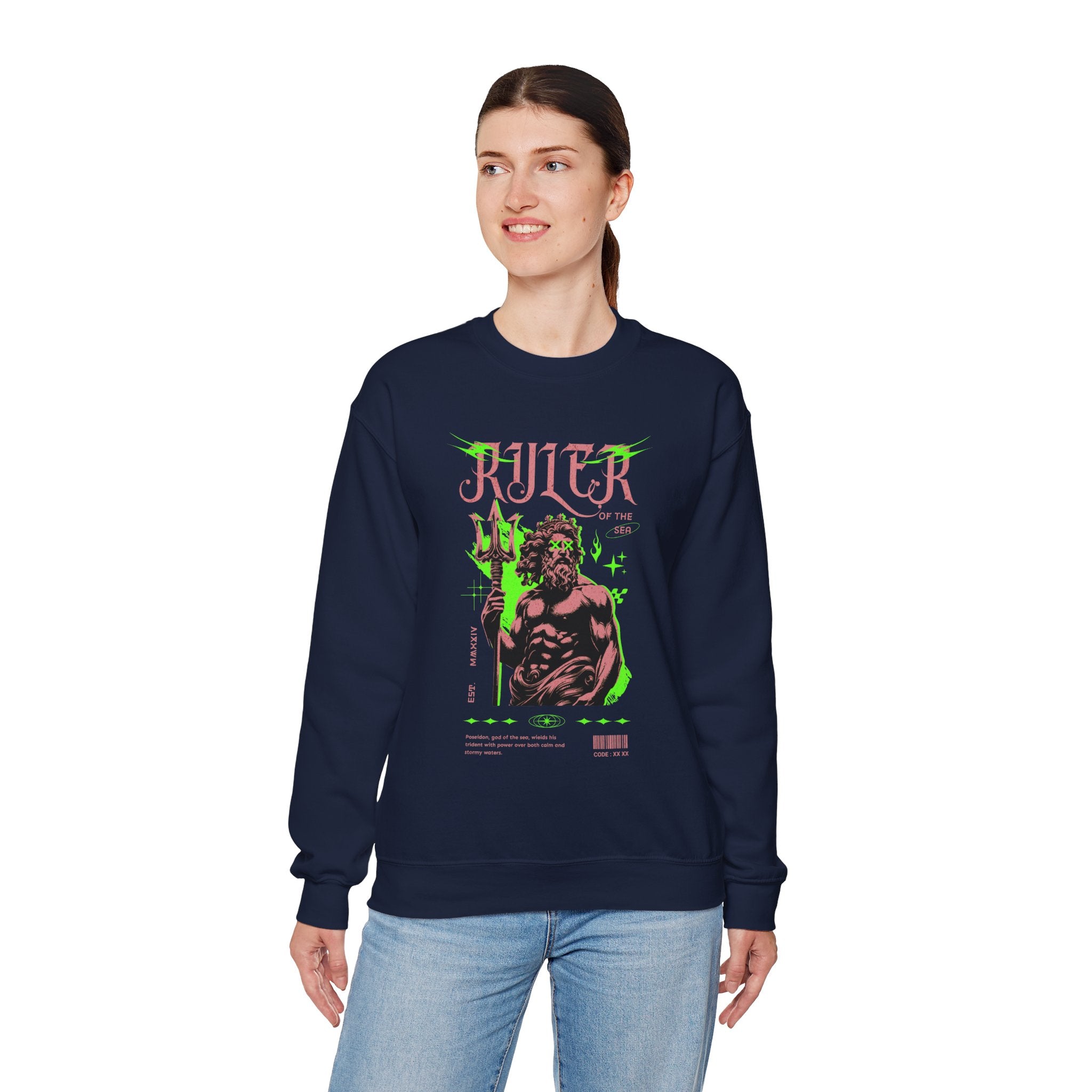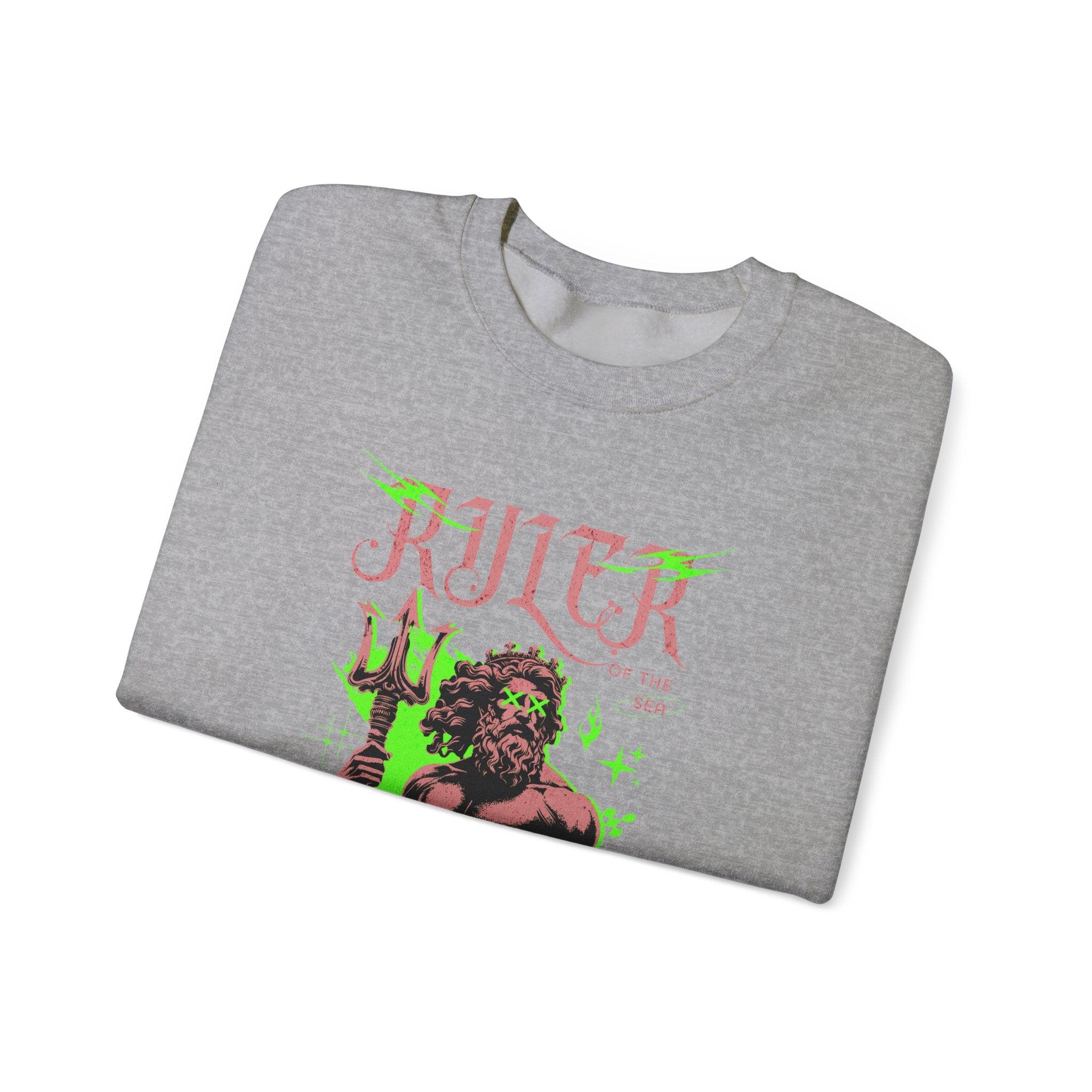 The Ruler of the Sea Unisex Heavy Blend™ Crewneck Sweatshirt captures the power of Poseidon, god of the oceans, with a statuesque graphic in gothic style accented with neon green and pink highlights. This bold pullover fuses mythology, art, and streetwear, creating a wearable symbol of dominance, mystery, and resilience.