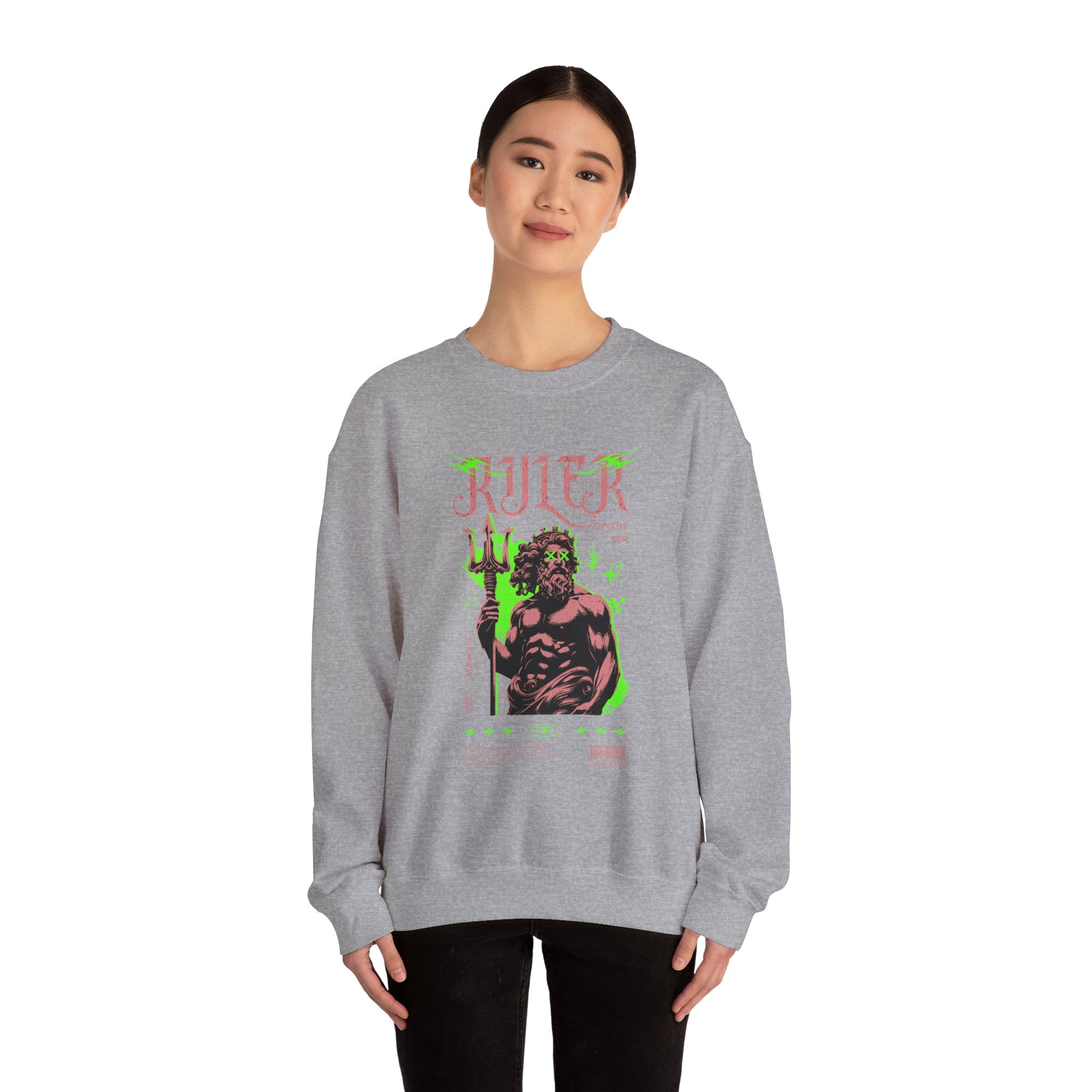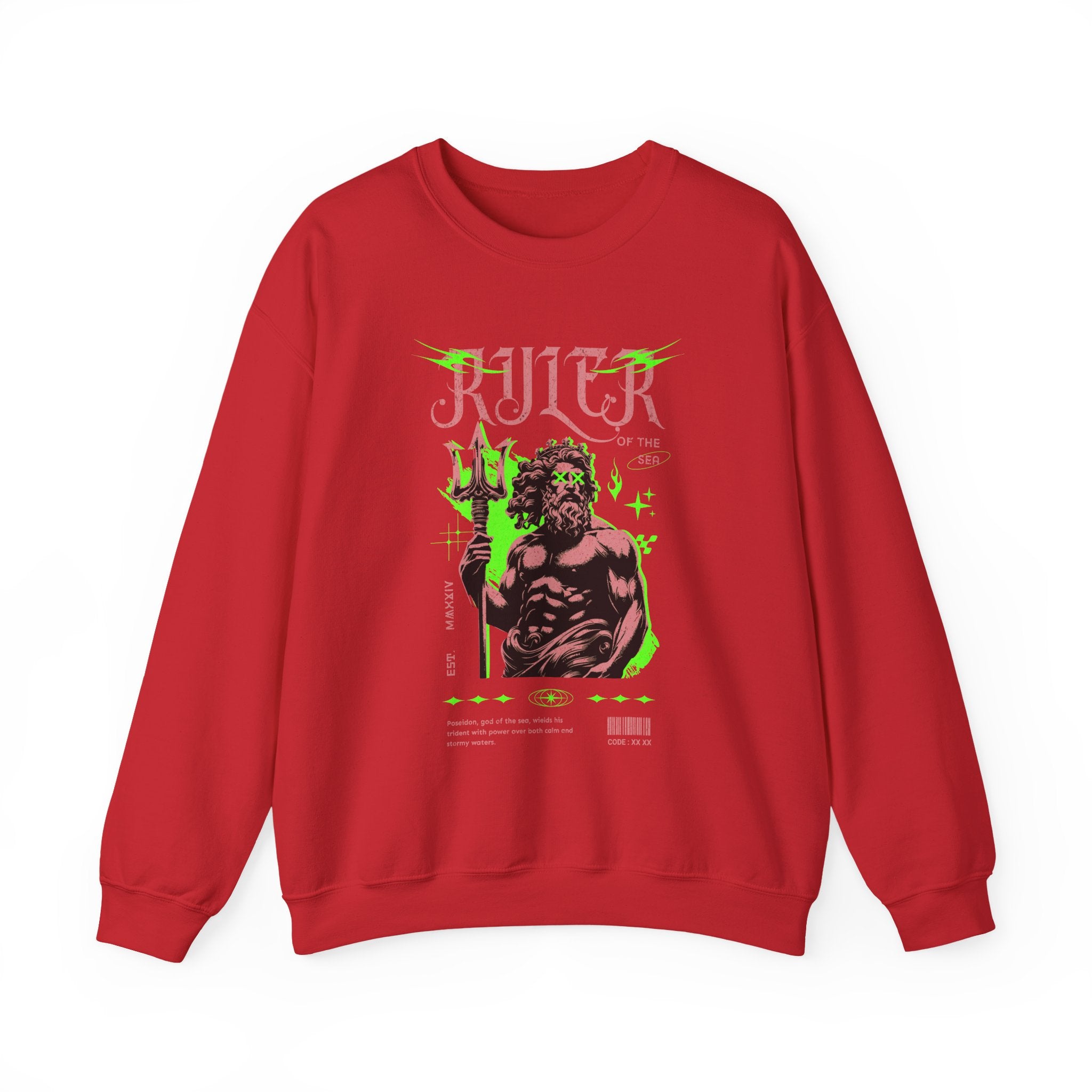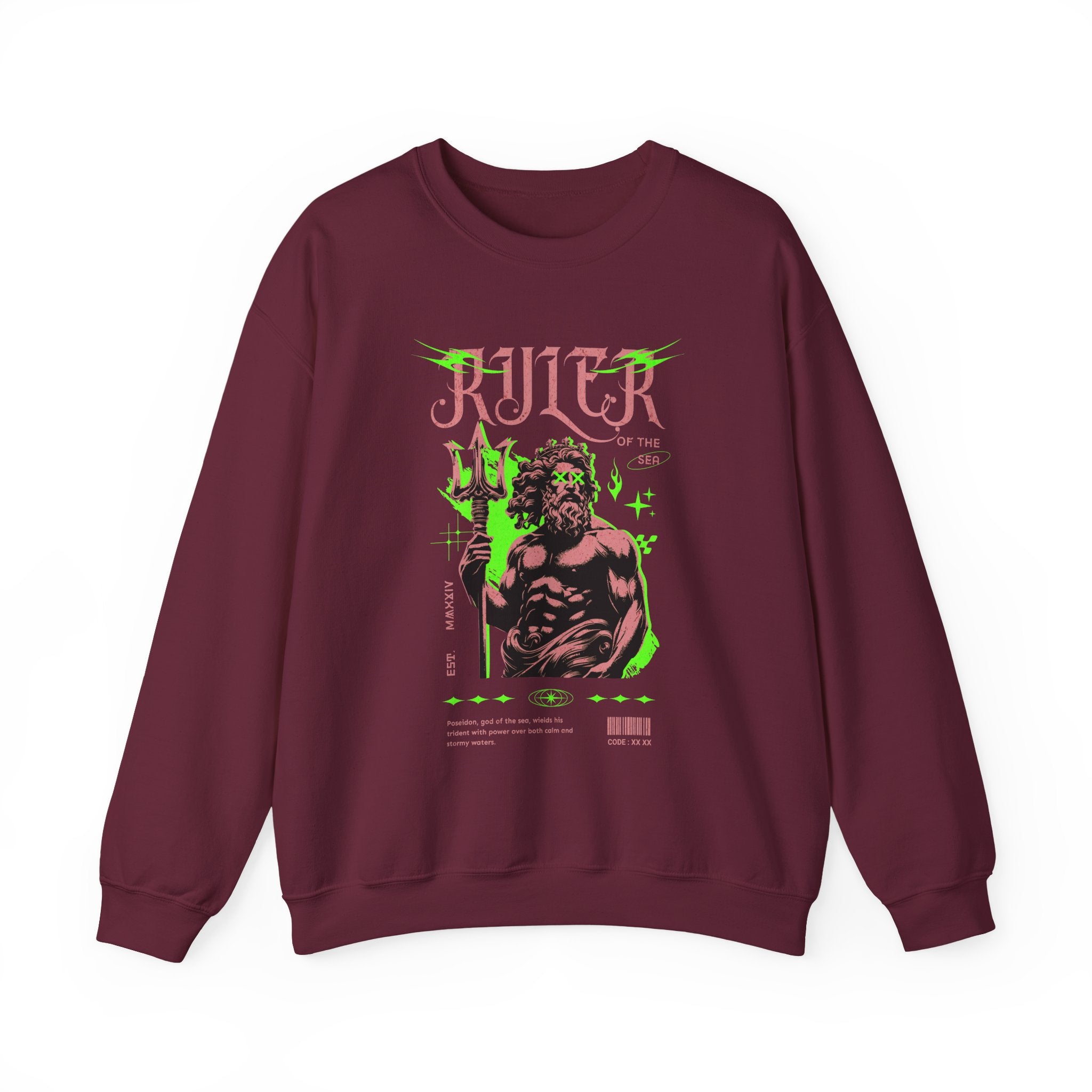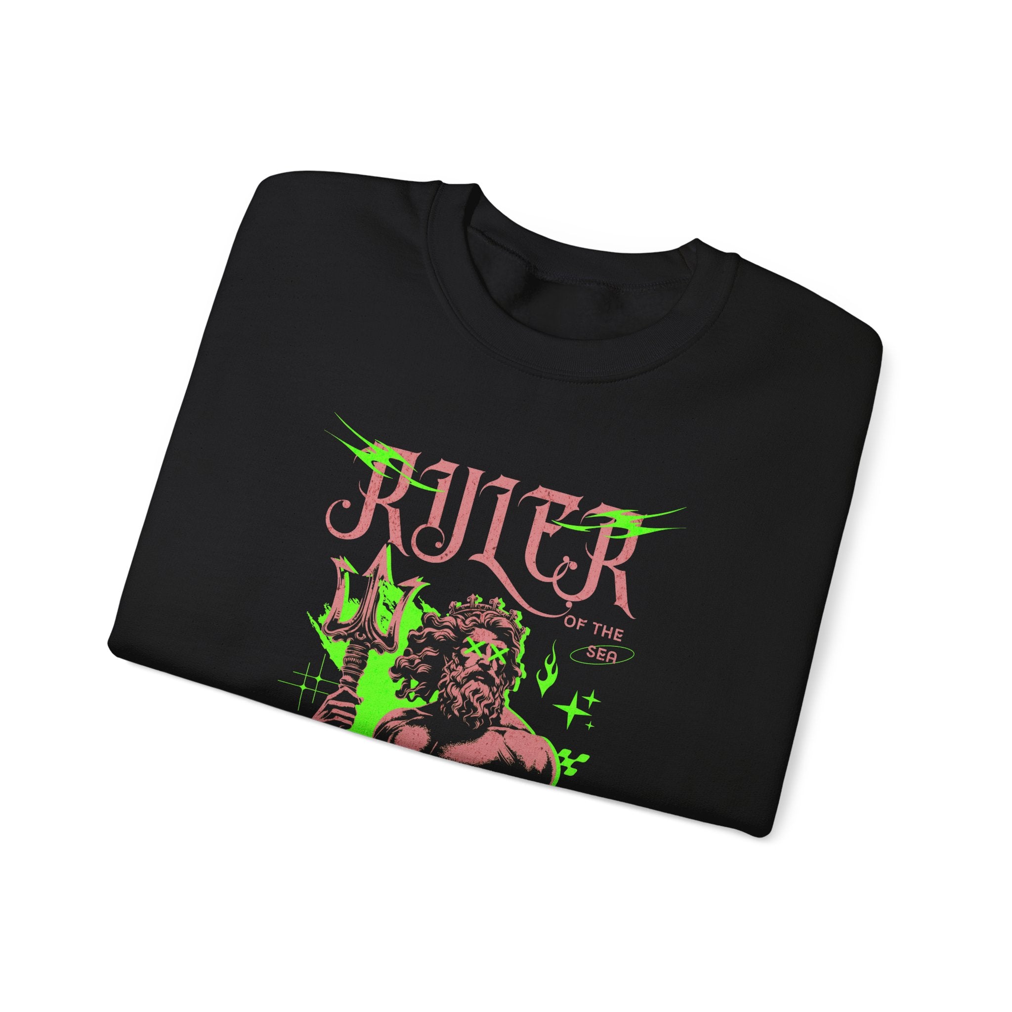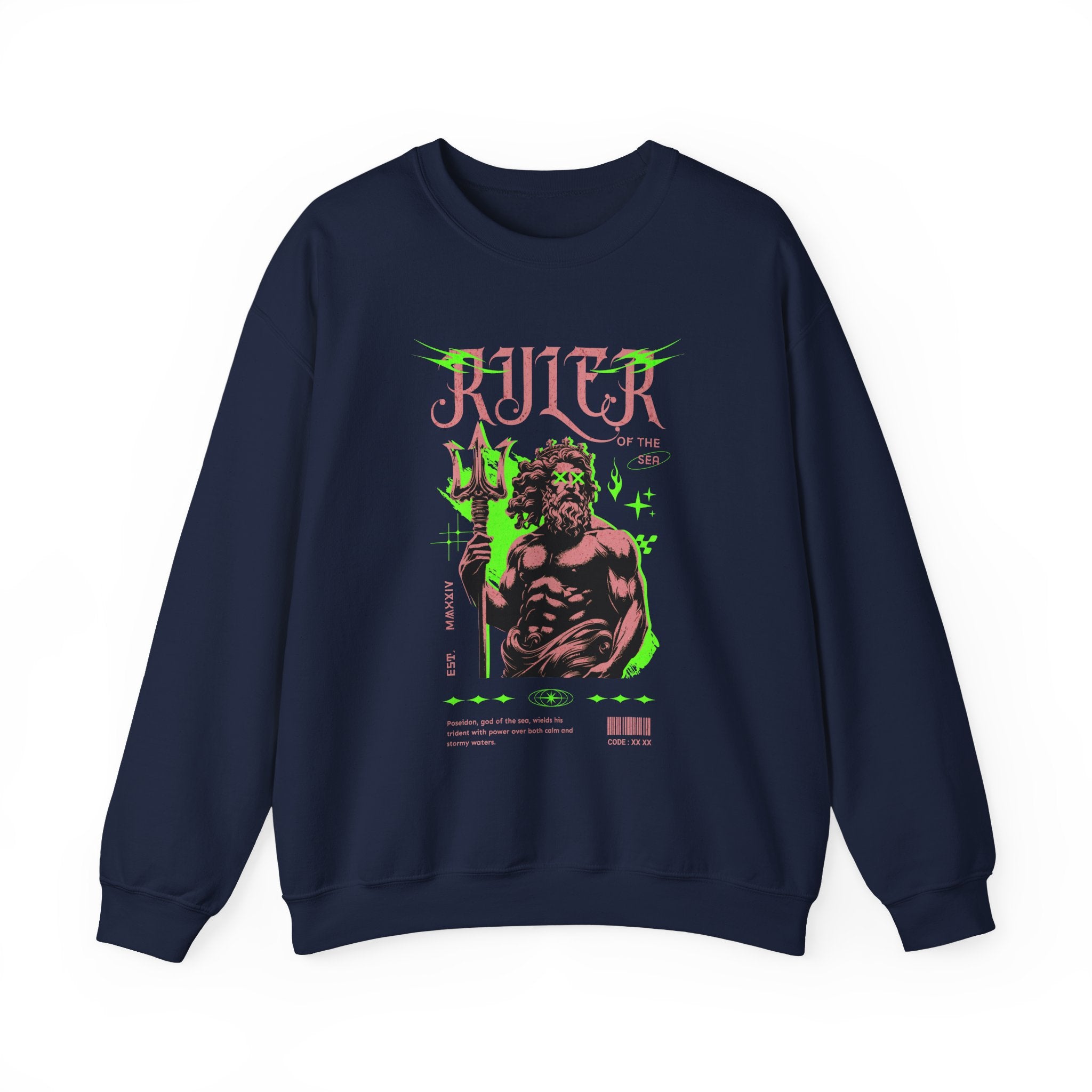 The Ruler of the Sea Unisex Heavy Blend™ Crewneck Sweatshirt captures the power of Poseidon, god of the oceans, with a statuesque graphic in gothic style accented with neon green and pink highlights. This bold pullover fuses mythology, art, and streetwear, creating a wearable symbol of dominance, mystery, and resilience.