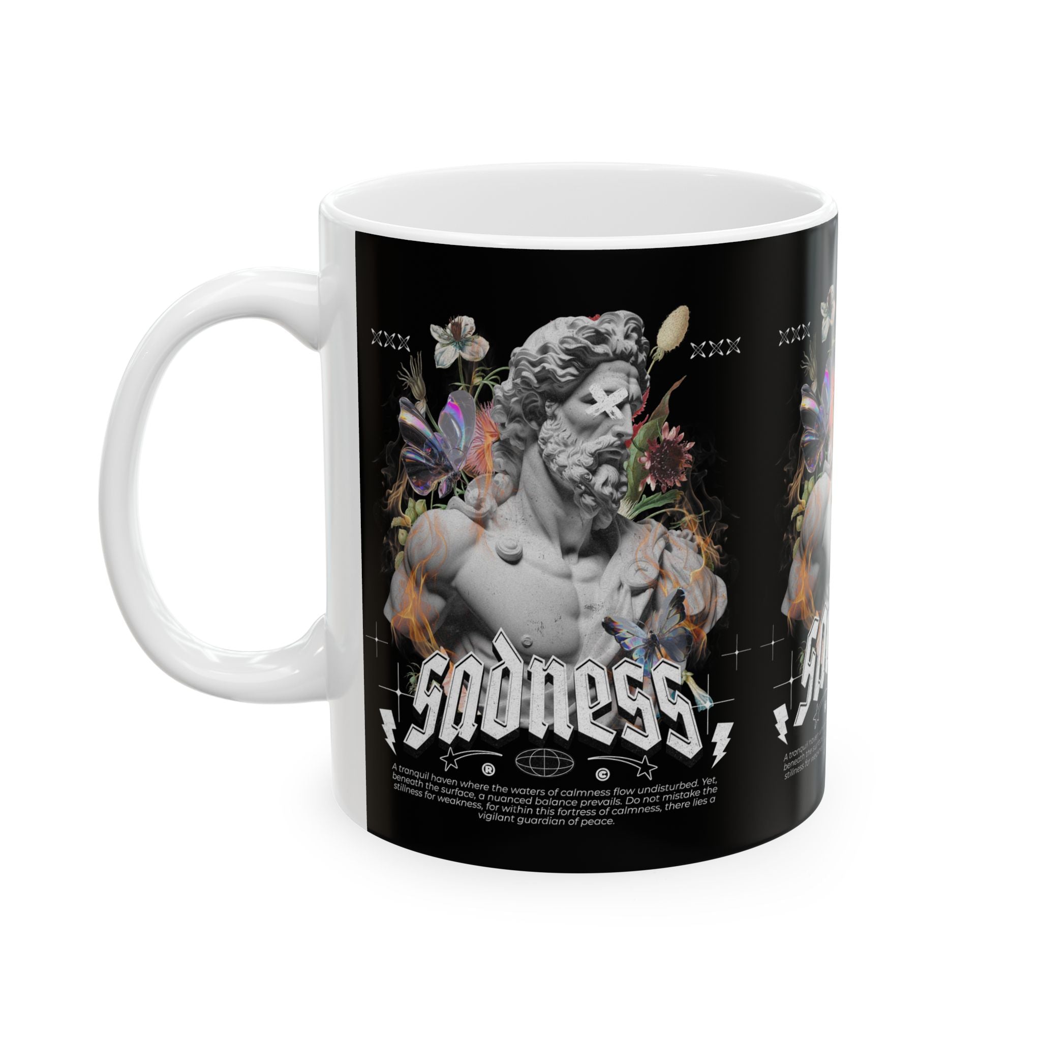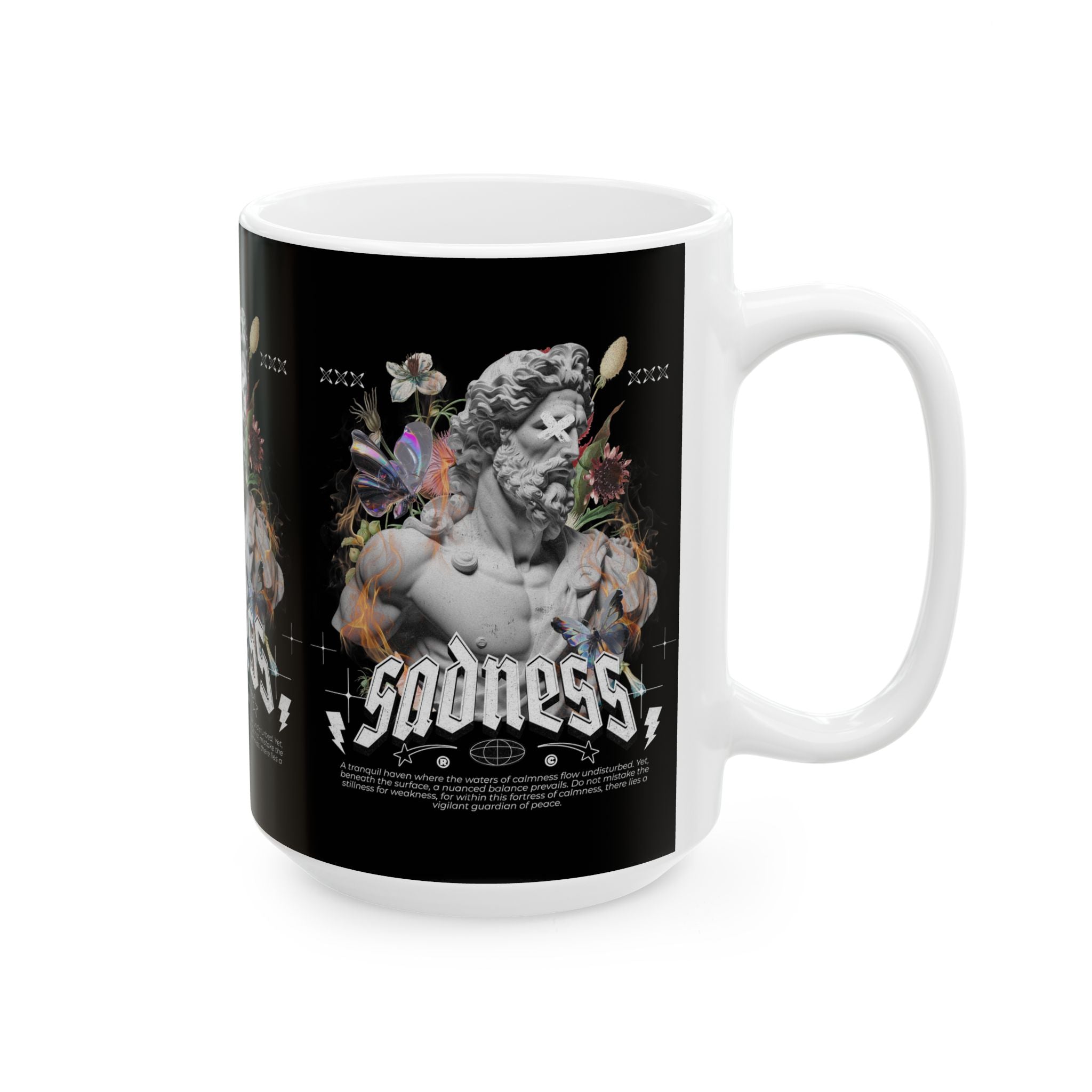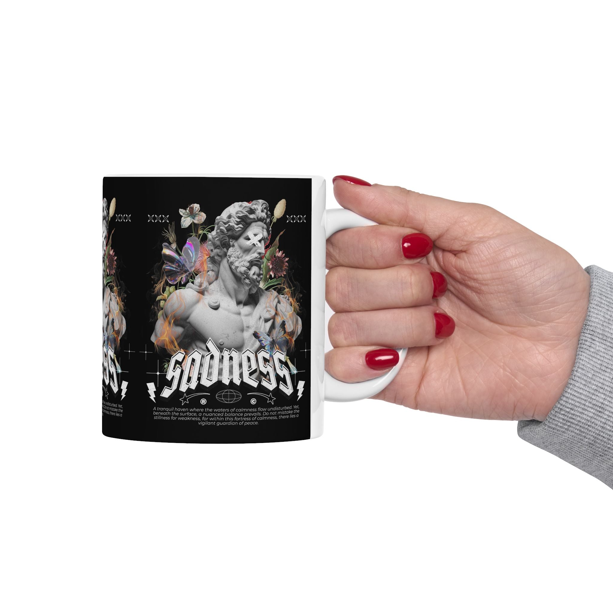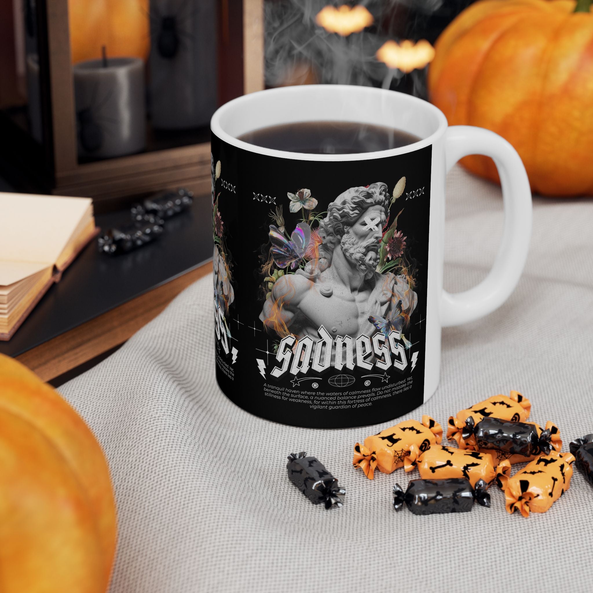 Bring art, expression, and style into your daily routine with the Sadness Ceramic Mug. Featuring a bold Greek statue surrounded by surreal butterflies, flowers, flames, and gothic typography, this mug is a piece of art you can use every day.