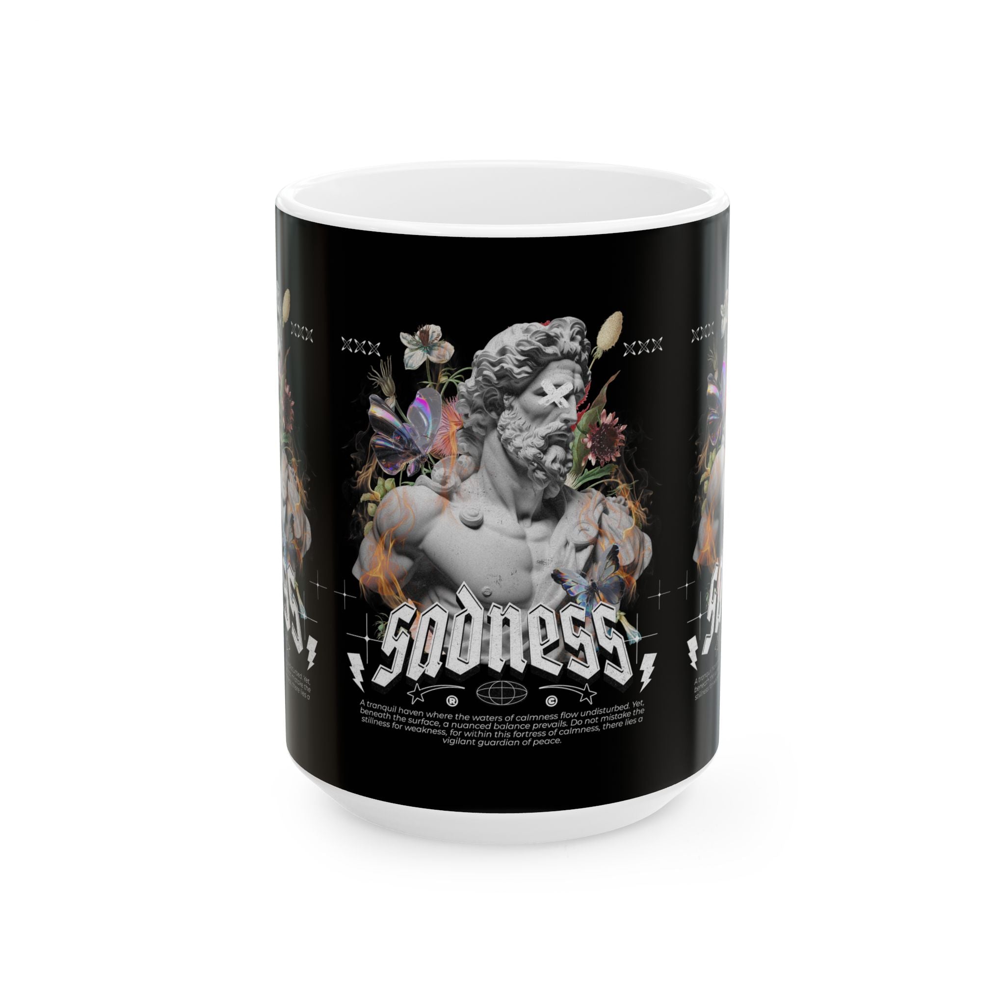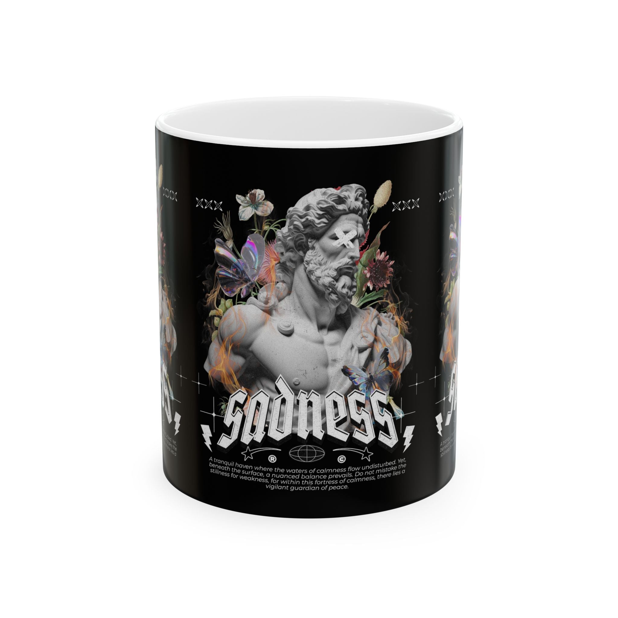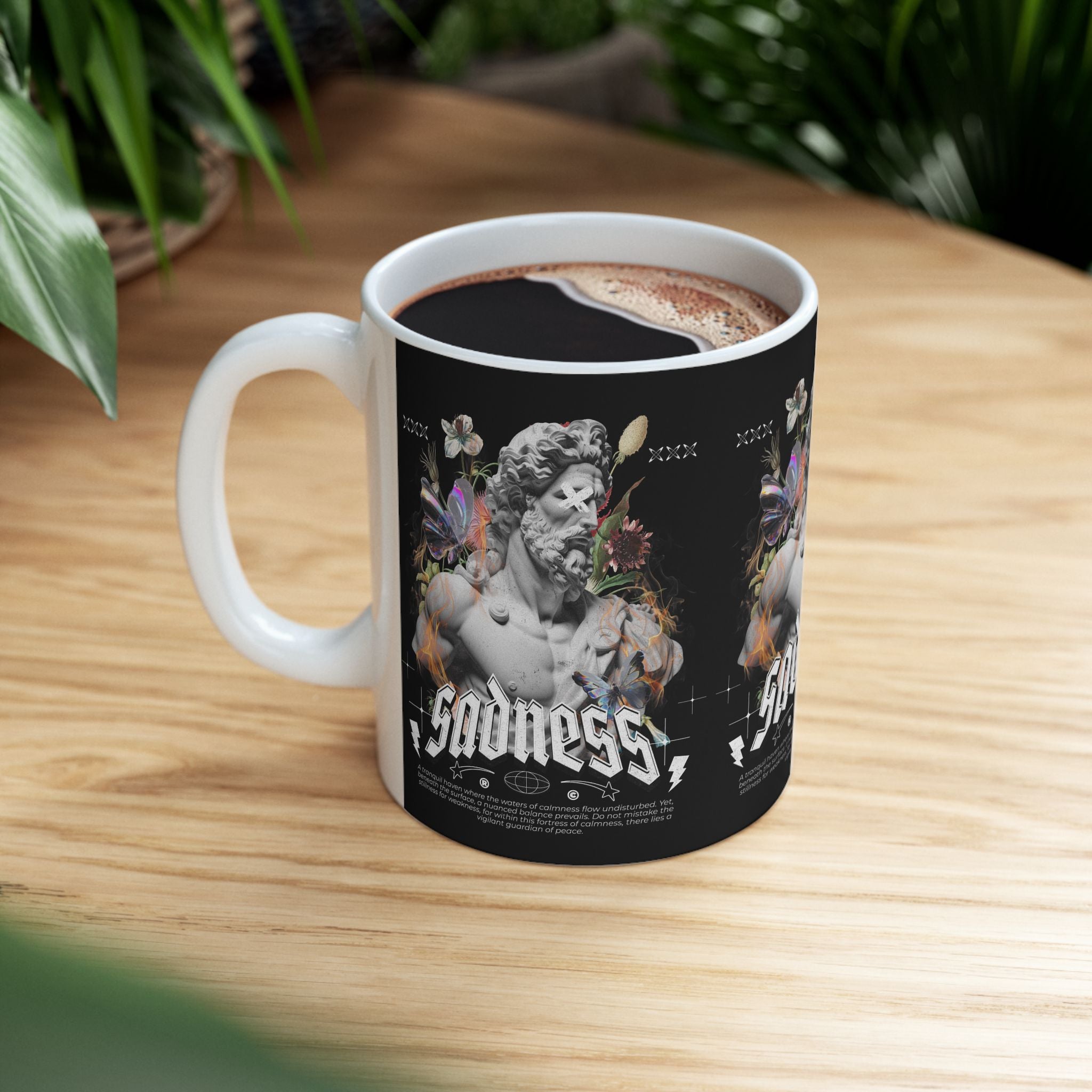 Bring art, expression, and style into your daily routine with the Sadness Ceramic Mug. Featuring a bold Greek statue surrounded by surreal butterflies, flowers, flames, and gothic typography, this mug is a piece of art you can use every day.