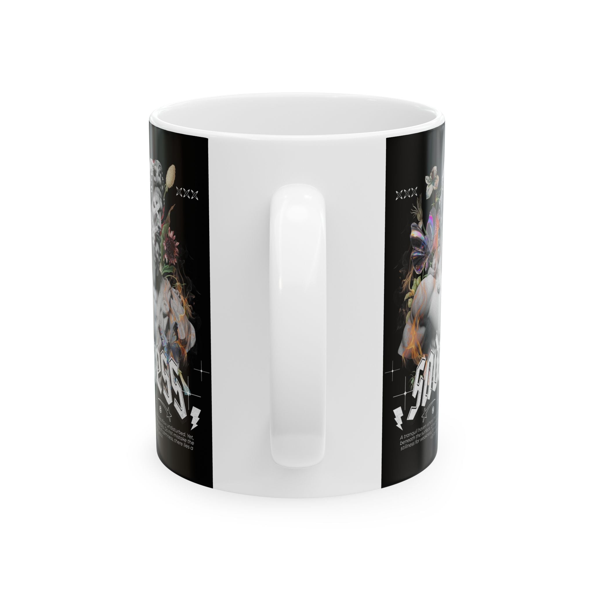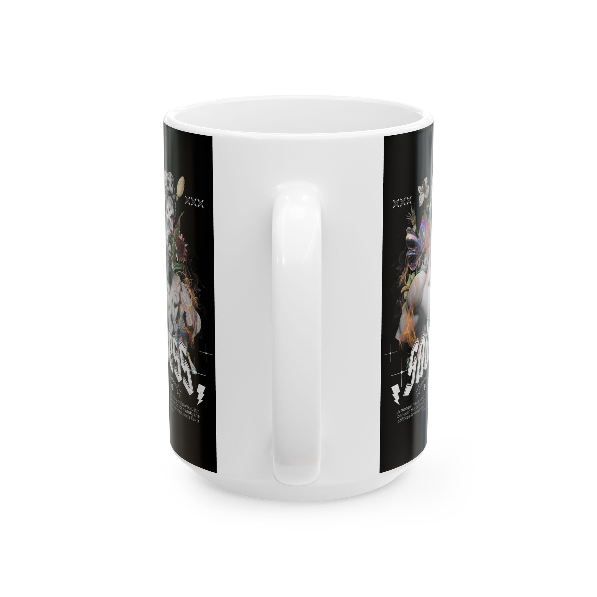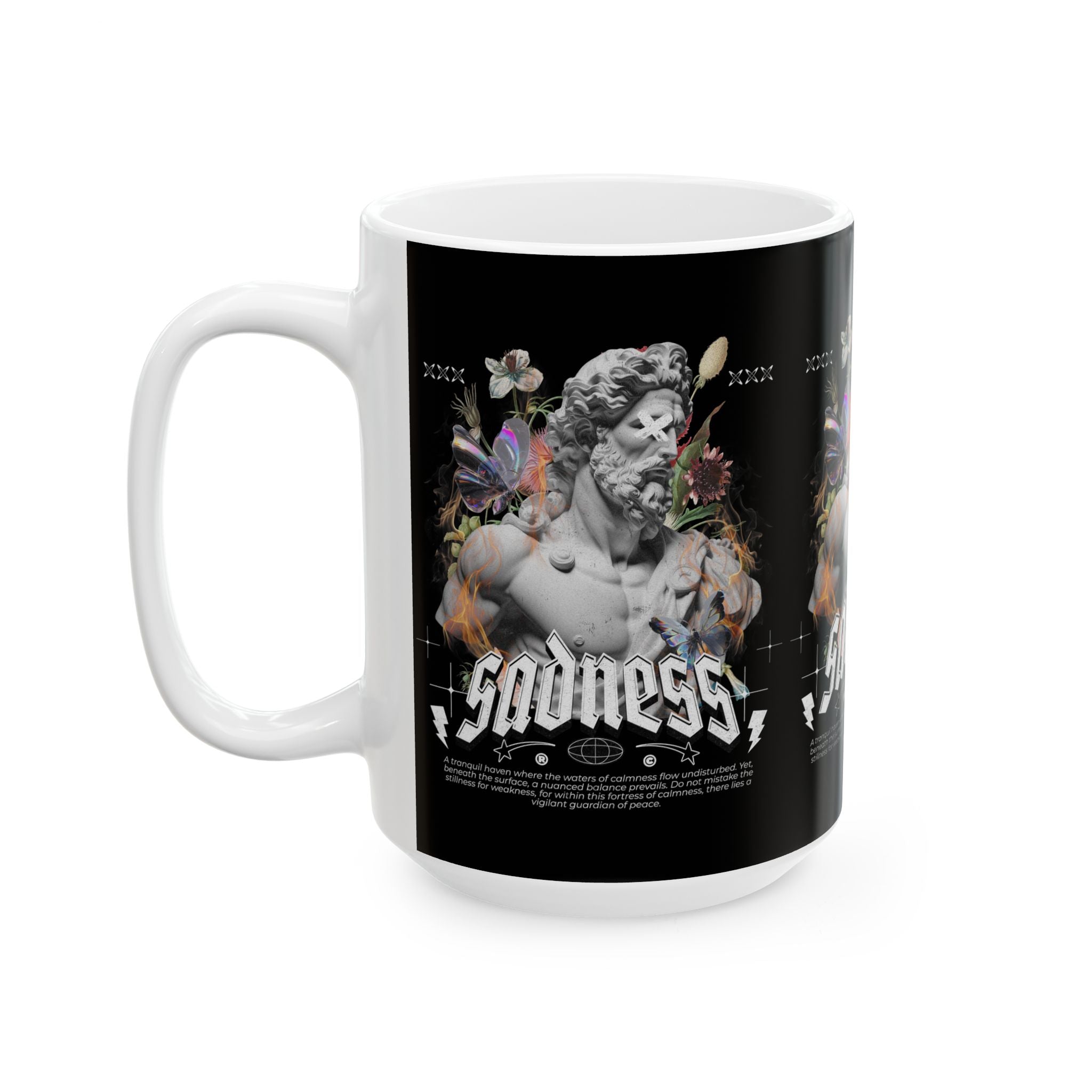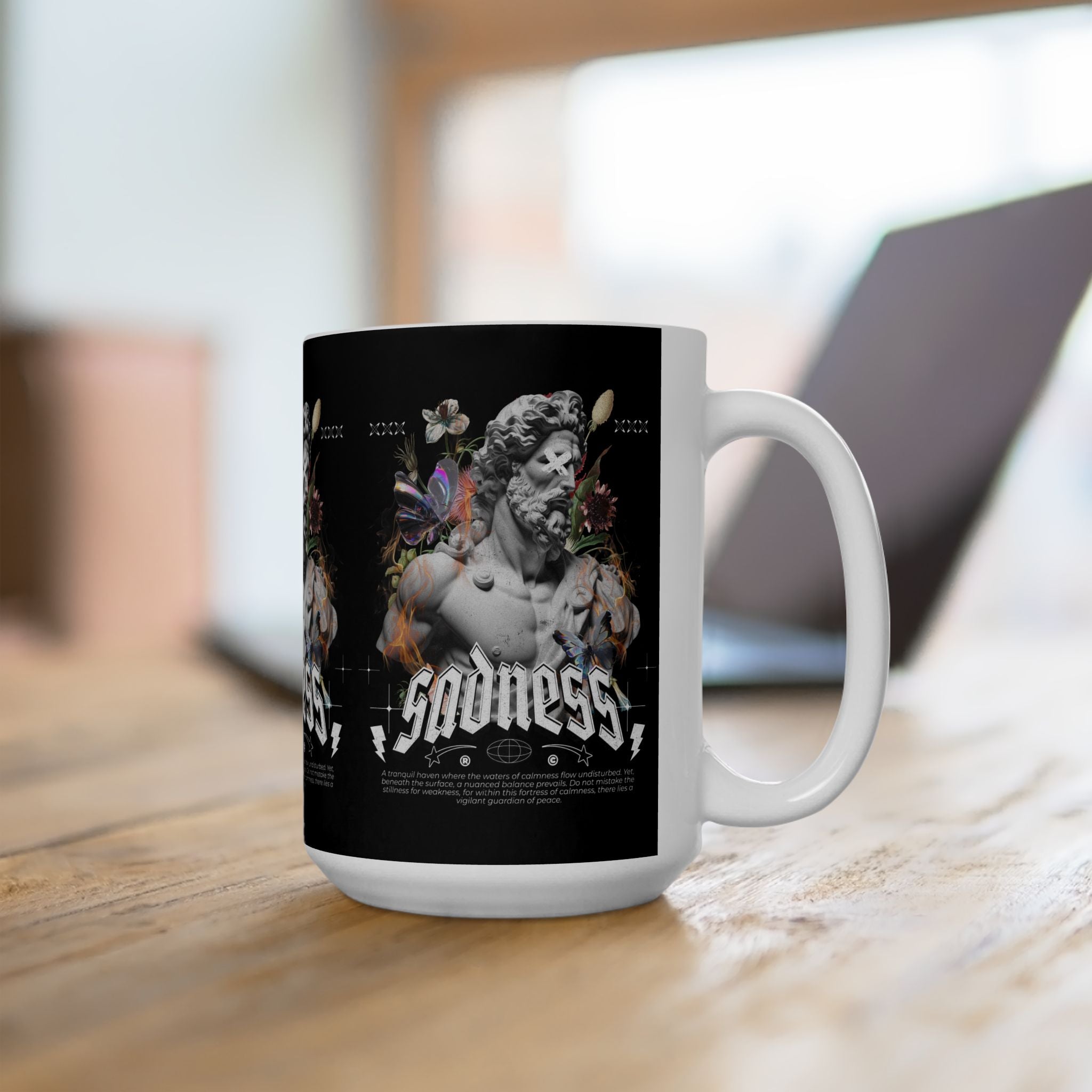 Bring art, expression, and style into your daily routine with the Sadness Ceramic Mug. Featuring a bold Greek statue surrounded by surreal butterflies, flowers, flames, and gothic typography, this mug is a piece of art you can use every day.