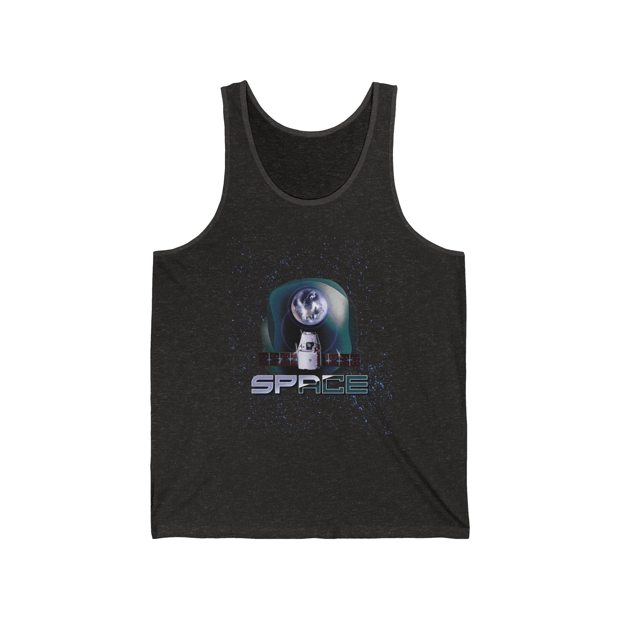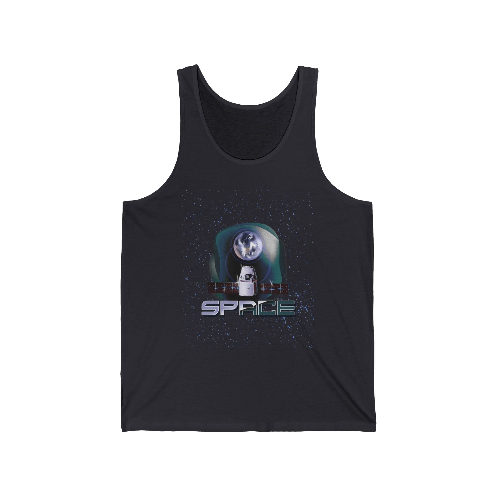 Unisex jersey tank with galaxy, Earth, and spaceship graphic