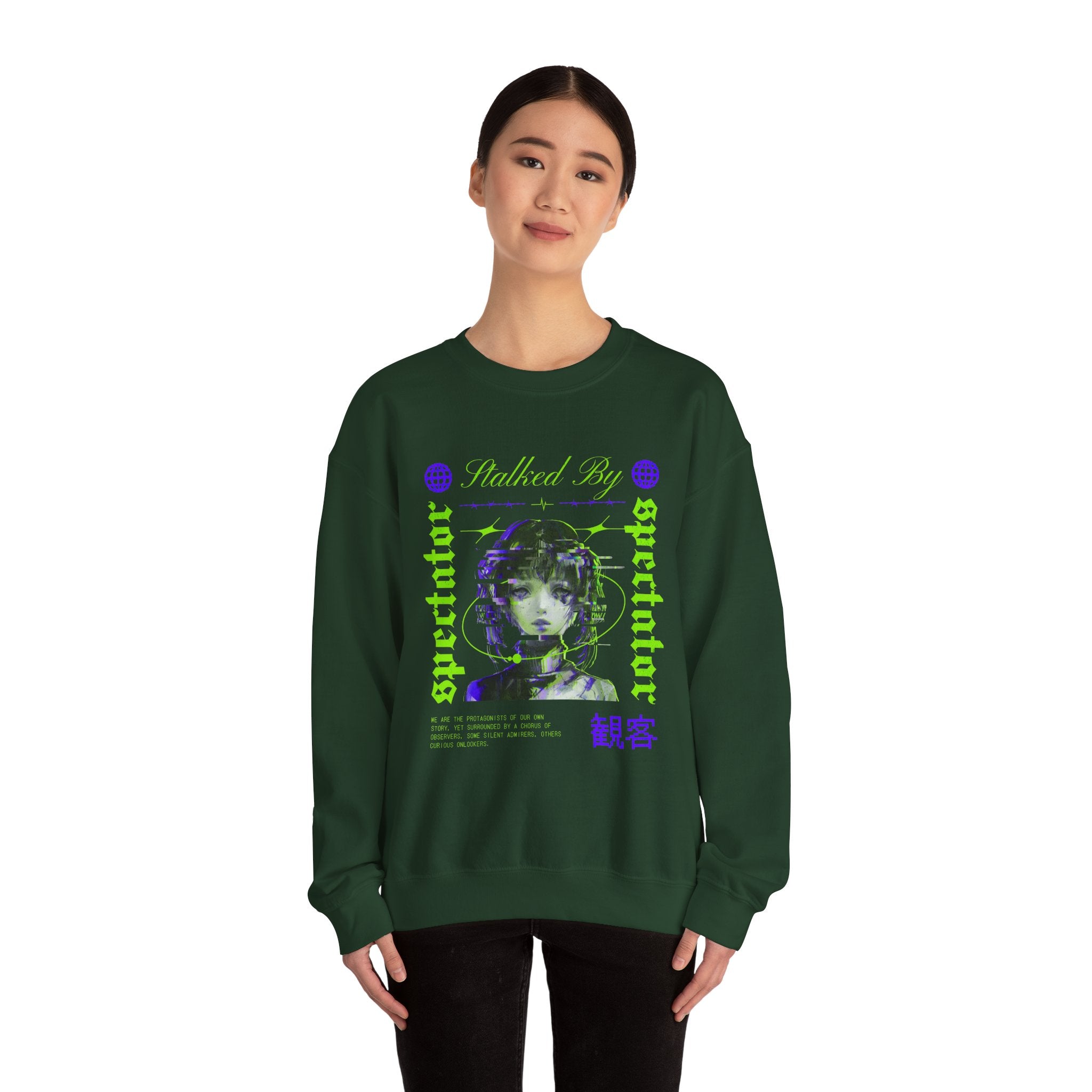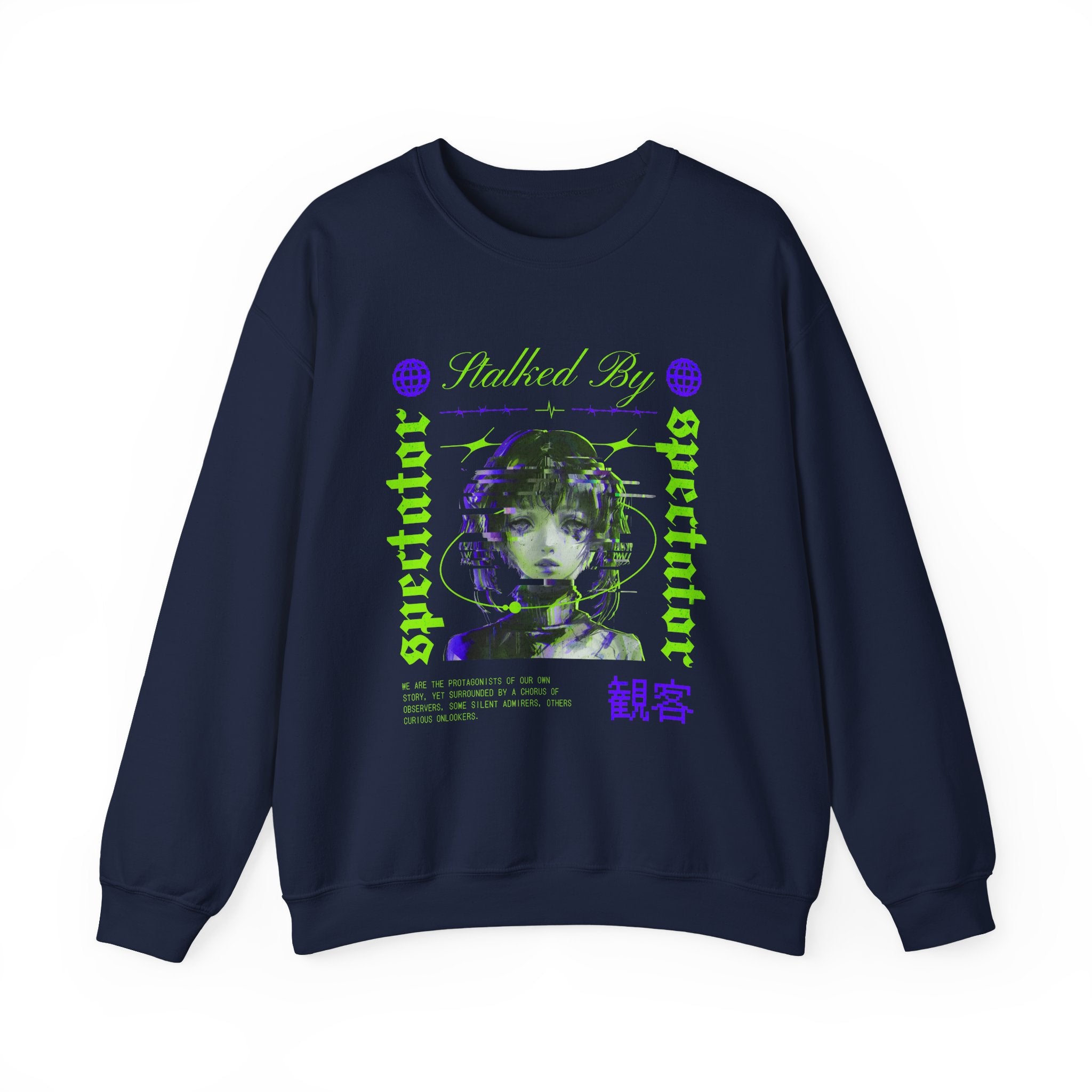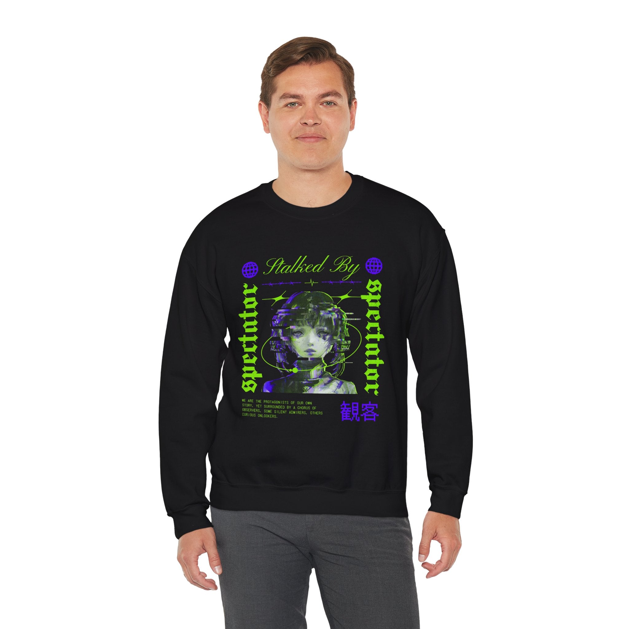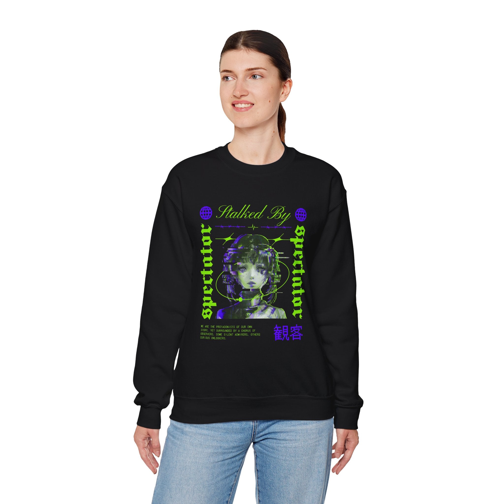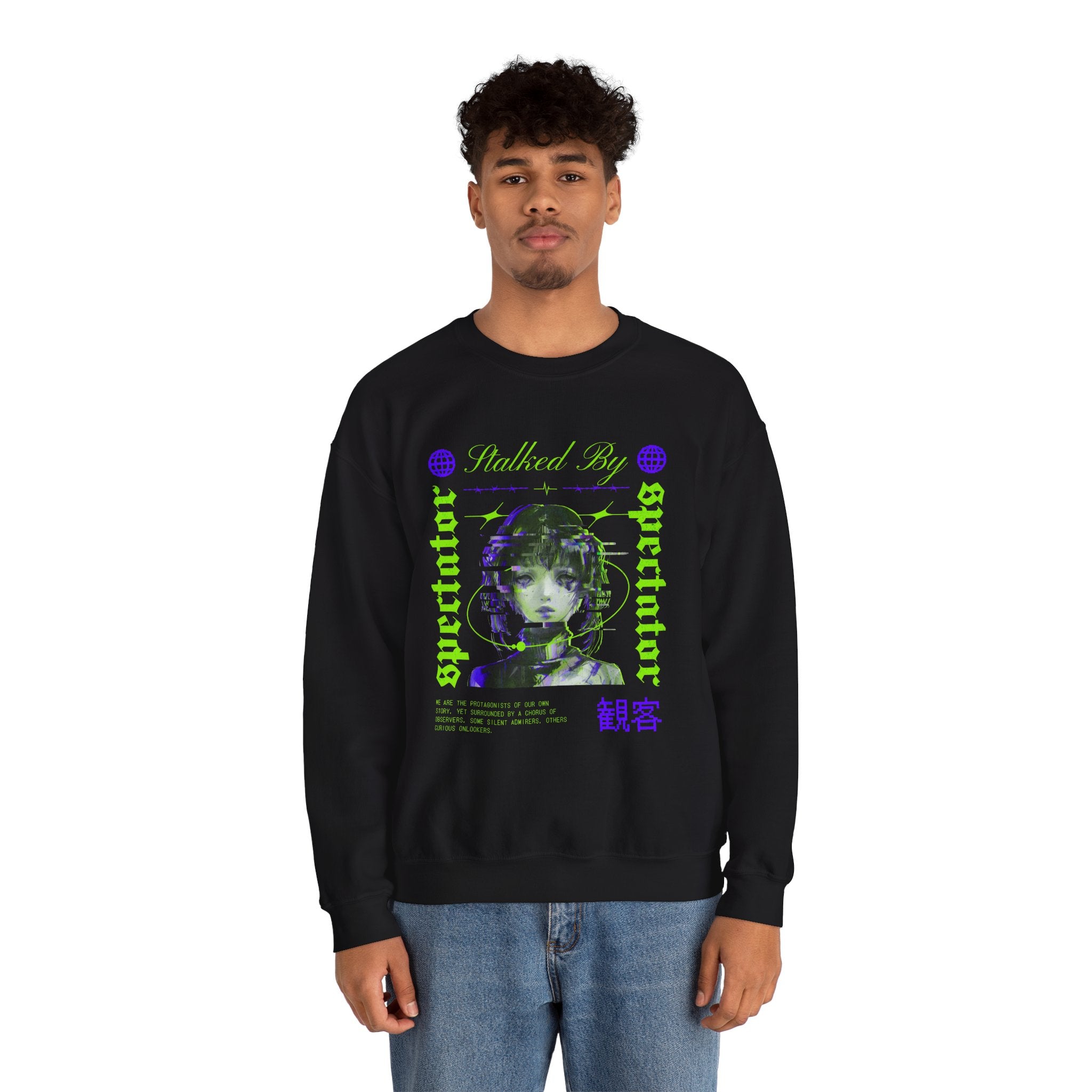 Step into the world of neon lights and glitch aesthetics with the Stalked By Spectator Crewneck Sweatshirt. Featuring a cyberpunk anime character design, layered with neon green glitch art, purple futuristic overlays, and Japanese kanji, this pullover reflects the feeling of being observed in a hyperconnected world.