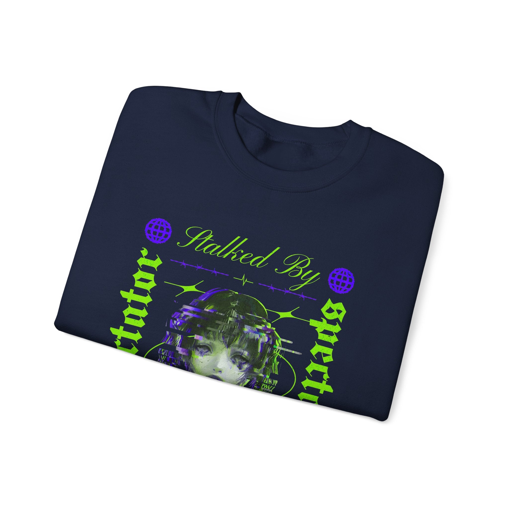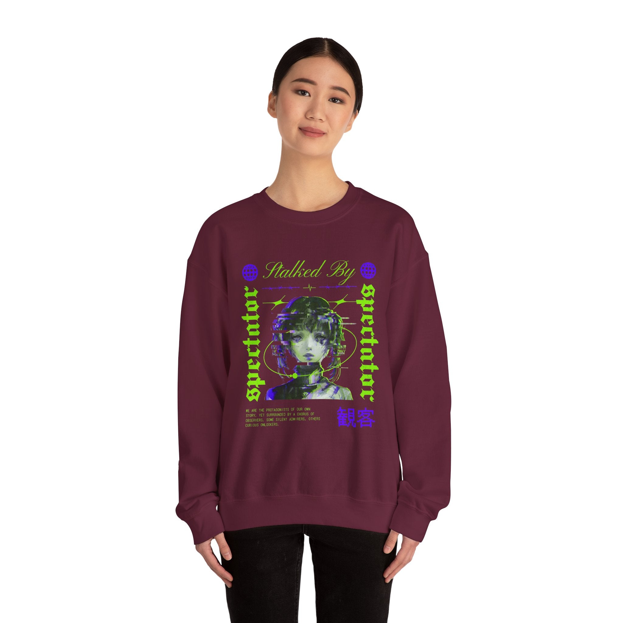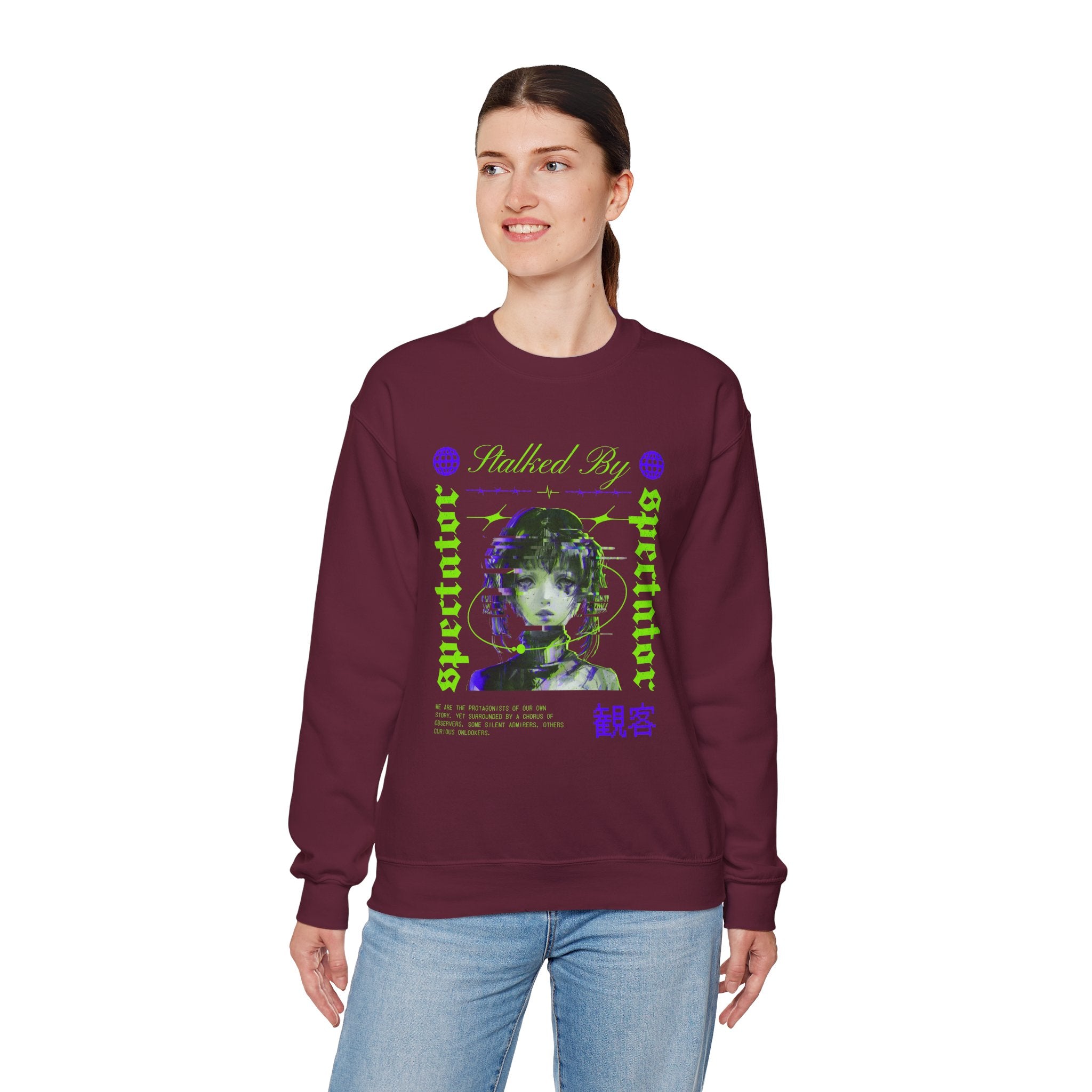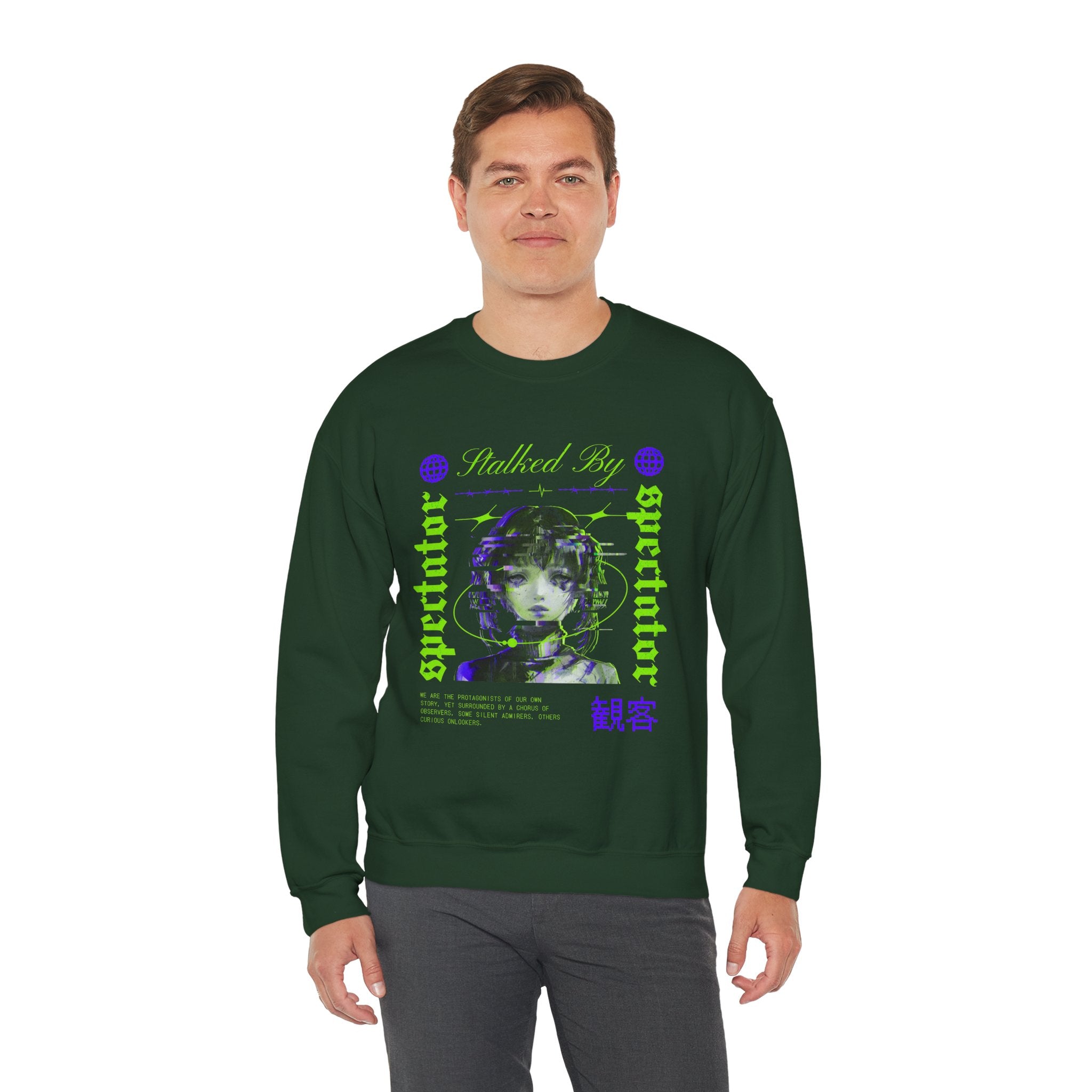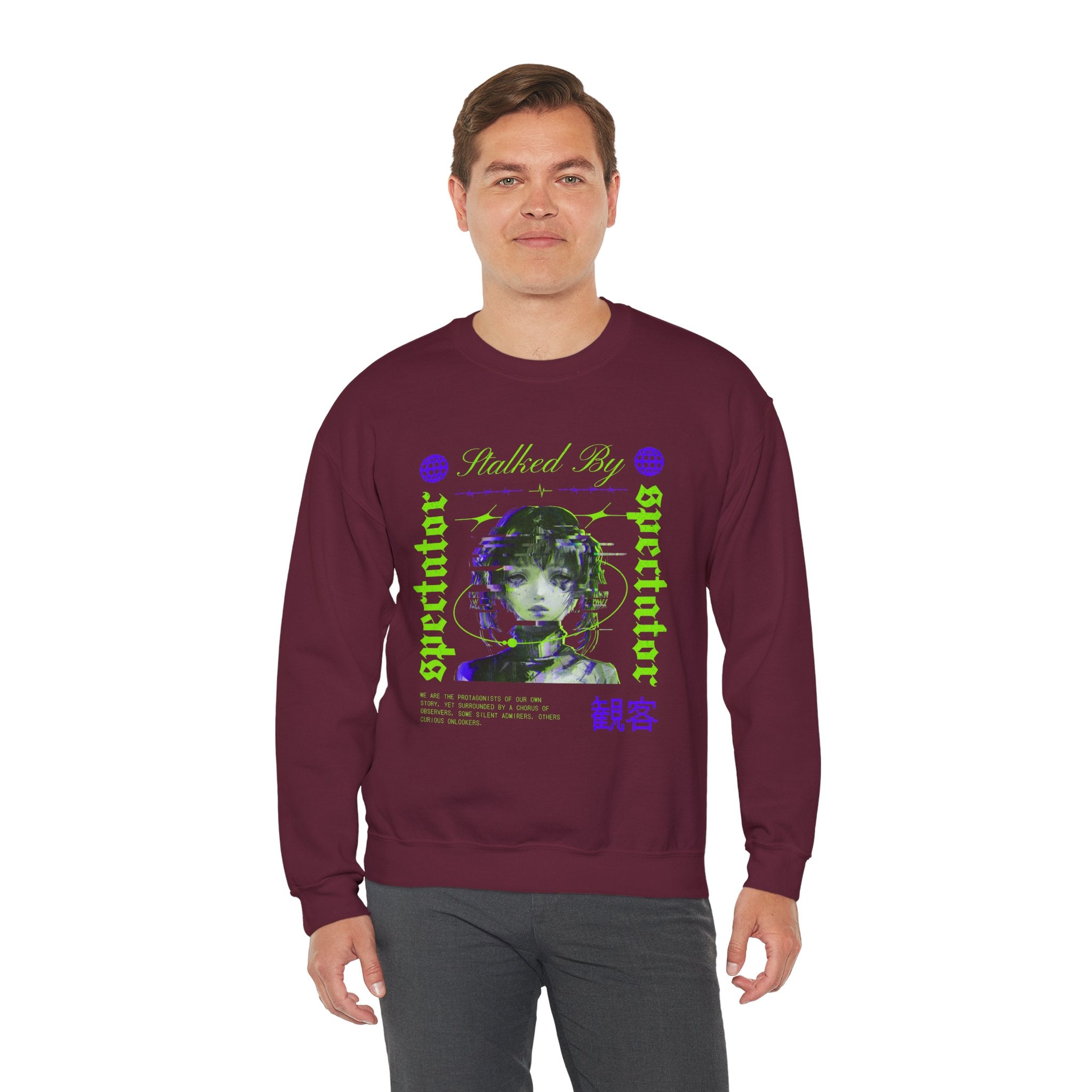 Step into the world of neon lights and glitch aesthetics with the Stalked By Spectator Crewneck Sweatshirt. Featuring a cyberpunk anime character design, layered with neon green glitch art, purple futuristic overlays, and Japanese kanji, this pullover reflects the feeling of being observed in a hyperconnected world.