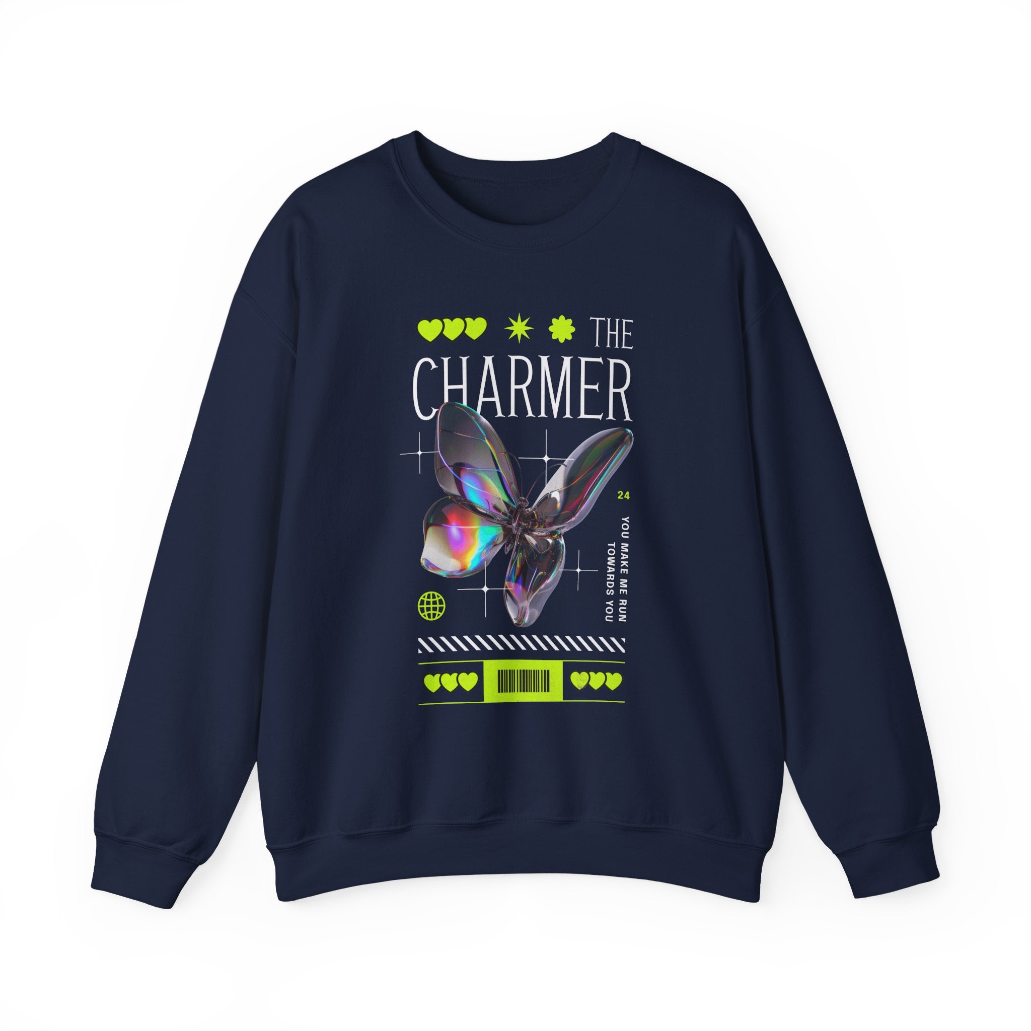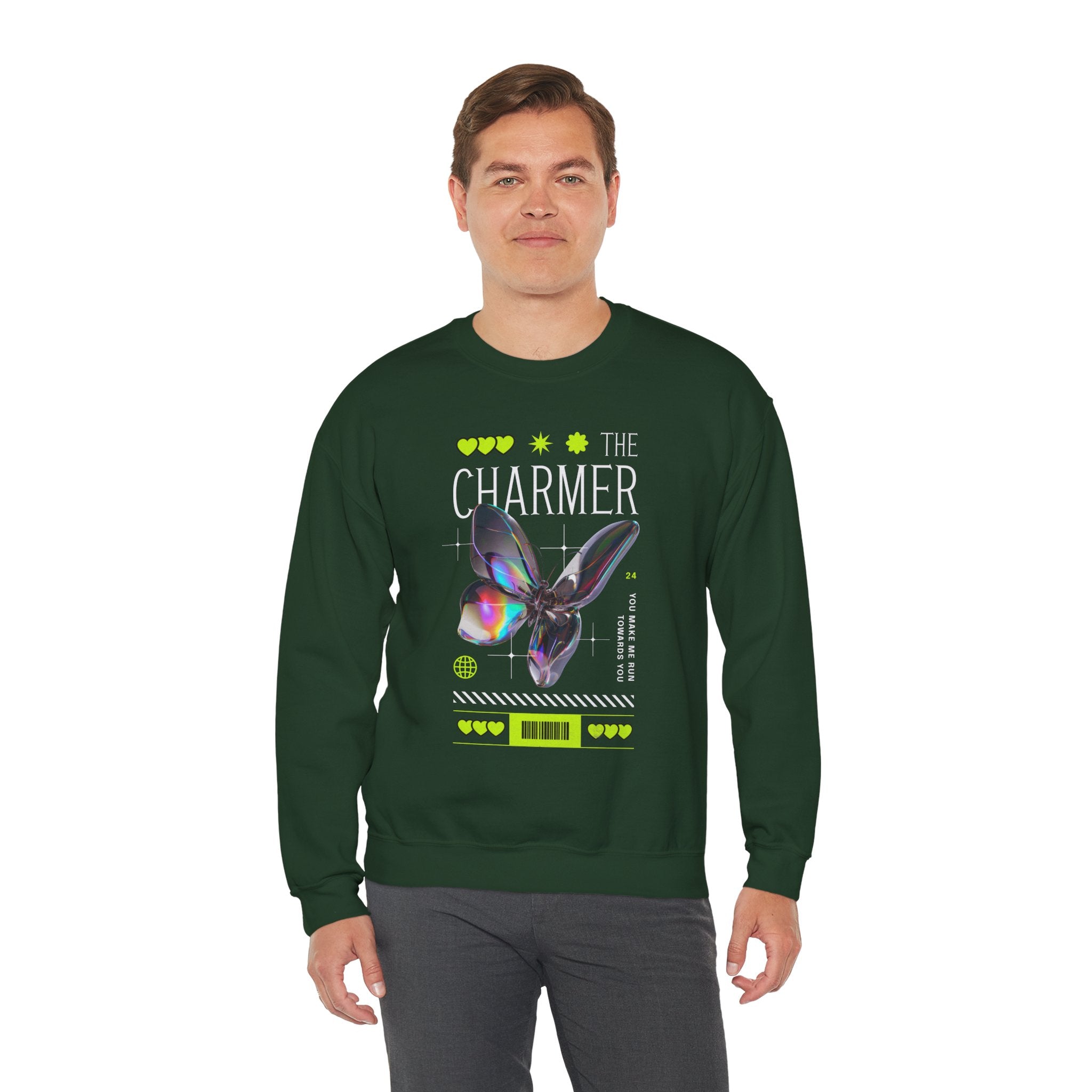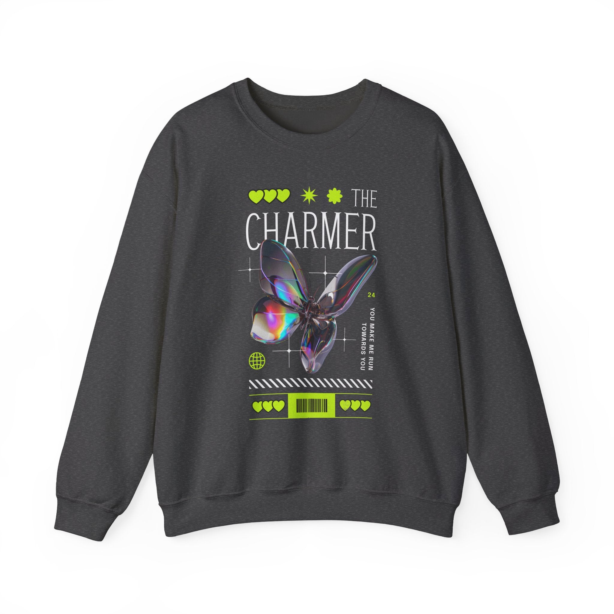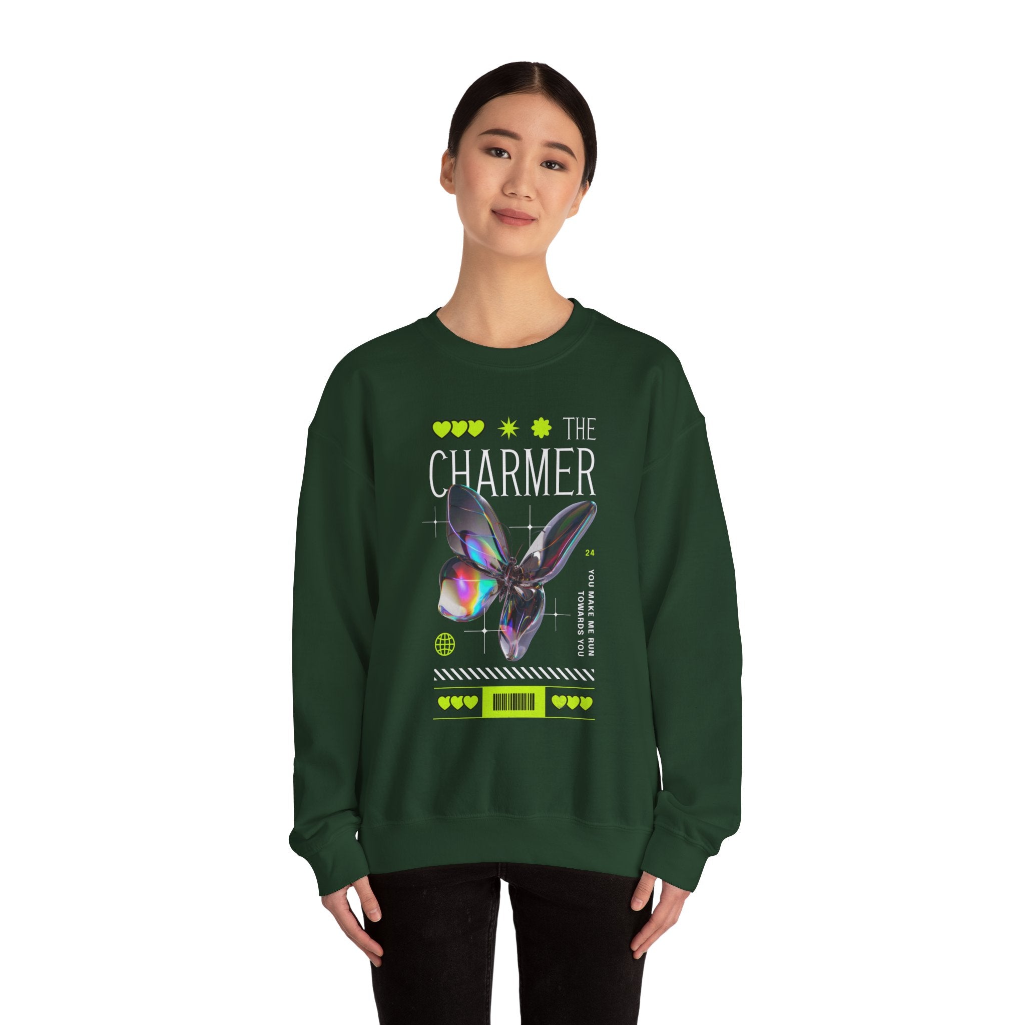 The Charmer Unisex Heavy Blend Crewneck Sweatshirt brings together streetwear vibes and futuristic neon butterfly art in a cozy, everyday essential. With its cyber-aesthetic design, glowing accents, and surreal details, this sweatshirt is a true statement piece for those who embrace individuality.