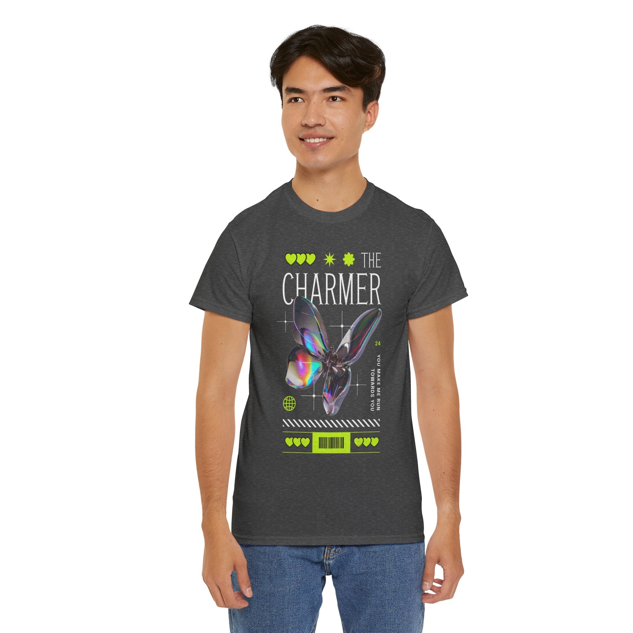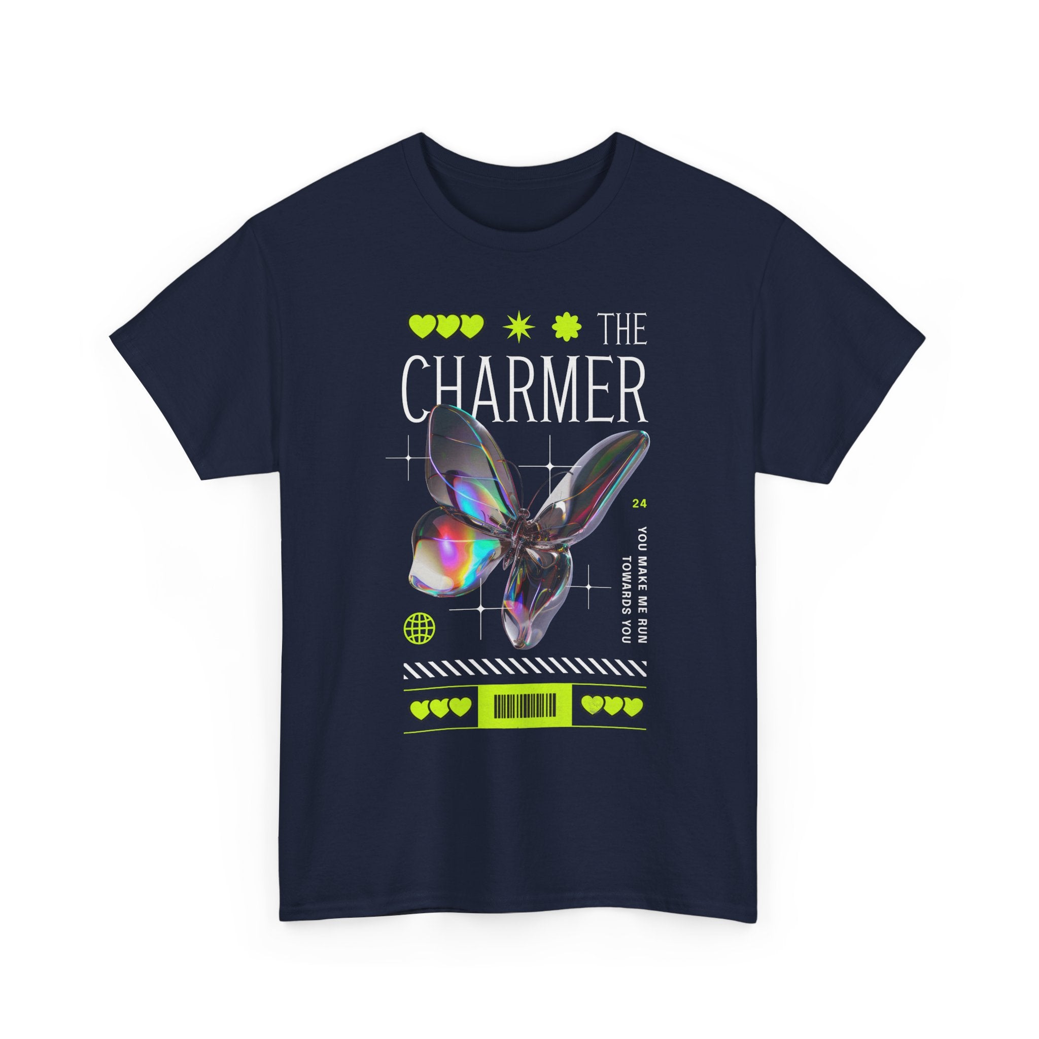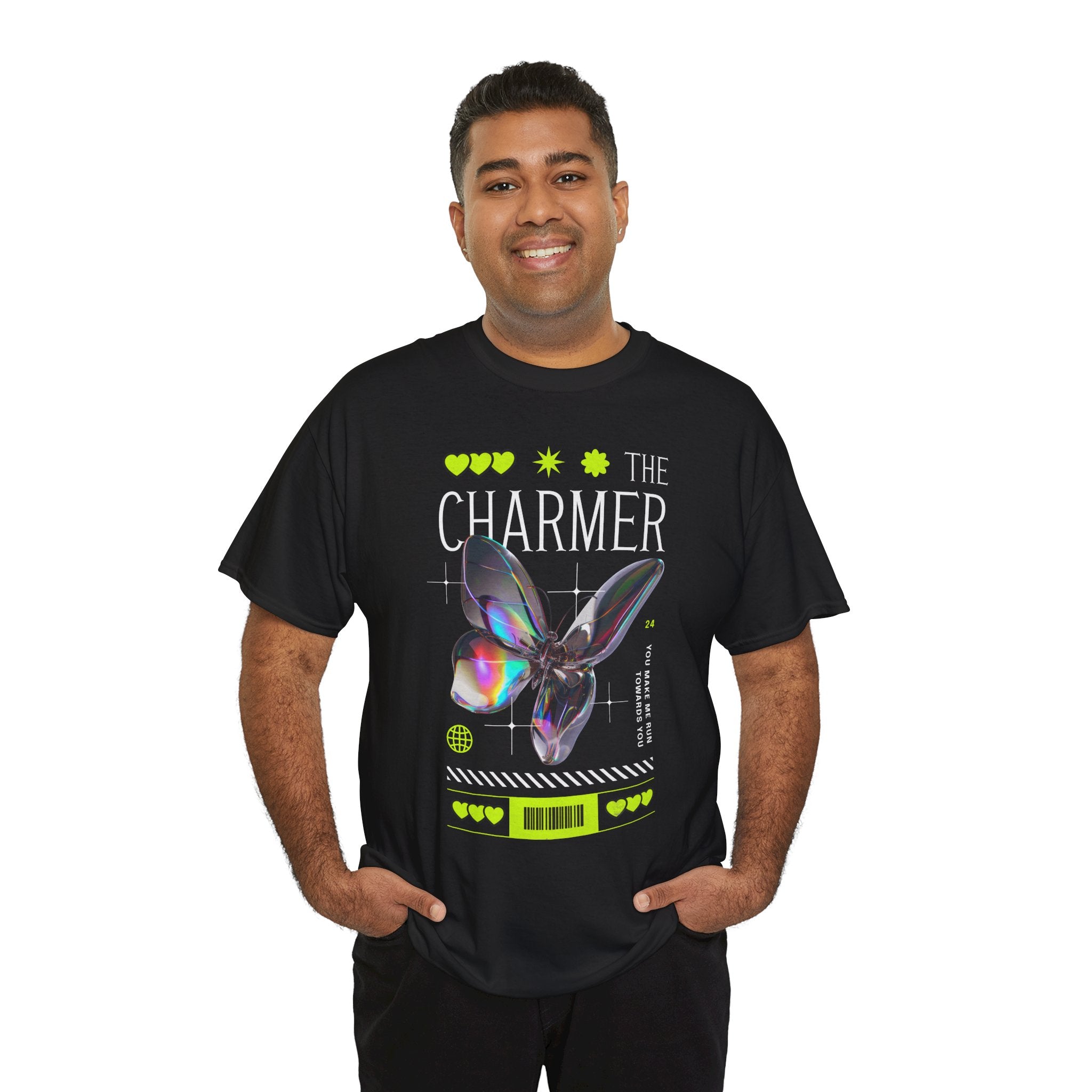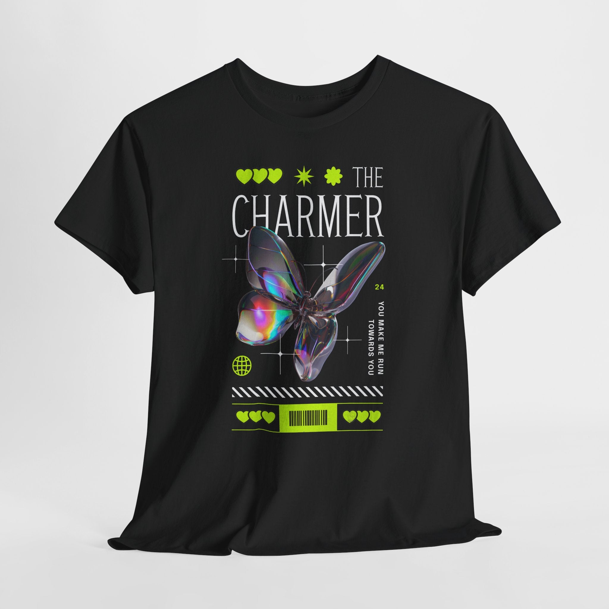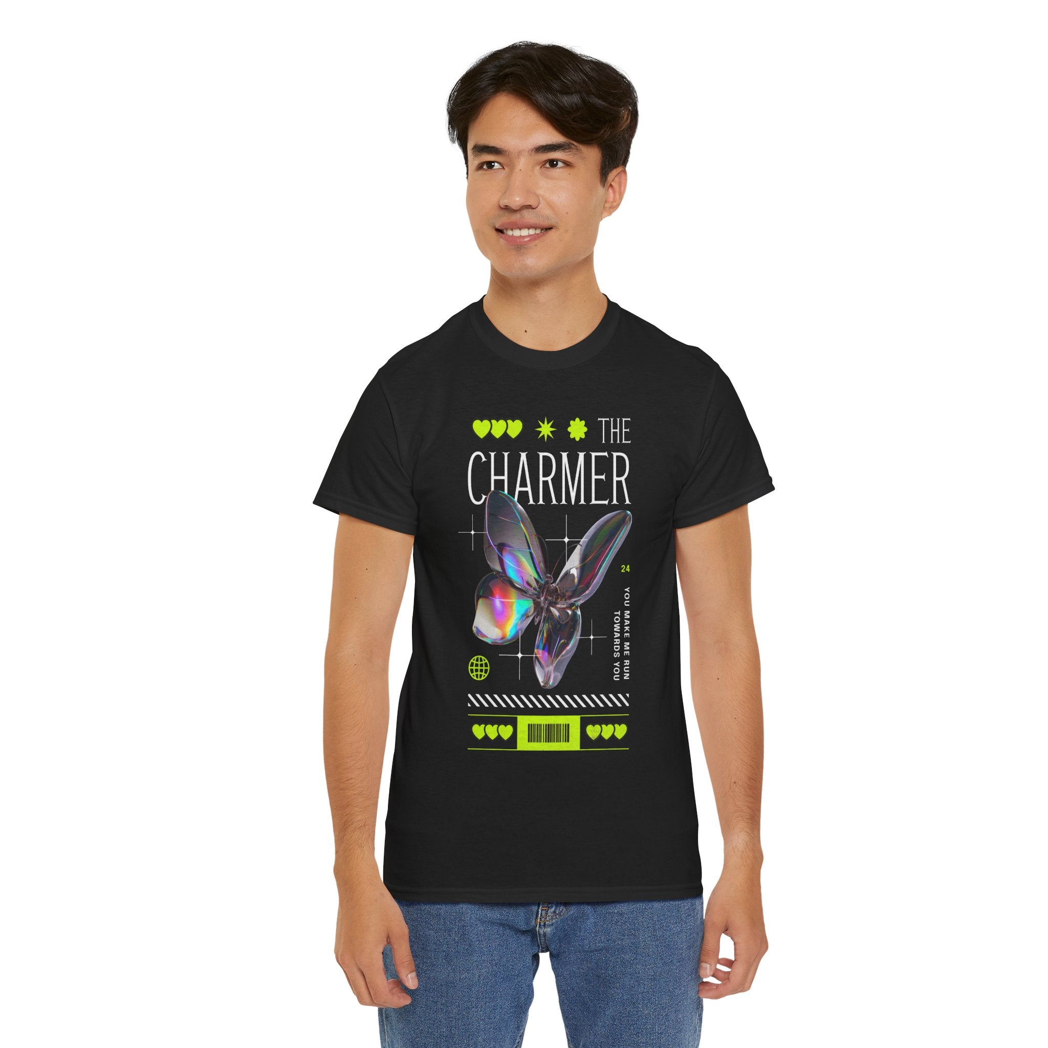 Step into the spotlight with The Charmer Unisex Heavy Cotton Tee — a bold fusion of cyber aesthetic, neon accents, and iridescent butterfly art. This shirt is designed for those who crave fashion that’s both eye-catching and meaningful.