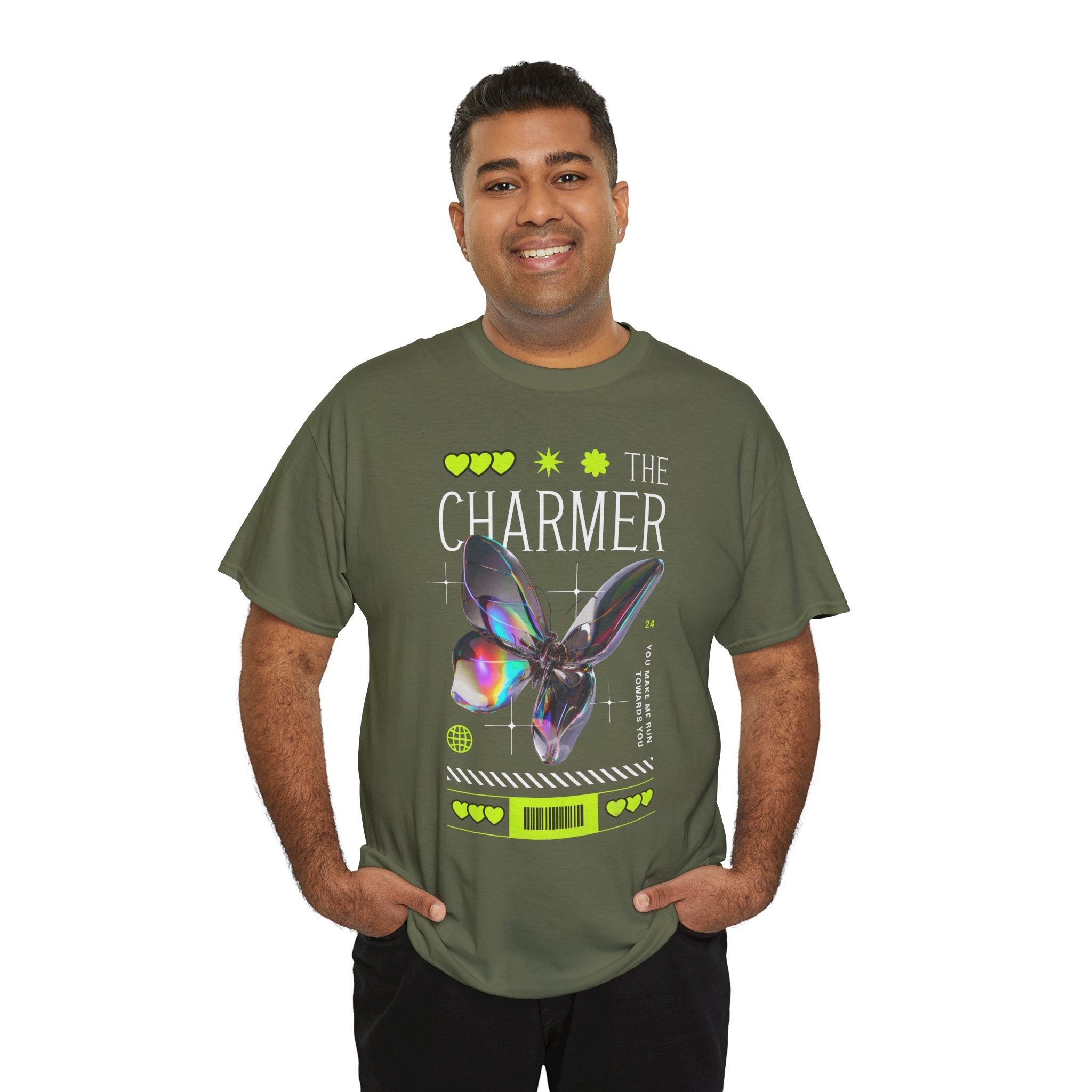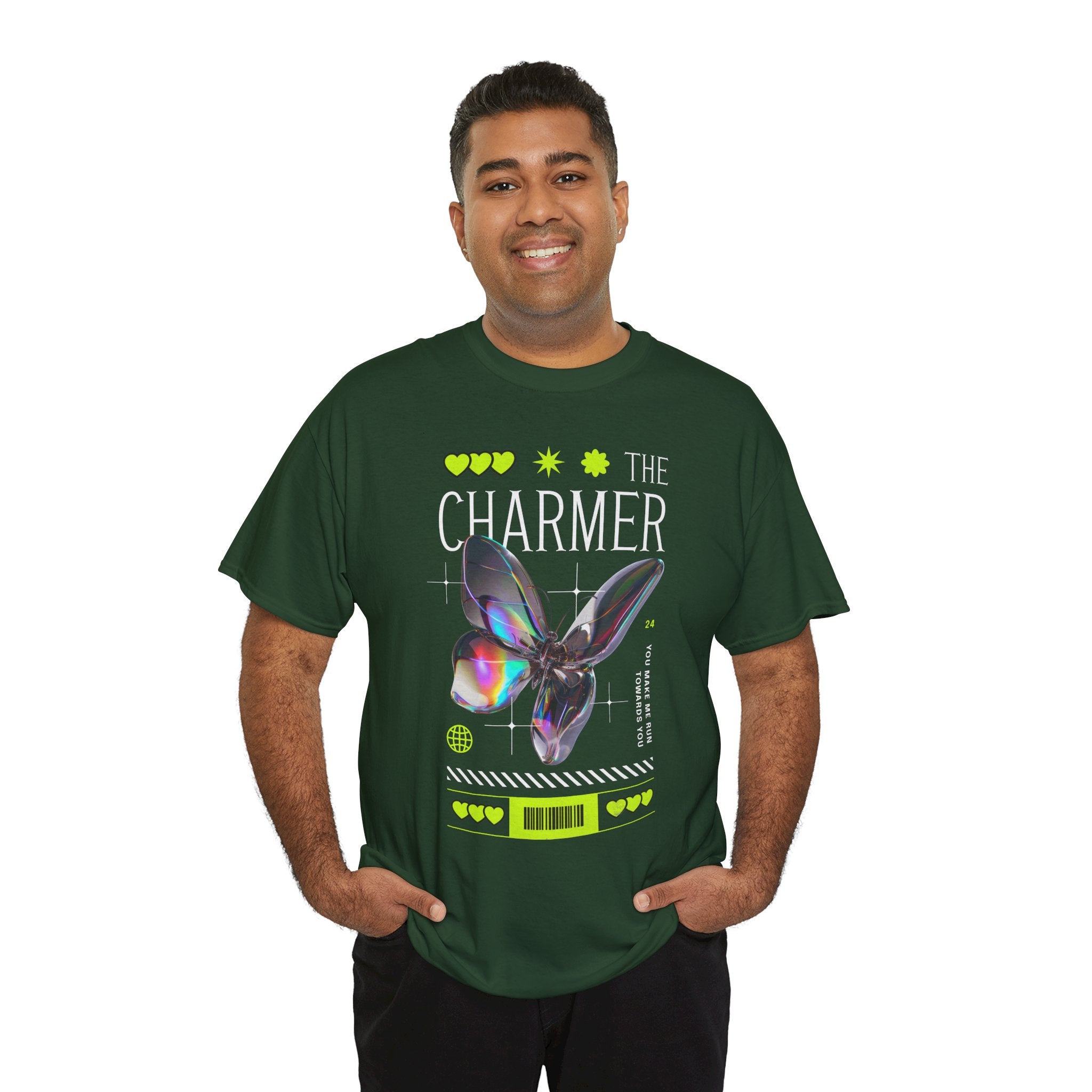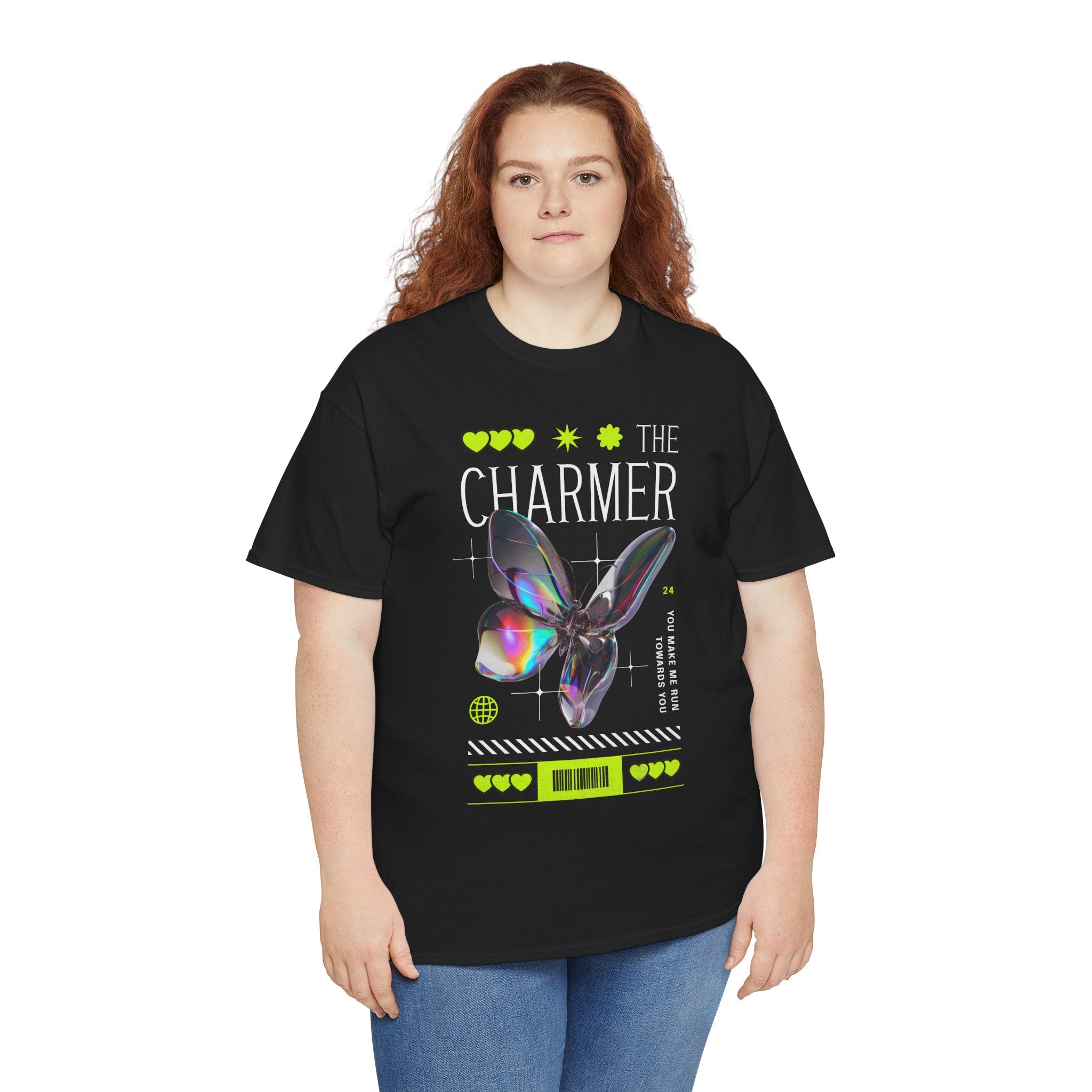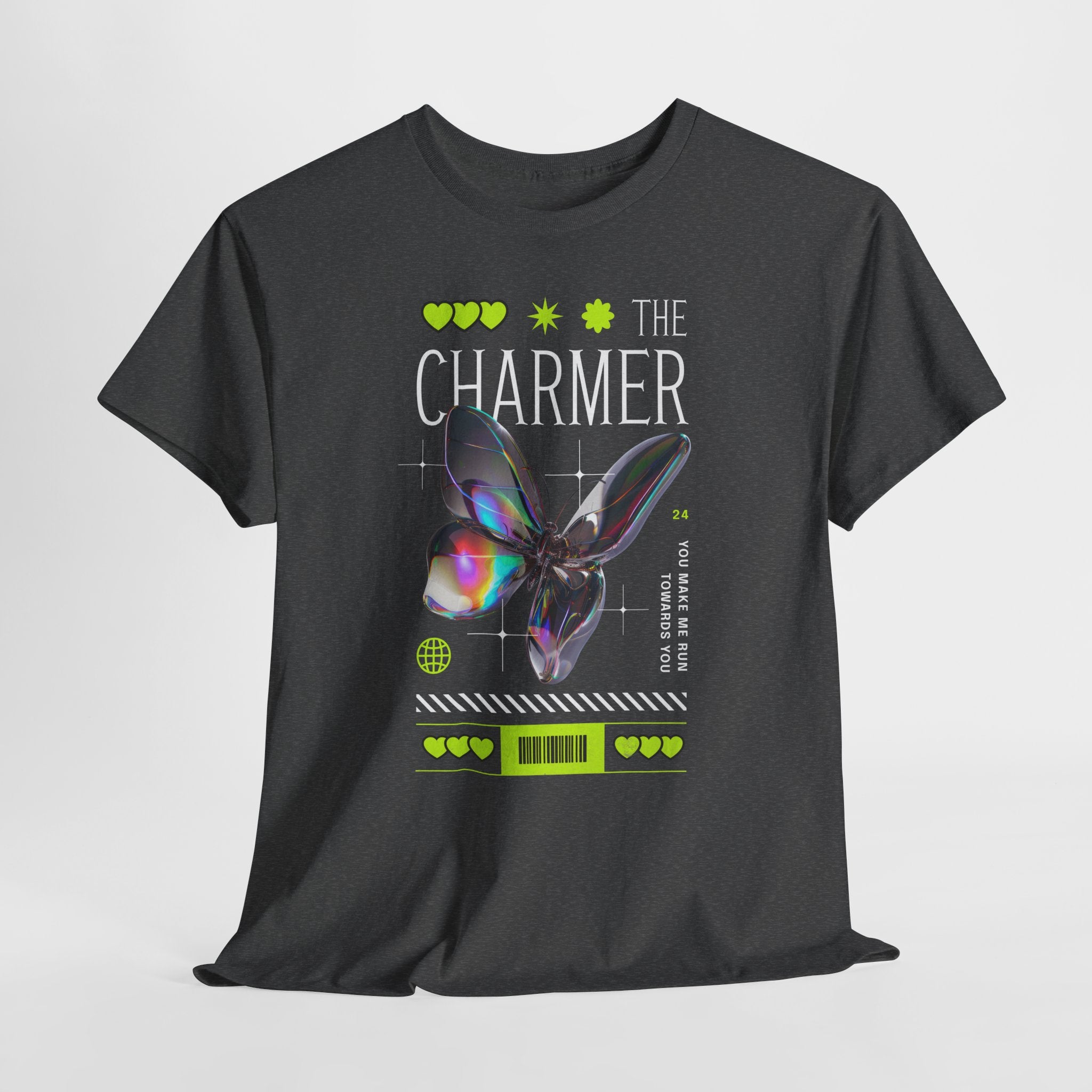 Step into the spotlight with The Charmer Unisex Heavy Cotton Tee — a bold fusion of cyber aesthetic, neon accents, and iridescent butterfly art. This shirt is designed for those who crave fashion that’s both eye-catching and meaningful.