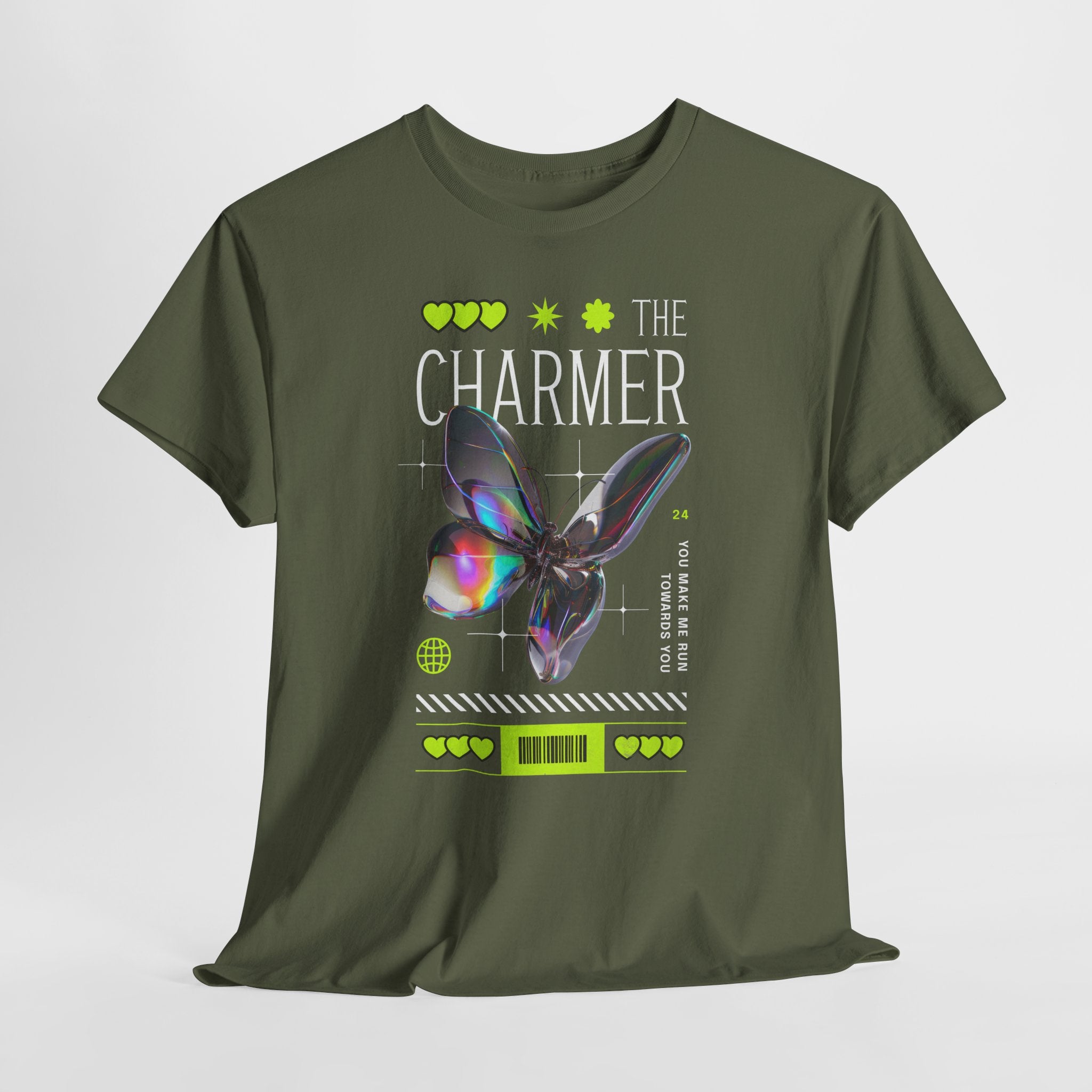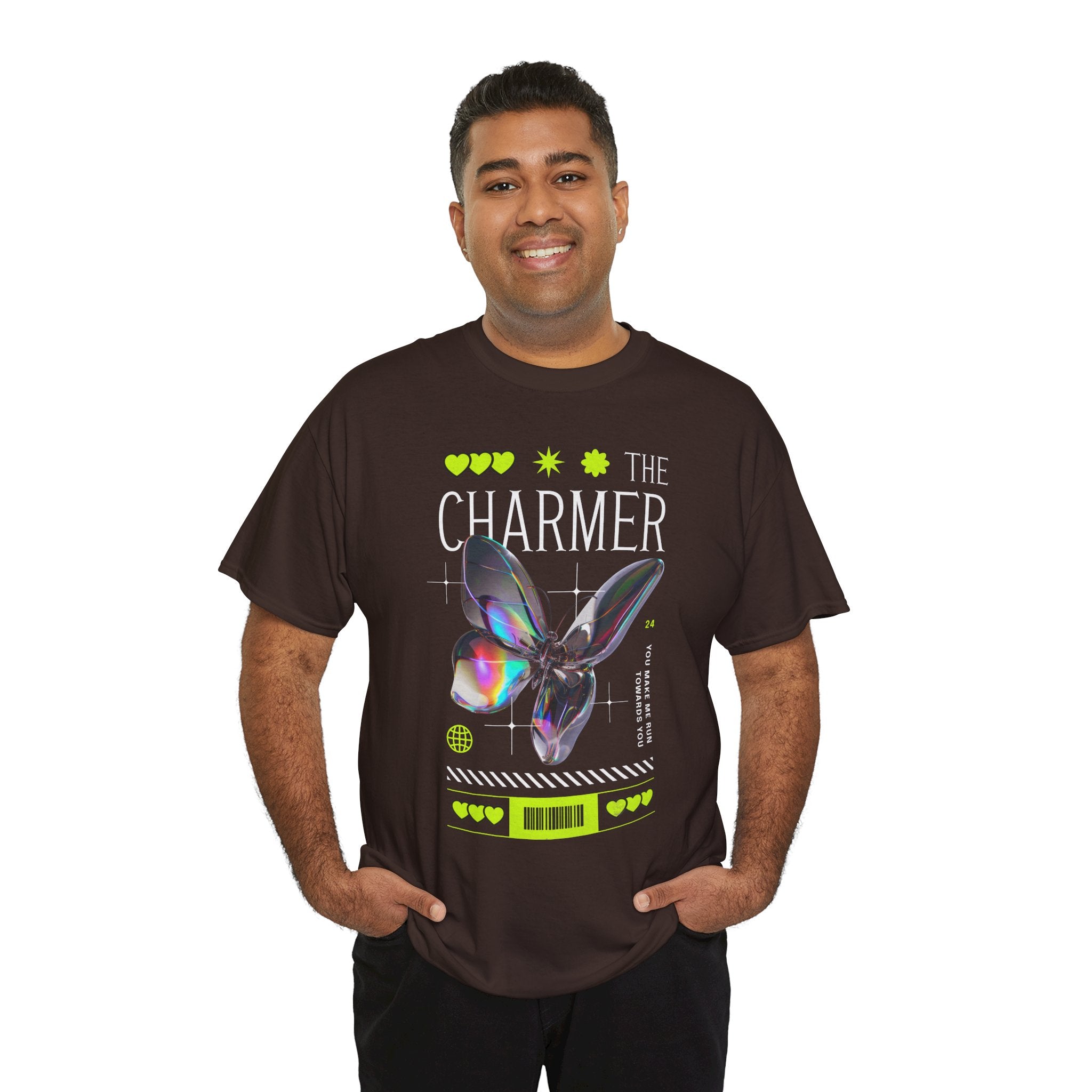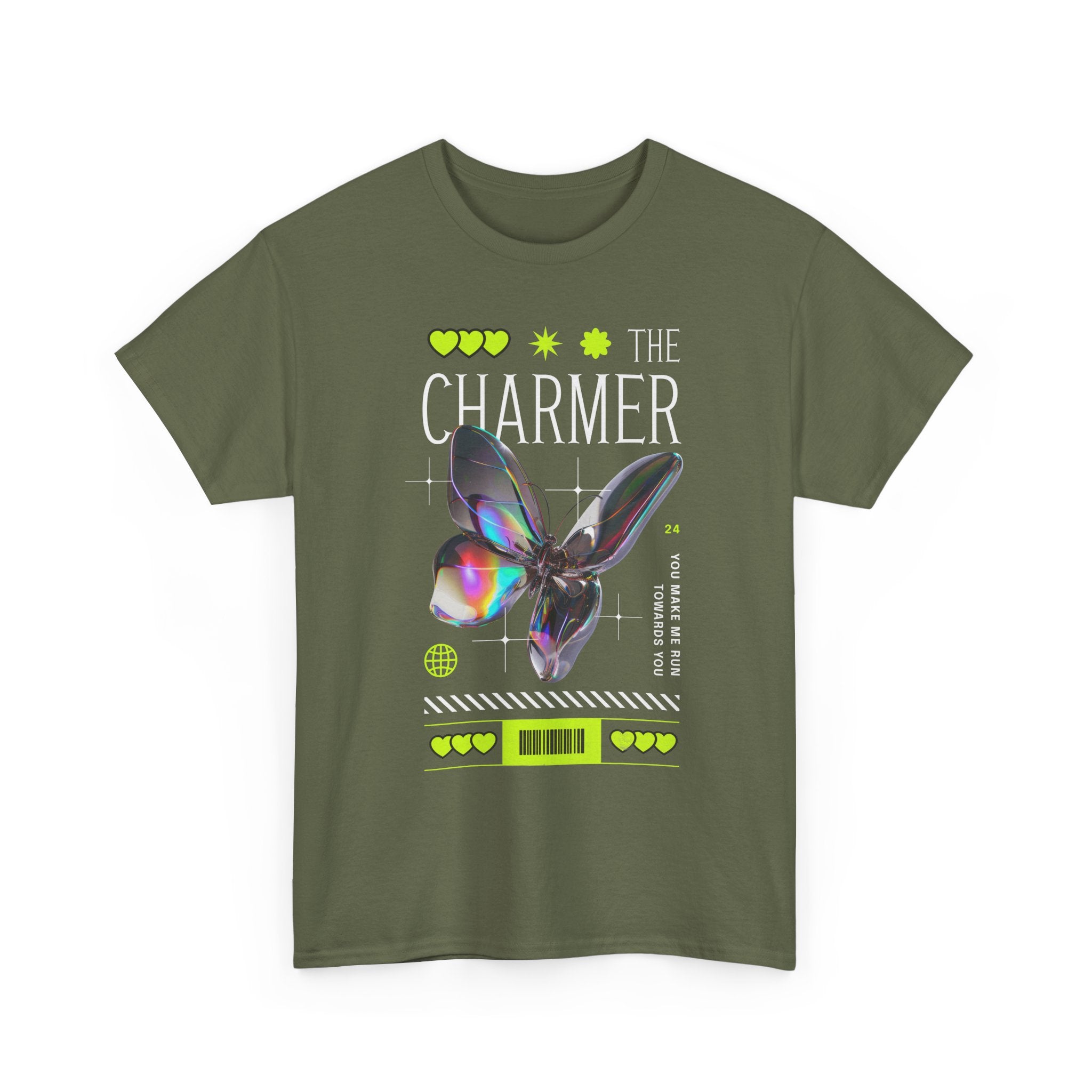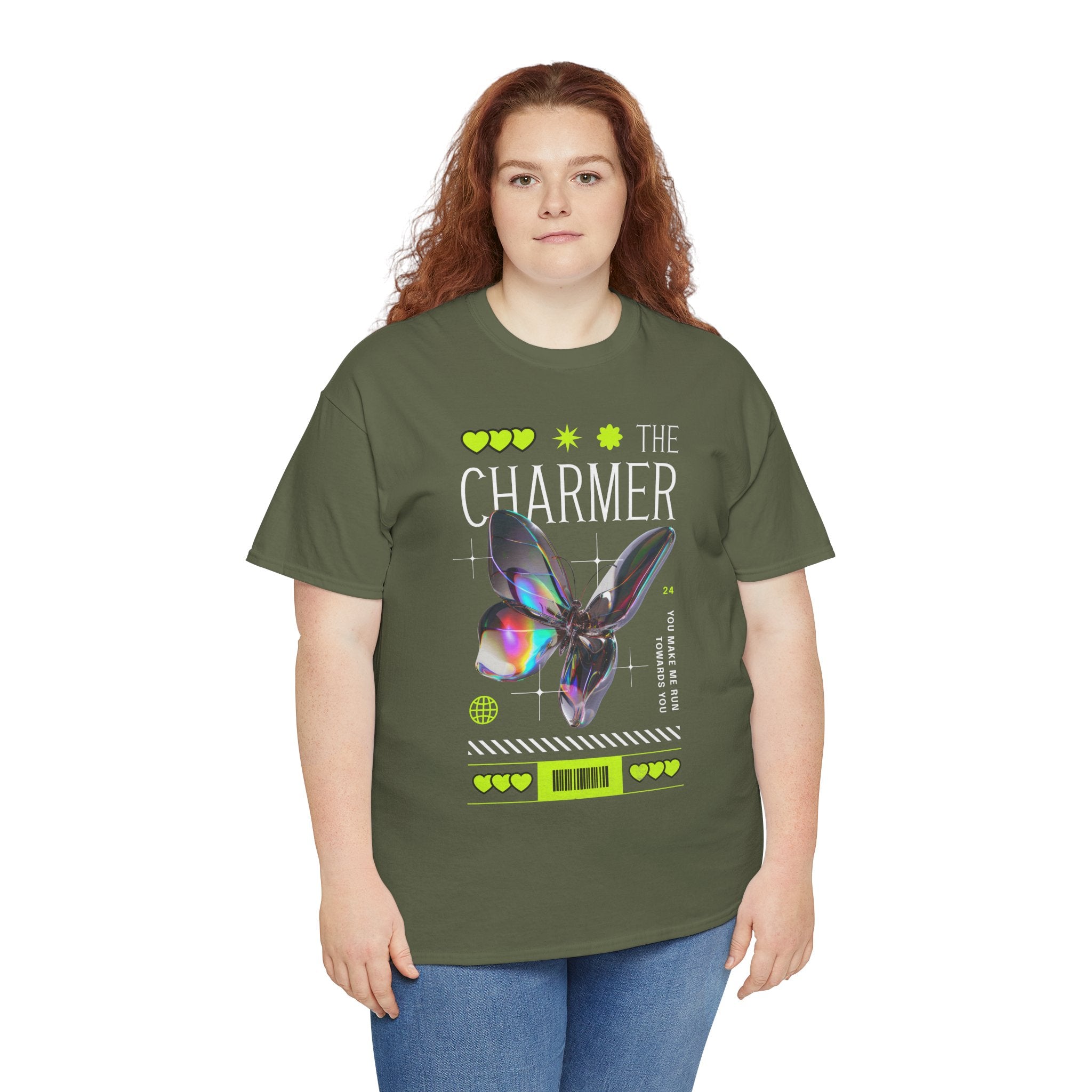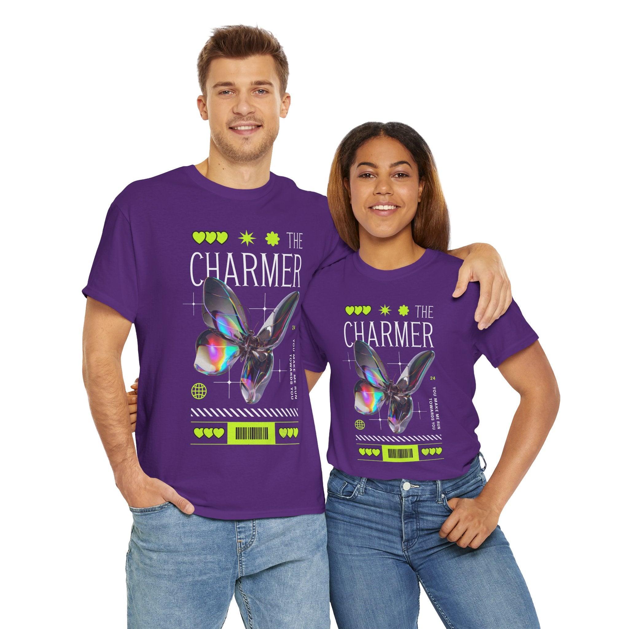 Step into the spotlight with The Charmer Unisex Heavy Cotton Tee — a bold fusion of cyber aesthetic, neon accents, and iridescent butterfly art. This shirt is designed for those who crave fashion that’s both eye-catching and meaningful.